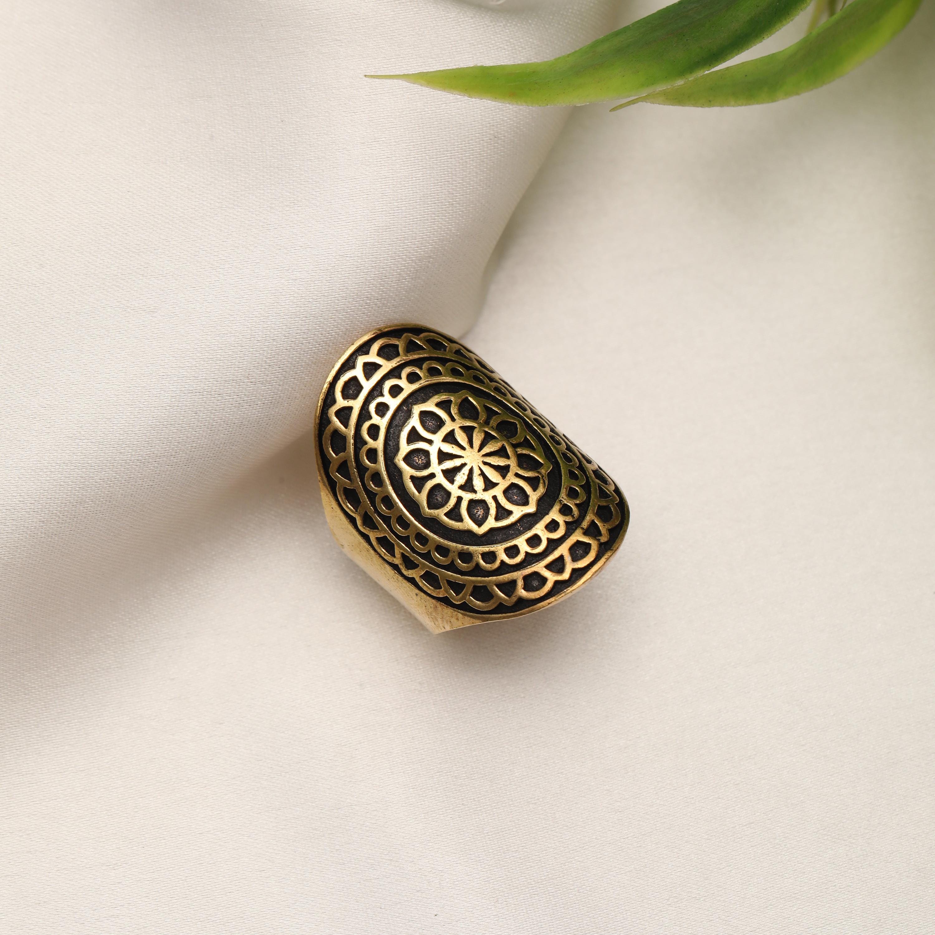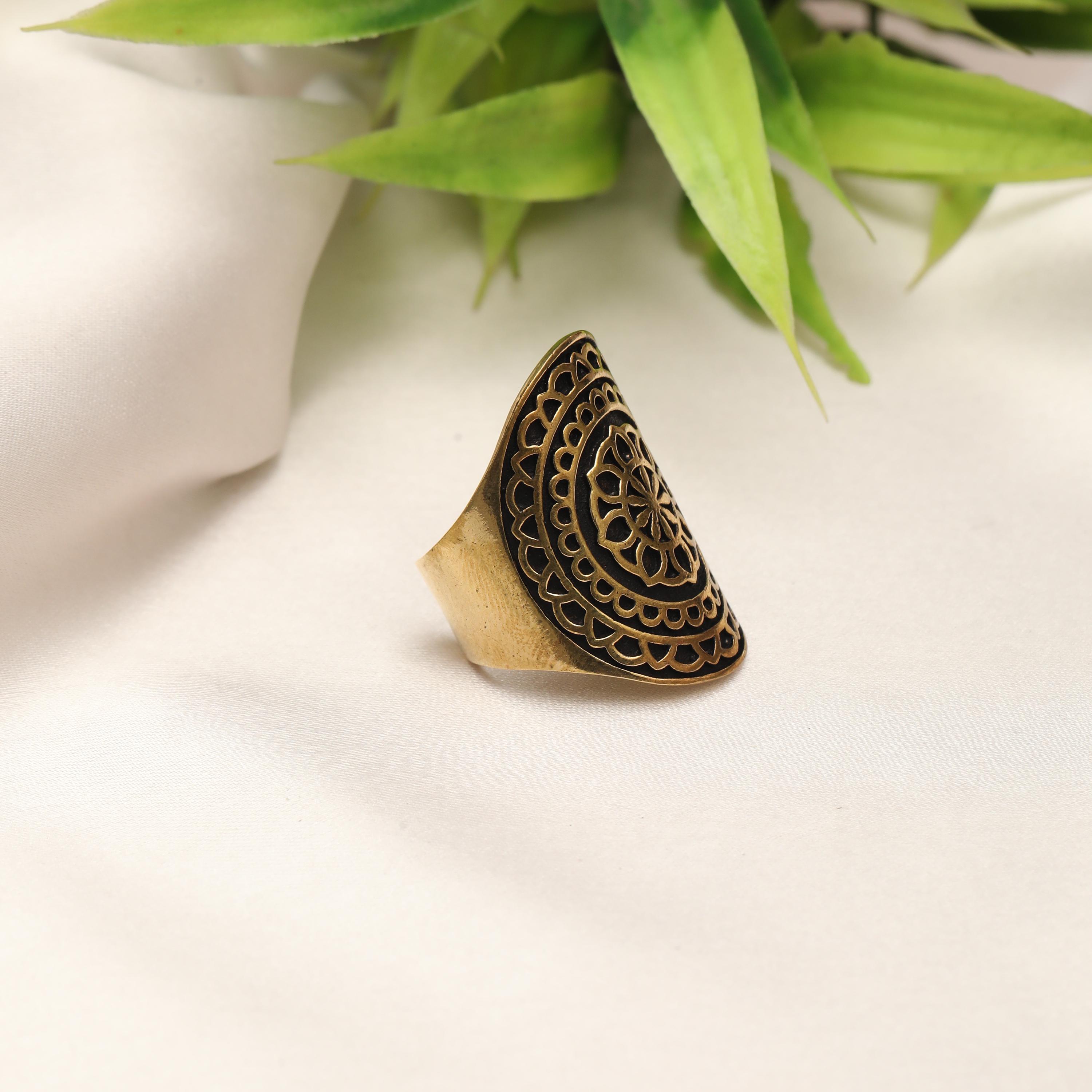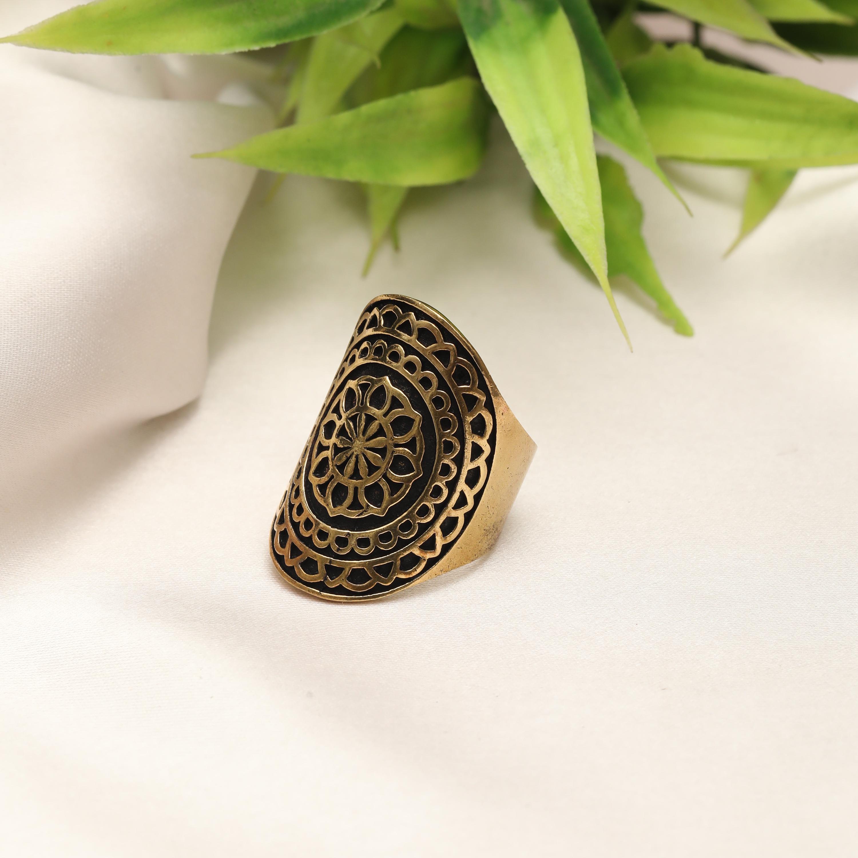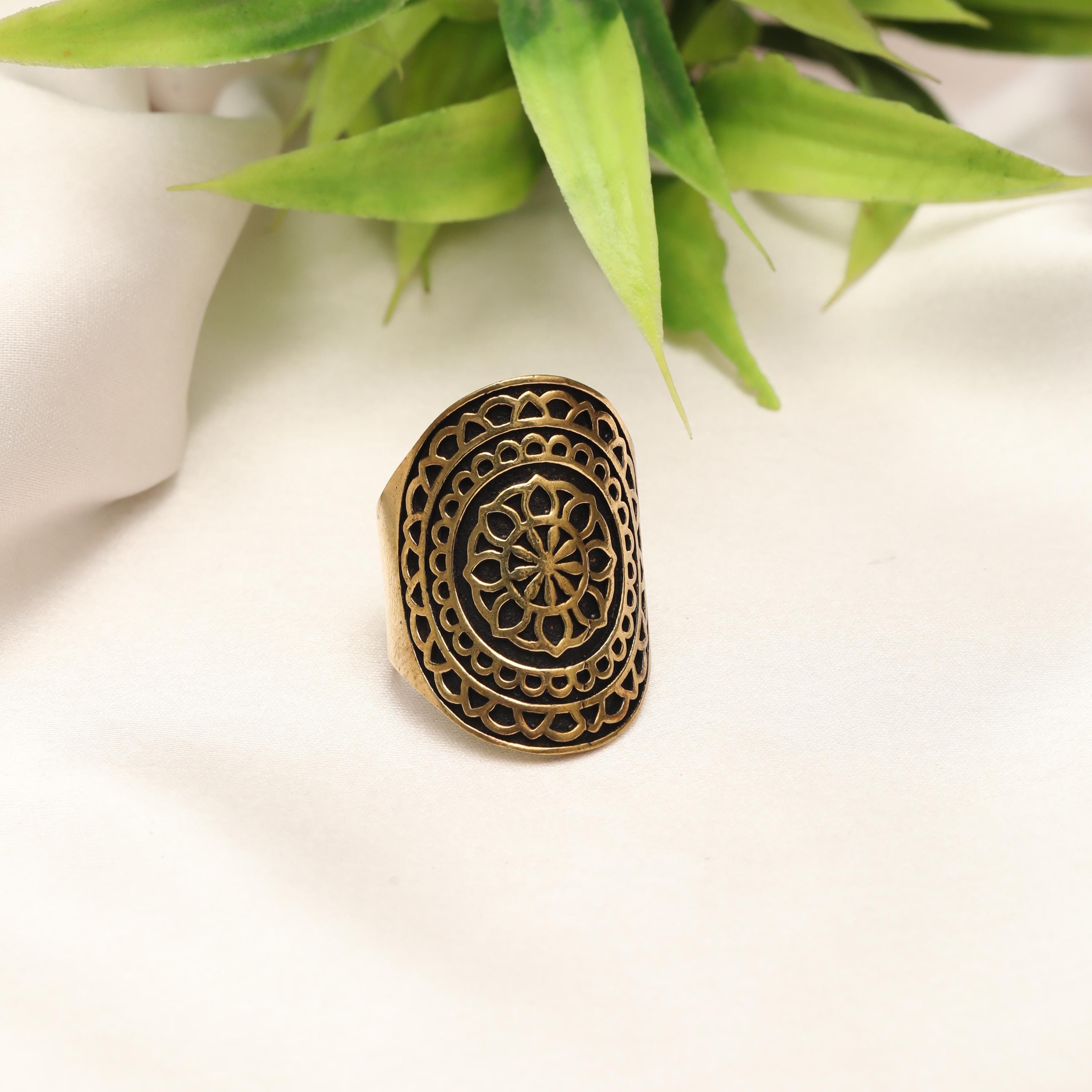 This bold boho mandala statement ring is crafted from solid brass and features an eye-catching shield-shaped face adorned with an intricate mandala floral motif. The design is deeply engraved with openwork detailing, creating a striking contrast between raised brass and darkened recesses for an authentic vintage, time-worn finish.