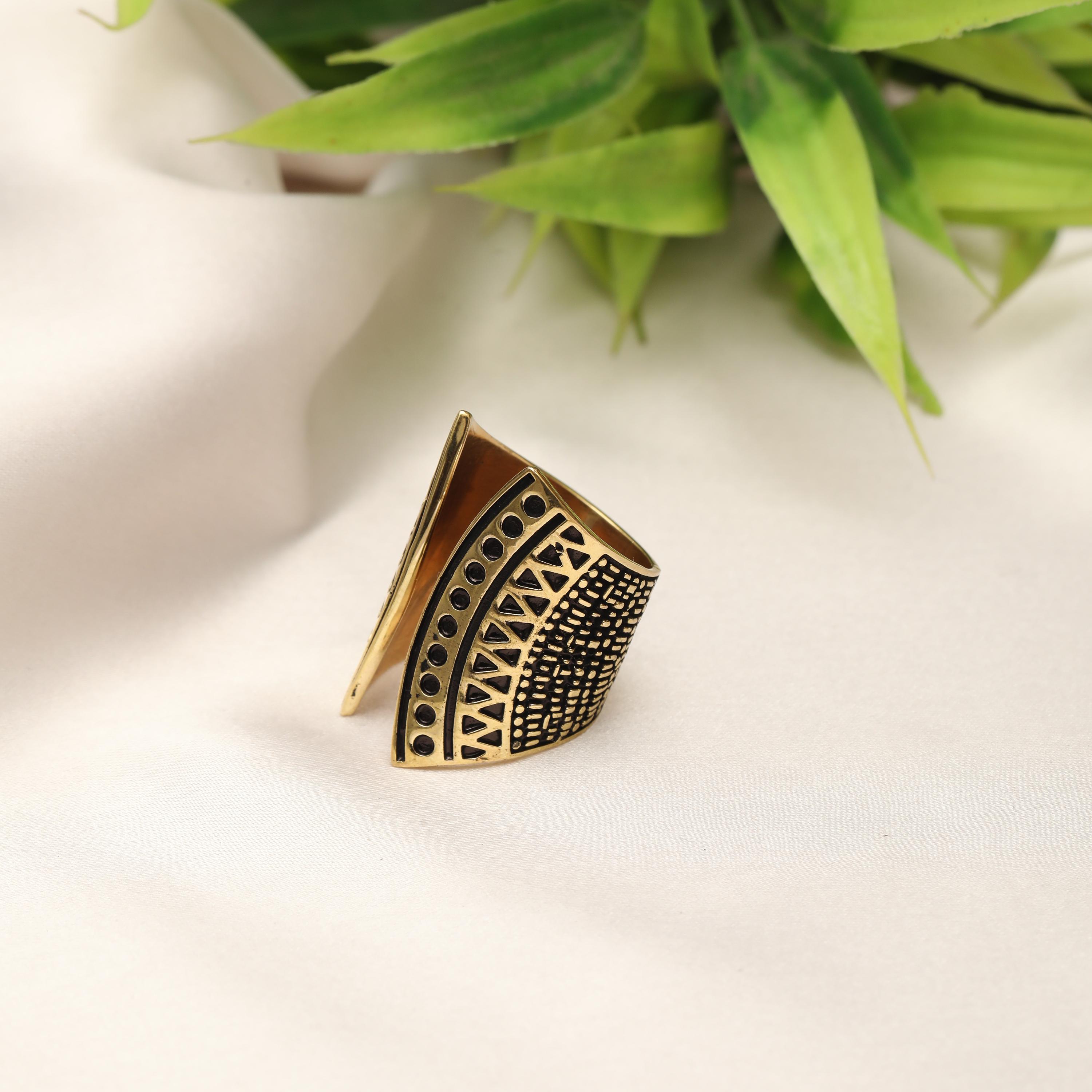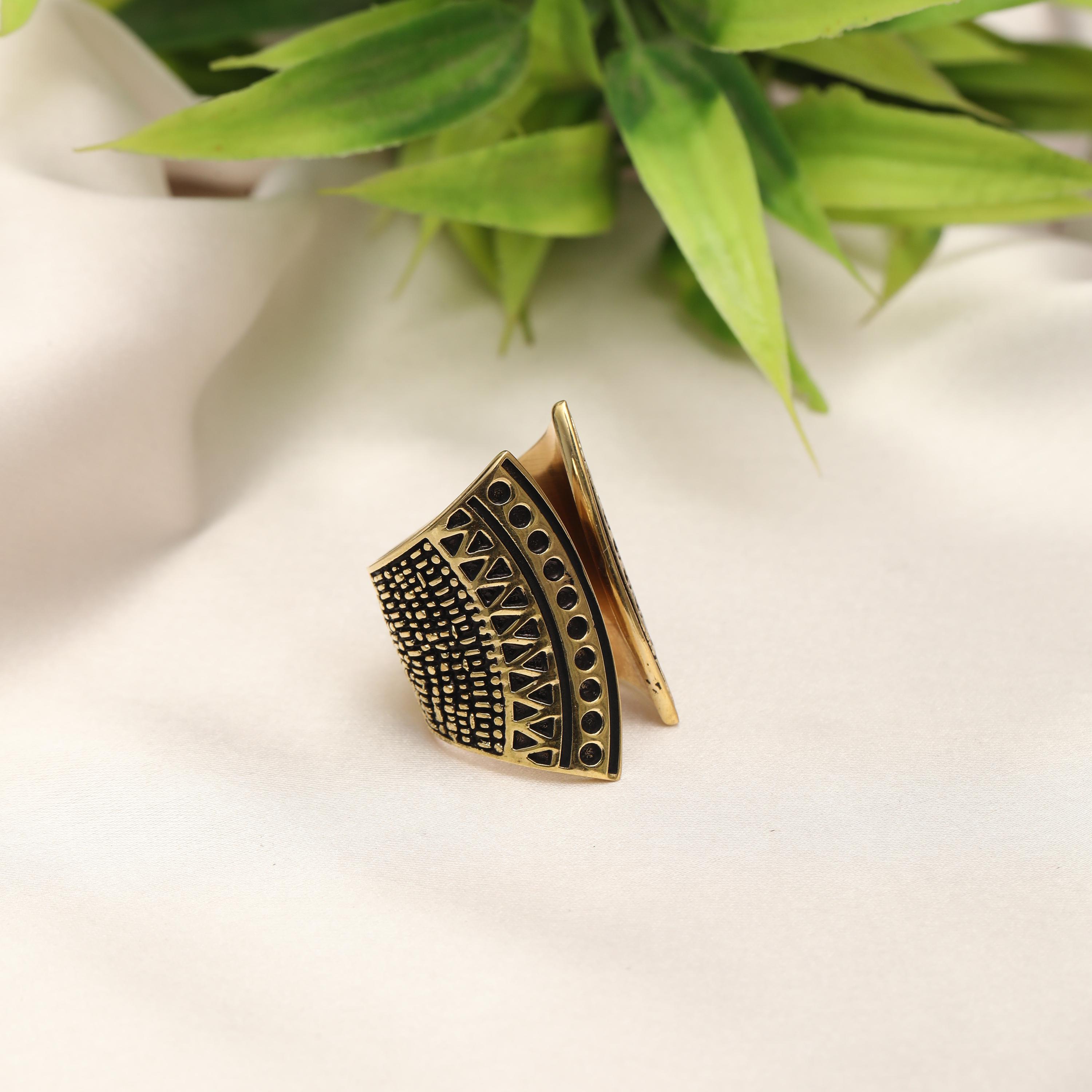 Inspired by tribal and vintage metalwork, this statement ring blends old-world craftsmanship with a contemporary edge. The open structure allows the ring to be adjustable, making it comfortable and easy to wear on different fingers.