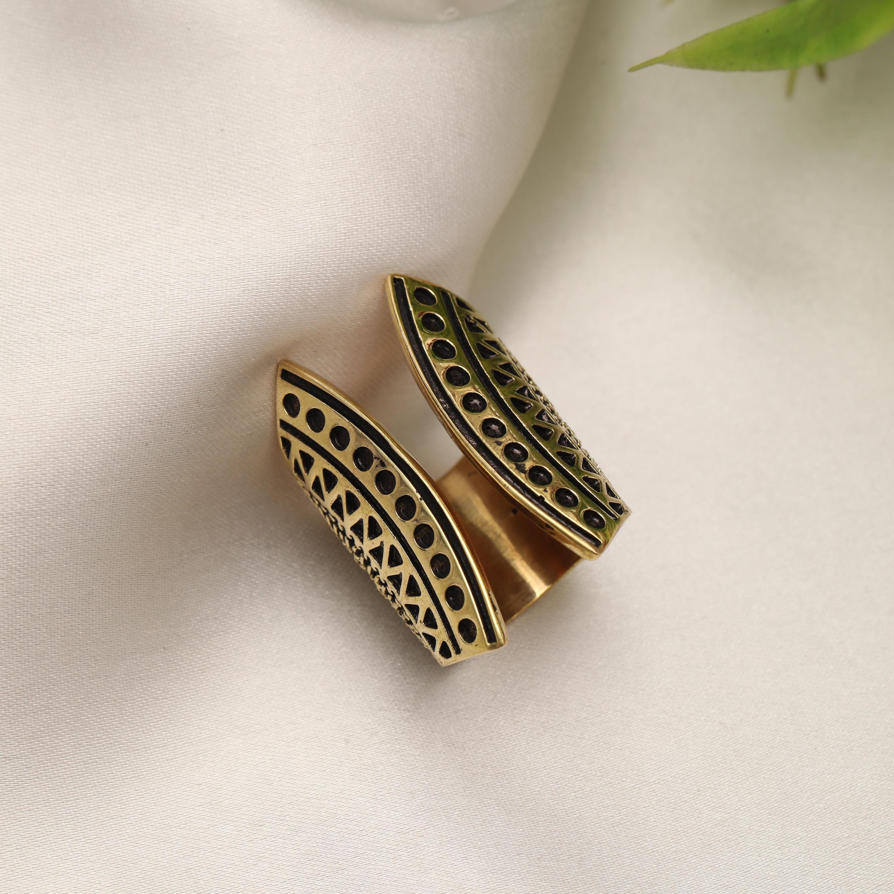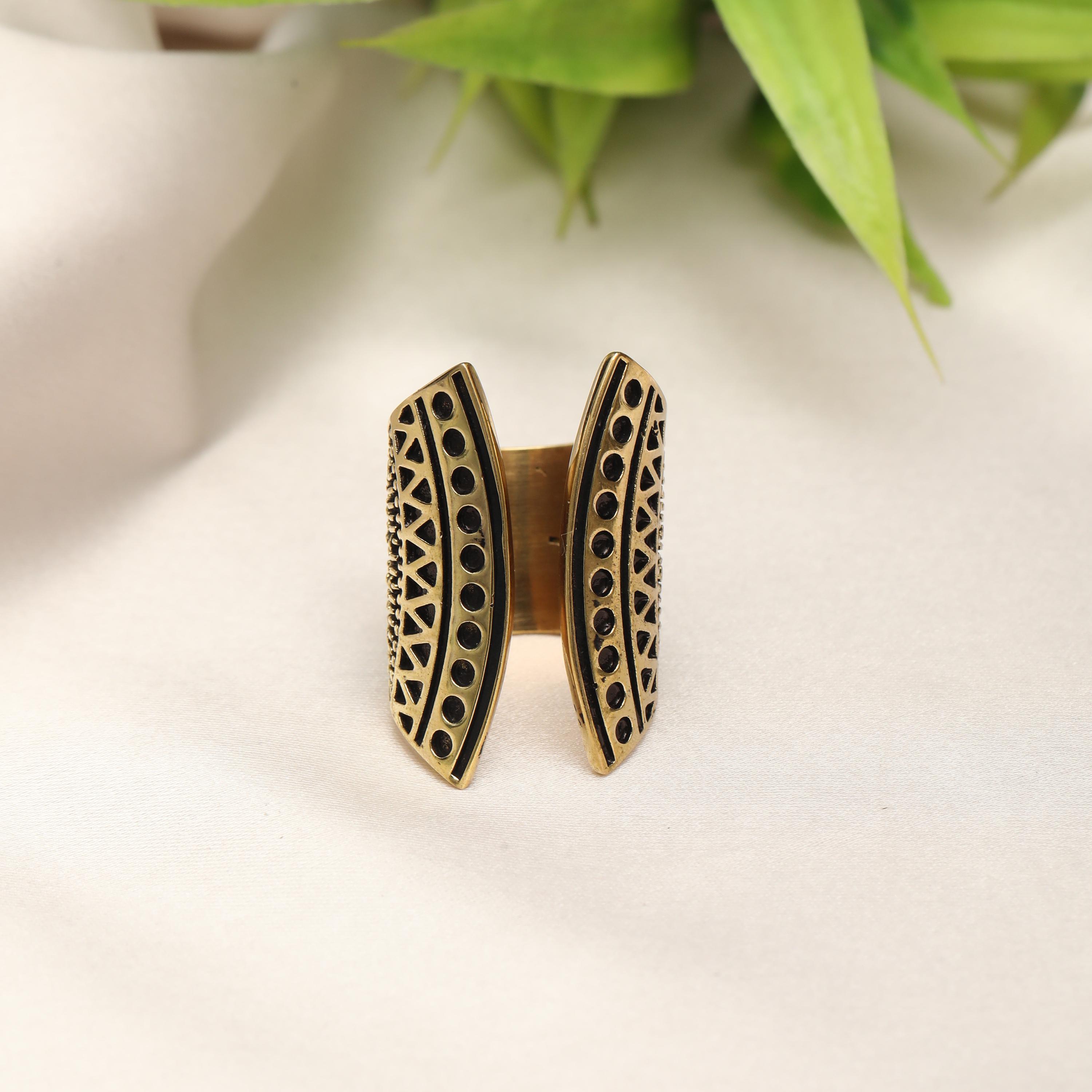 This striking open cuff ring is crafted from solid brass and designed with a bold yet refined architectural silhouette. The ring features two elongated vertical panels facing each other, creating a powerful open-frame design that feels both vintage-inspired and minimalist.