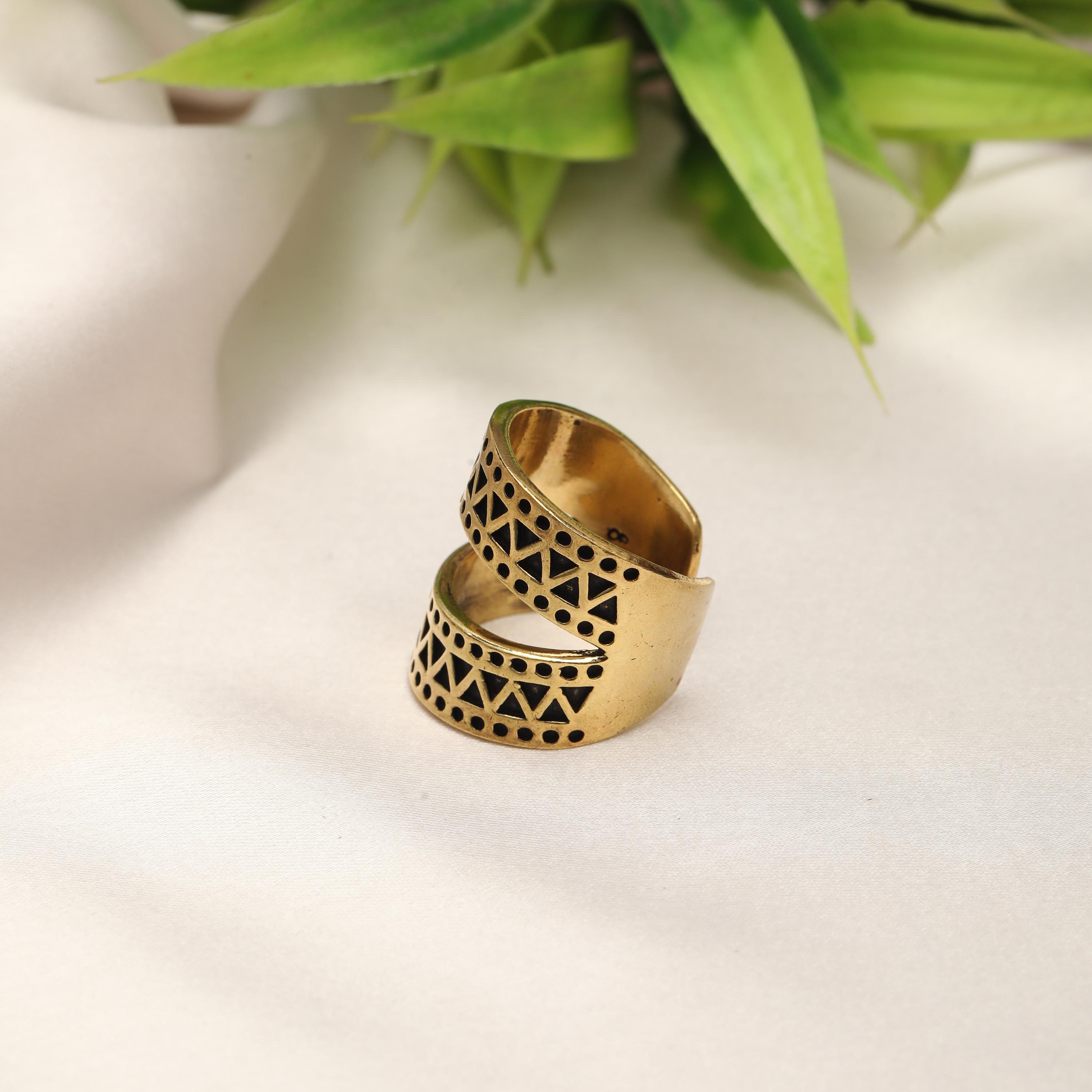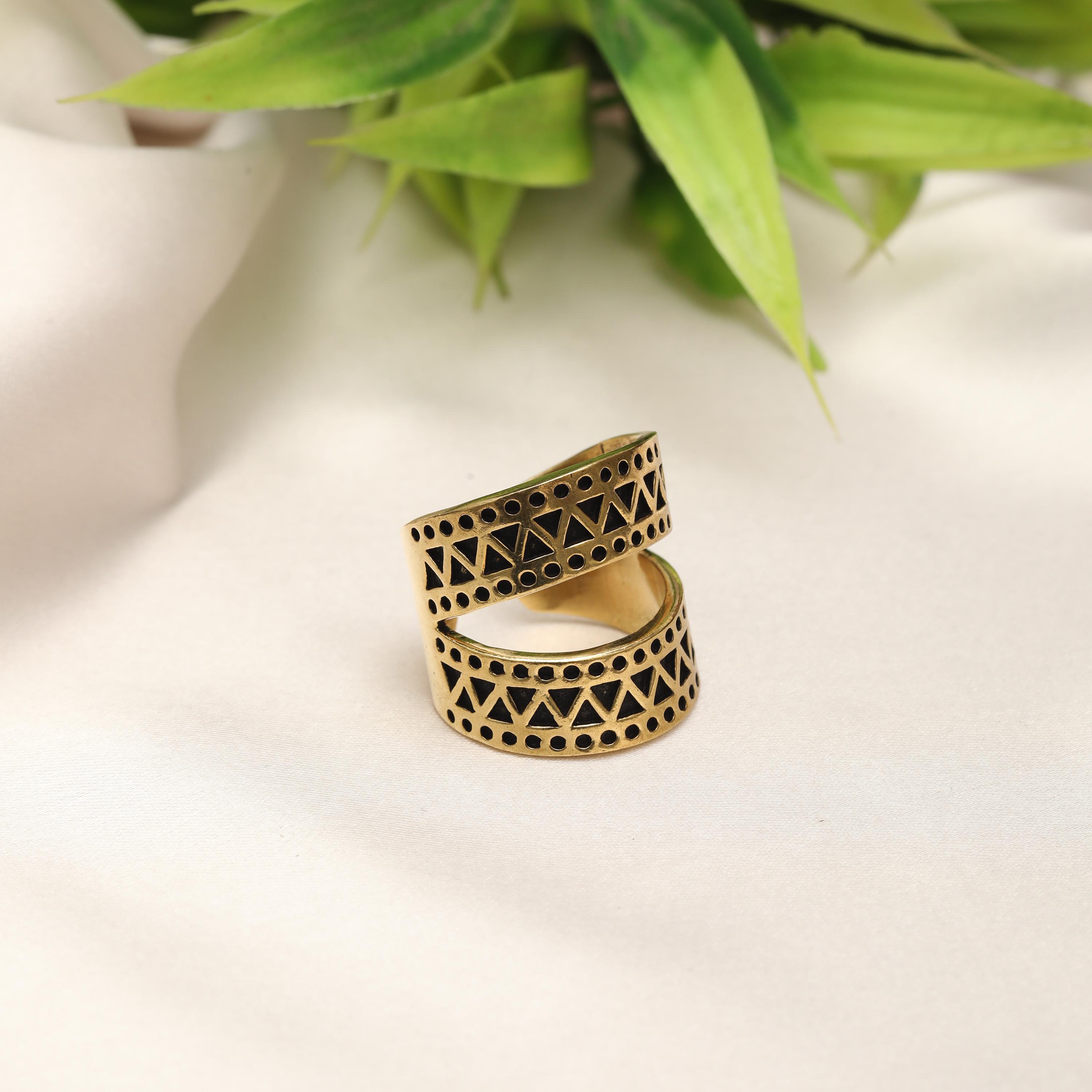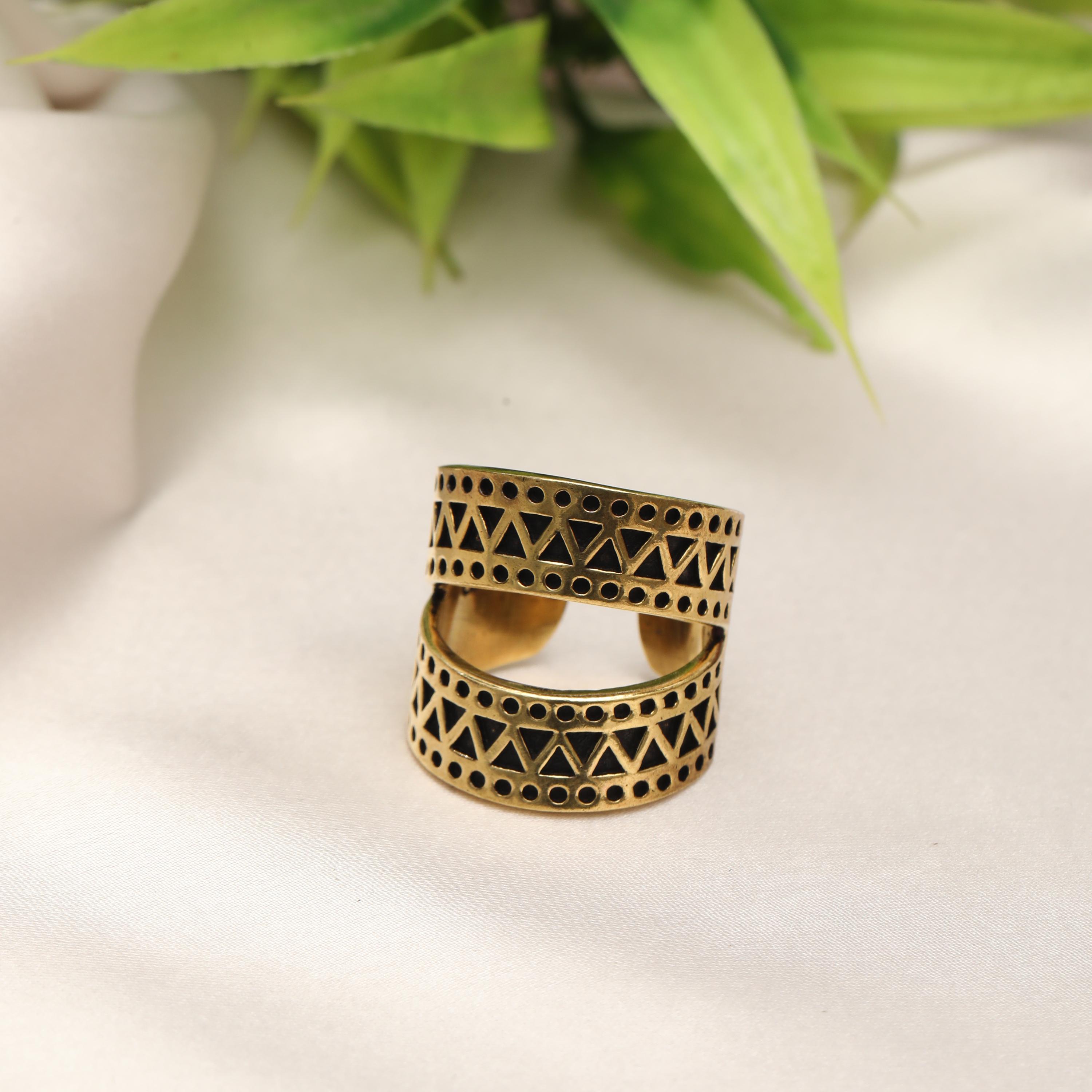 This minimalist geometric ring is crafted from solid brass, designed for lovers of vintage-inspired yet modern jewelry. Its bold open-band silhouette features two parallel curved bands, connected visually through a rhythmic pattern of engraved triangles and circular dot motifs, creating a strong architectural presence.