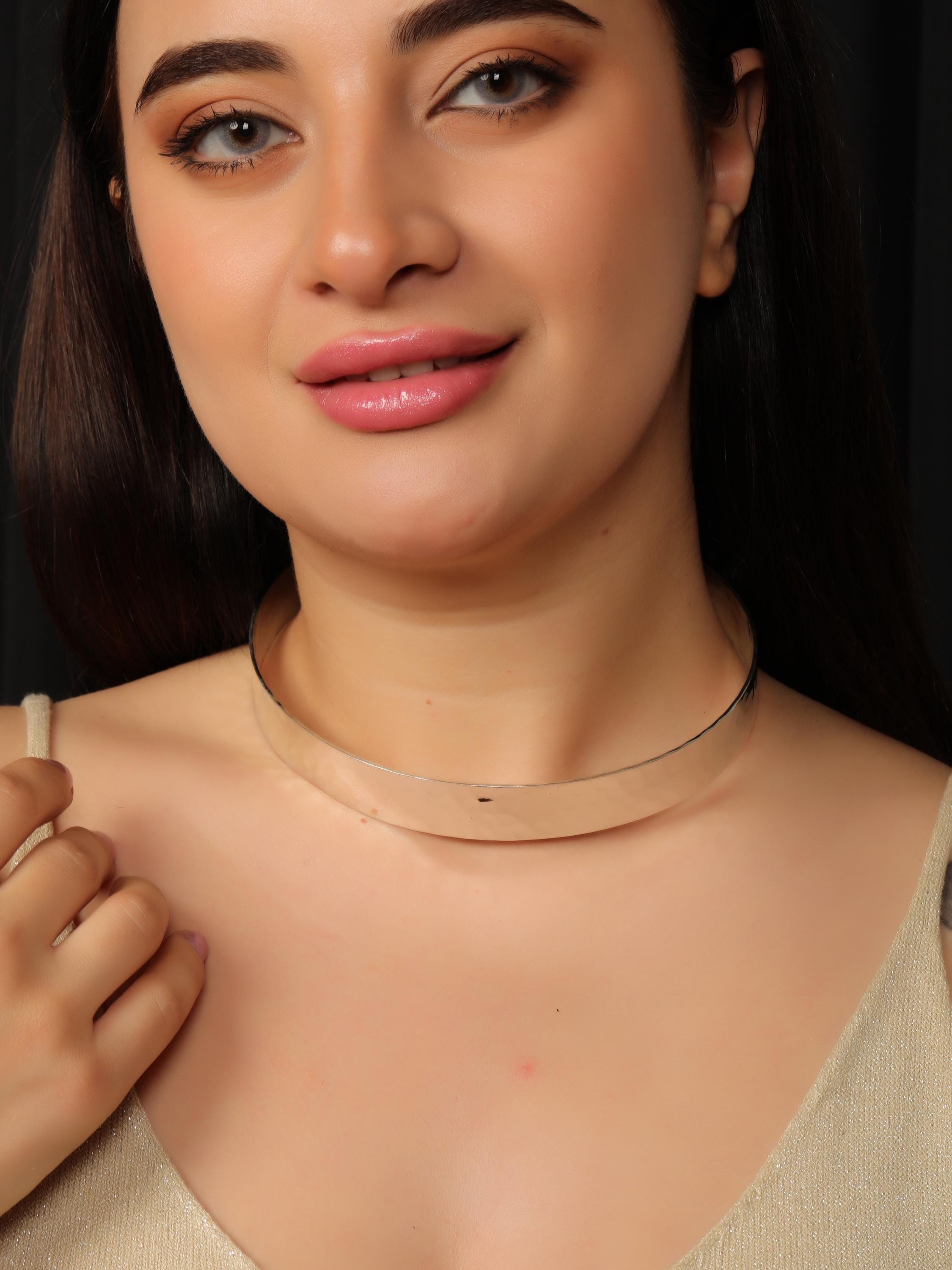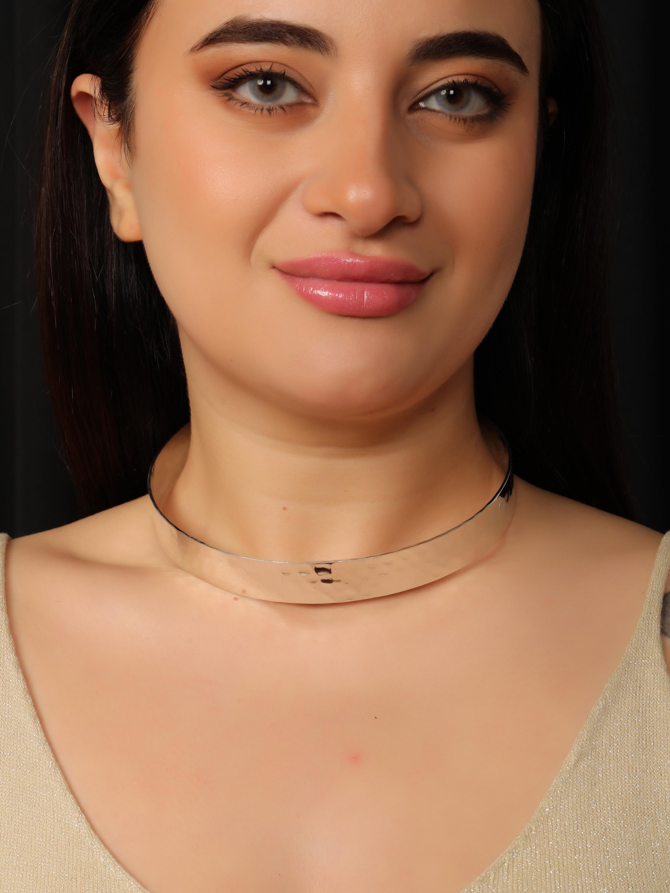 Available in golden tone or silver tone, this hammered brass choker blends ancient ethnic character with modern styling. It sits comfortably around the neck and makes a bold statement whether worn alone or layered.