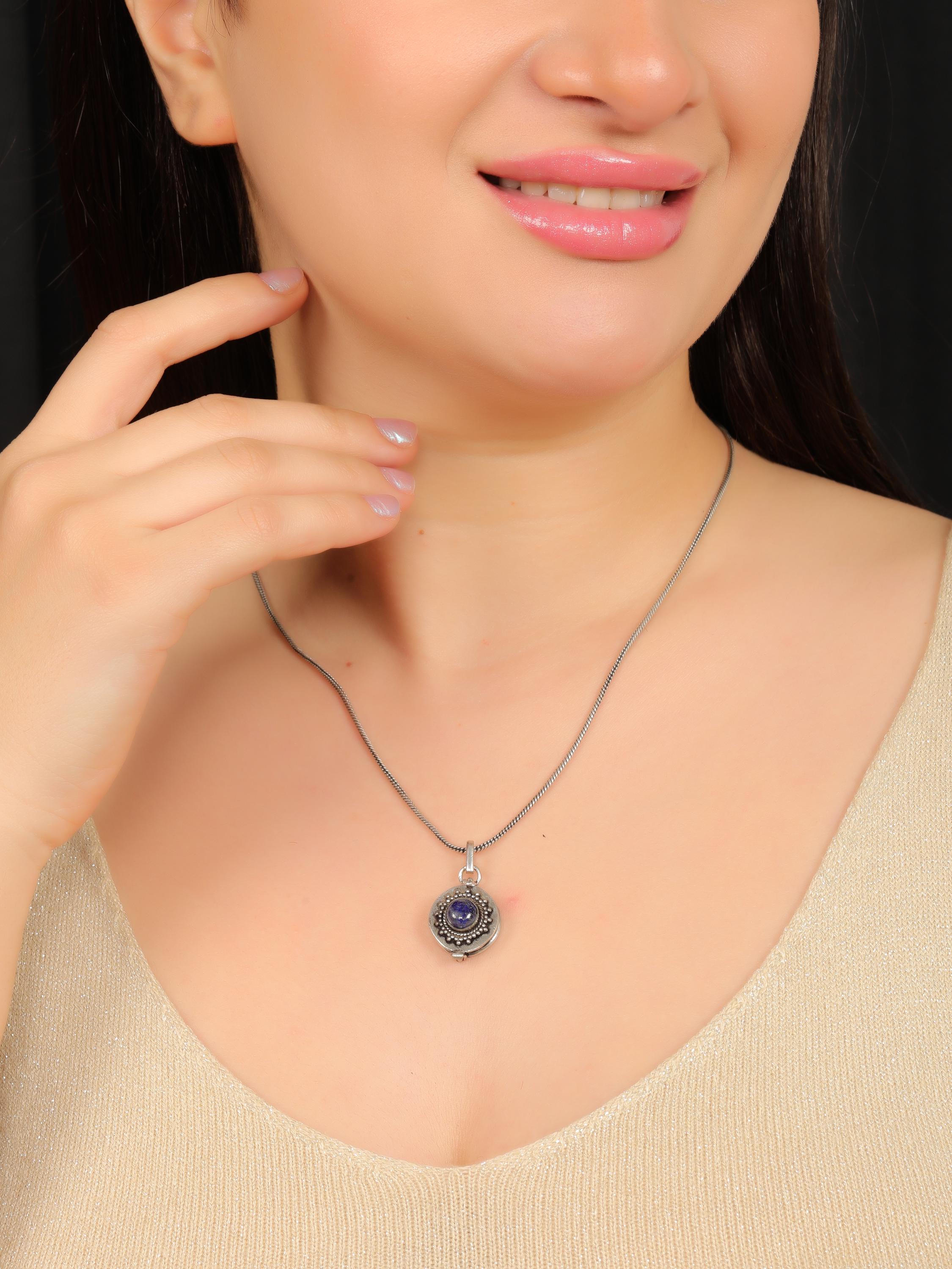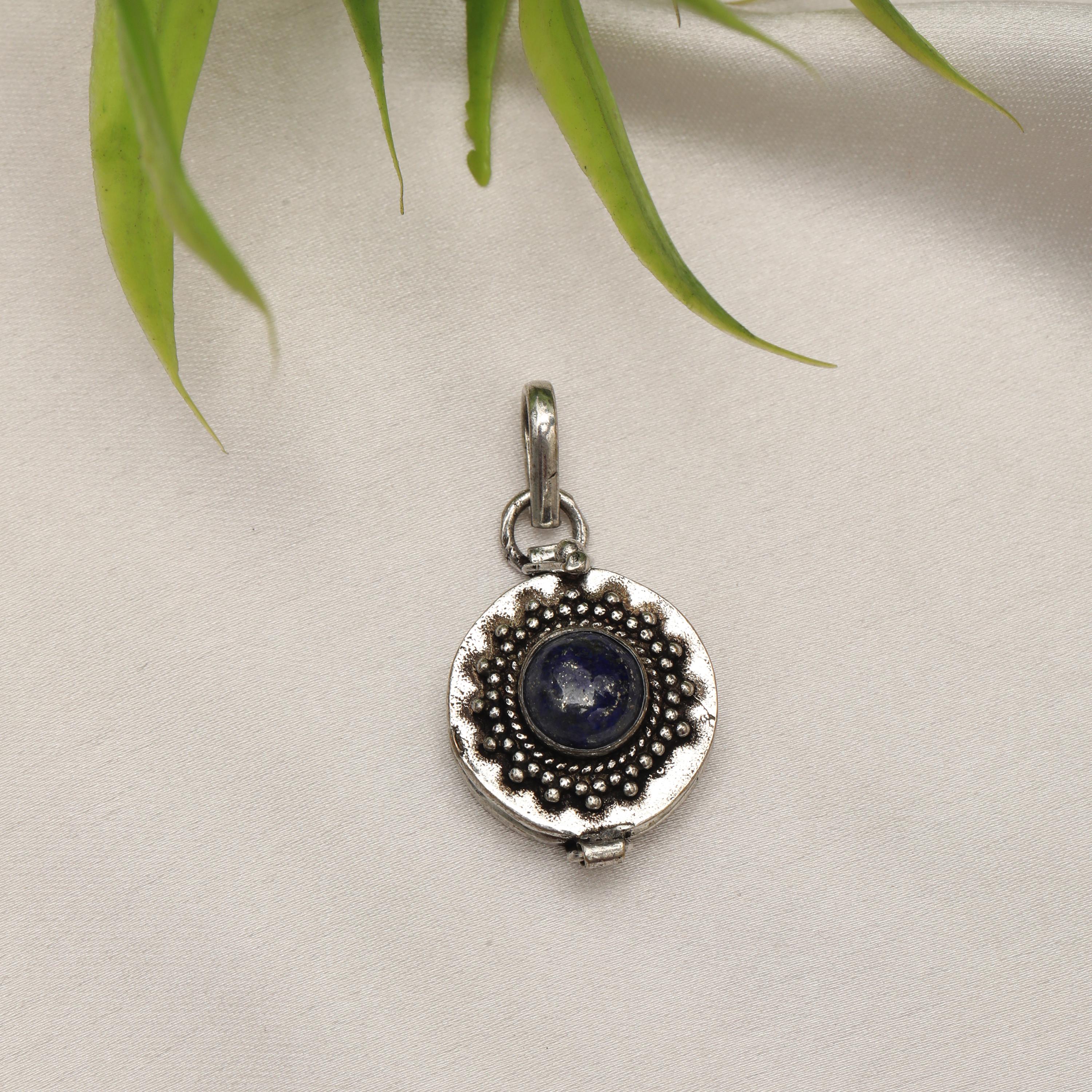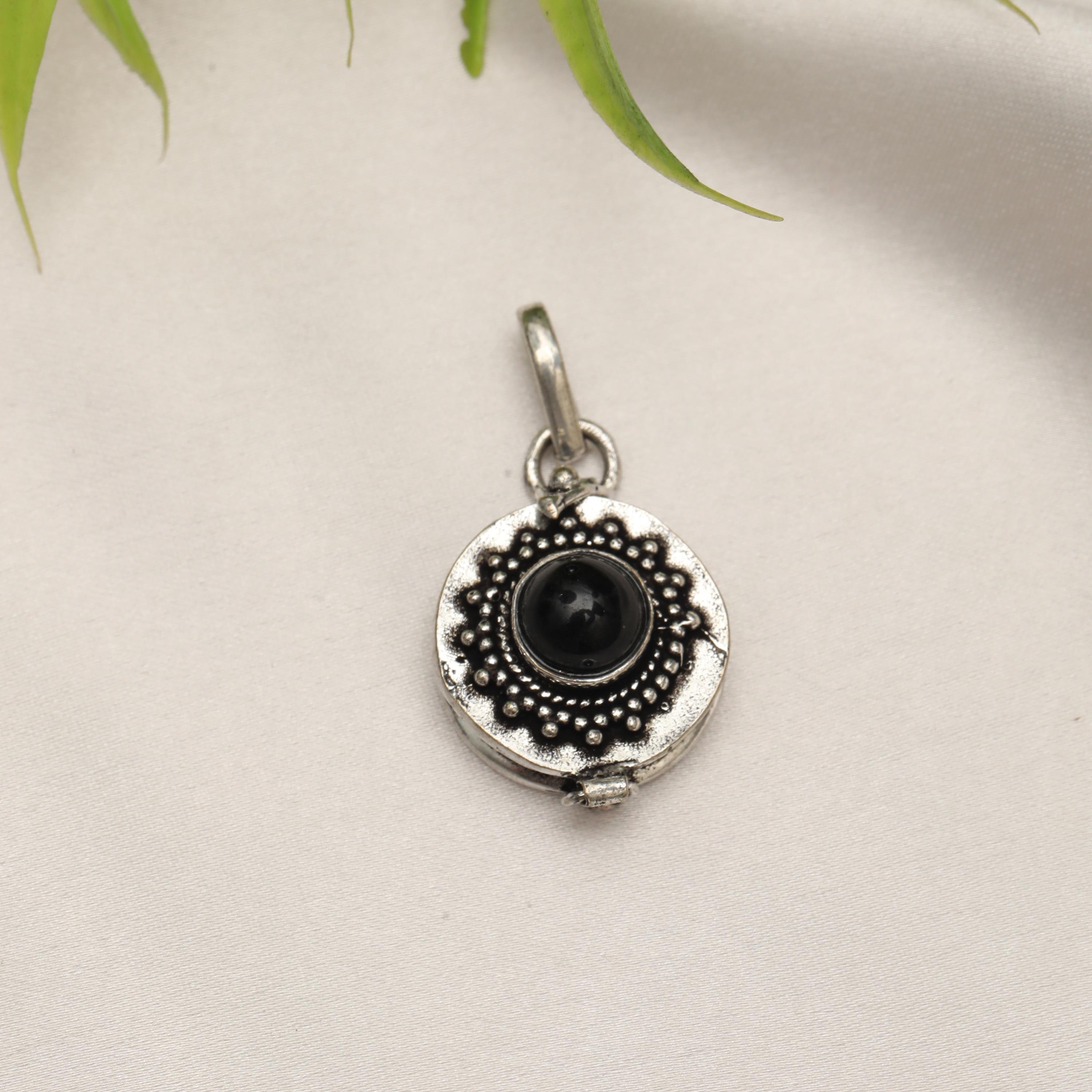 This silver tone box pendant is a statement piece inspired by ancient tribal adornments and traditional artisan metalwork. Crafted from solid brass and finished in an oxidized silver tone, it features a round, structured form that opens into a small box or locket, blending functionality with symbolic beauty.