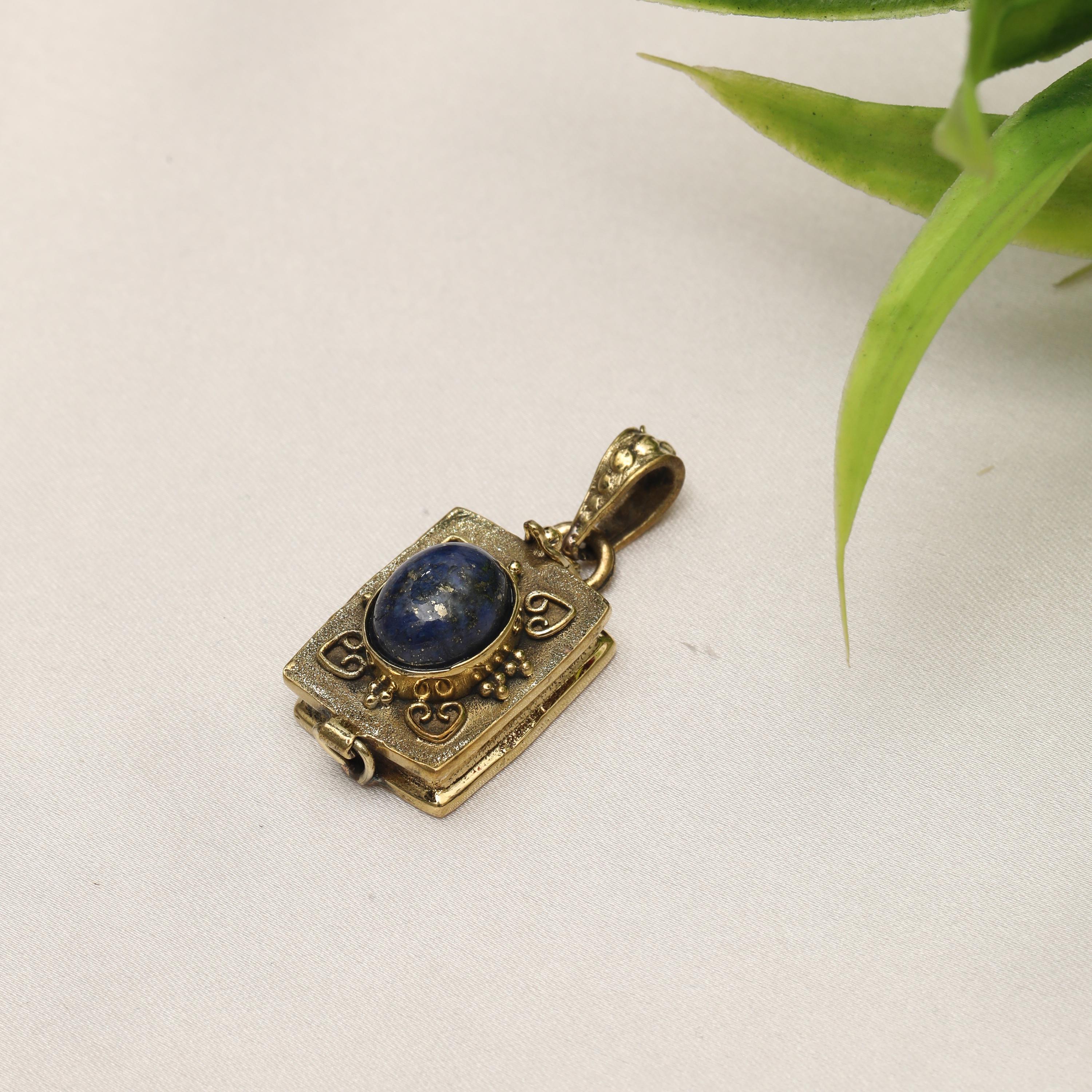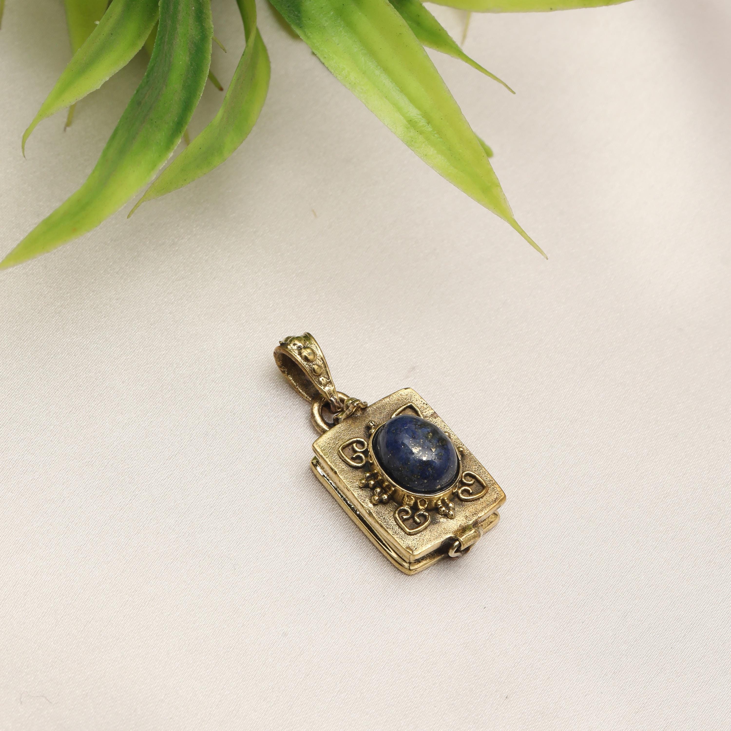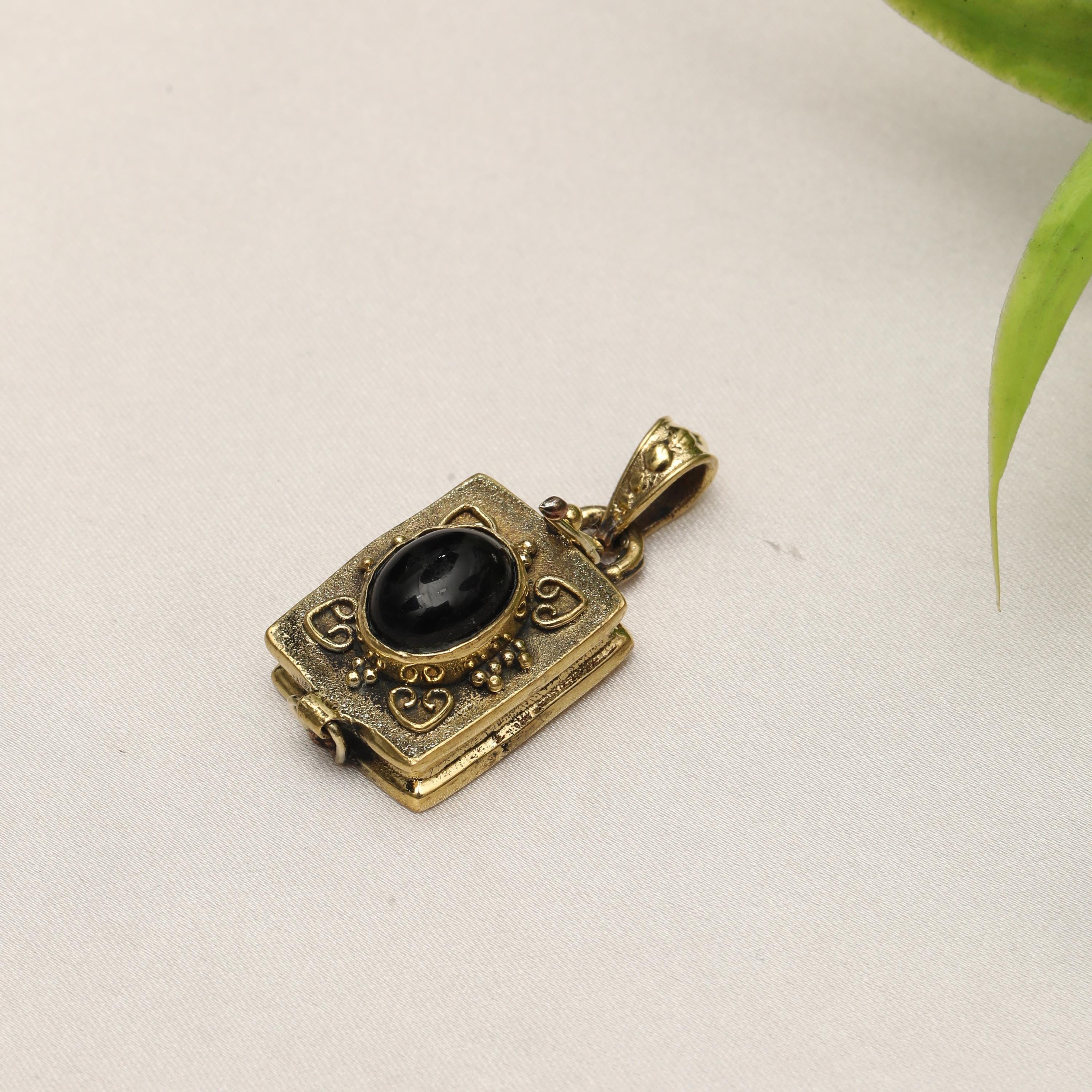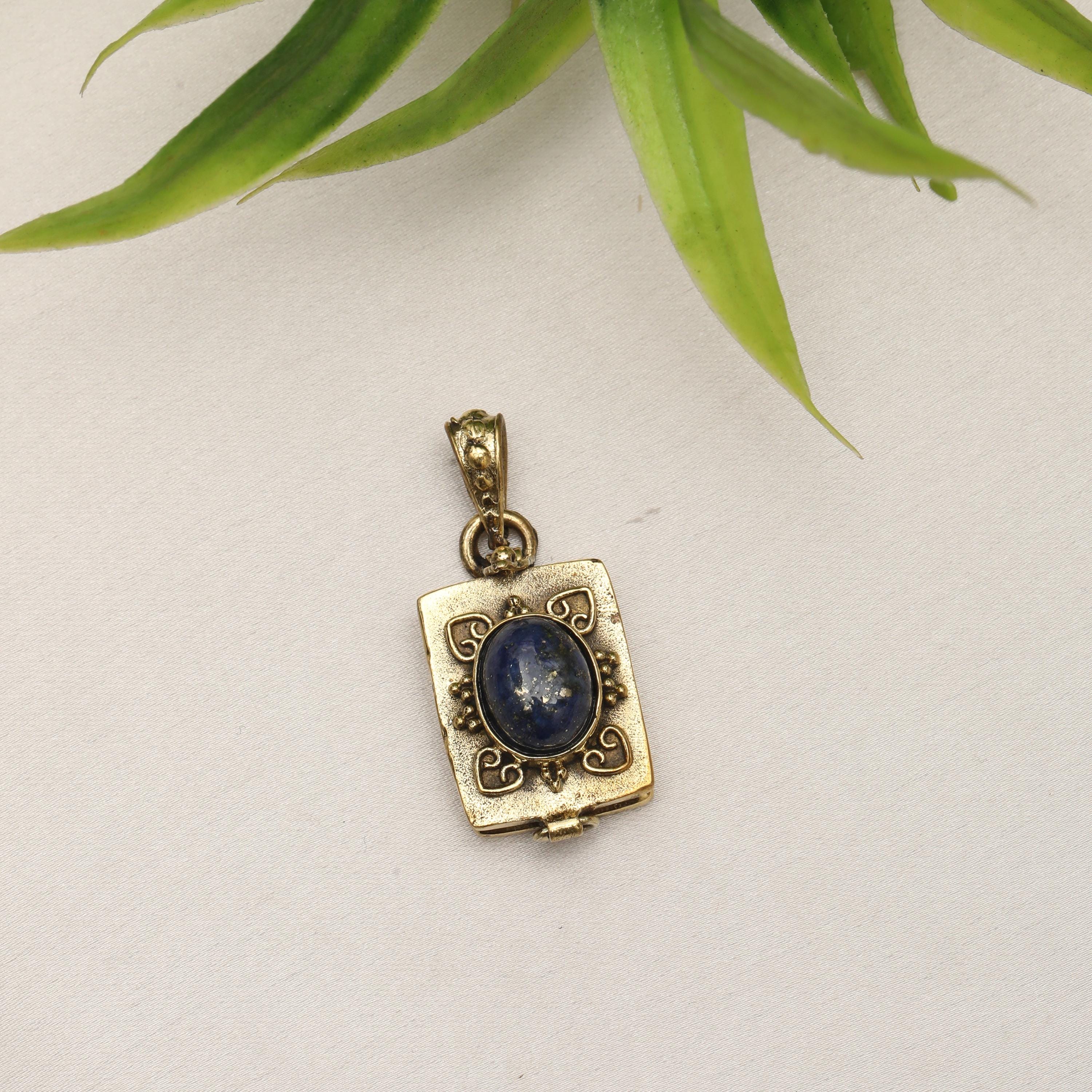 Made from solid brass, this pendant is available in both gold-tone brass and silver-tone brass, allowing easy styling with different outfits and other jewelry pieces. The locket-style construction opens discreetly, adding both meaning and functionality to the design.