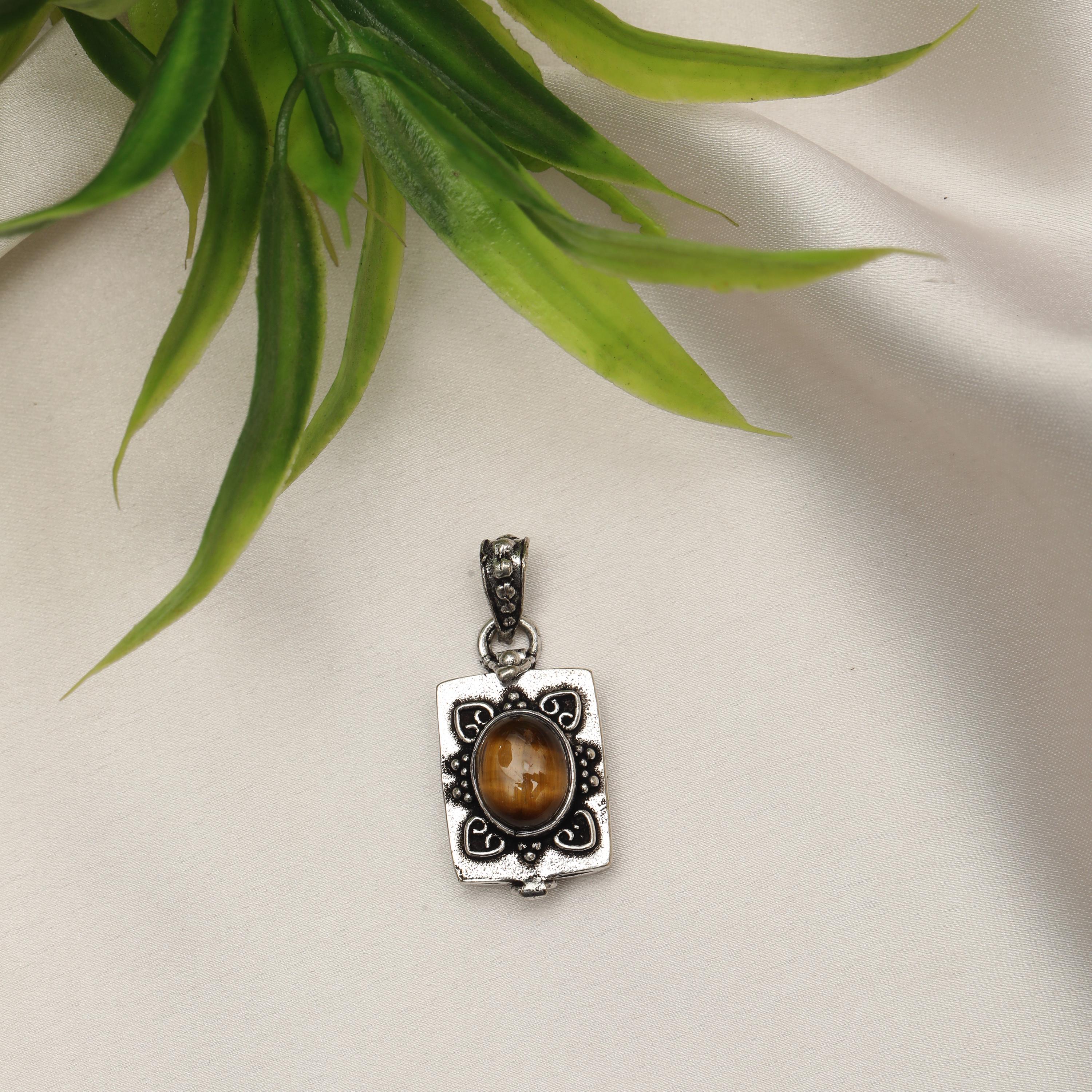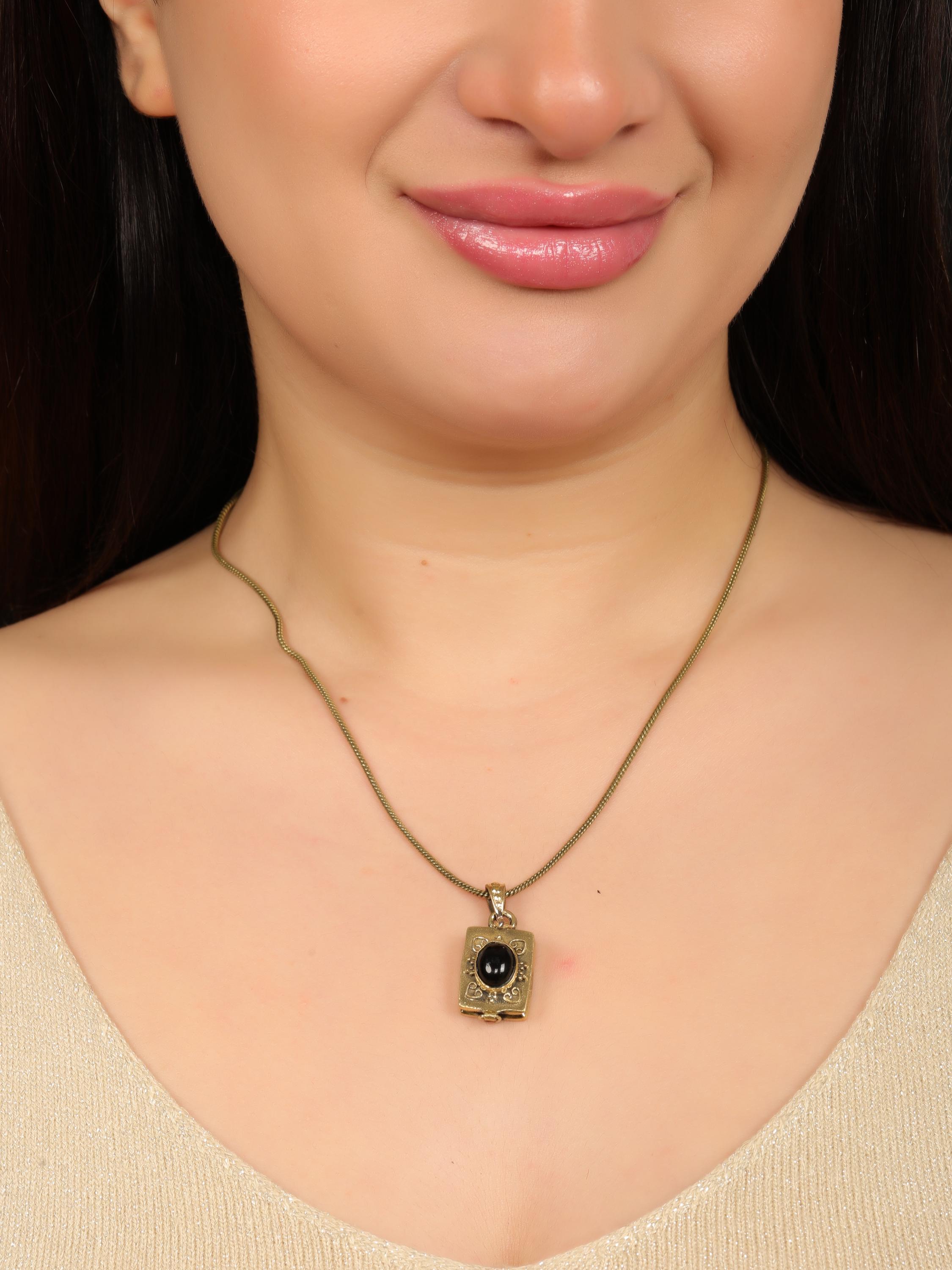 This vintage-inspired brass locket pendant showcases a bold oval-shaped stone, set within an ornamented rectangular brass frame. The clean geometry of the stone contrasts beautifully with the decorative metalwork, creating a piece that balances minimalist structure with vintage and ethnic character.