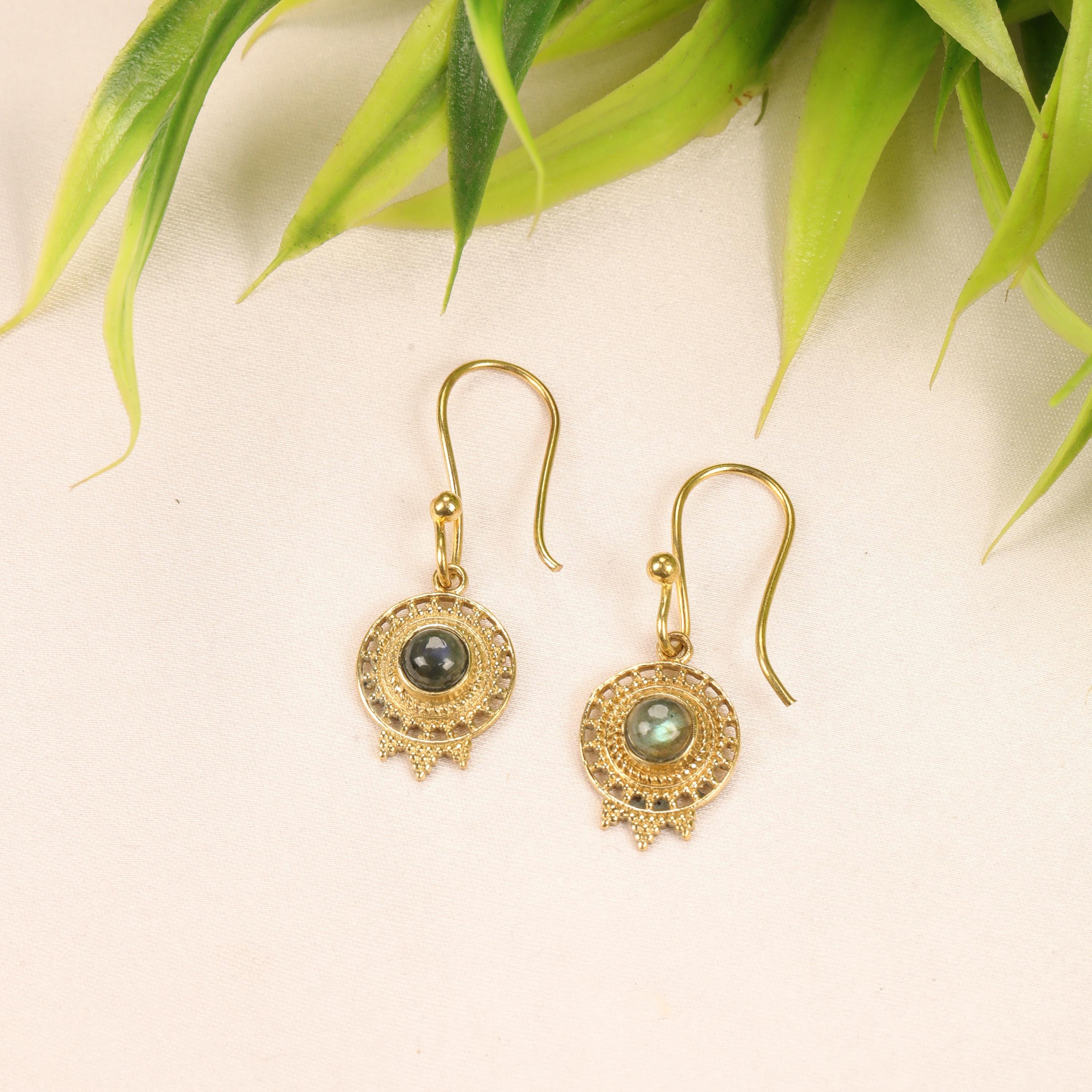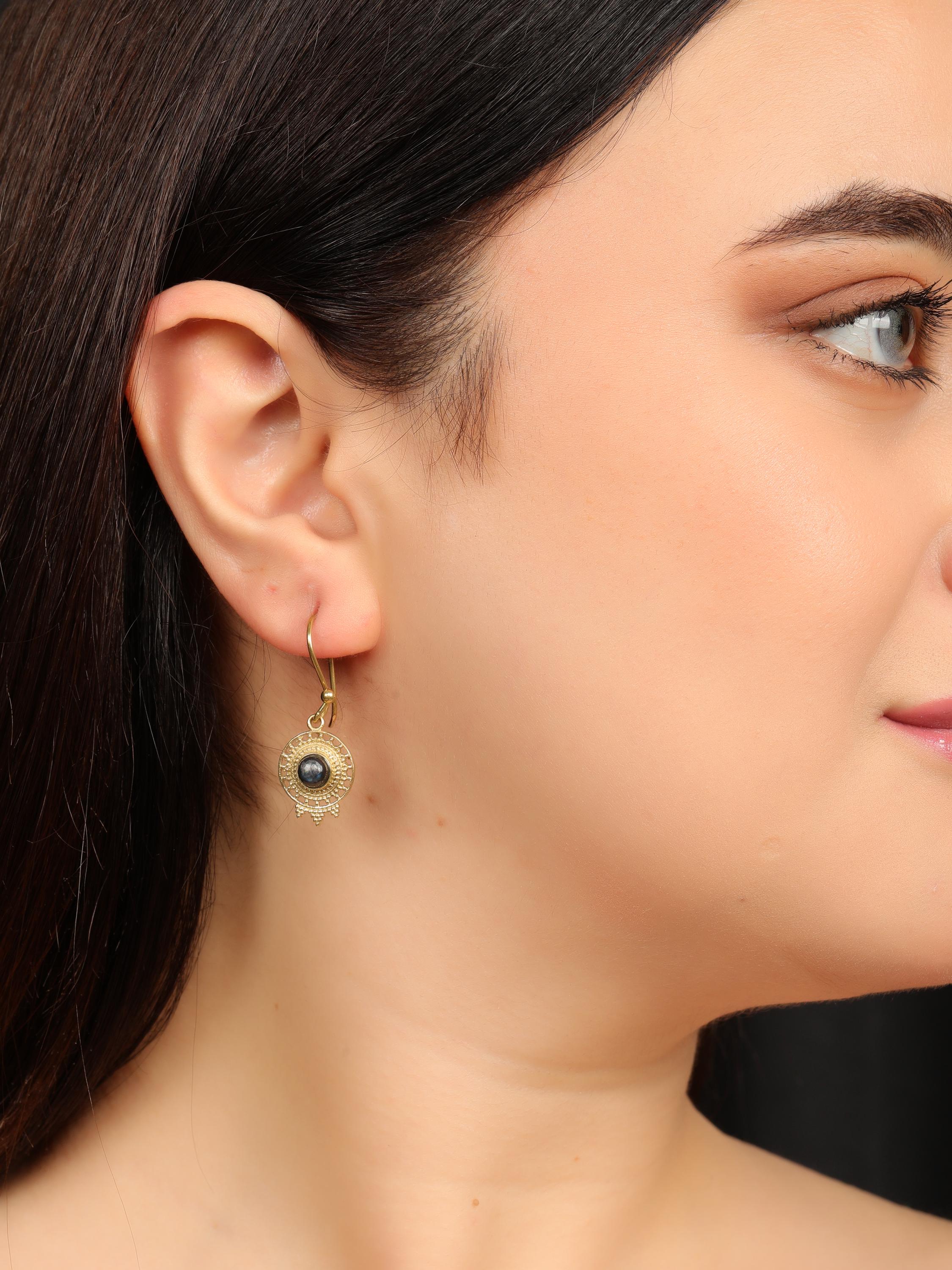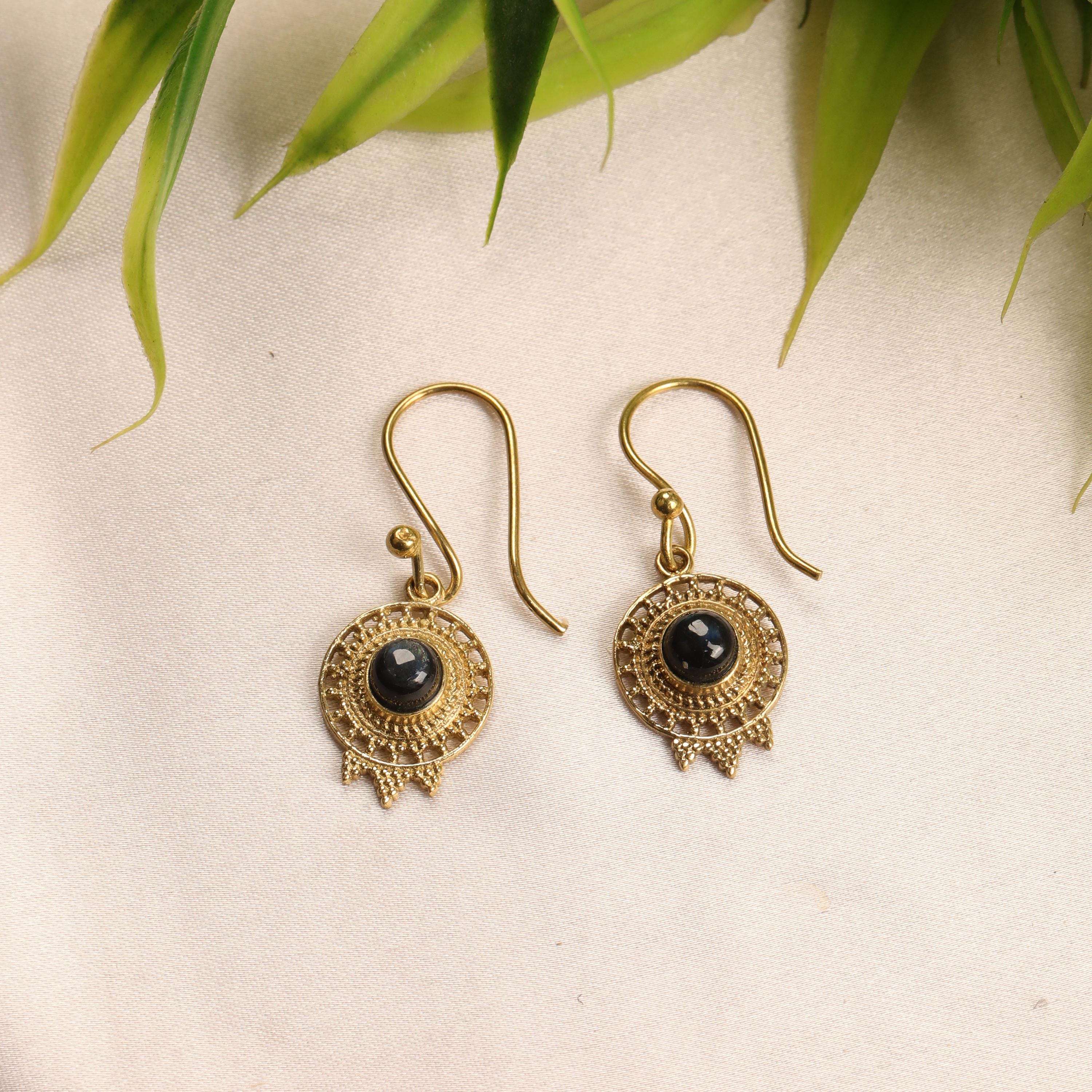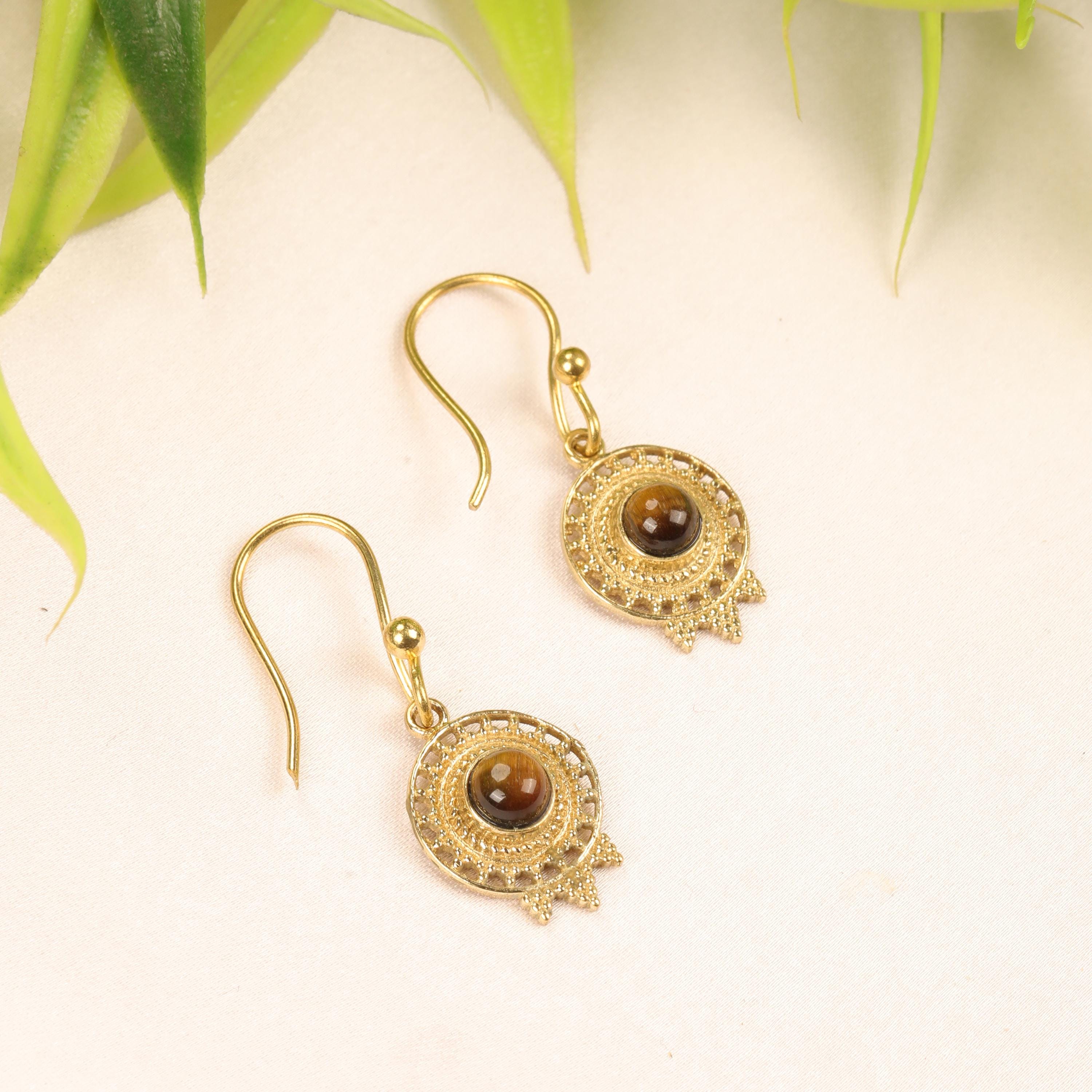 These handcrafted brass gemstone earrings feature a beautifully detailed circular design inspired by vintage and tribal jewelry traditions. Each earring showcases a textured round frame with delicate dotted accents, centered with a polished natural gemstone that adds warmth, depth, and character.