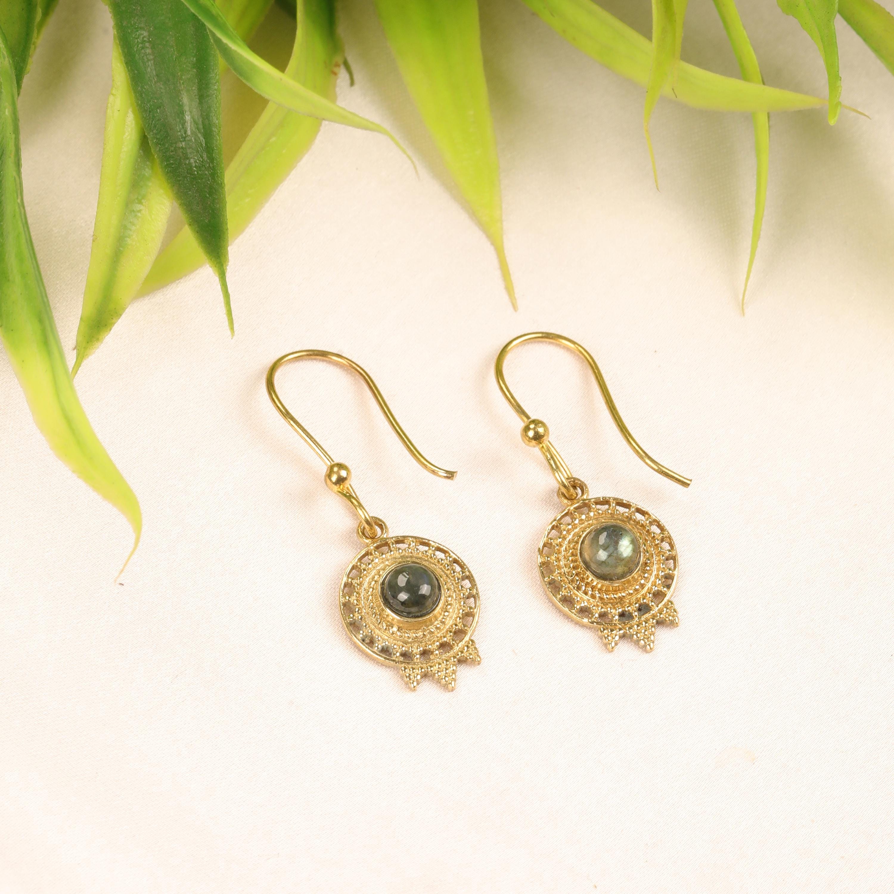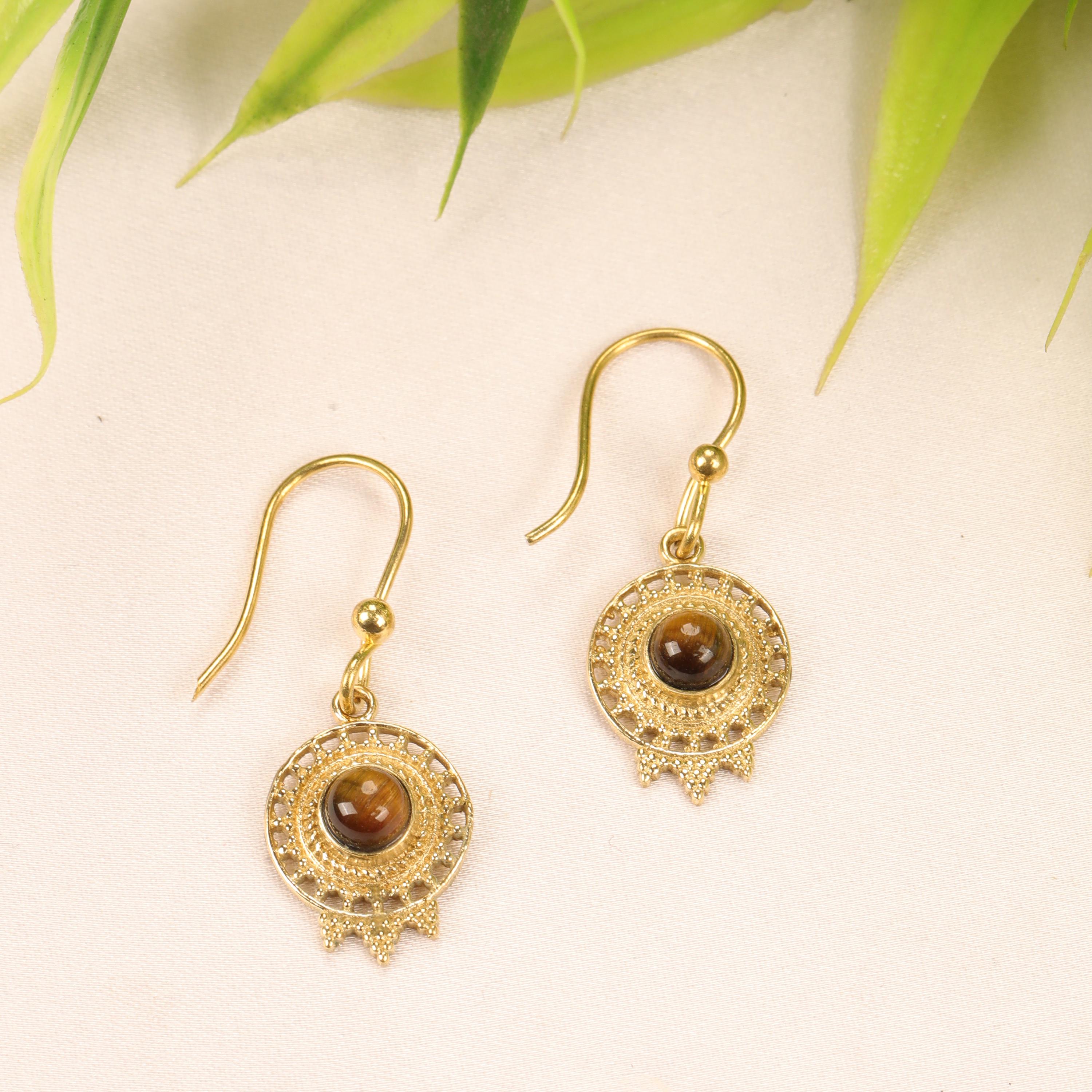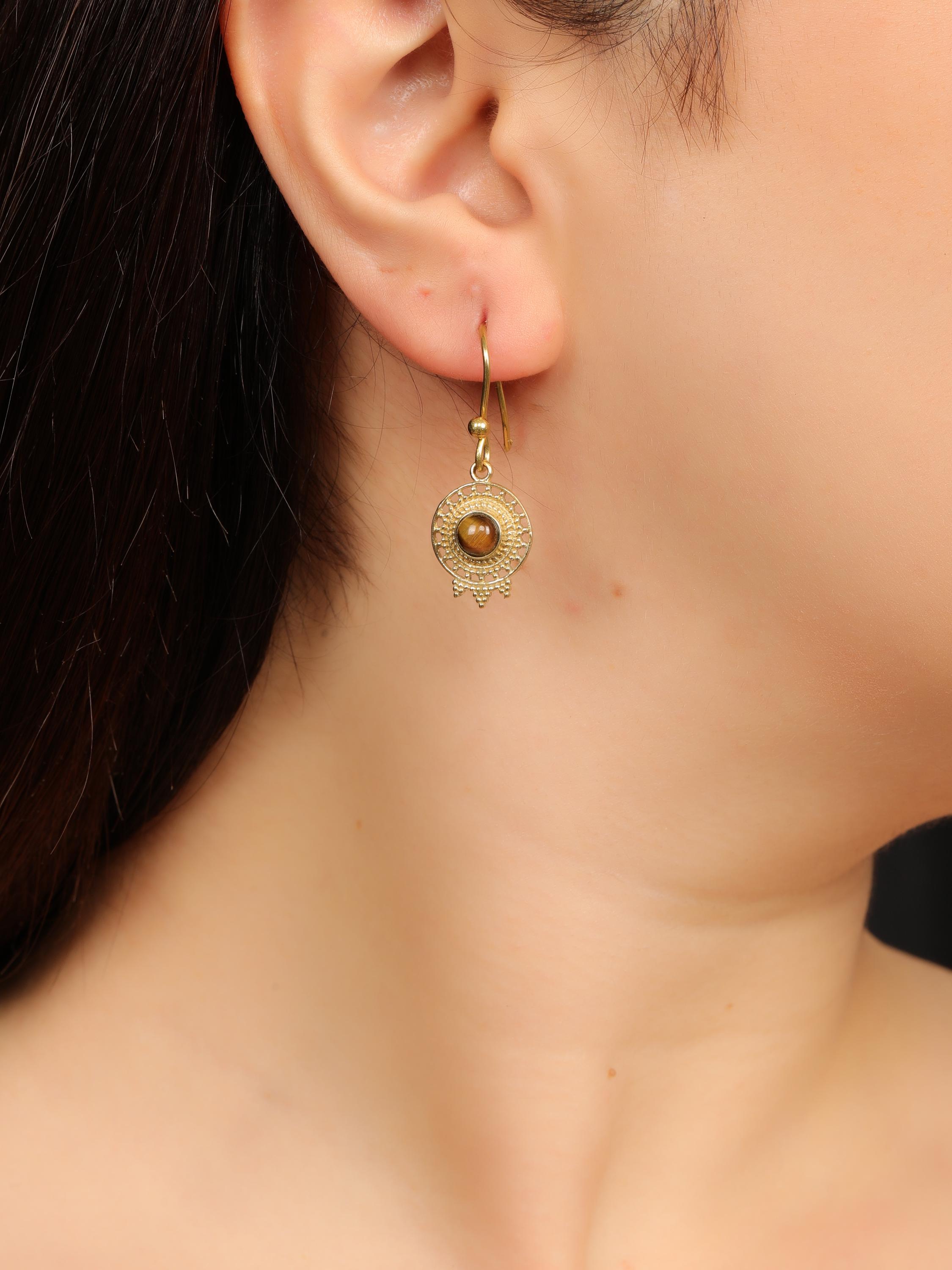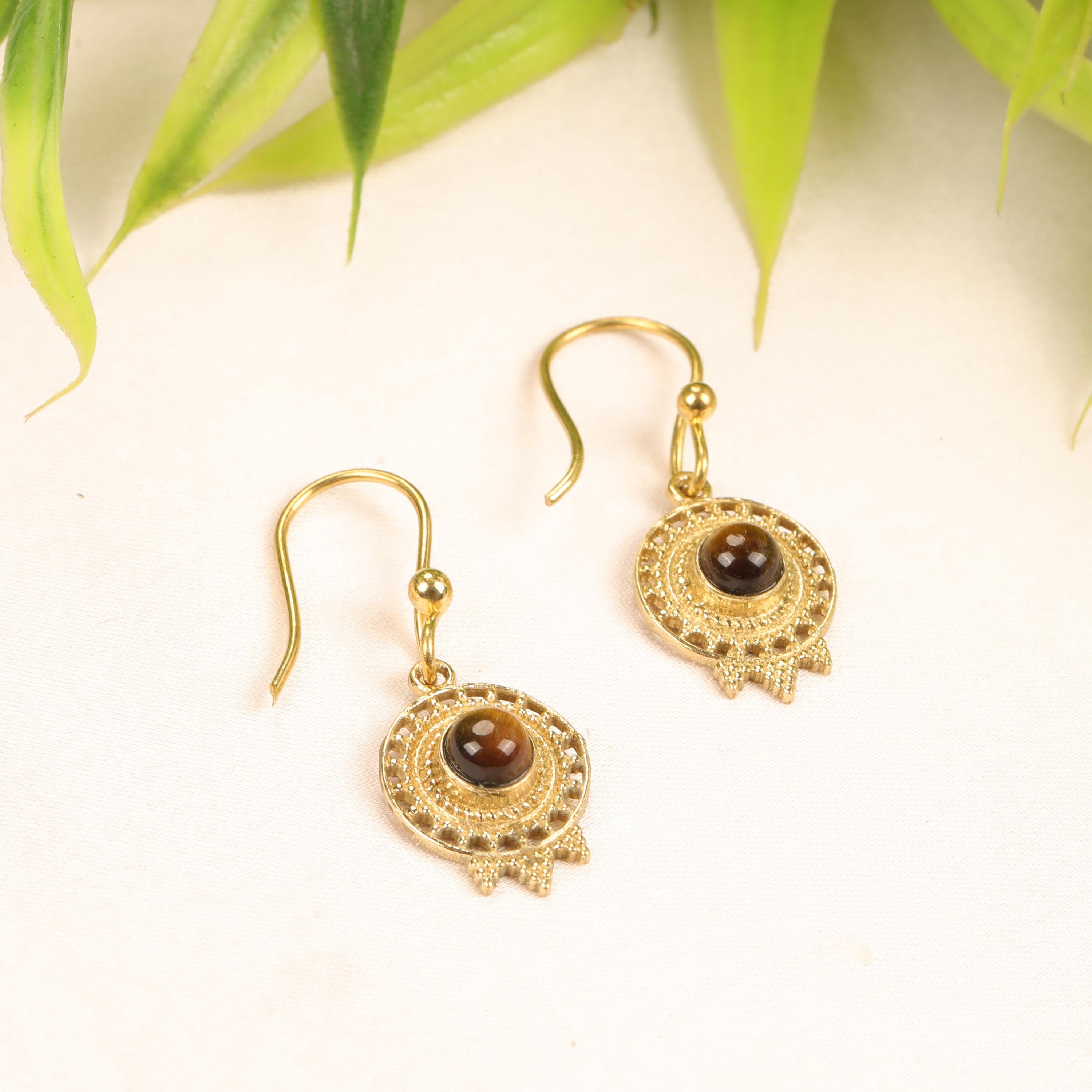 These handcrafted brass gemstone earrings feature a beautifully detailed circular design inspired by vintage and tribal jewelry traditions. Each earring showcases a textured round frame with delicate dotted accents, centered with a polished natural gemstone that adds warmth, depth, and character.