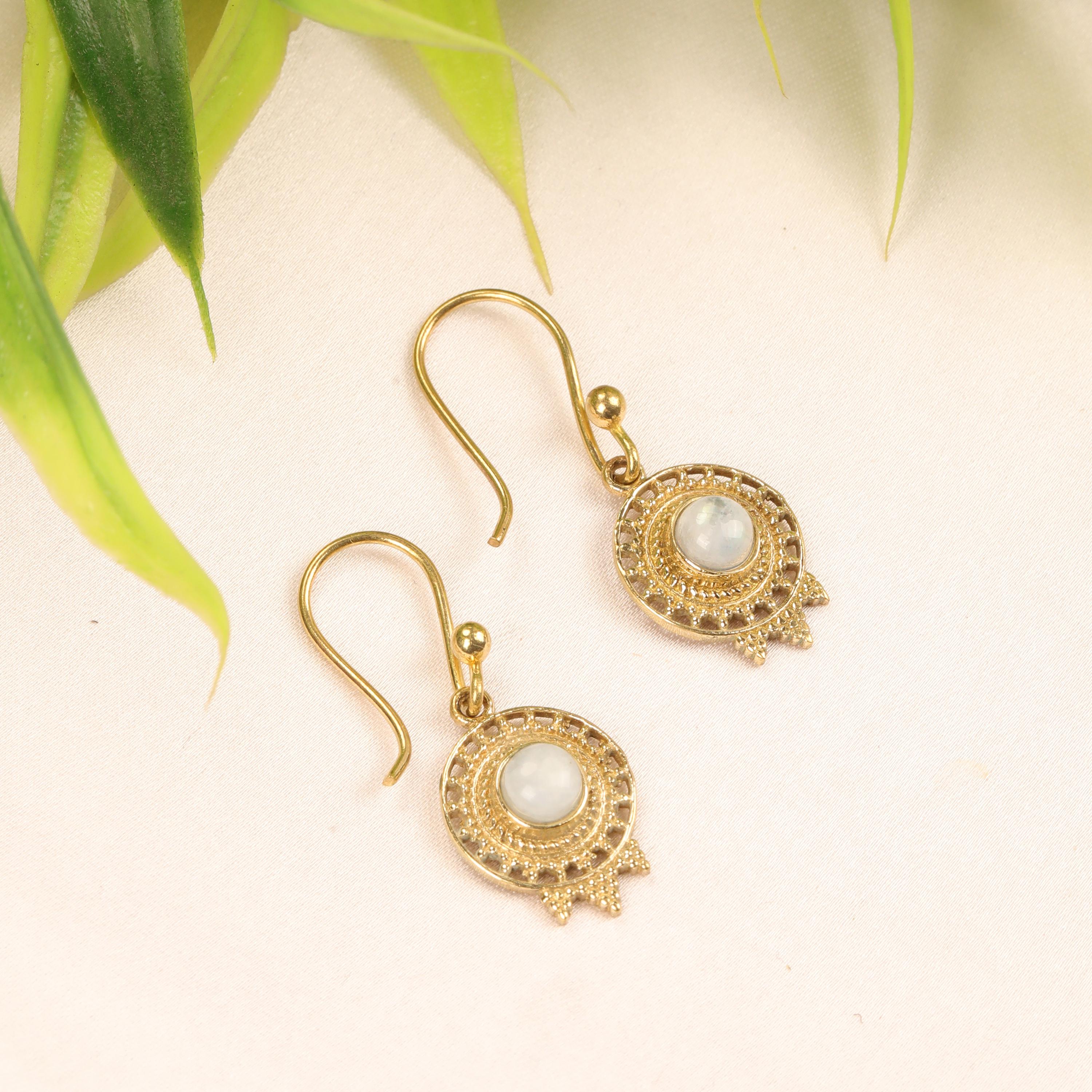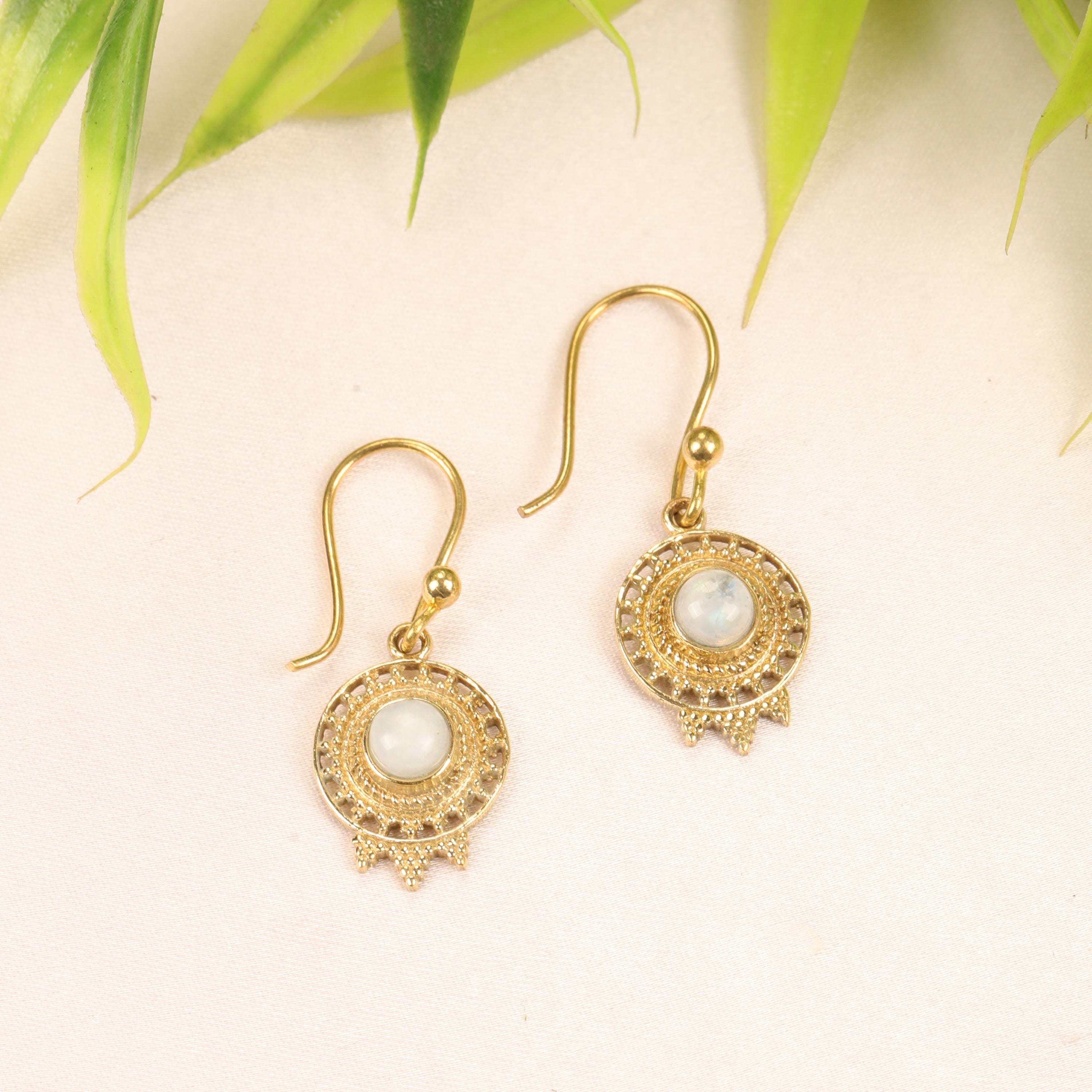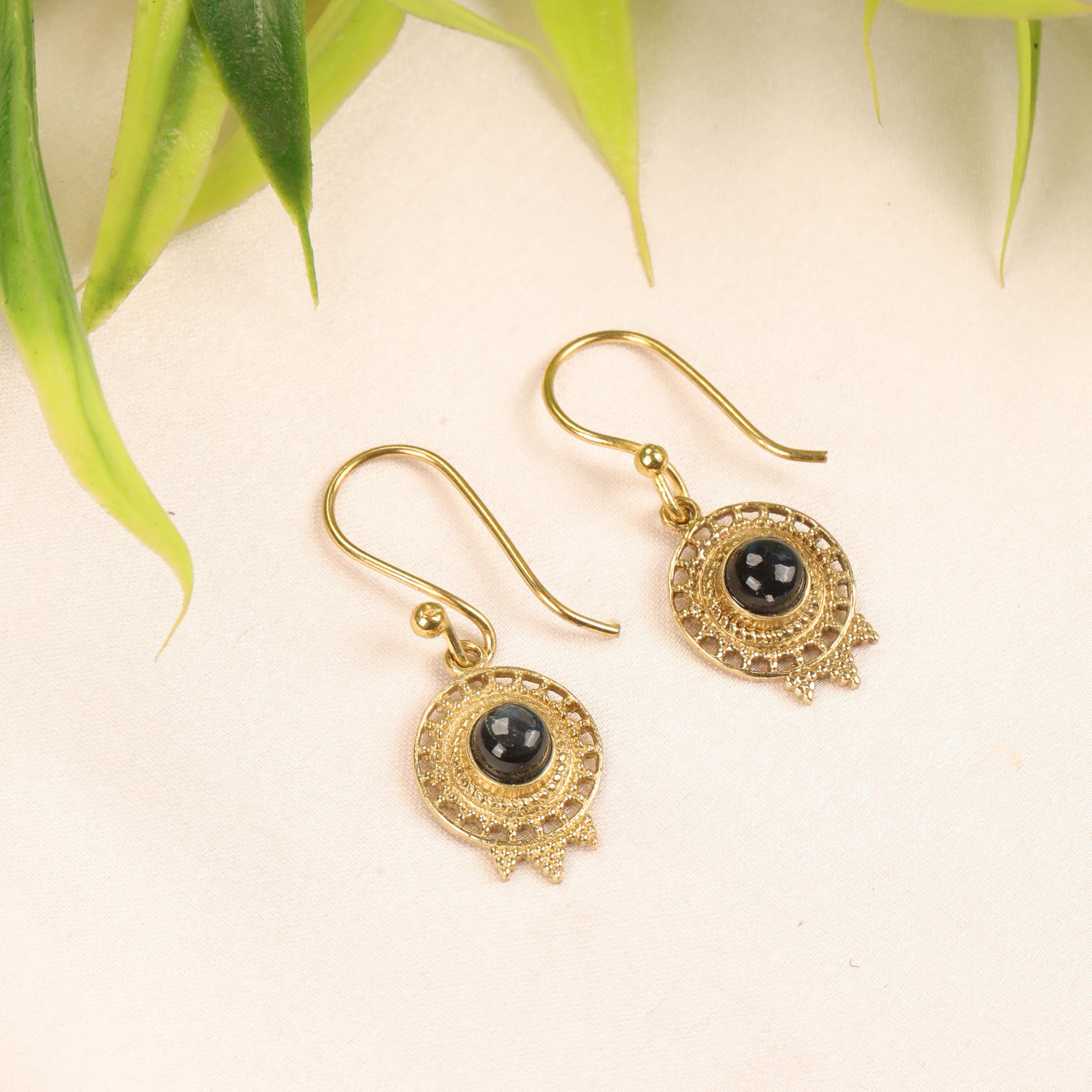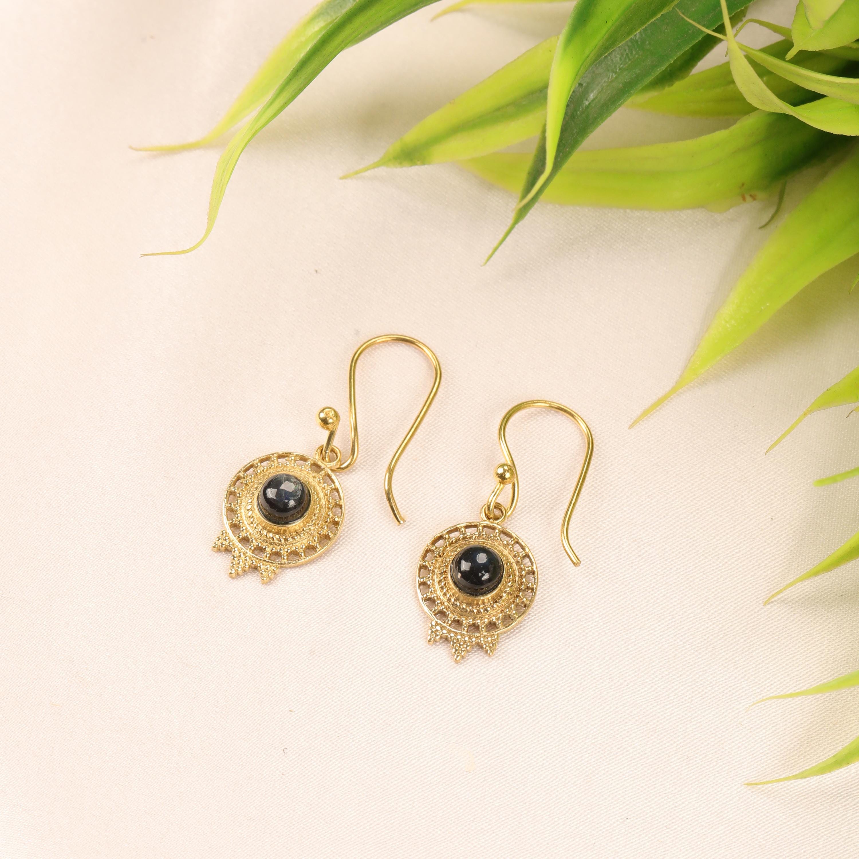 These handcrafted brass gemstone earrings feature a beautifully detailed circular design inspired by vintage and tribal jewelry traditions. Each earring showcases a textured round frame with delicate dotted accents, centered with a polished natural gemstone that adds warmth, depth, and character.