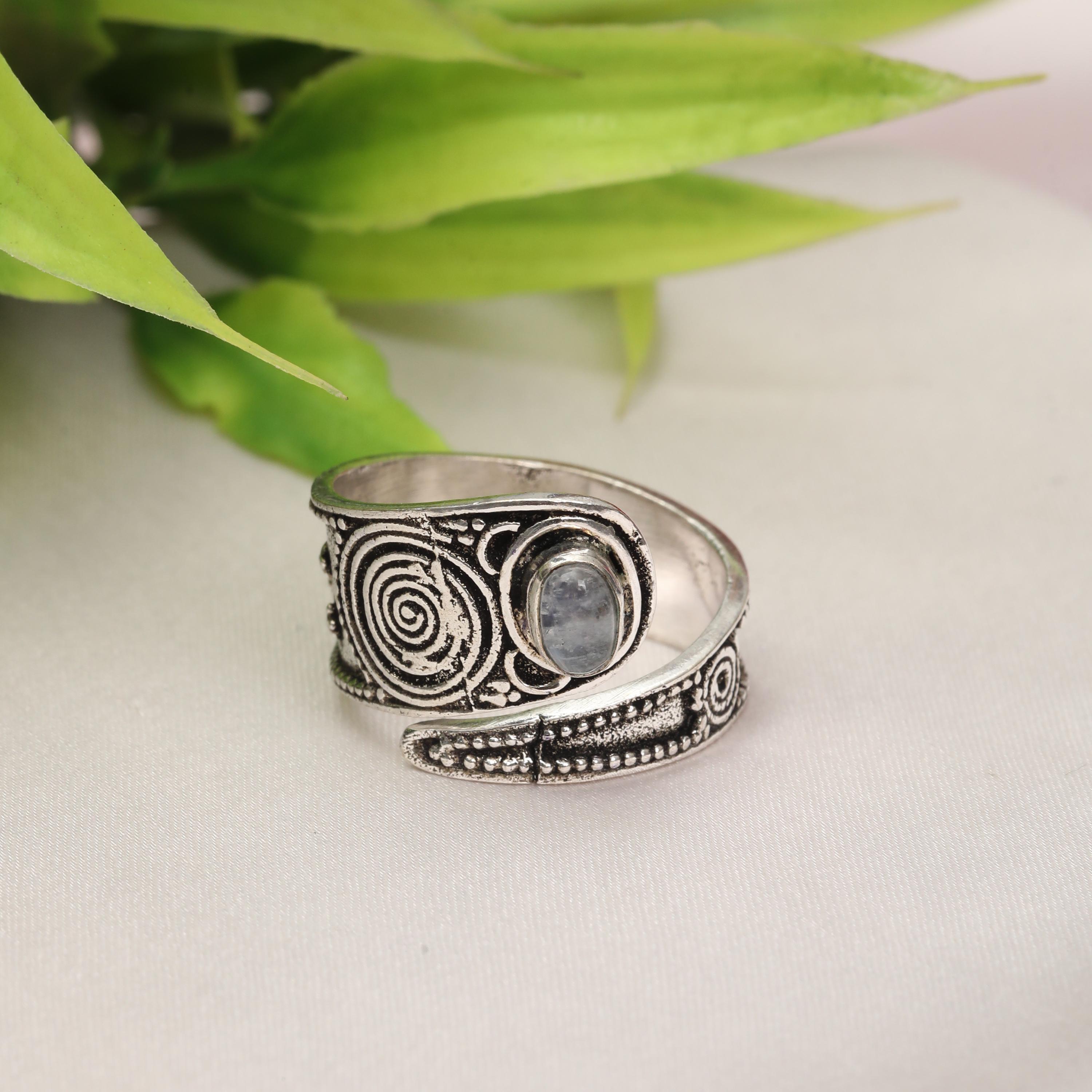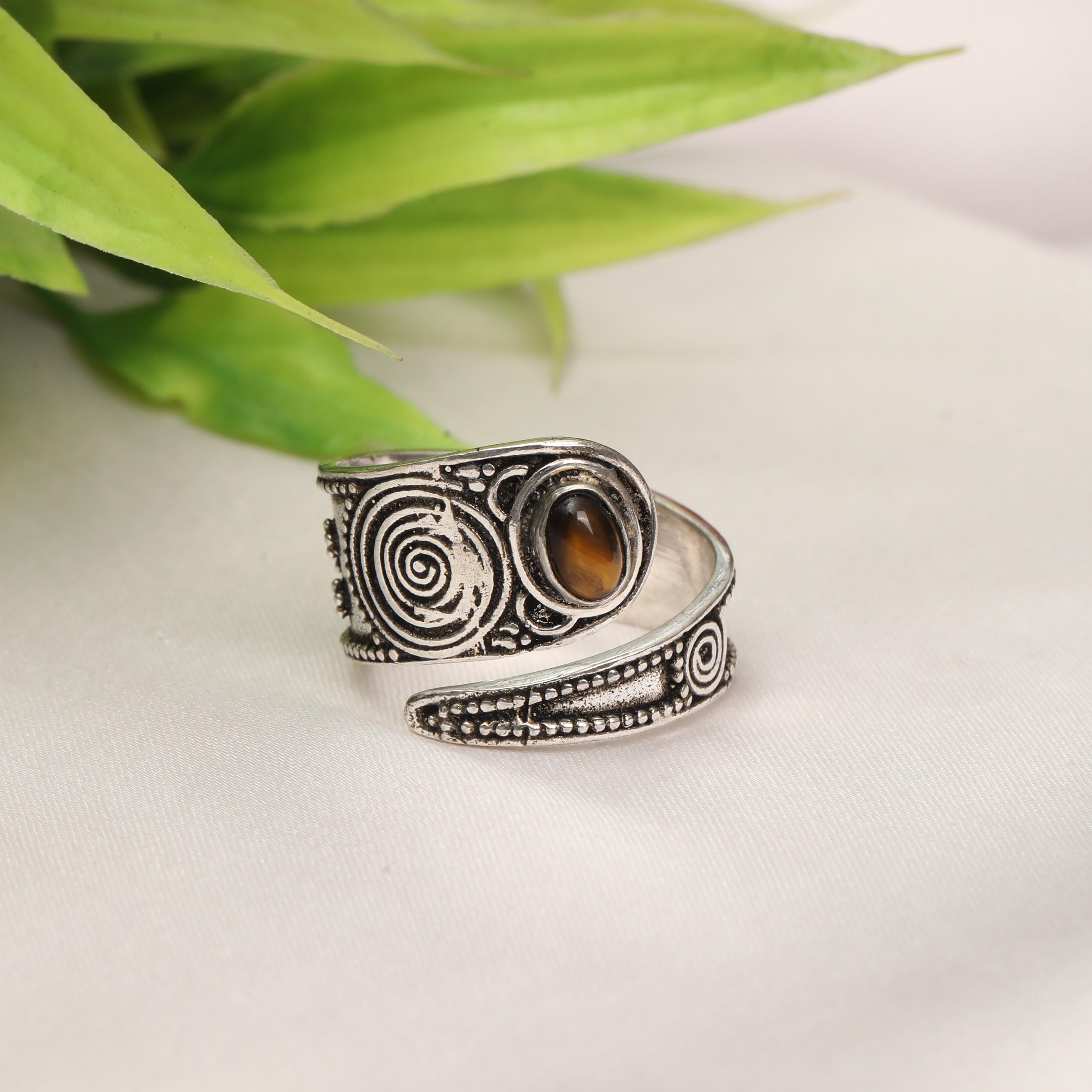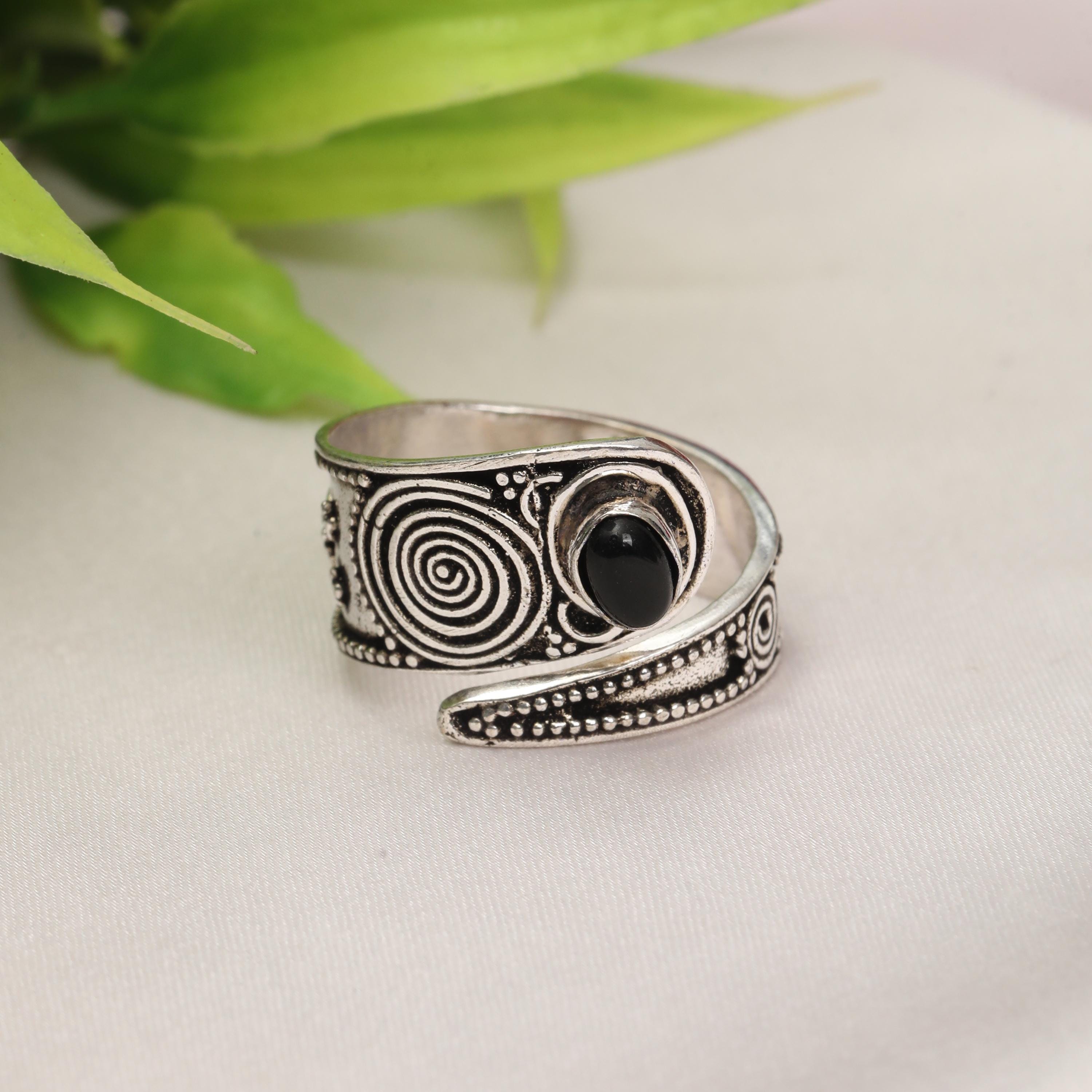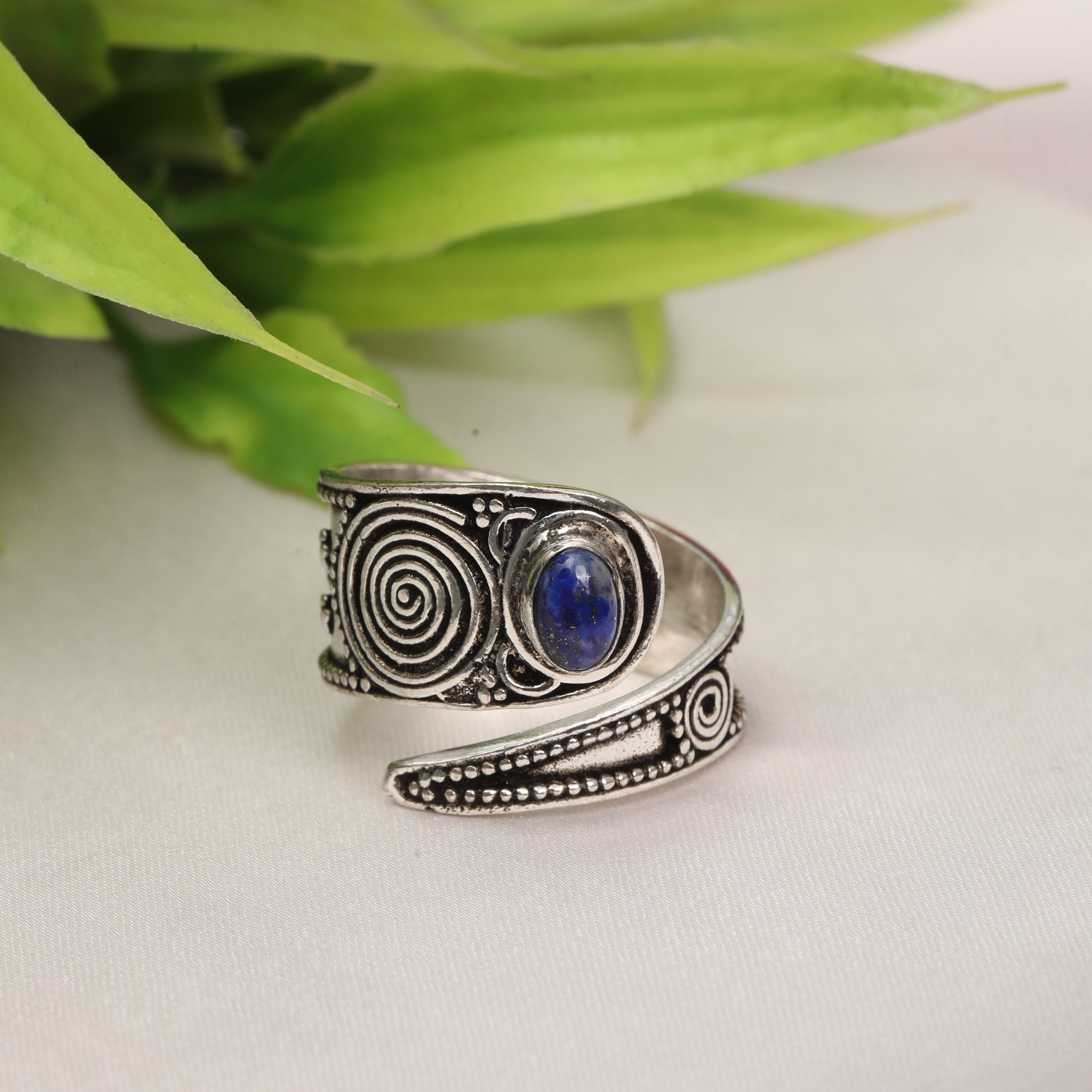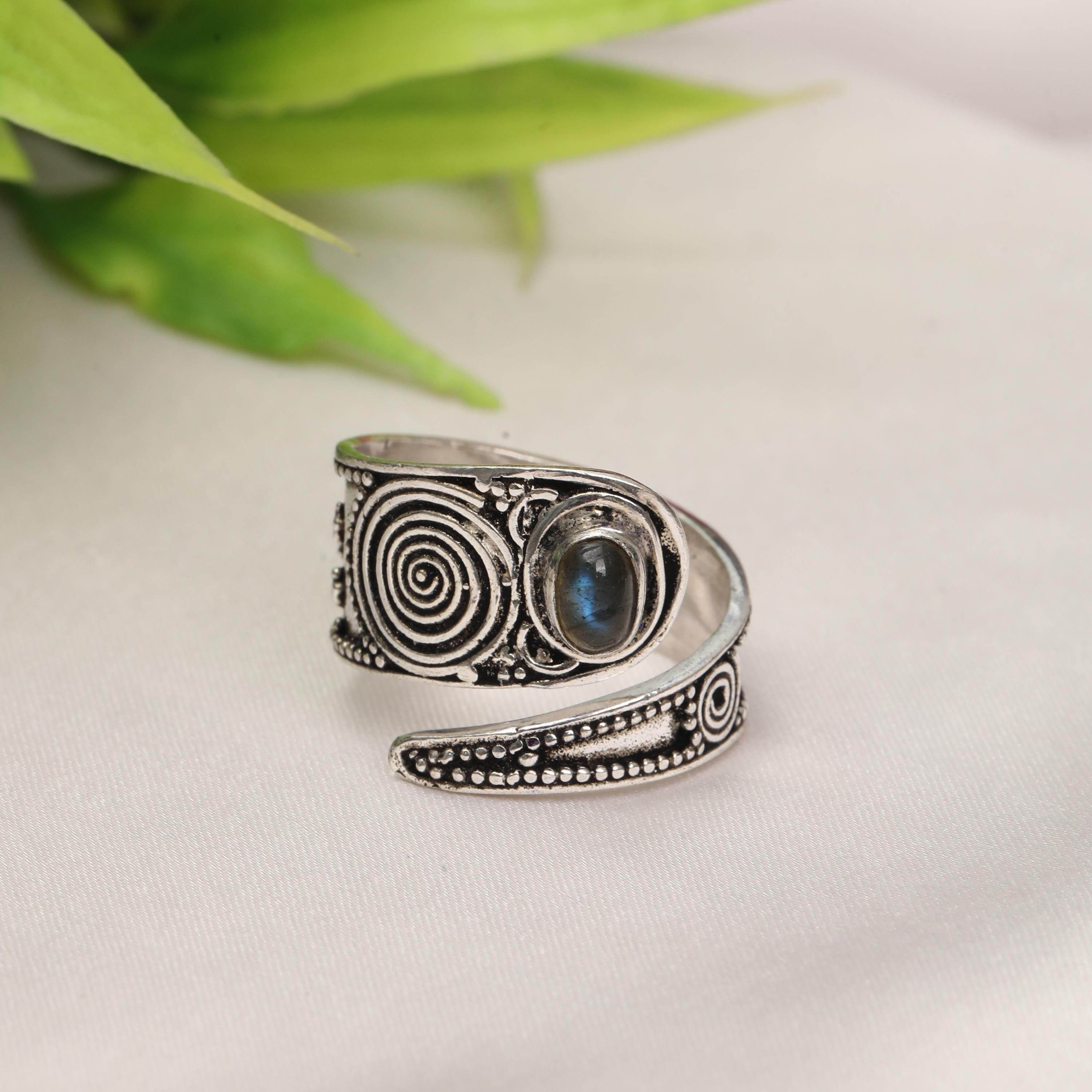 This handcrafted spiral statement ring features a striking combination of symbolic metalwork and a smooth oval stone centerpiece. The spiral motif represents continuity and energy, while the bold stone setting adds contrast and depth, creating a powerful yet wearable design.