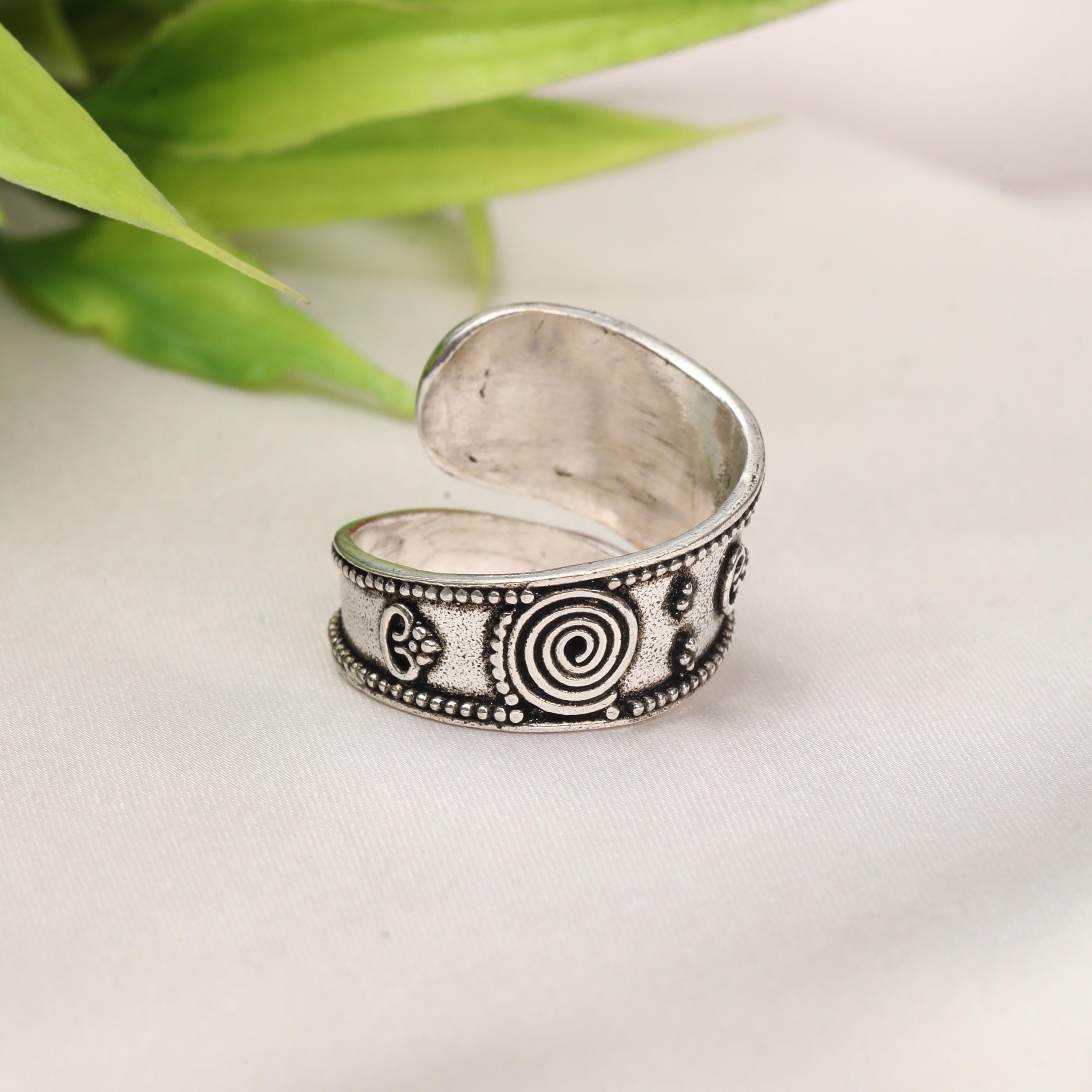 Made from brass and finished in a silver tone, this ring showcases detailed texturing and an oxidized finish that highlights every curve and pattern. The wide band design gives it a strong presence, while the adjustable open band ensures a comfortable fit for most finger sizes.