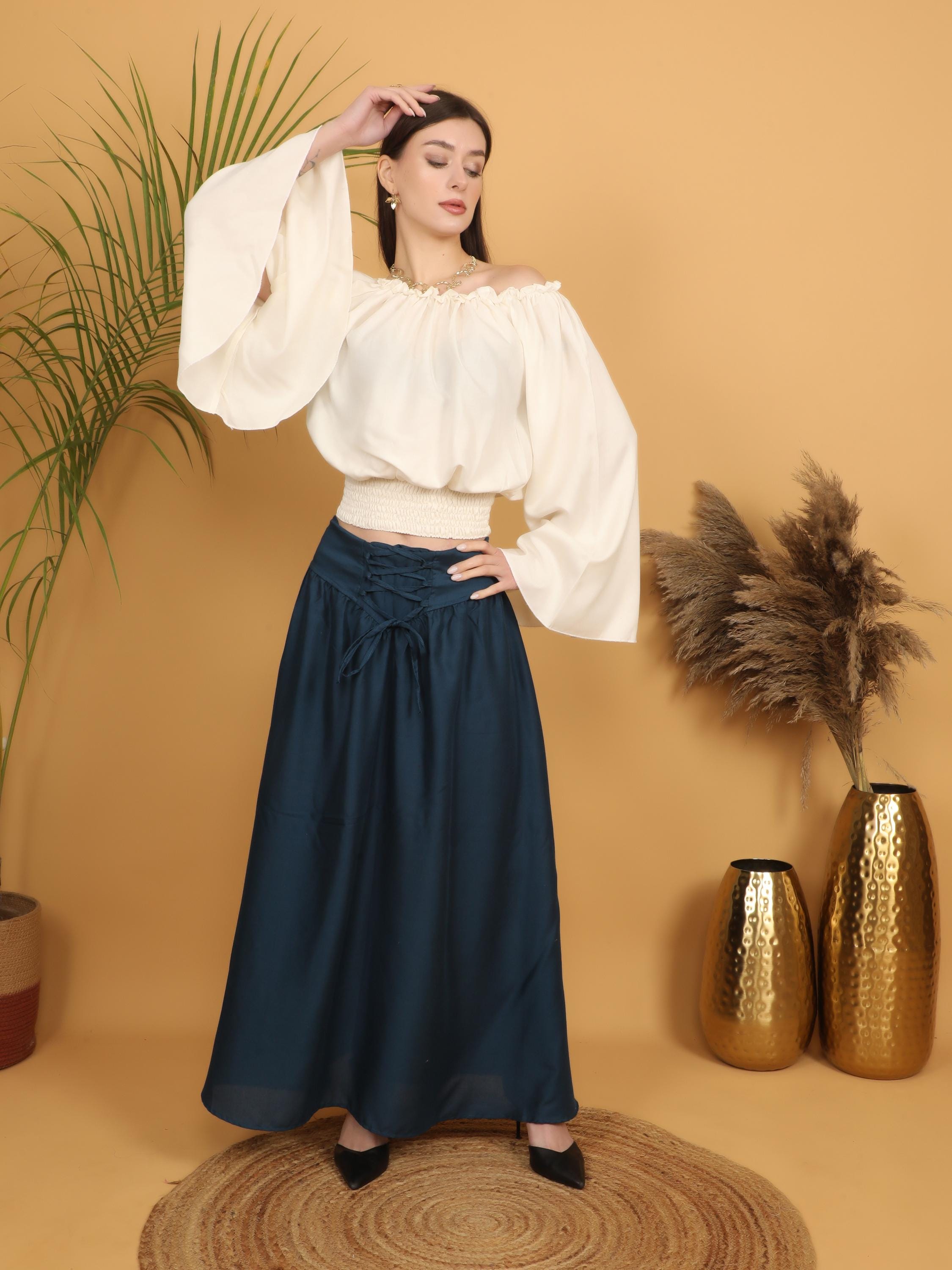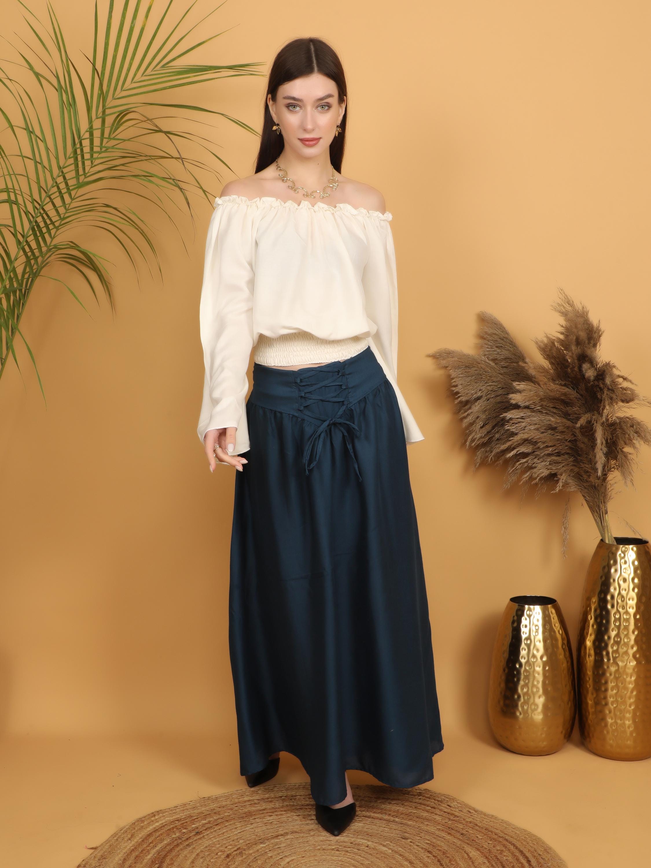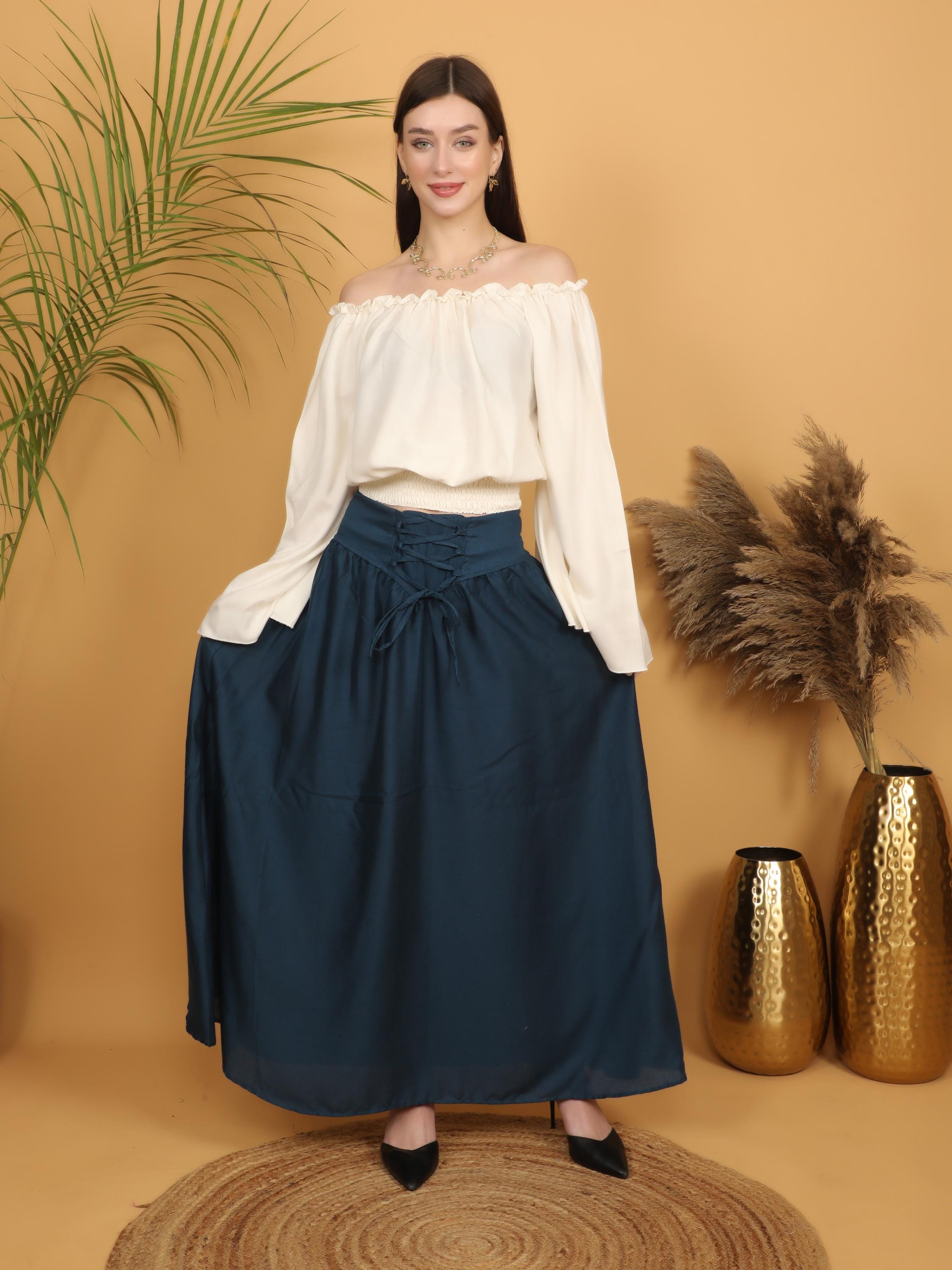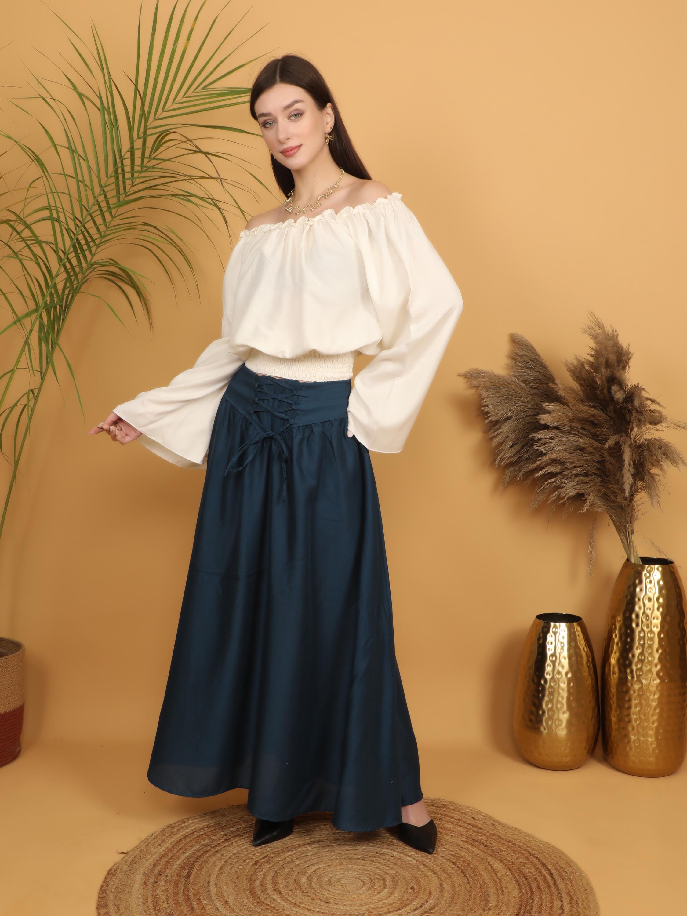 The high waist design features a corset-style lace-up front detail that brings strong medieval character to the piece. This adjustable lace-up closure not only enhances the silhouette but also adds that unmistakable renaissance aesthetic, echoing traditional bodice lacing. The structured waist flows into a full-length skirt with a soft A-line shape, creating beautiful movement with every step.