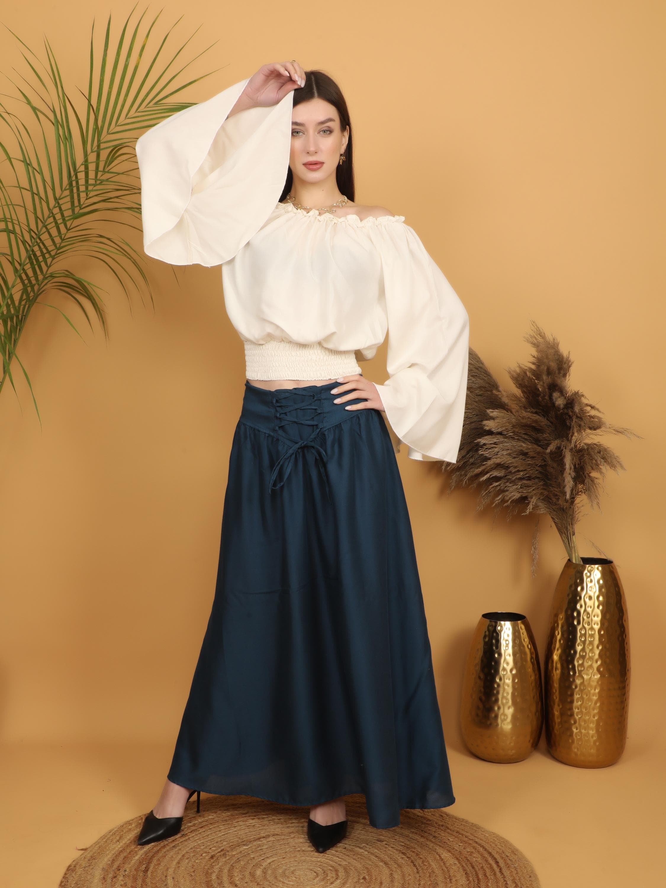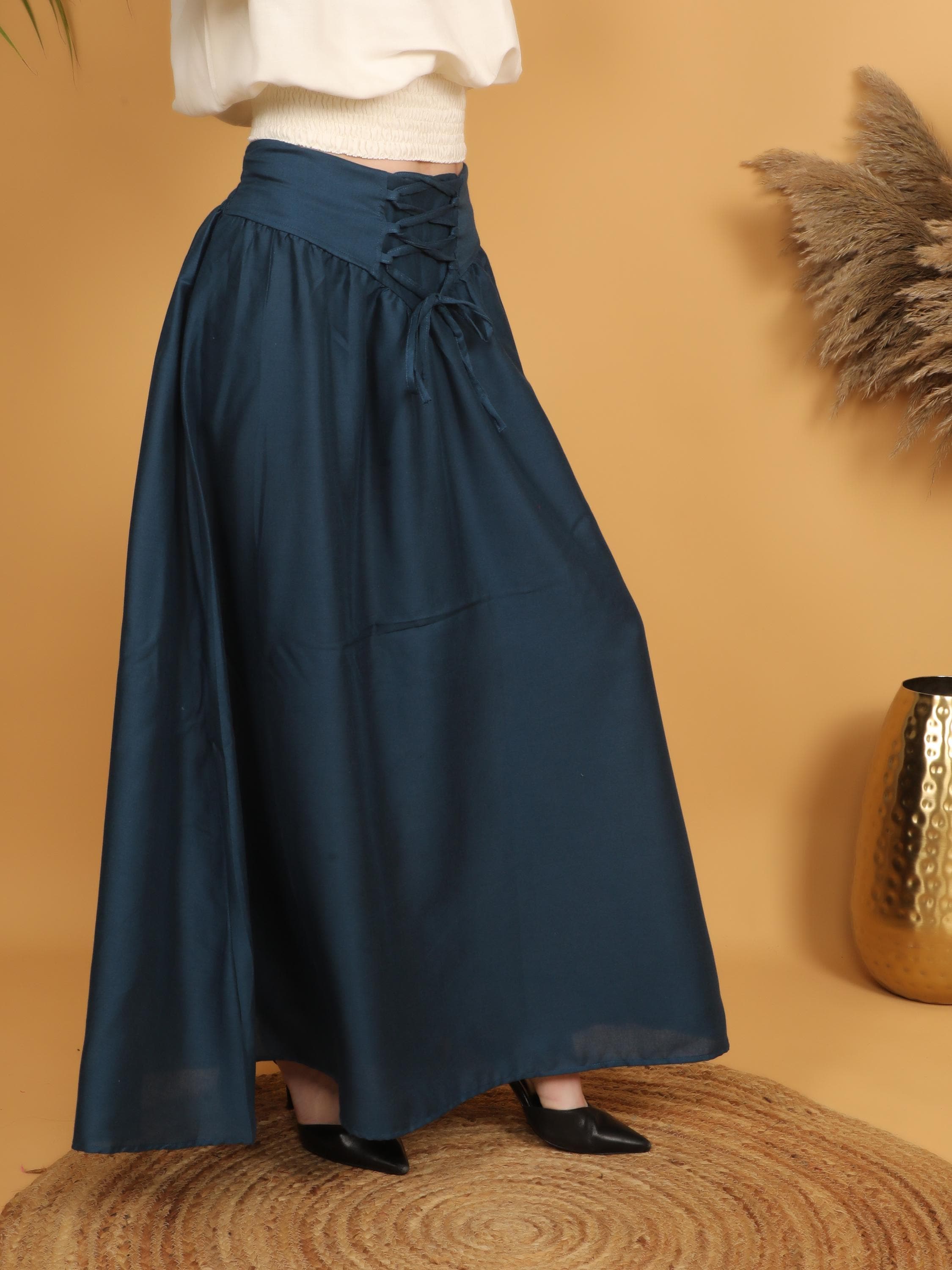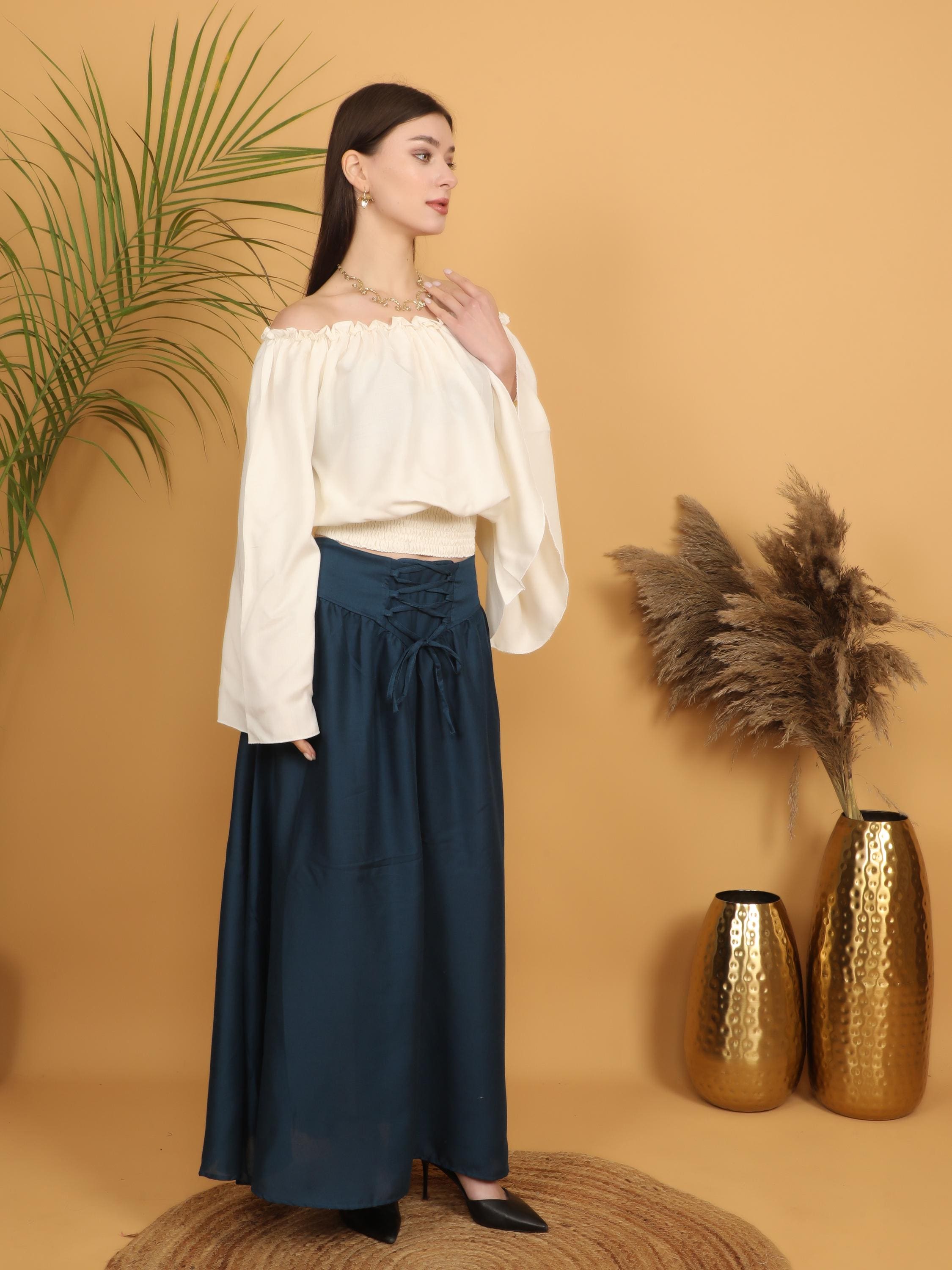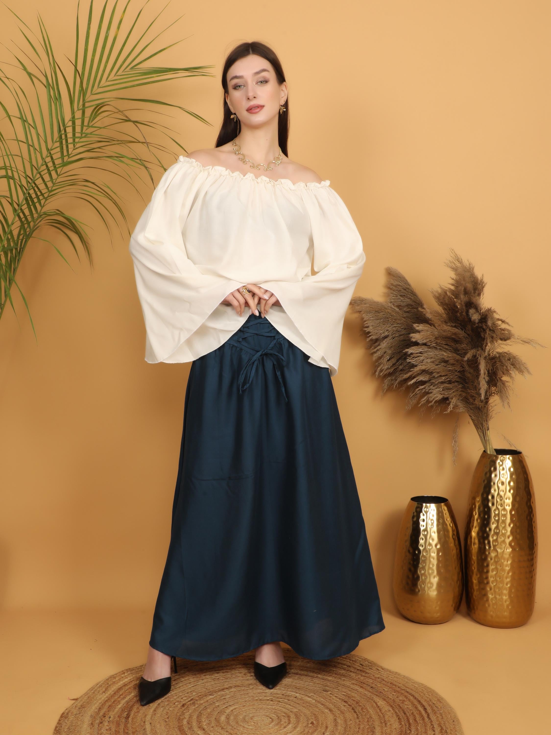 The high waist design features a corset-style lace-up front detail that brings strong medieval character to the piece. This adjustable lace-up closure not only enhances the silhouette but also adds that unmistakable renaissance aesthetic, echoing traditional bodice lacing. The structured waist flows into a full-length skirt with a soft A-line shape, creating beautiful movement with every step.