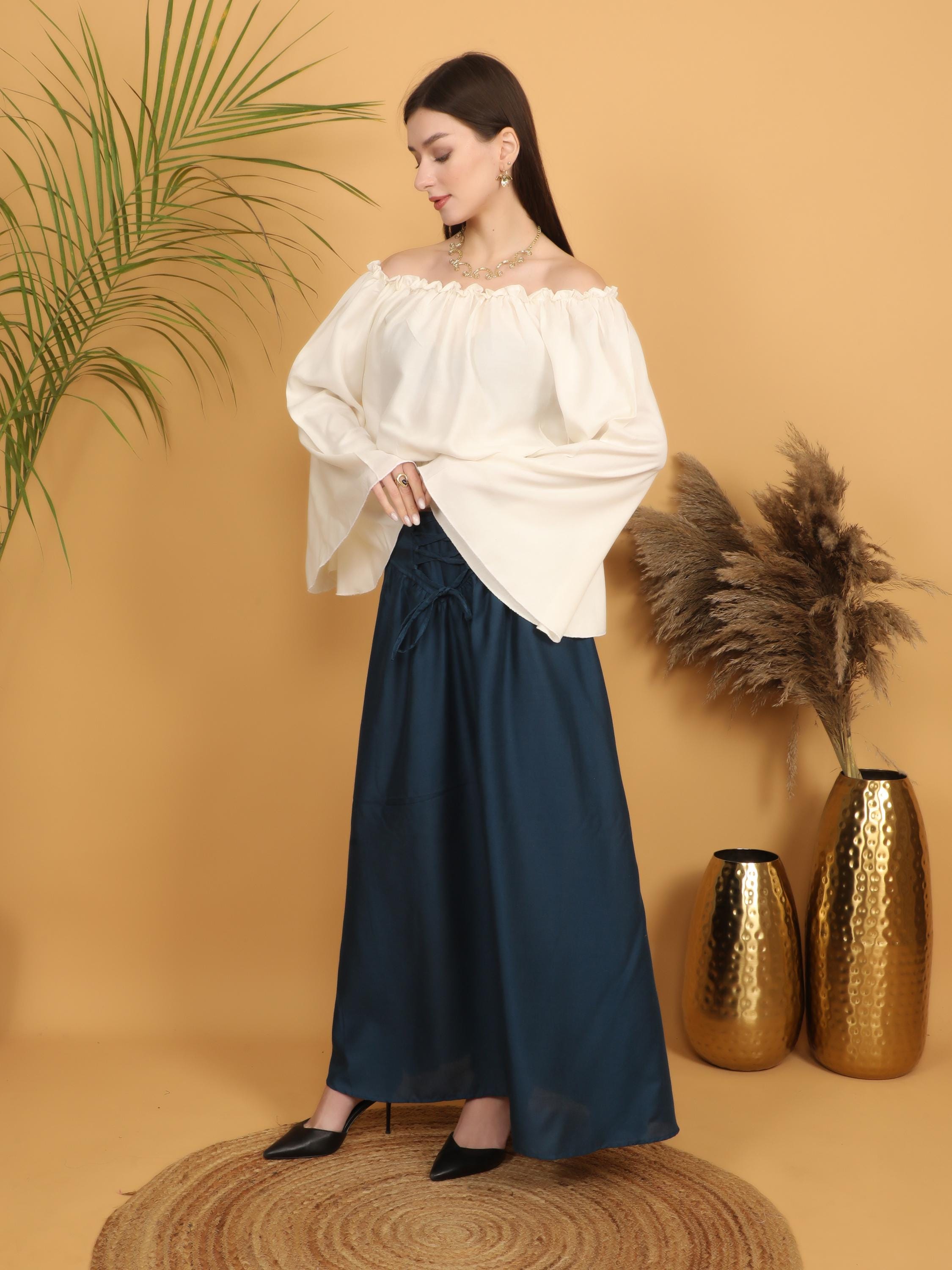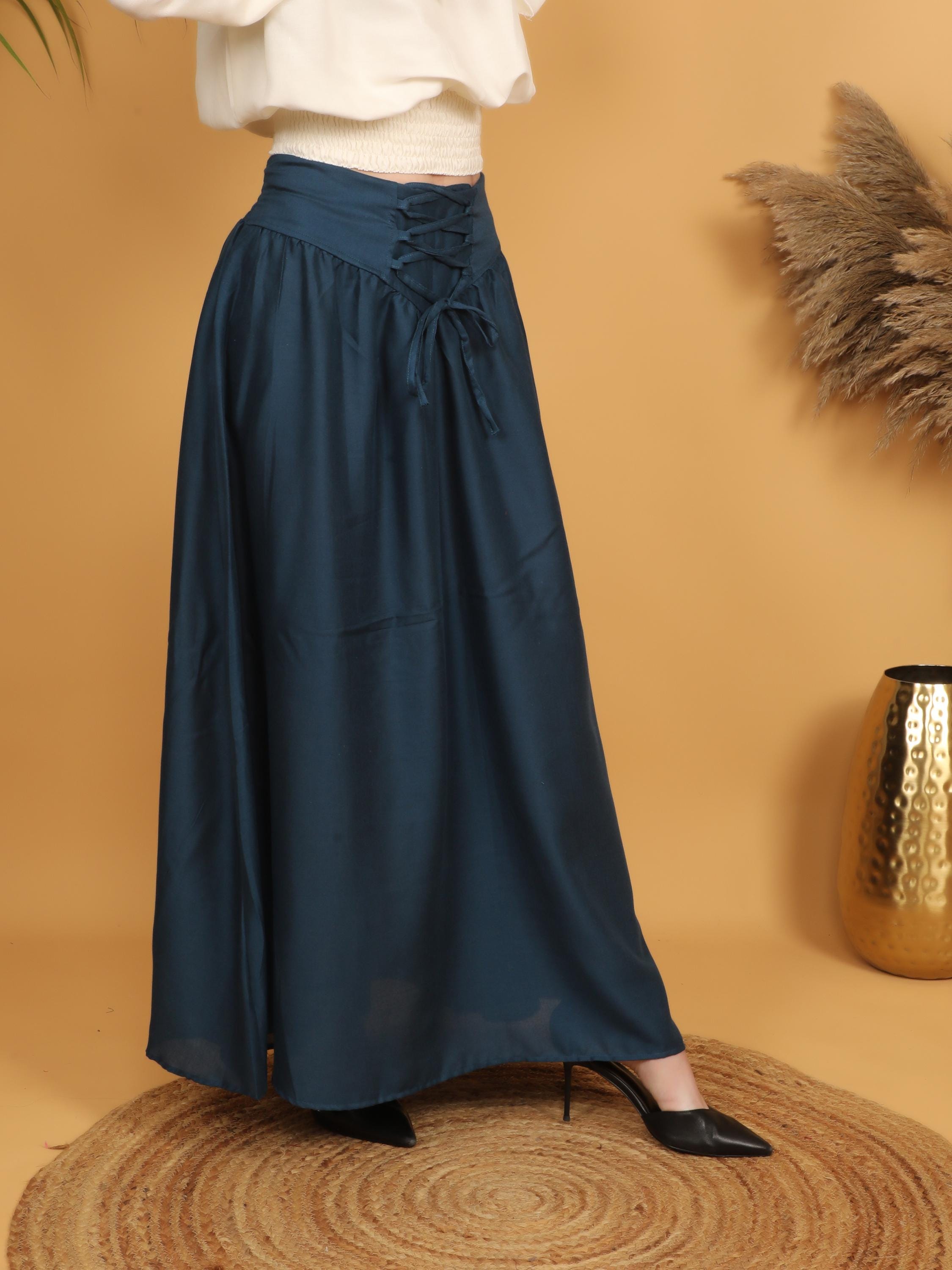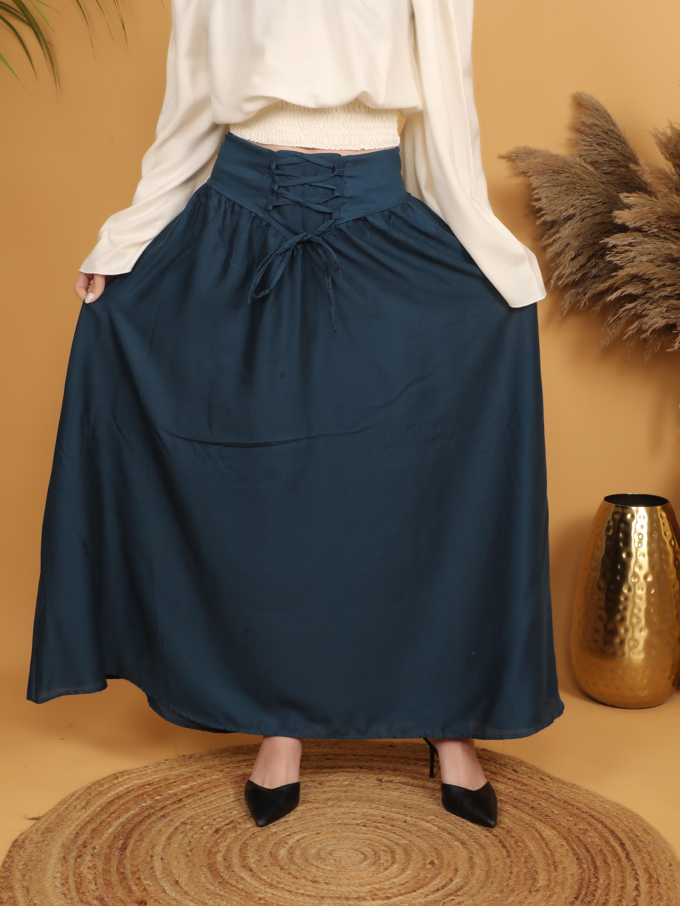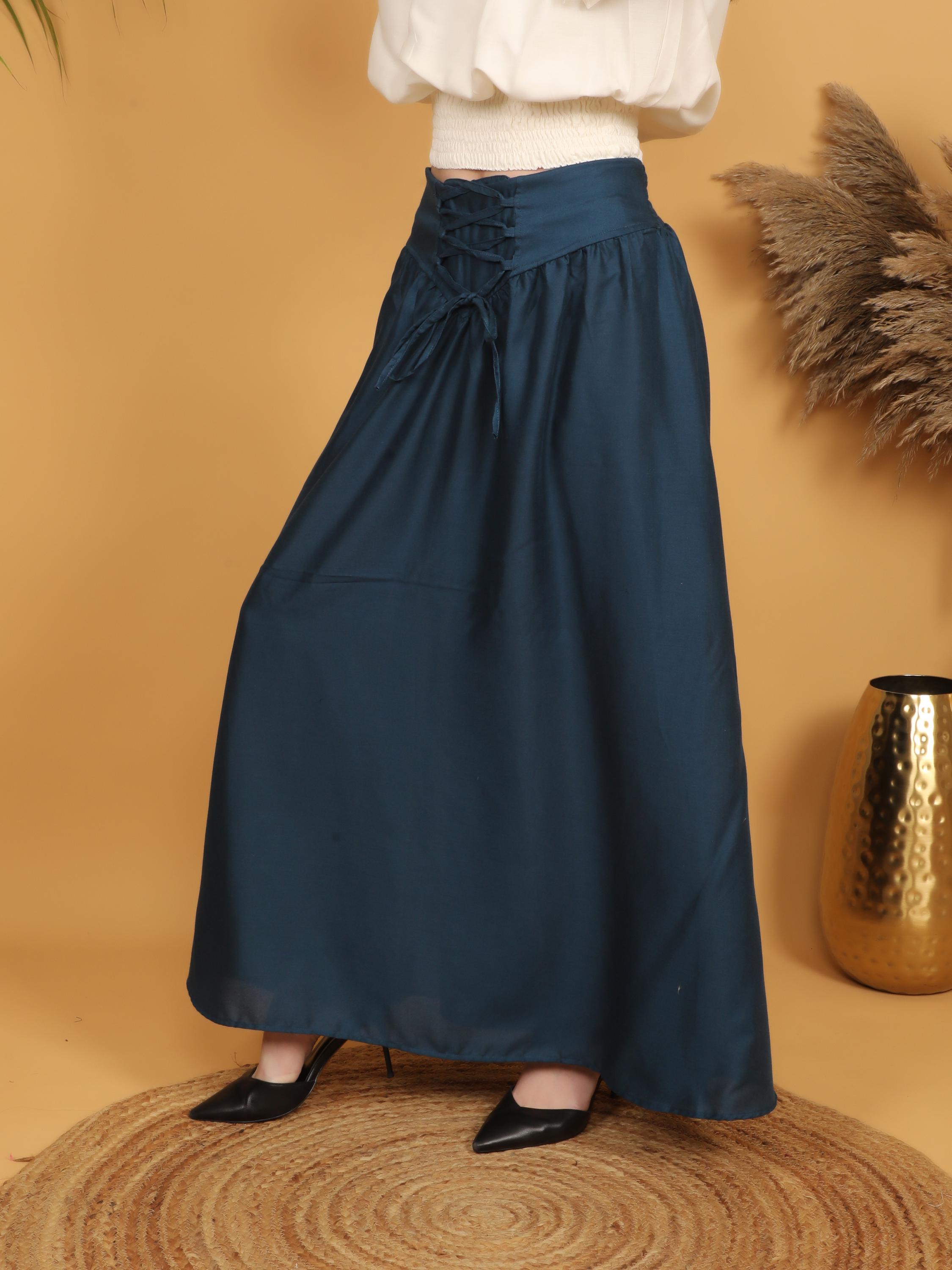 The high waist design features a corset-style lace-up front detail that brings strong medieval character to the piece. This adjustable lace-up closure not only enhances the silhouette but also adds that unmistakable renaissance aesthetic, echoing traditional bodice lacing. The structured waist flows into a full-length skirt with a soft A-line shape, creating beautiful movement with every step.