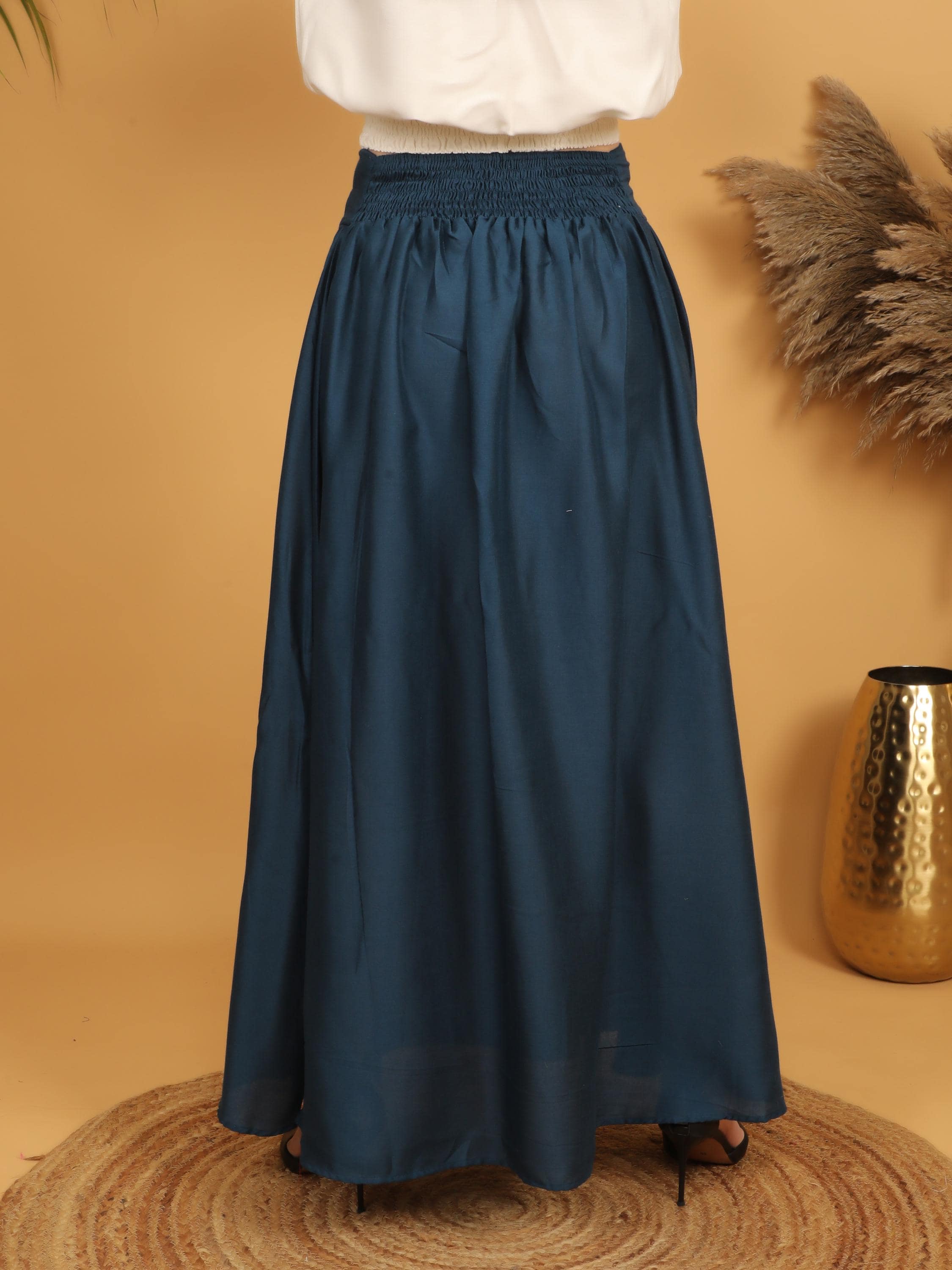 The deep teal tone adds richness and depth, evoking the earthy yet regal colors often seen in medieval and folk attire. It pairs perfectly with peasant blouses, corset tops, or fitted bodices to complete a renaissance-inspired outfit. Whether styled for a medieval festival, historical event, fantasy fair, or bohemian gathering, this skirt delivers both authenticity and modern comfort.