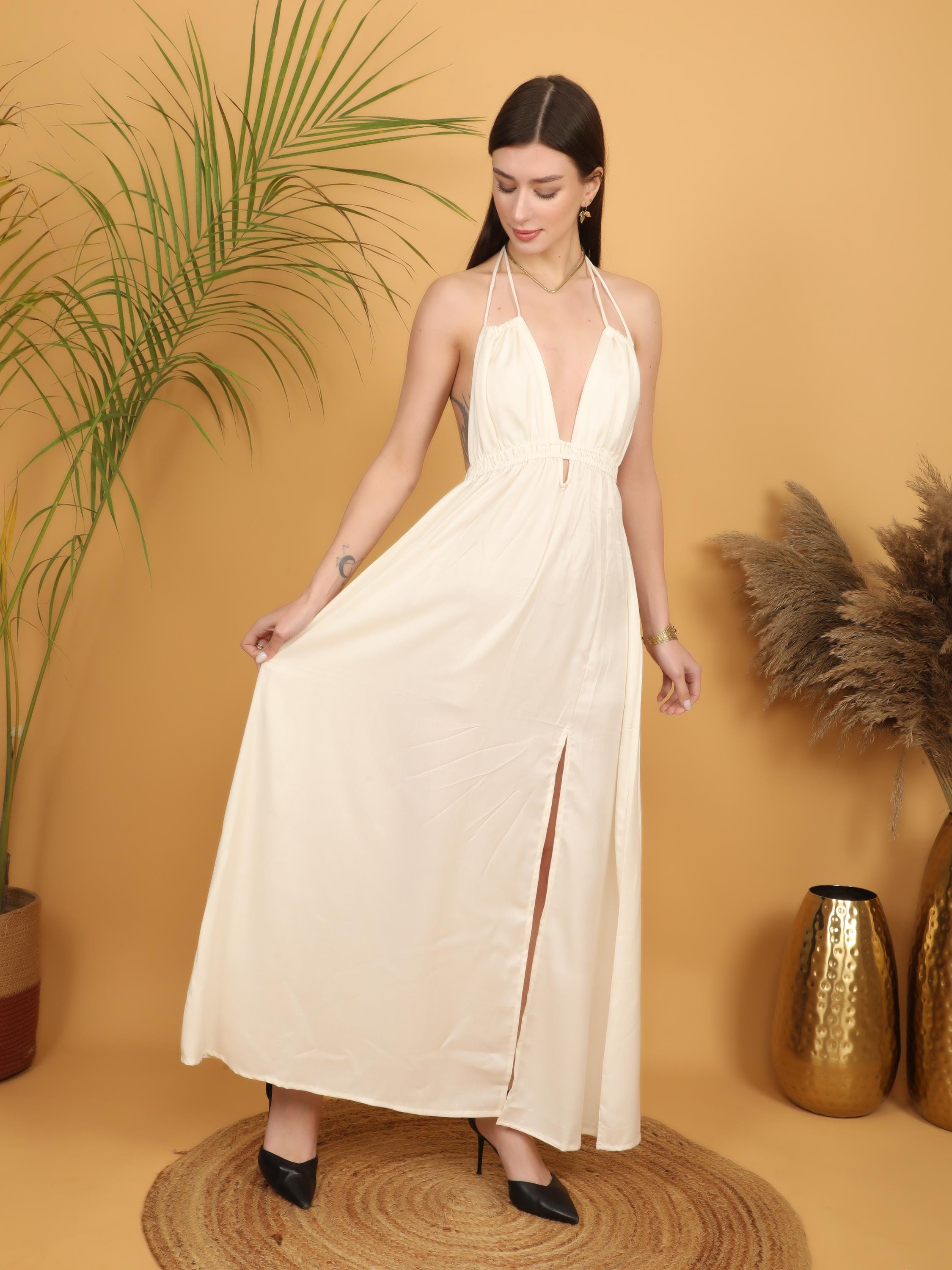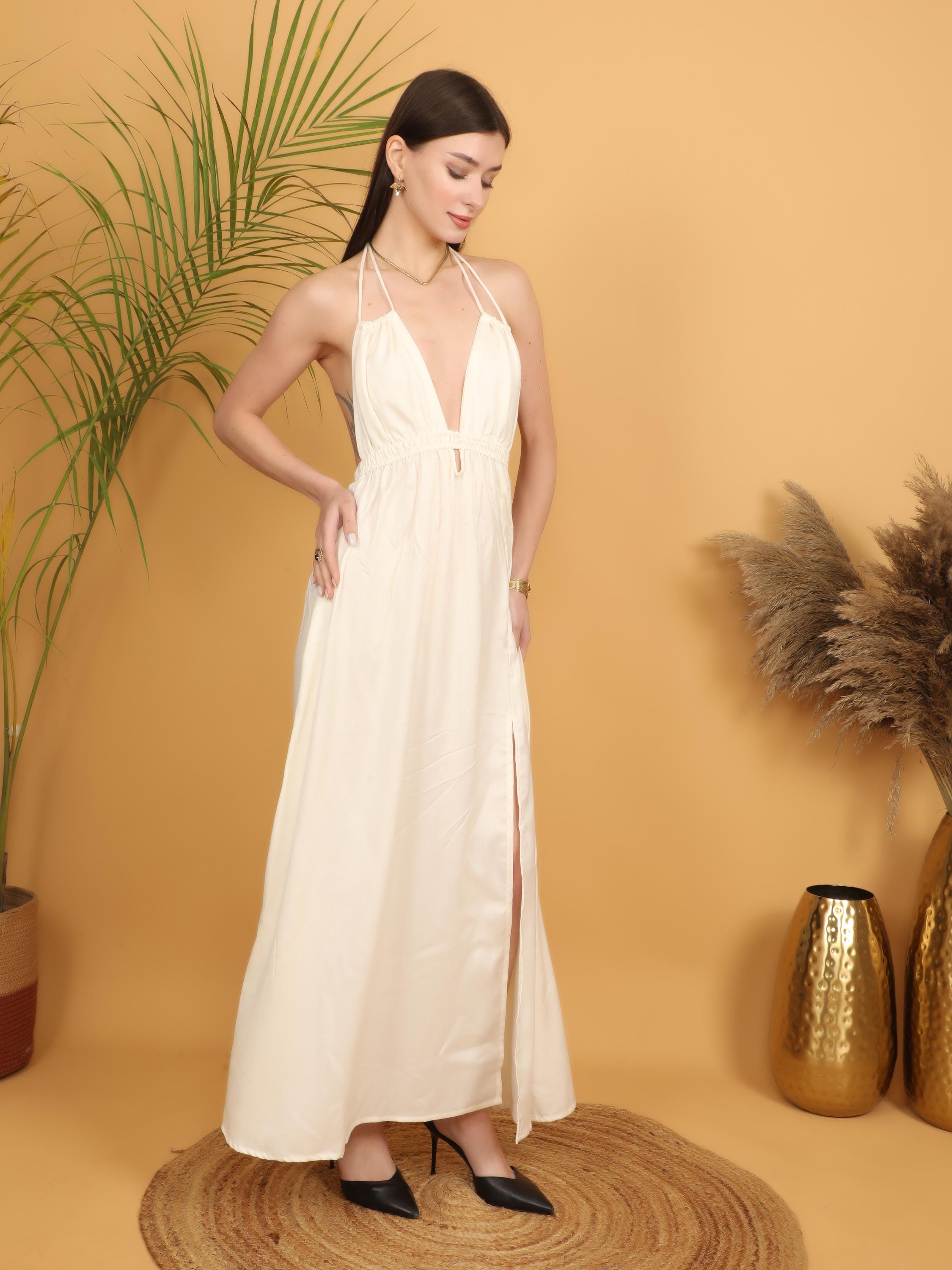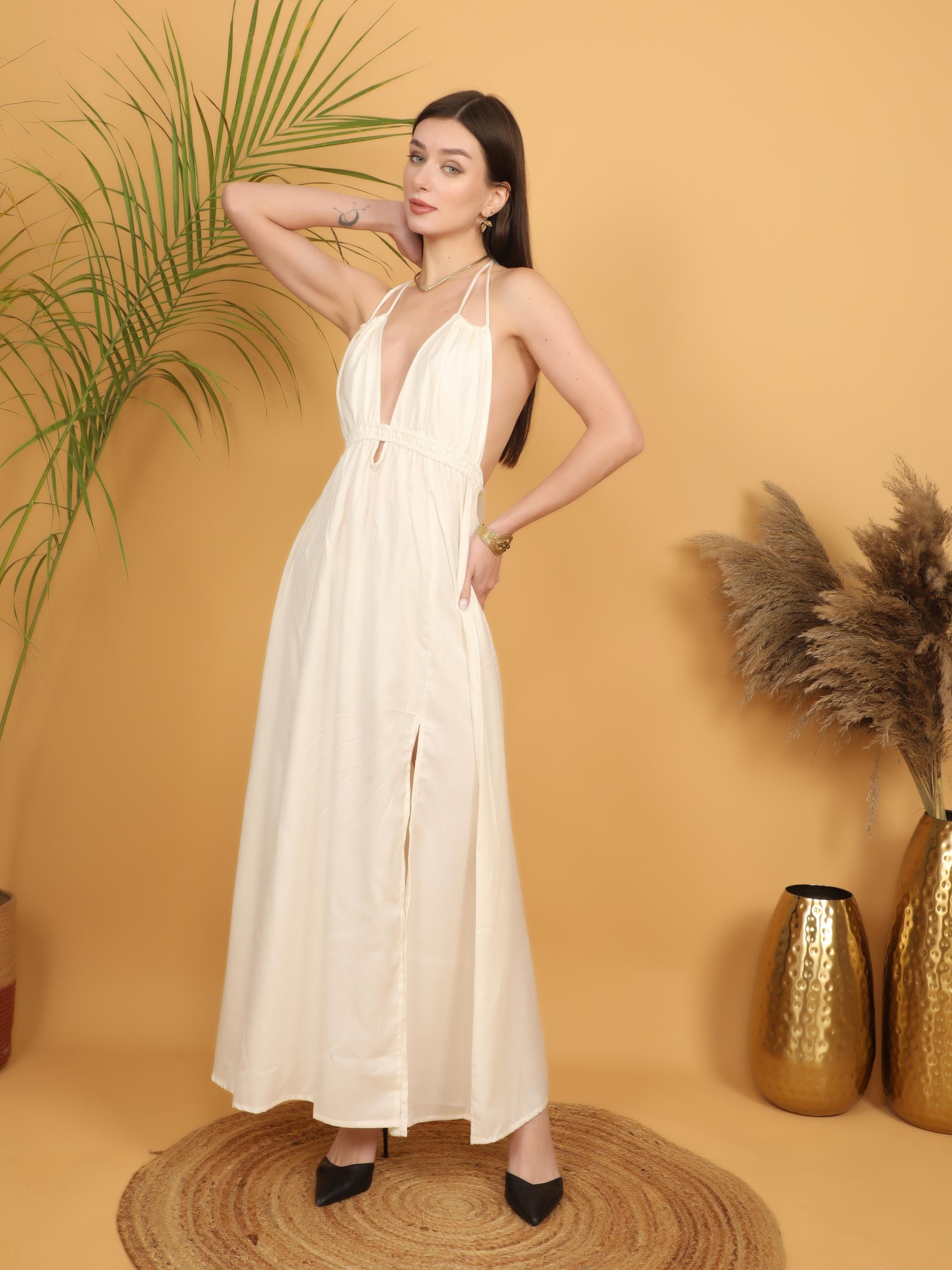 A subtle side slit enhances movement and adds a graceful, modern detail. The soft off white shade gives this dress a romantic, minimalist aesthetic — ideal for beach weddings, bridal events, summer soirées, or elegant vacations.