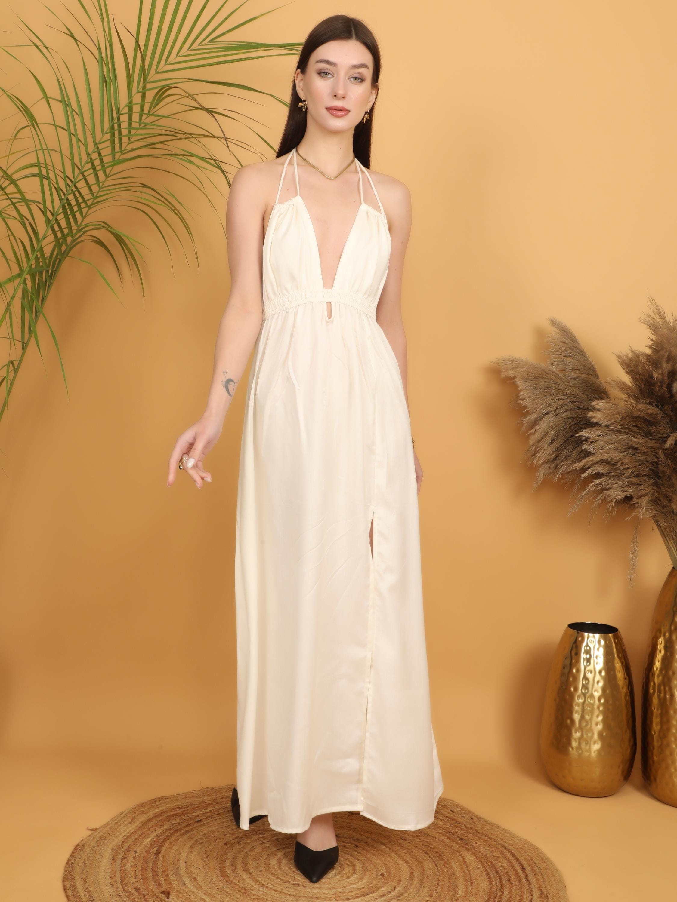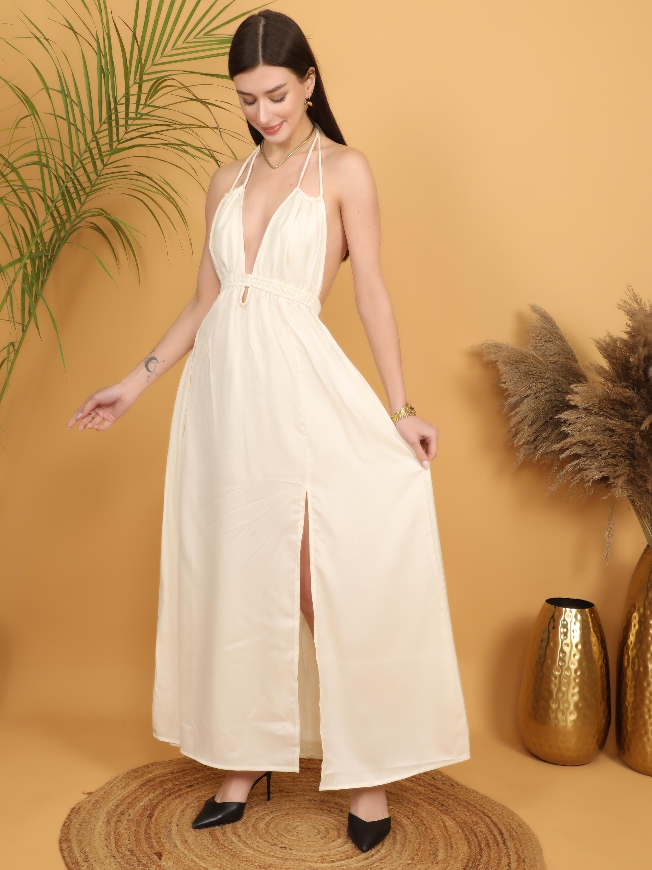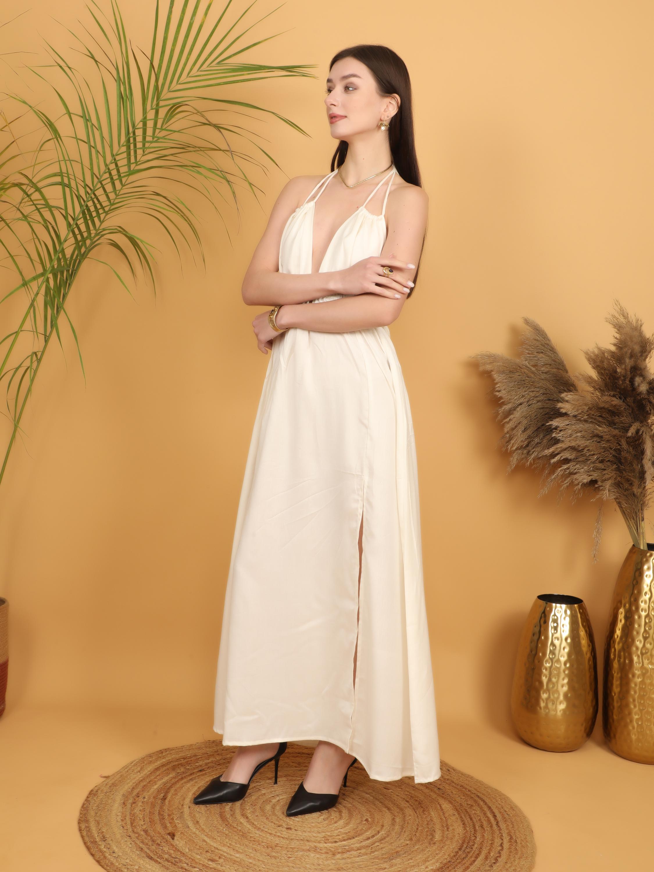 A subtle side slit enhances movement and adds a graceful, modern detail. The soft off white shade gives this dress a romantic, minimalist aesthetic — ideal for beach weddings, bridal events, summer soirées, or elegant vacations.