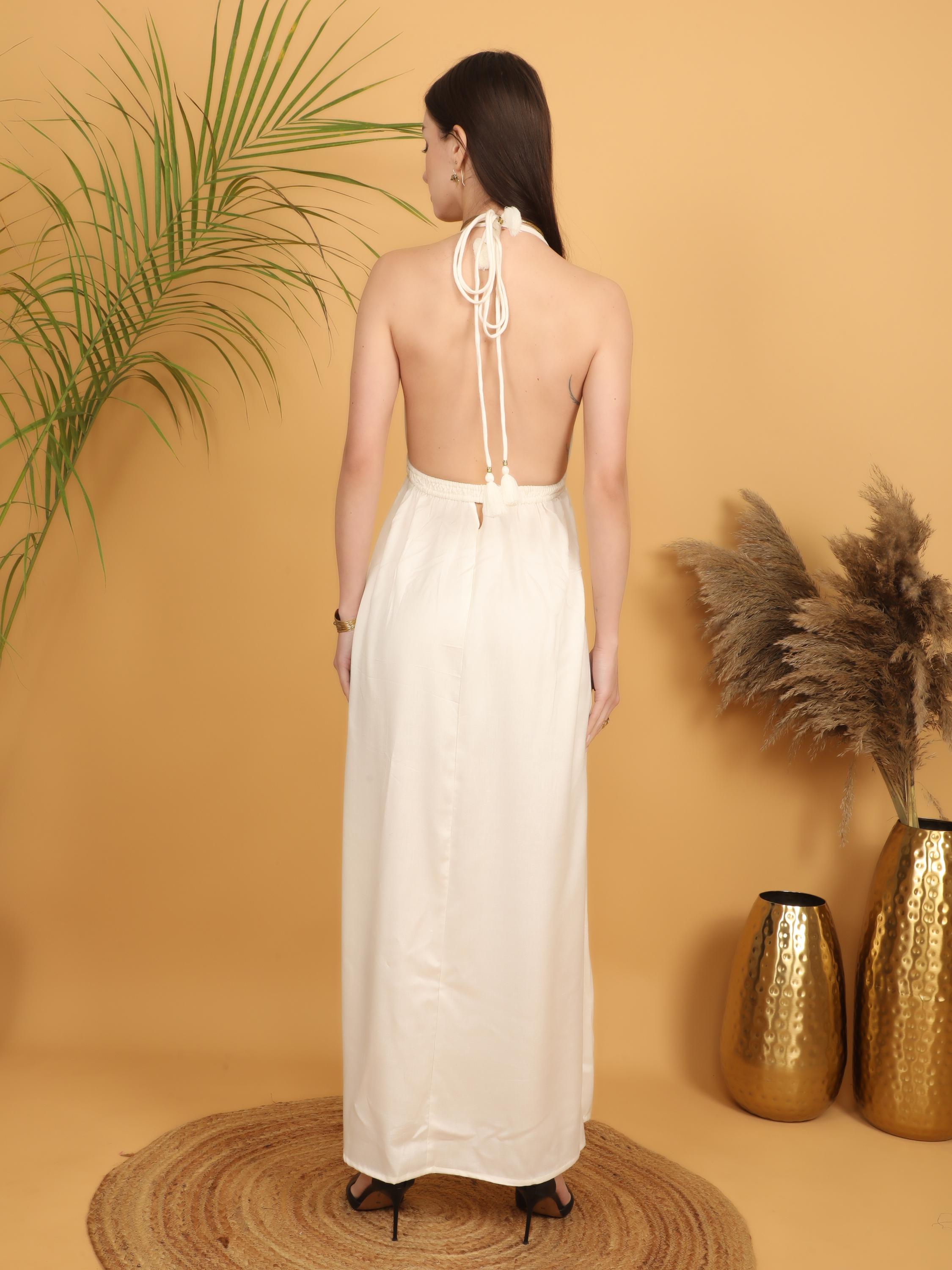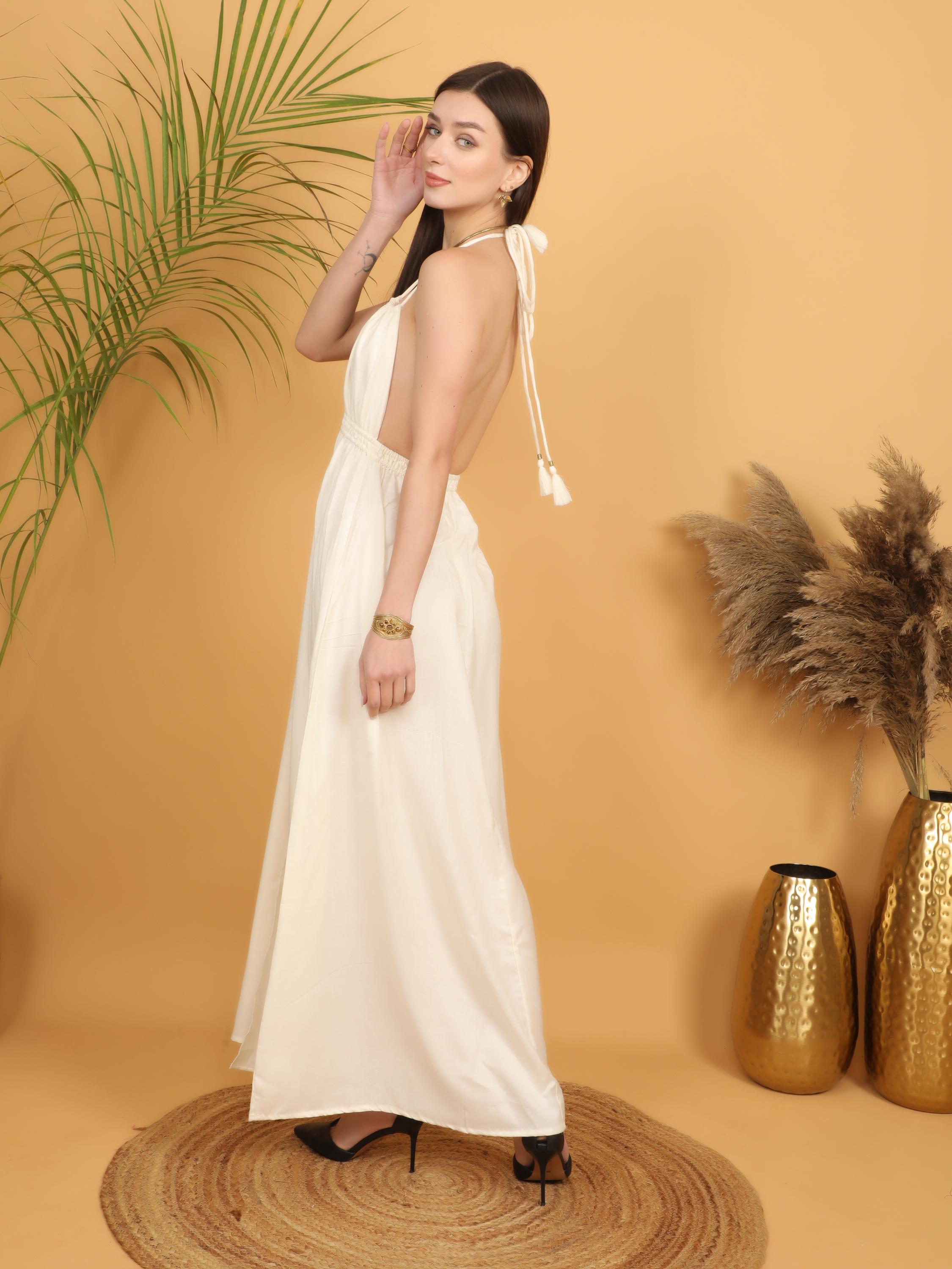 Effortlessly elegant and timeless, this off white backless maxi dress is designed to enhance your natural silhouette with soft, feminine movement. Made from lightweight and breathable 100% viscose, it drapes beautifully over the body, offering comfort and fluidity for warm-weather occasions.