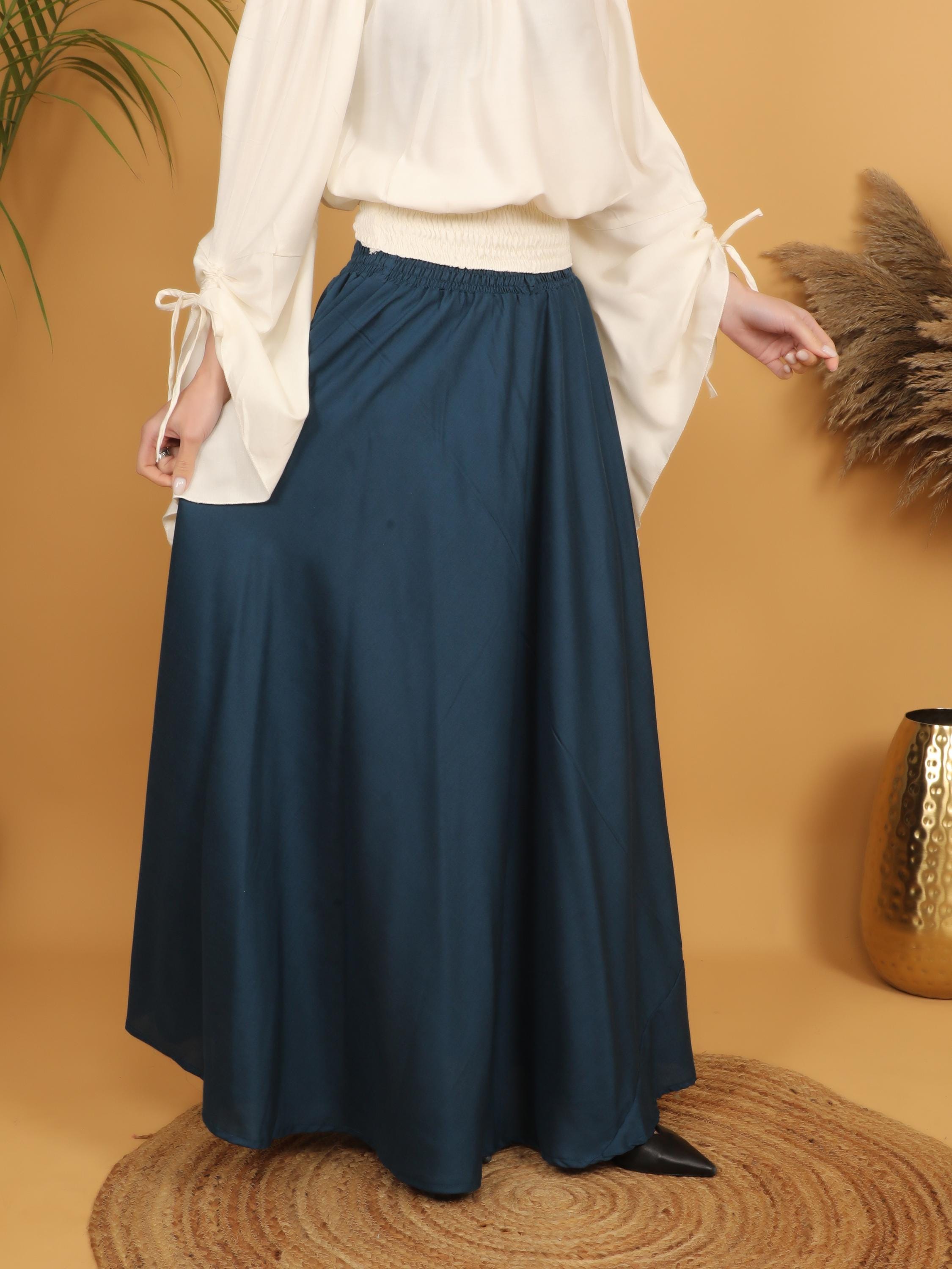 The skirt features a full-length maxi cut that creates a dramatic, sweeping silhouette. Its rich petrol color, a deep blue-green tone, adds depth and character, perfectly suited for medieval-inspired styling. The generous length enhances its romantic and historical feel, making it an ideal choice for medieval festivals, renaissance fairs, LARP events, fantasy gatherings, or themed celebrations.