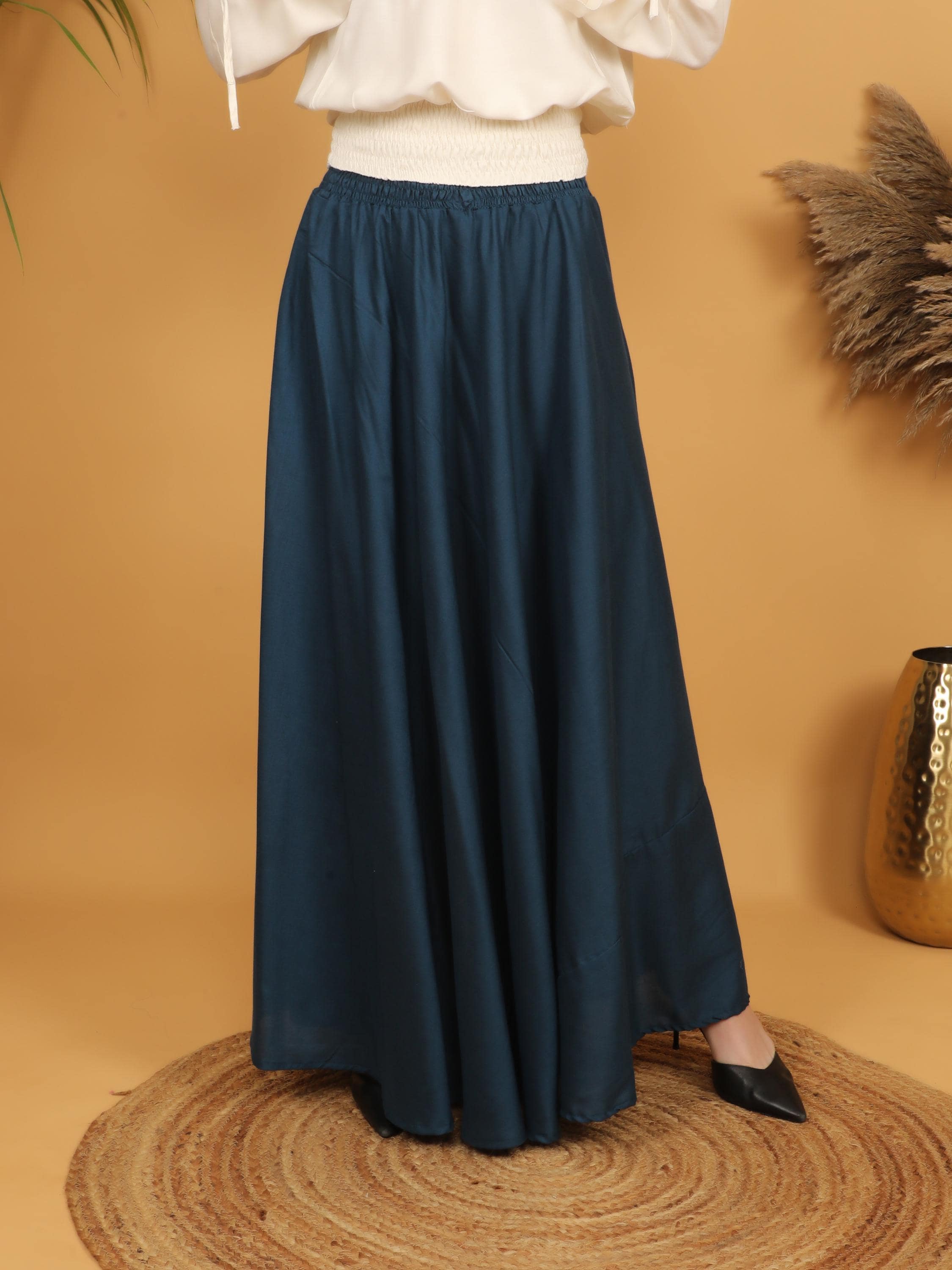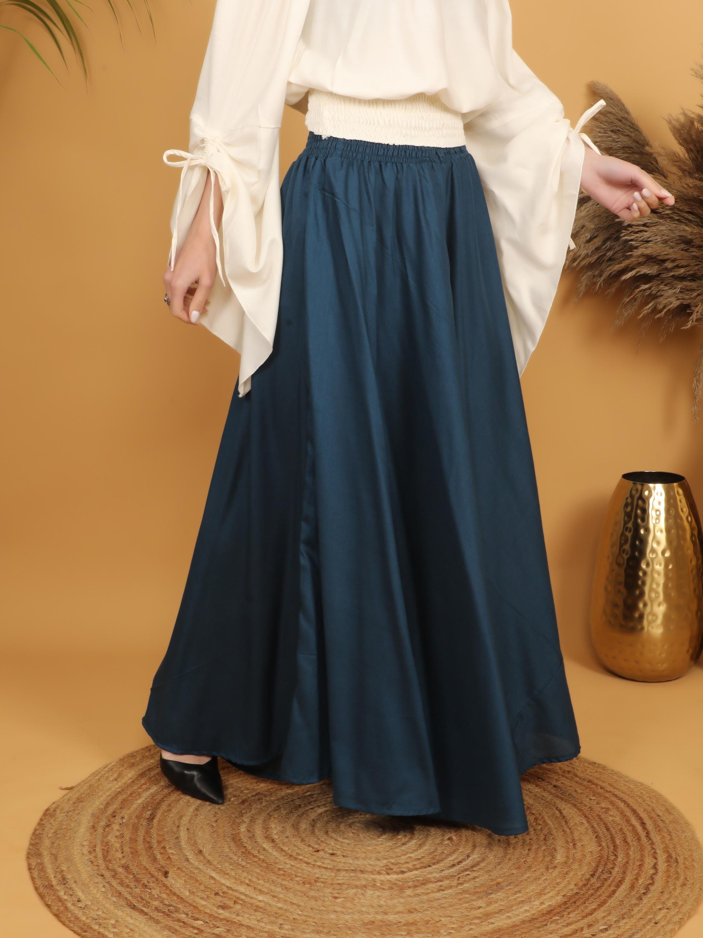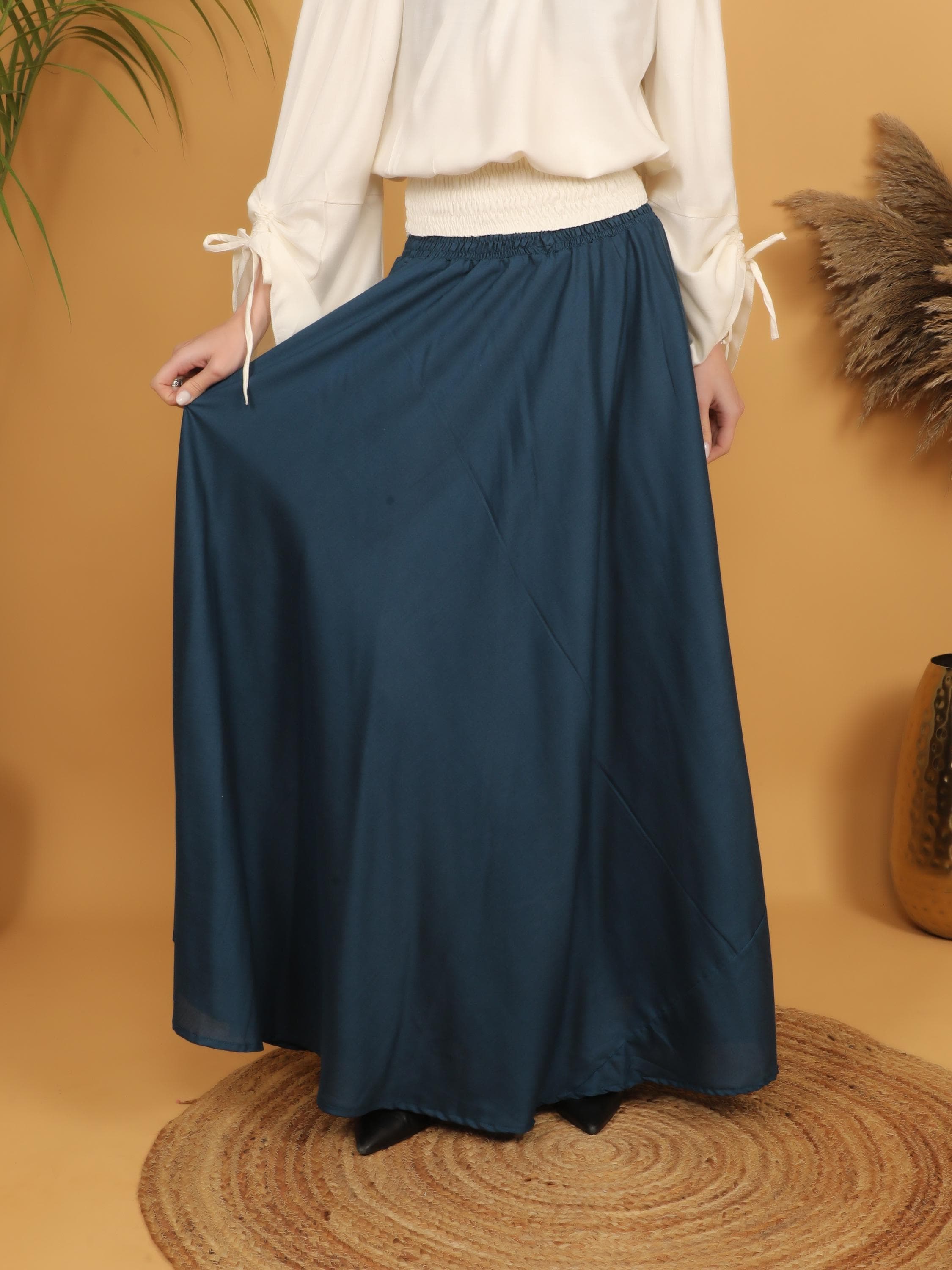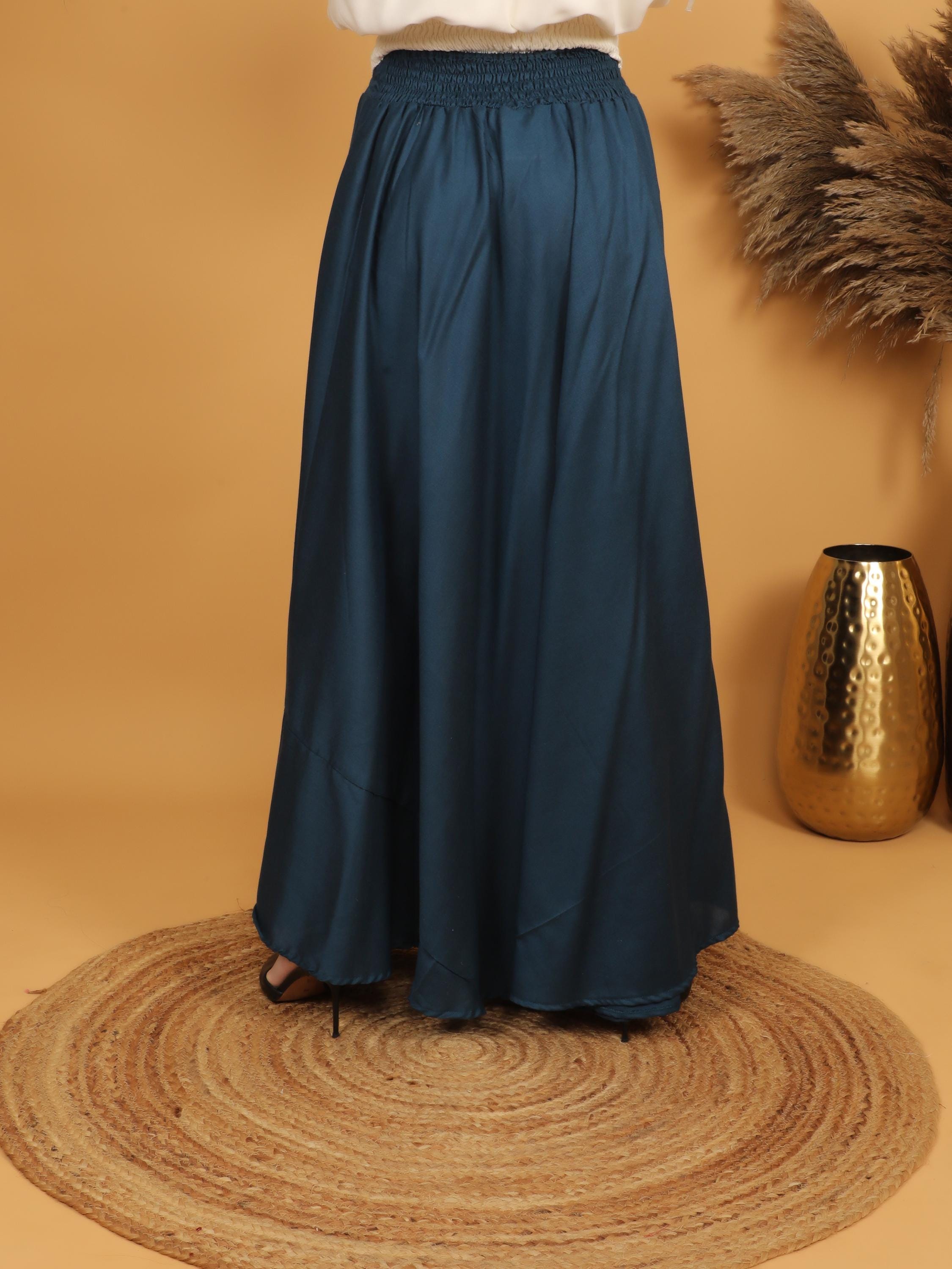 Step into a world of timeless elegance with this flowing petrol maxi skirt, designed with a fully smocked waistband all around for ultimate comfort and flexibility. The elastic smocking gently hugs the waist while adapting to different body shapes, making it a flattering and practical free size piece. Easy to slip on and comfortable to wear for long hours, it combines effortless fit with graceful movement.