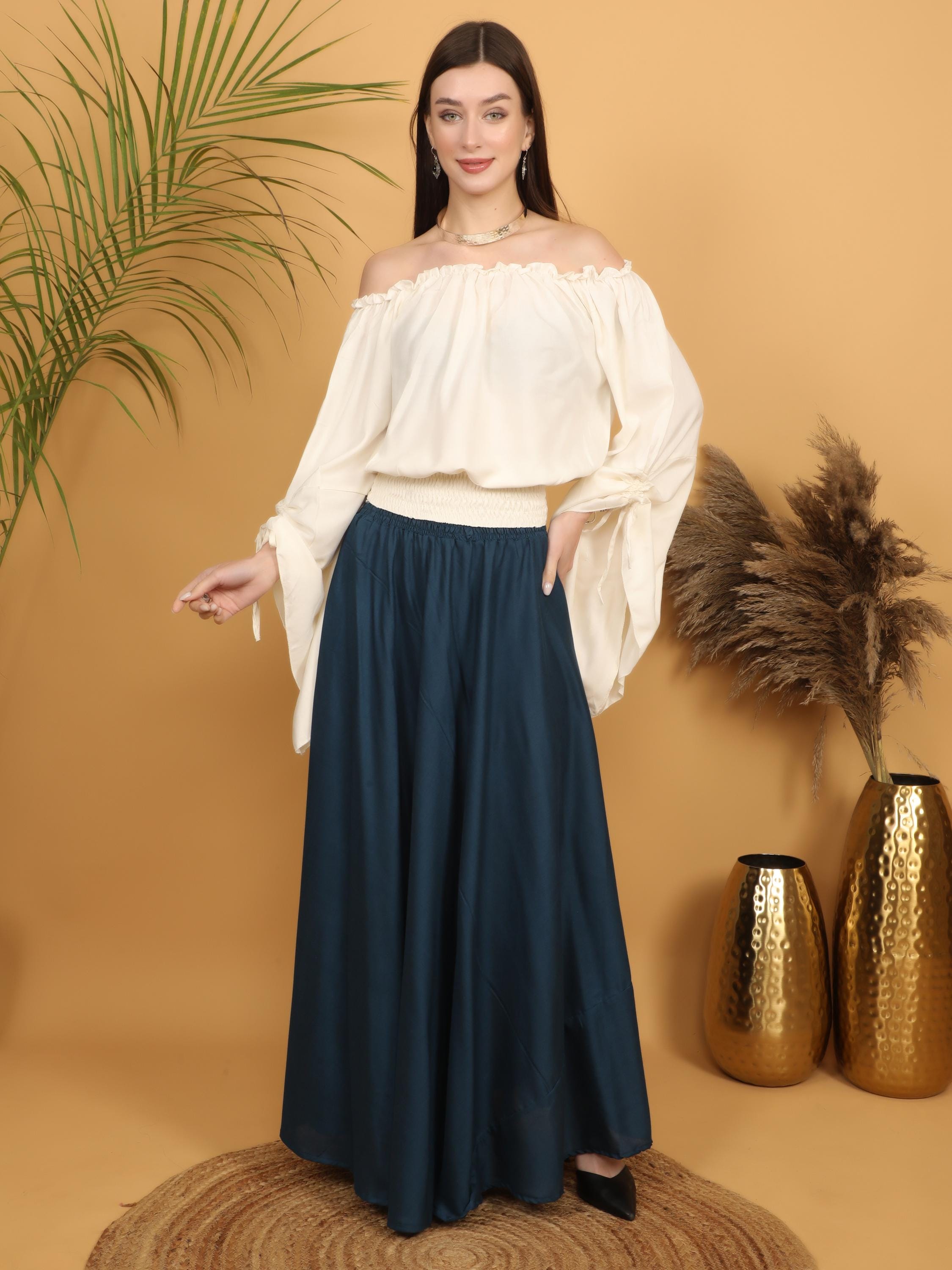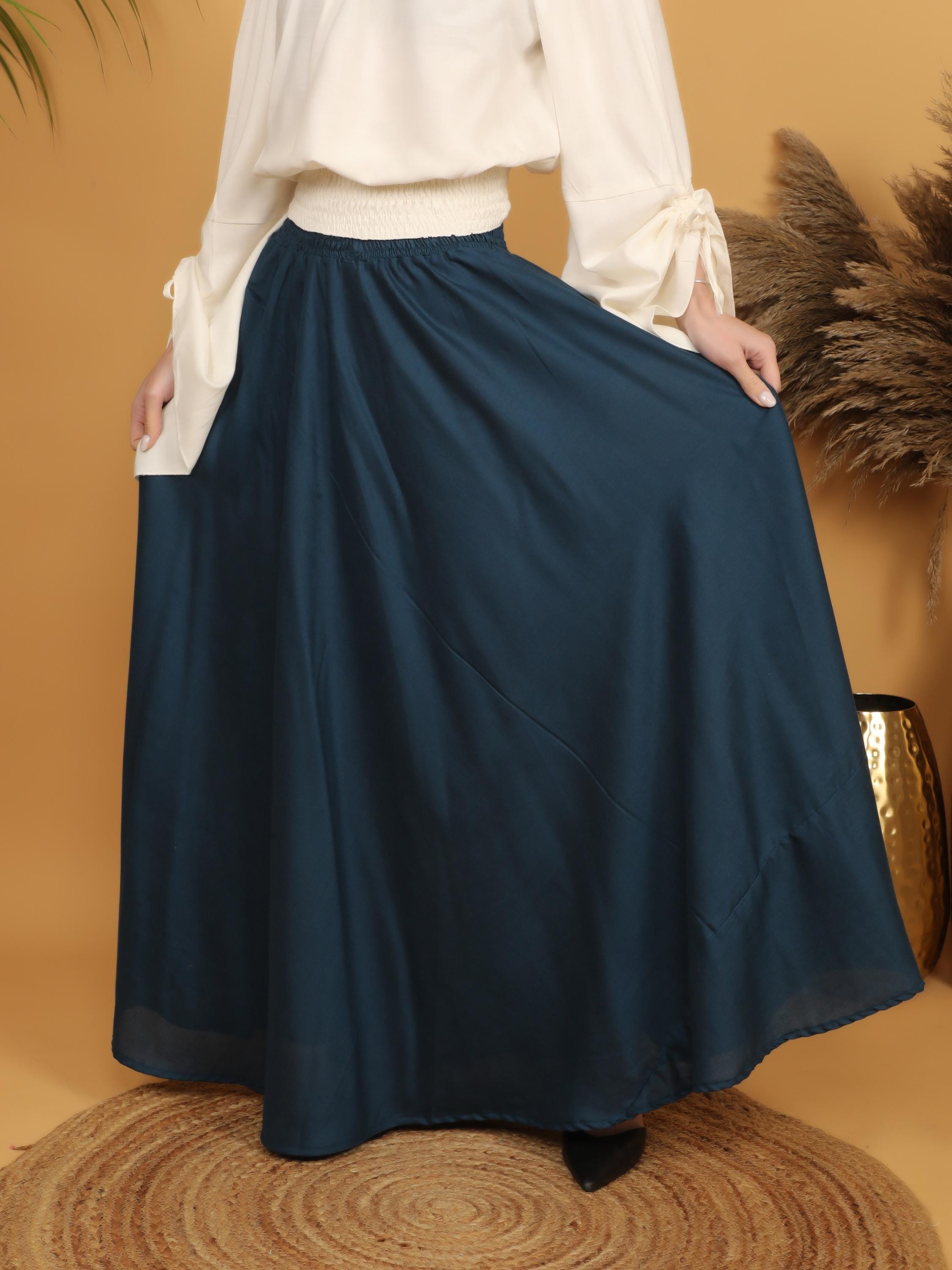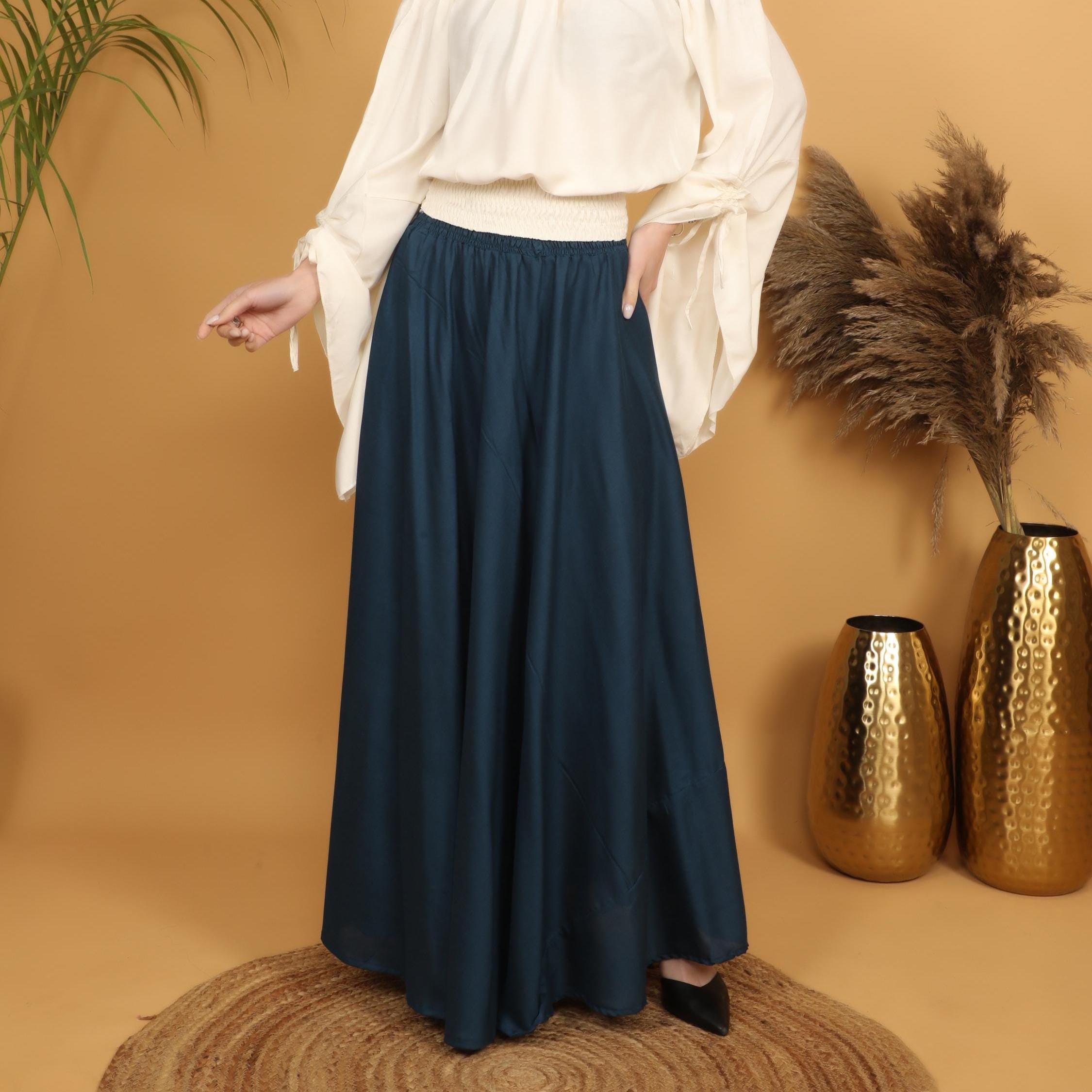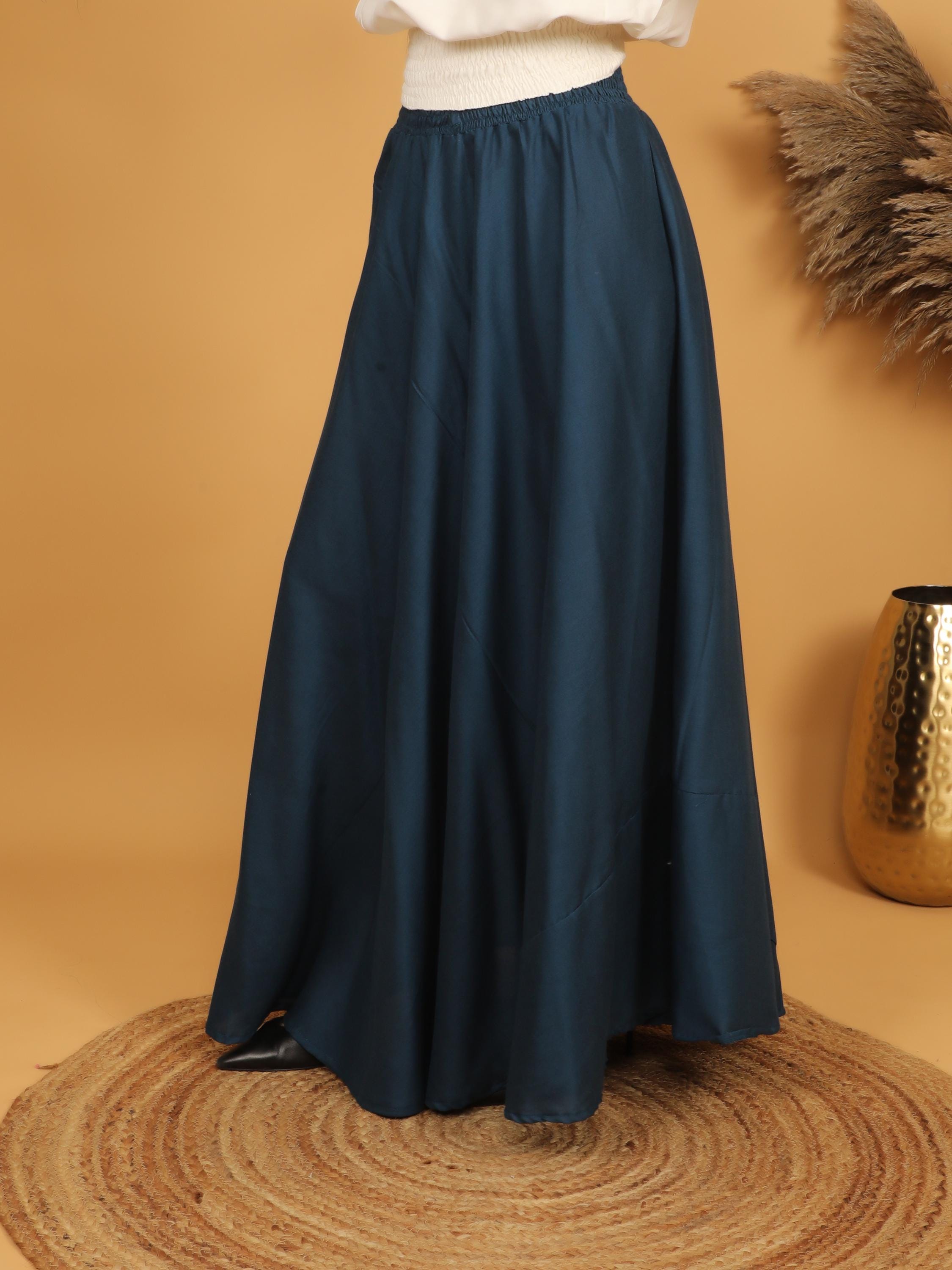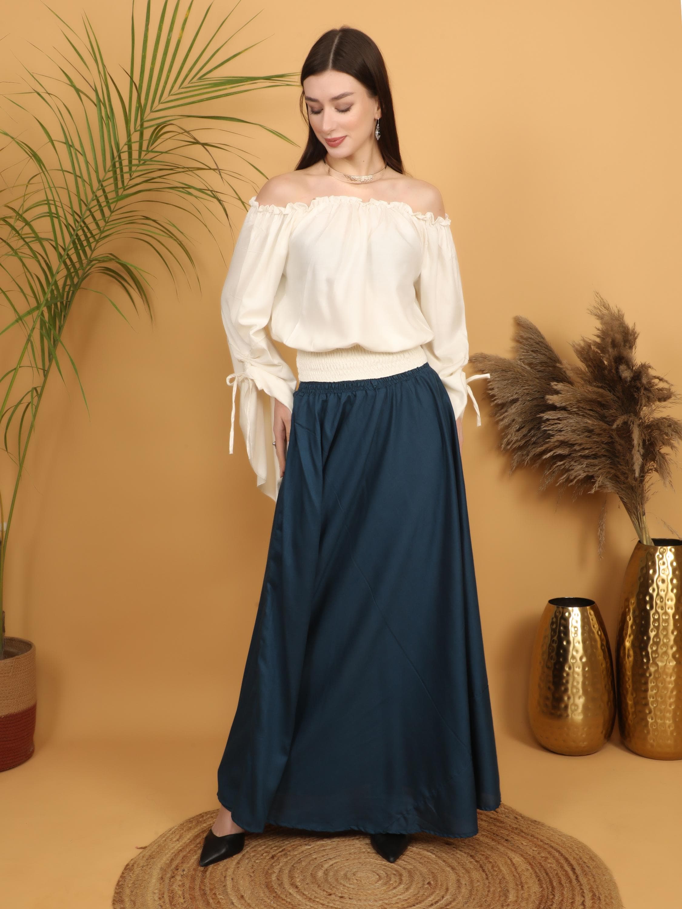 Step into a world of timeless elegance with this flowing petrol maxi skirt, designed with a fully smocked waistband all around for ultimate comfort and flexibility. The elastic smocking gently hugs the waist while adapting to different body shapes, making it a flattering and practical free size piece. Easy to slip on and comfortable to wear for long hours, it combines effortless fit with graceful movement.