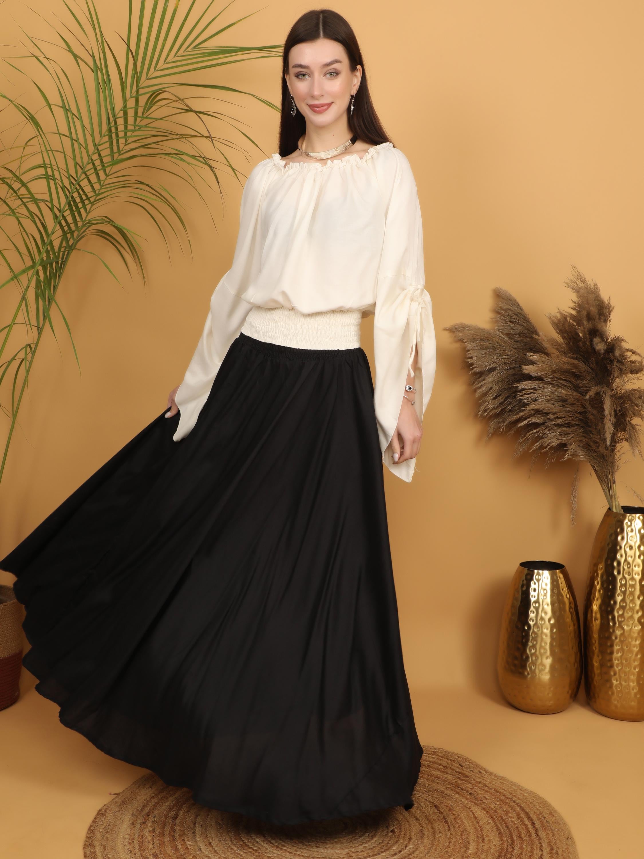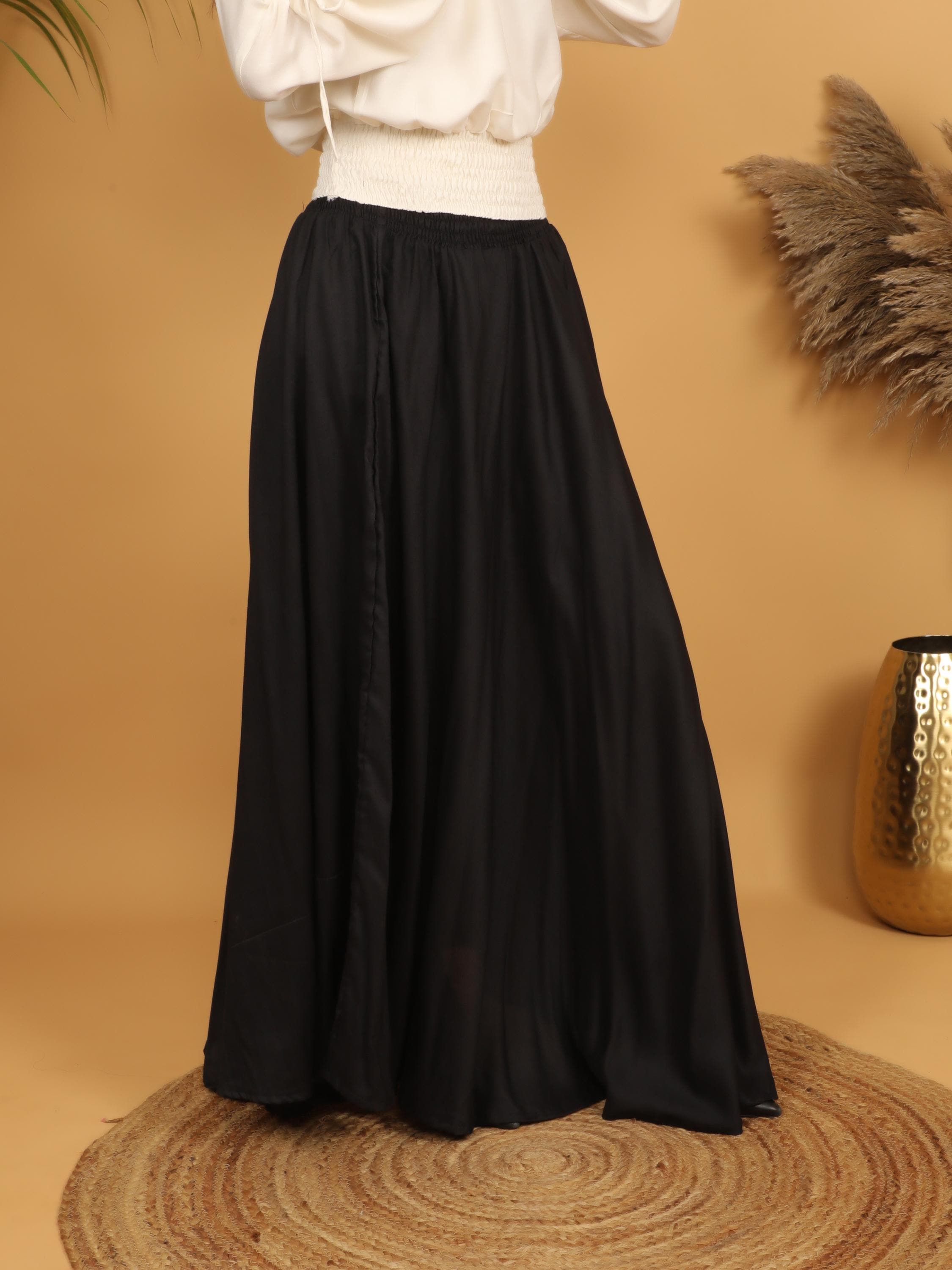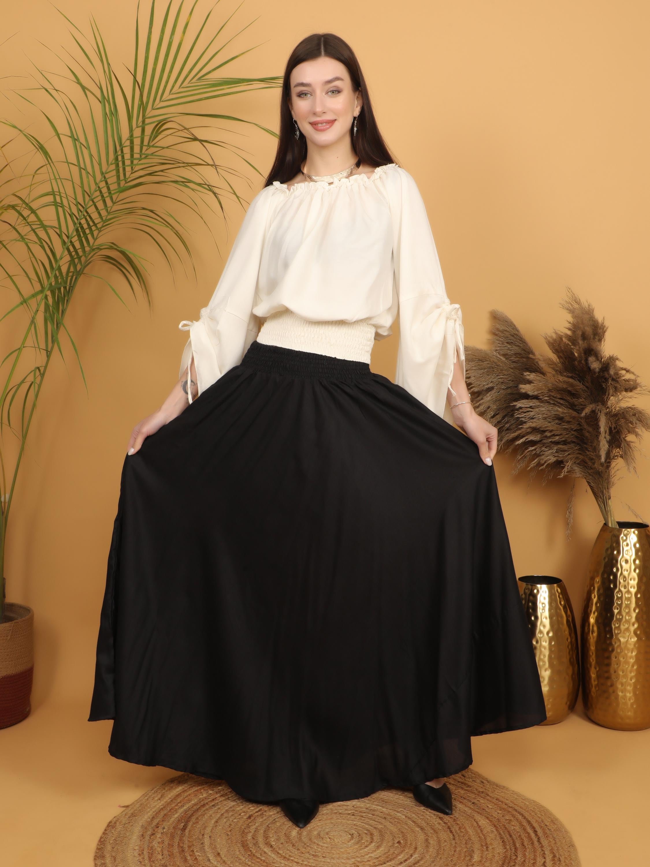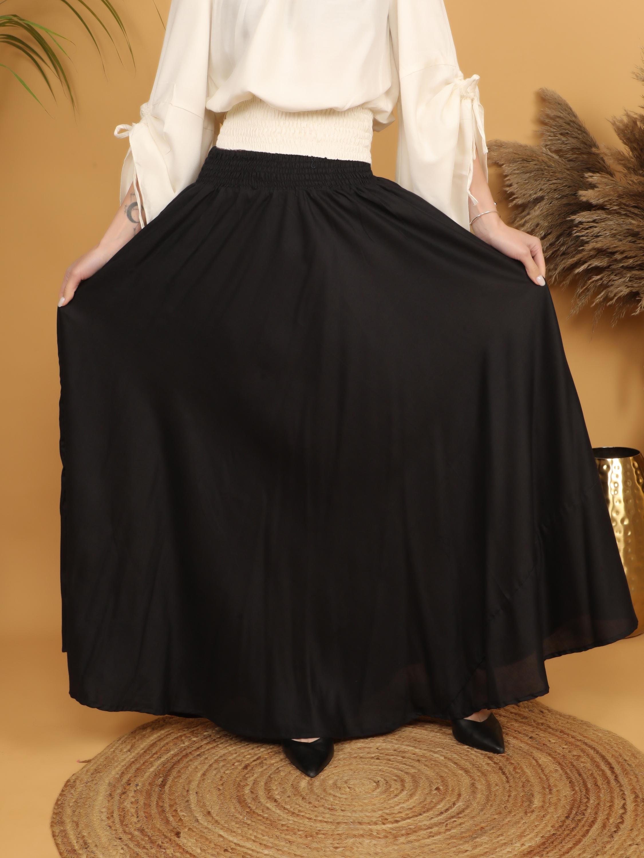 Embrace timeless elegance with this flowing black maxi skirt, designed with a fully smocked waistband all around for comfort and flexibility. The elastic smocking allows the skirt to adapt beautifully to different body shapes, making it a comfortable and flattering free size piece. Easy to wear and effortless to style, it offers both structure and movement while highlighting the waist naturally.