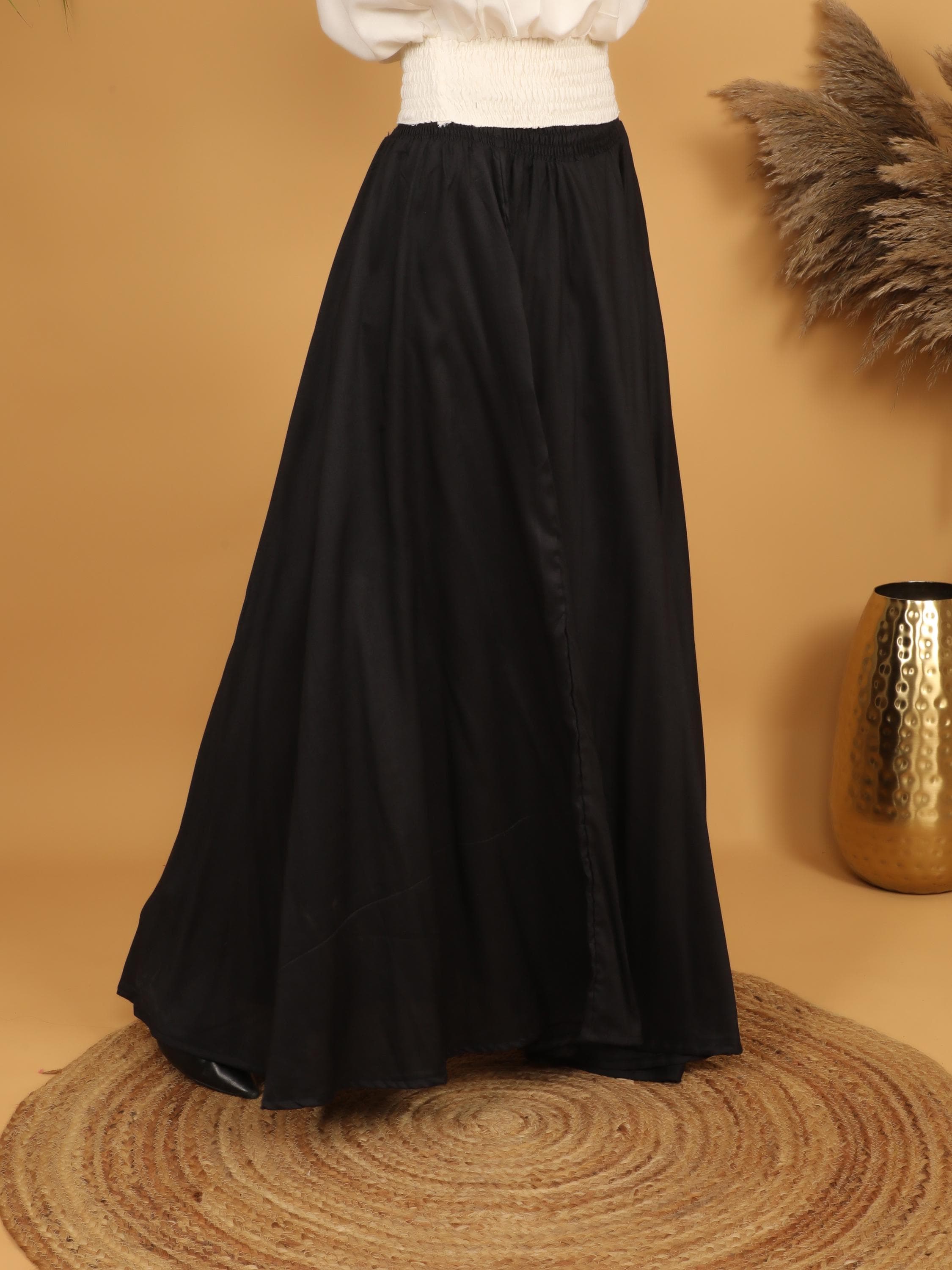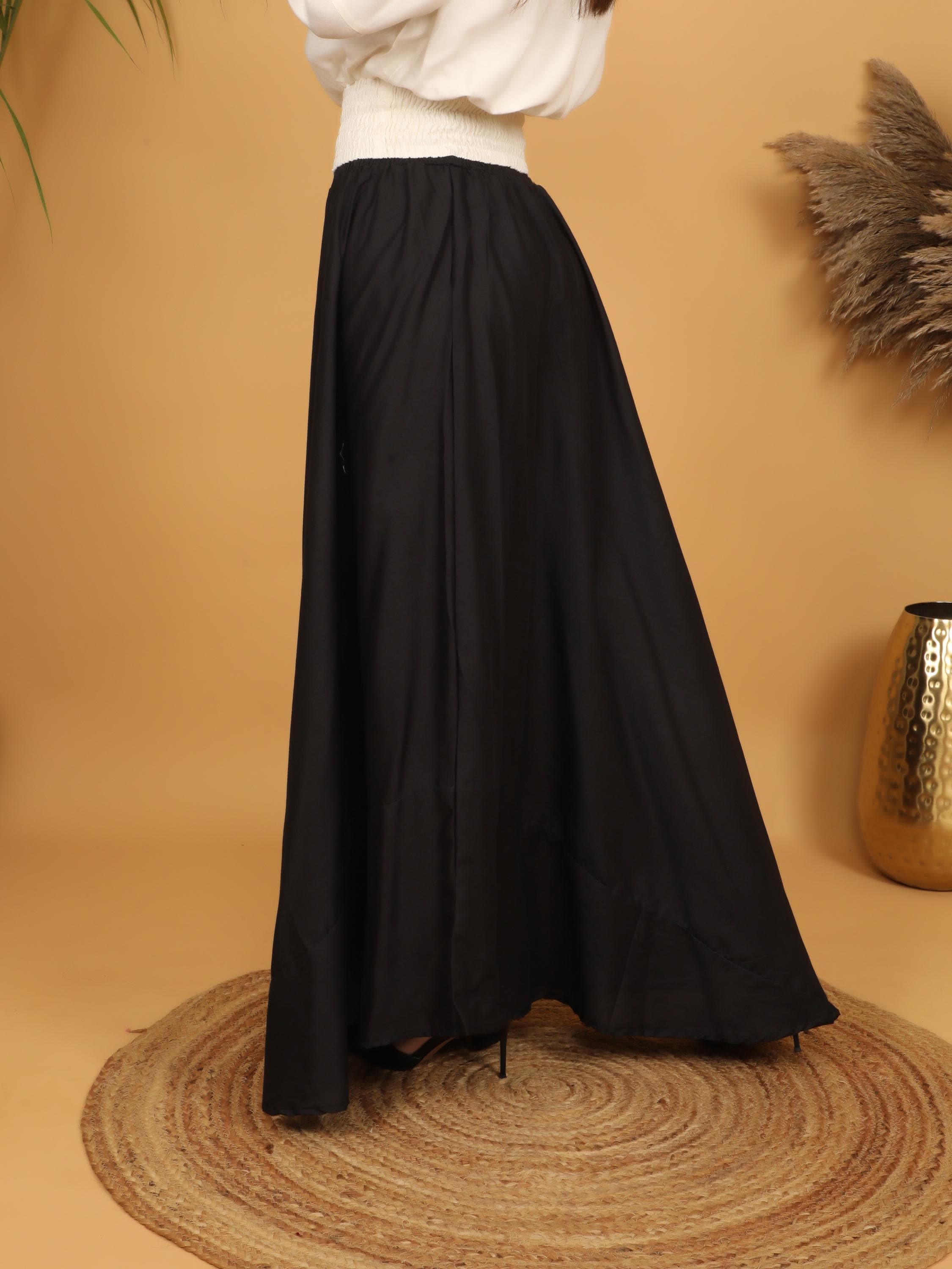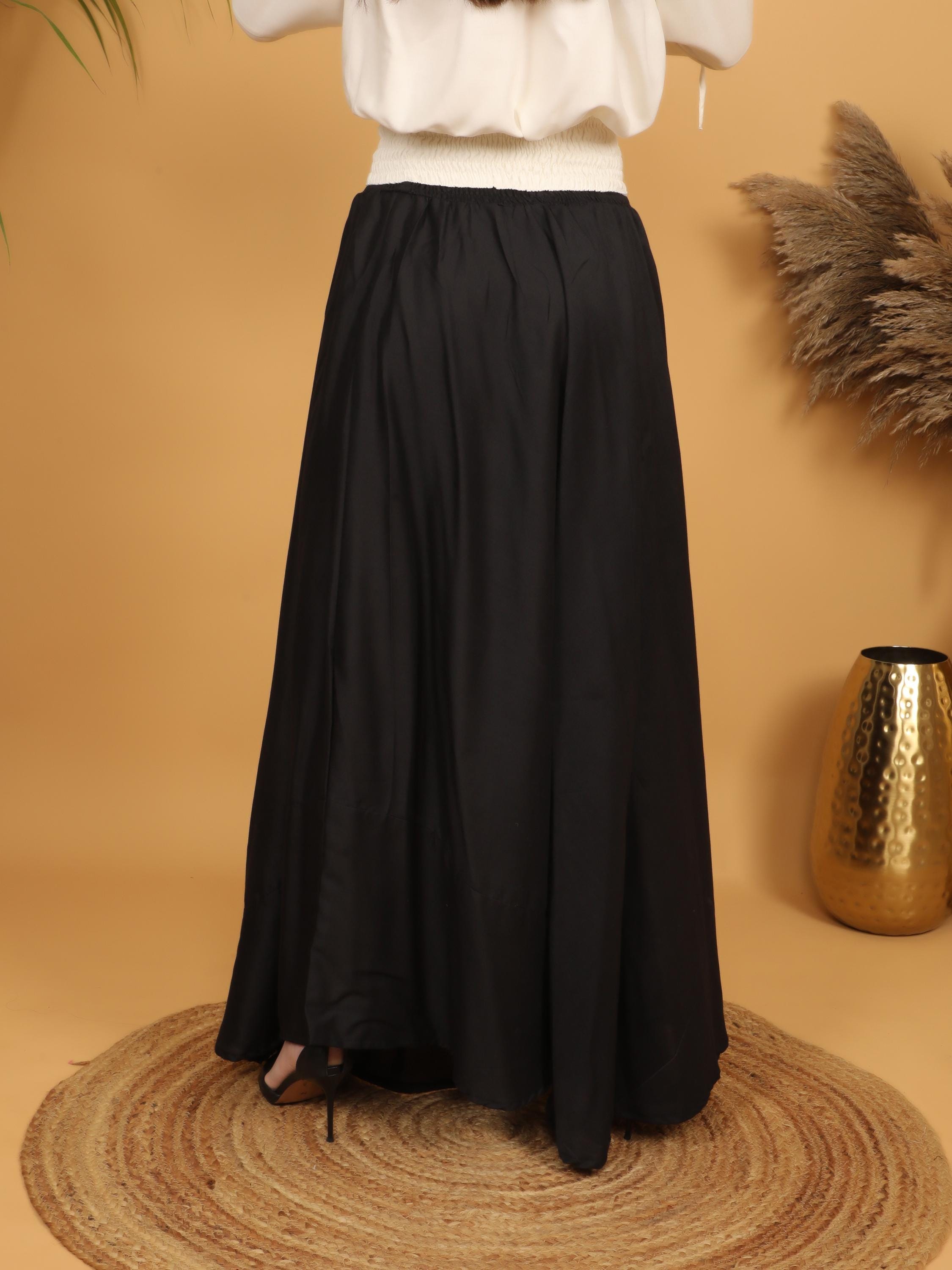 Embrace timeless elegance with this flowing black maxi skirt, designed with a fully smocked waistband all around for comfort and flexibility. The elastic smocking allows the skirt to adapt beautifully to different body shapes, making it a comfortable and flattering free size piece. Easy to wear and effortless to style, it offers both structure and movement while highlighting the waist naturally.
