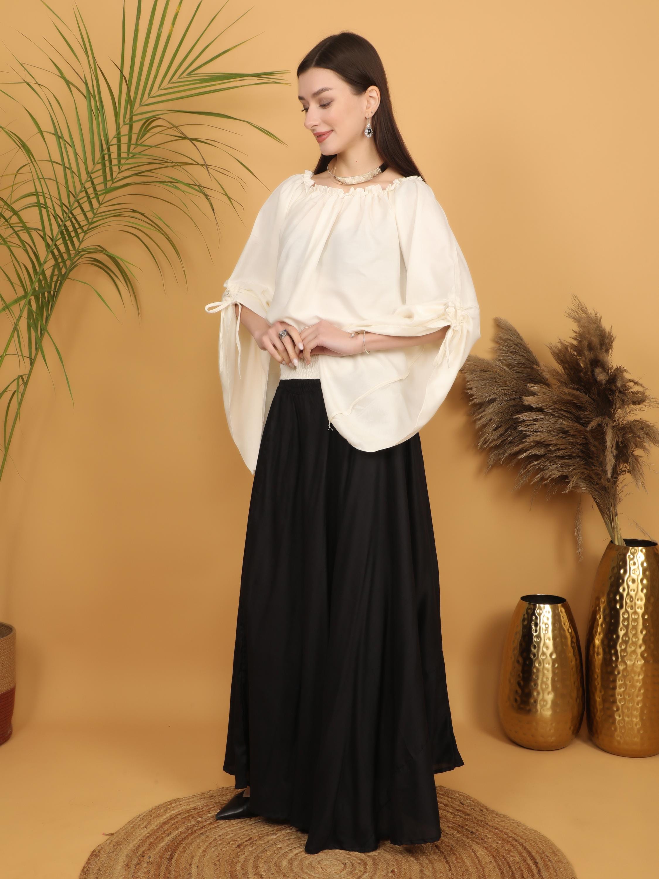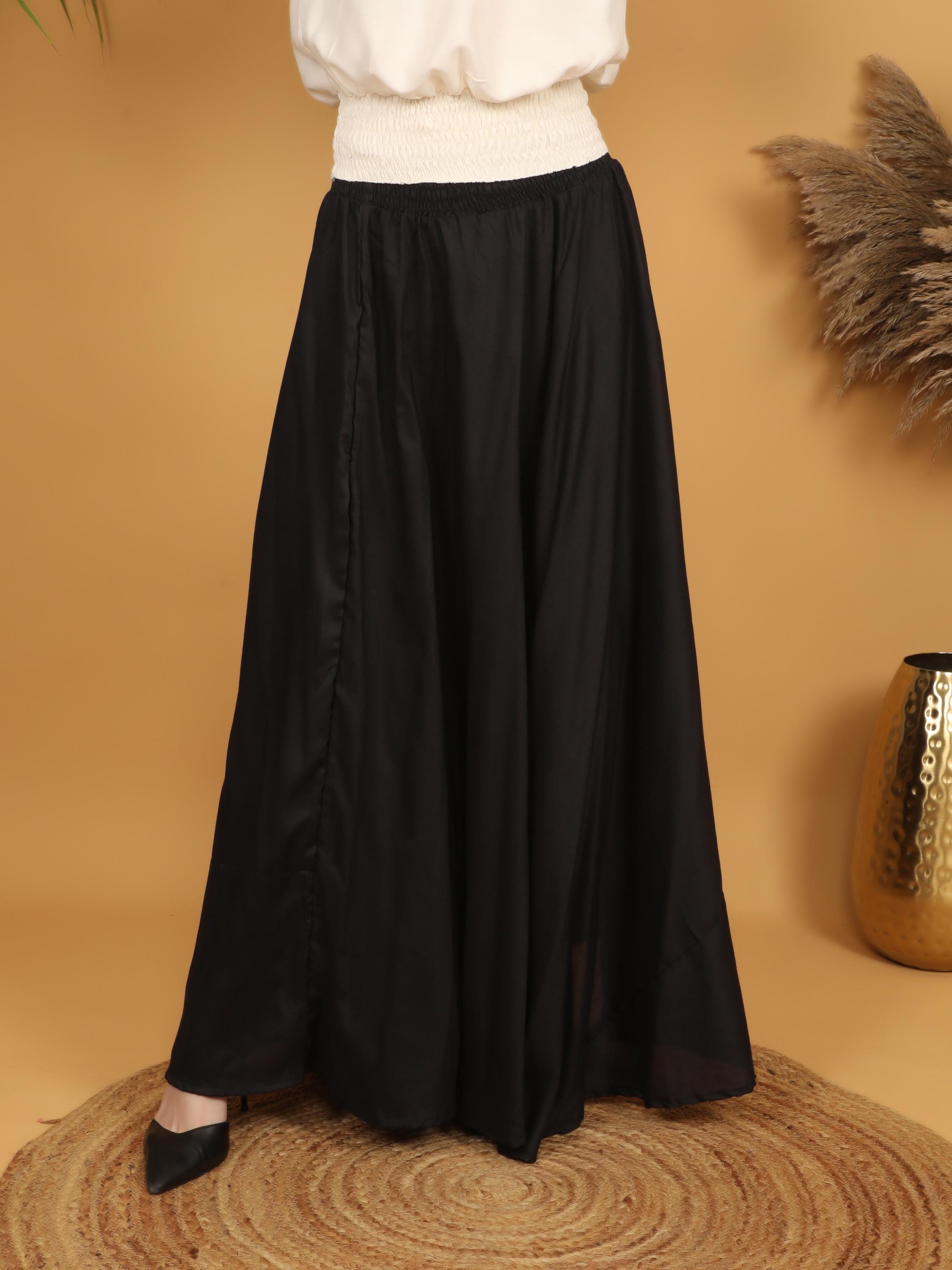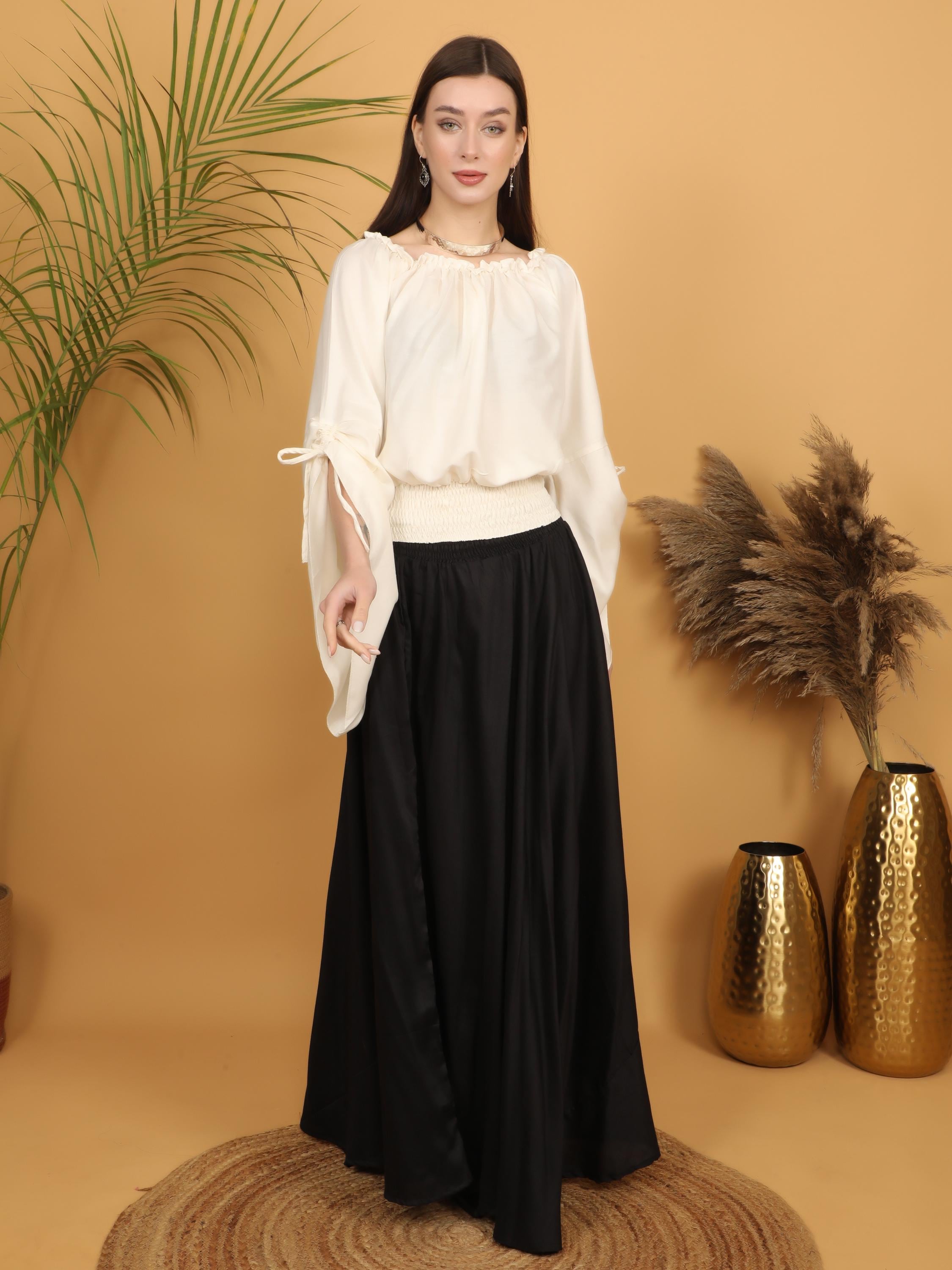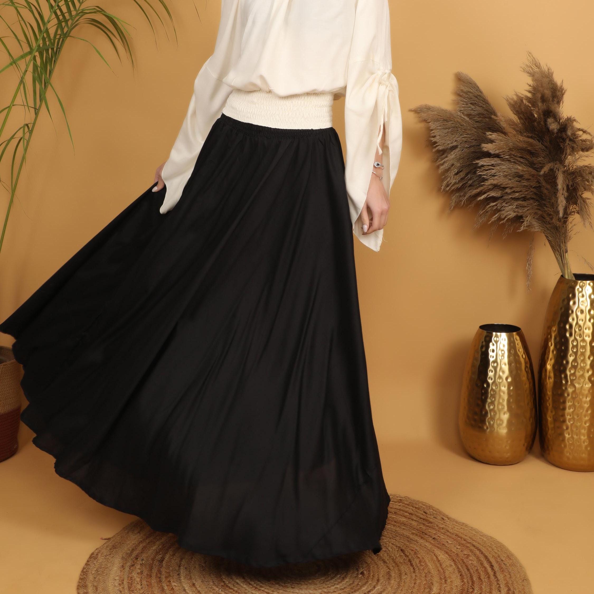 Embrace timeless elegance with this flowing black maxi skirt, designed with a fully smocked waistband all around for comfort and flexibility. The elastic smocking allows the skirt to adapt beautifully to different body shapes, making it a comfortable and flattering free size piece. Easy to wear and effortless to style, it offers both structure and movement while highlighting the waist naturally.