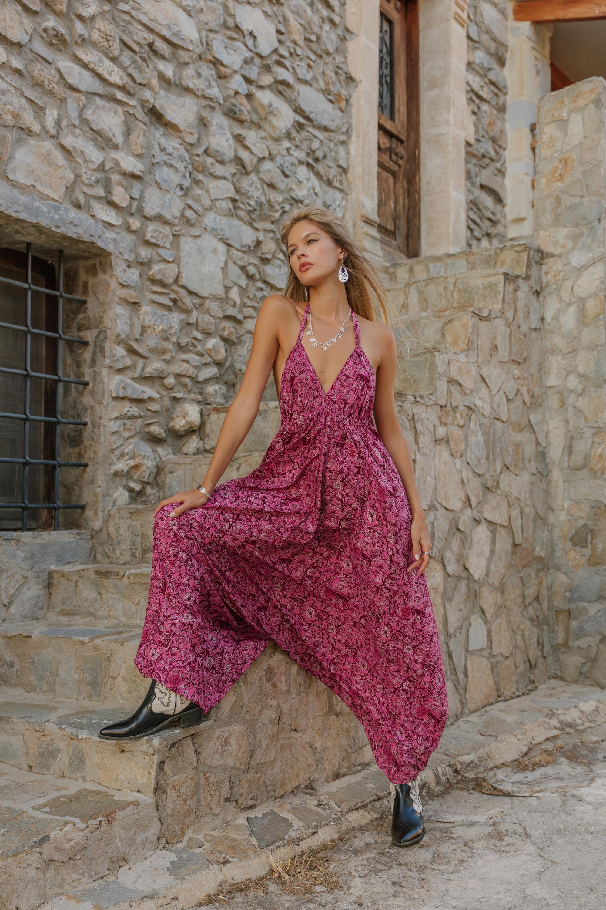 The all-over ethnic floral print adds richness and texture, while the lightweight fabric drapes beautifully, allowing ease of movement and breathability in warm weather. This jumpsuit can be styled casually with sandals or boots, or elevated with jewelry for a striking boho look.