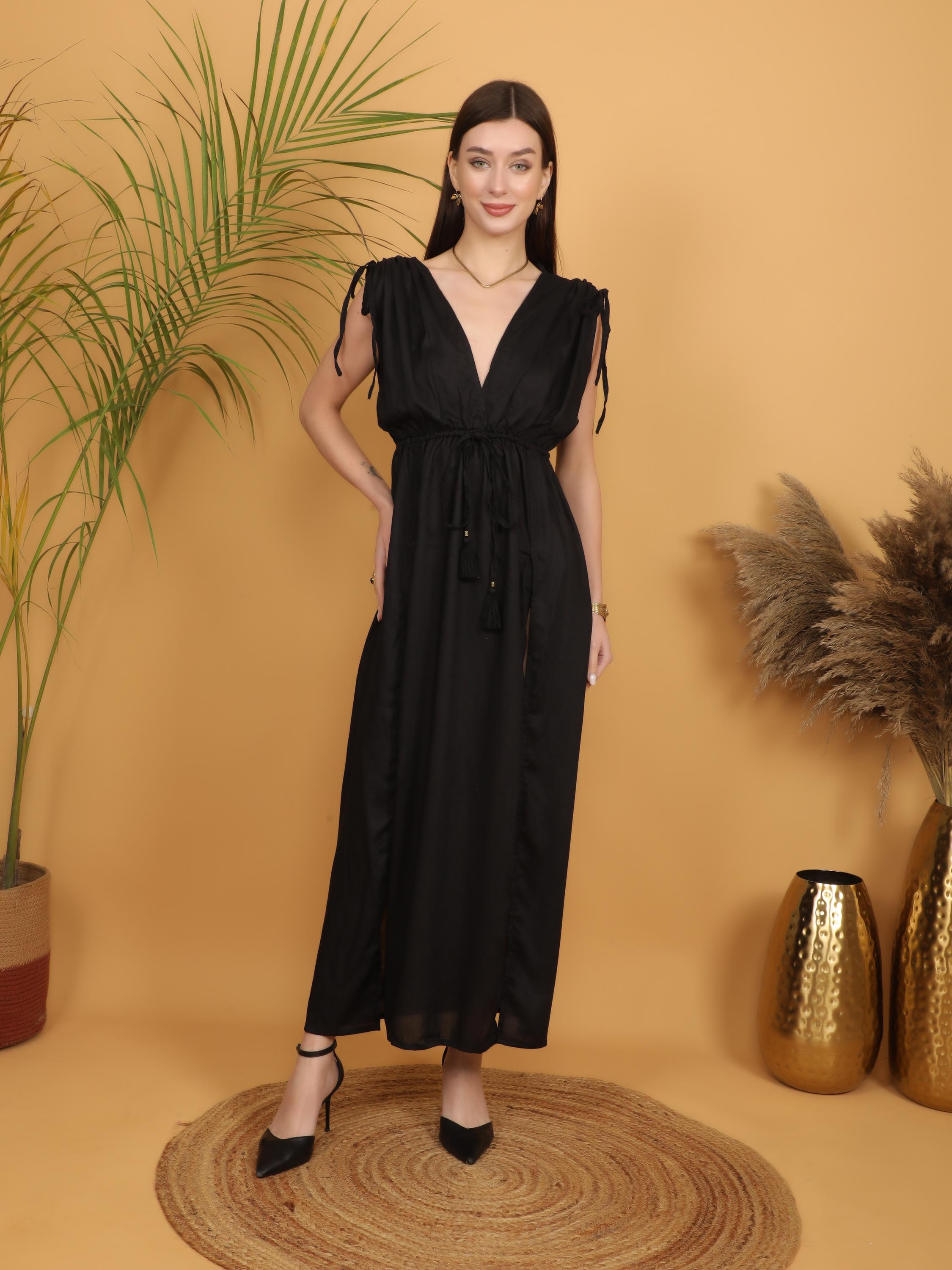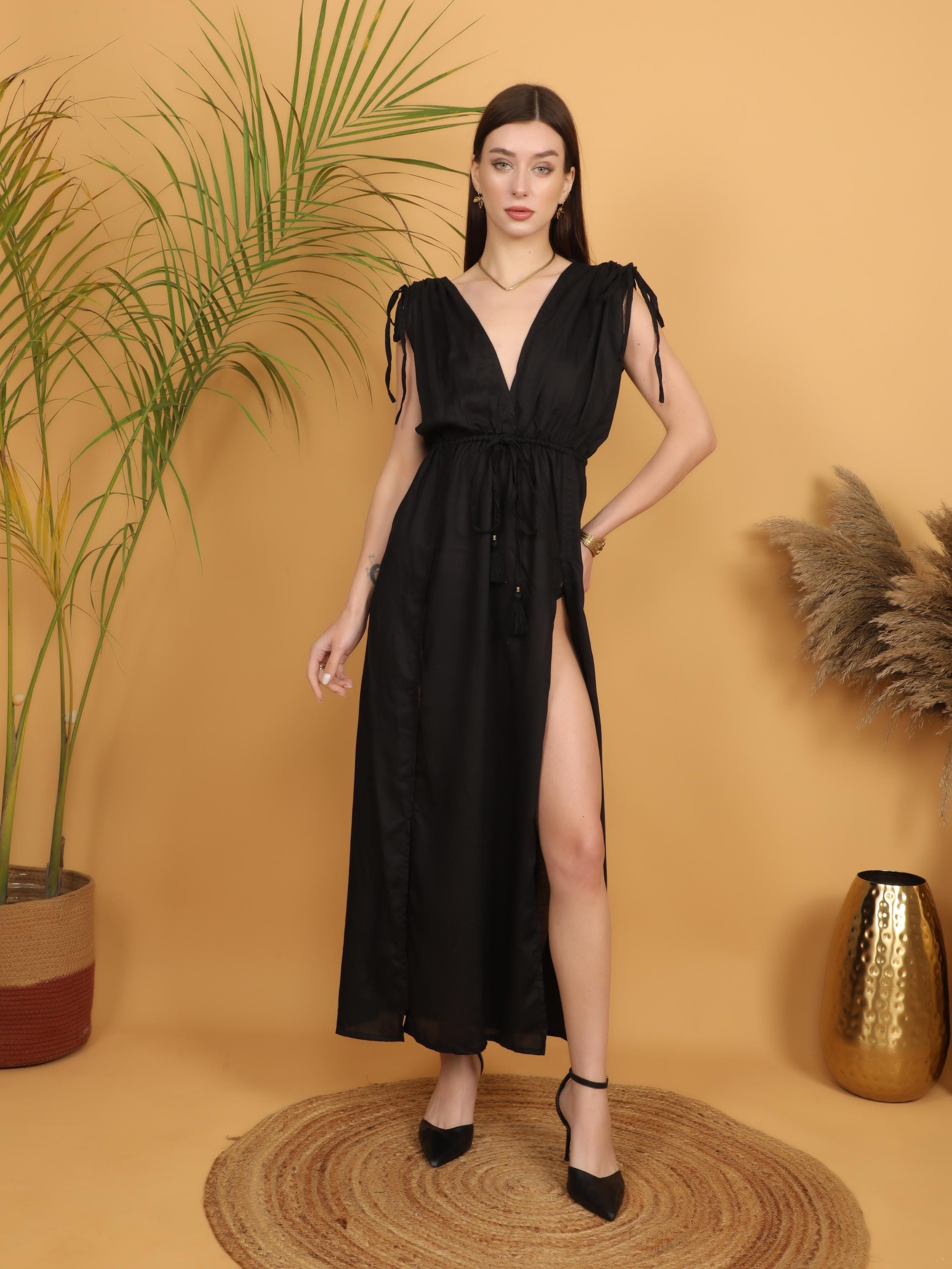 The deep V-neckline and relaxed fit give it that timeless bohemian charm, while the two high side slits (one on each side) add graceful movement and a subtle touch of allure.