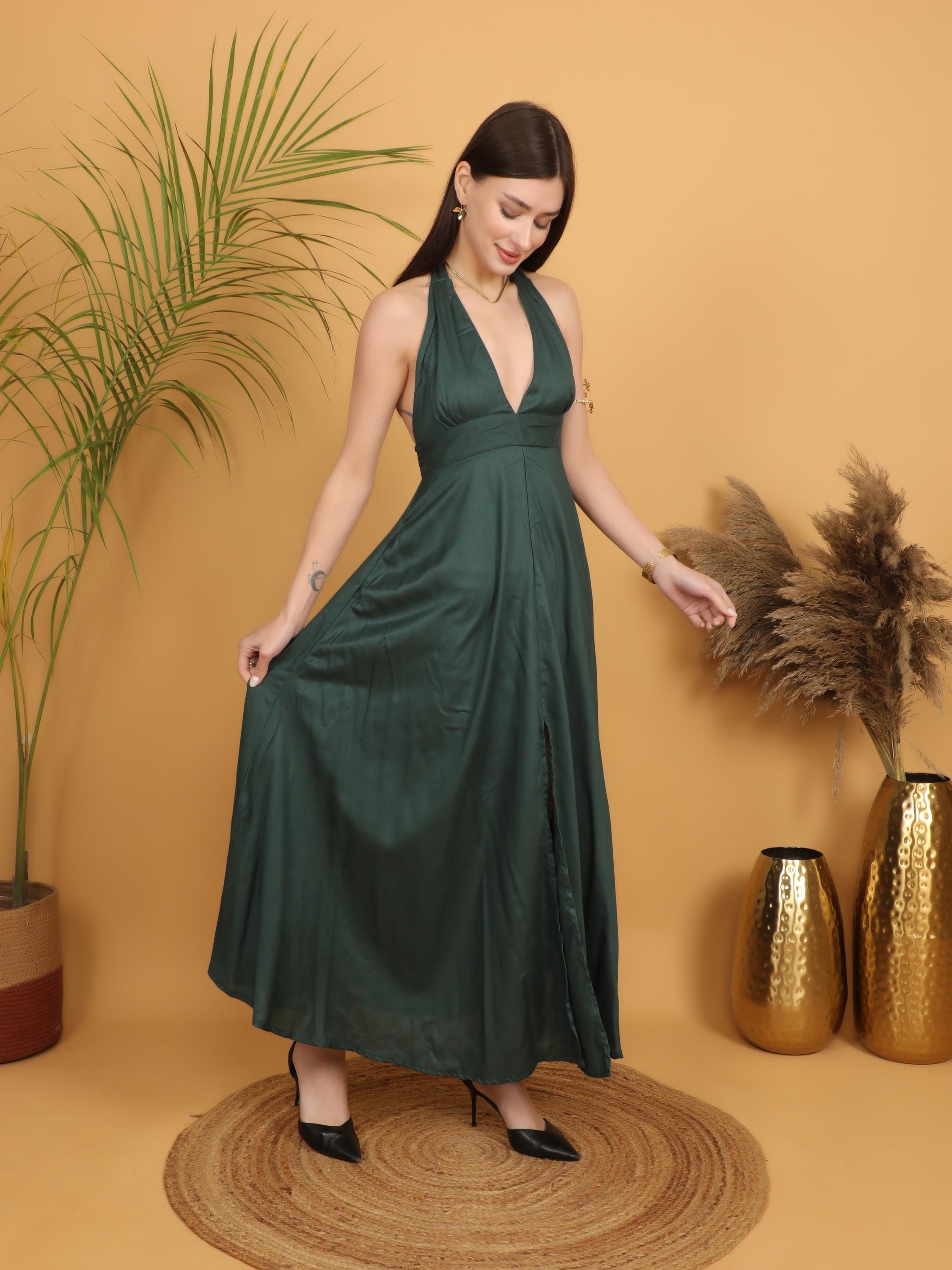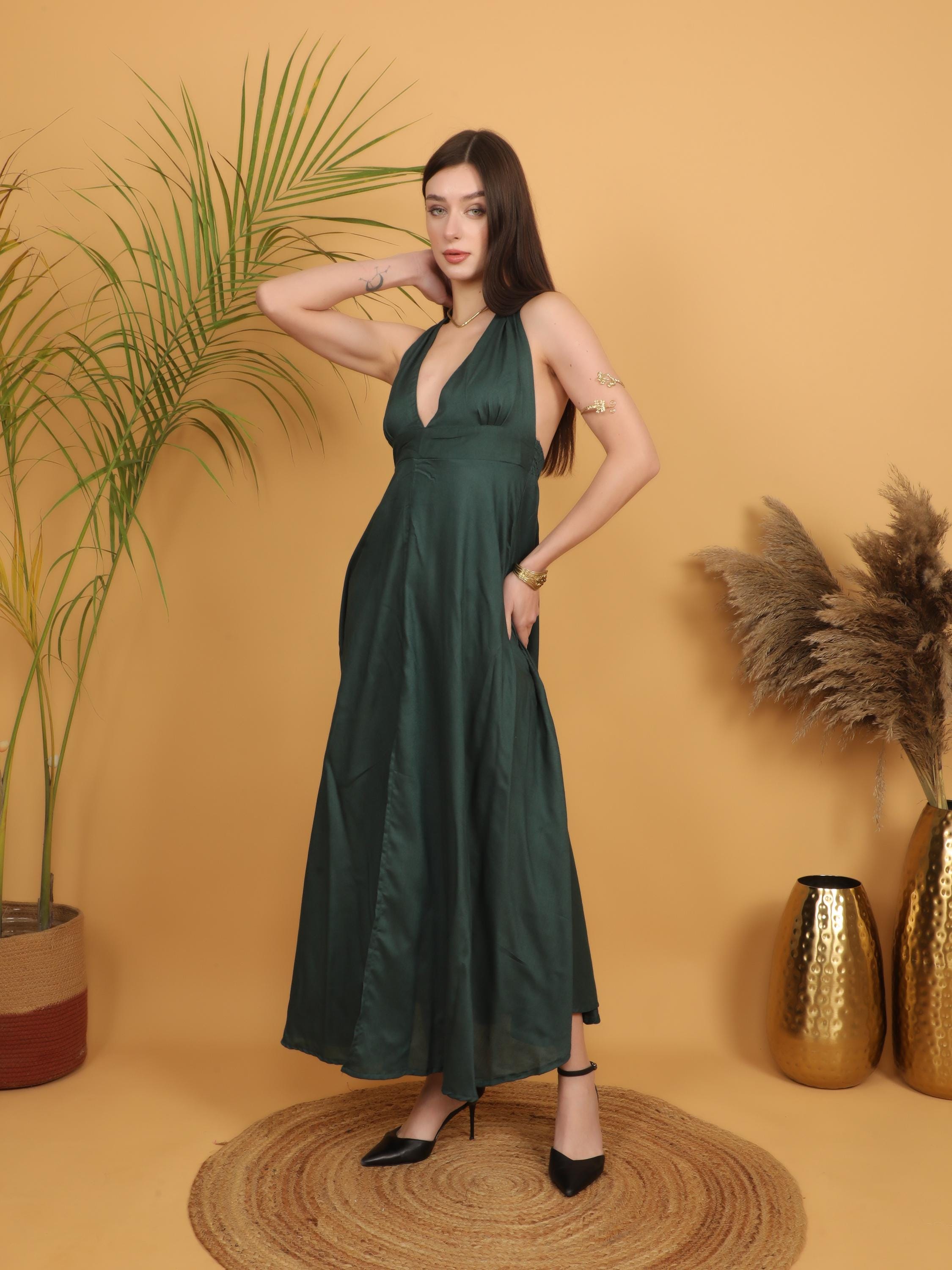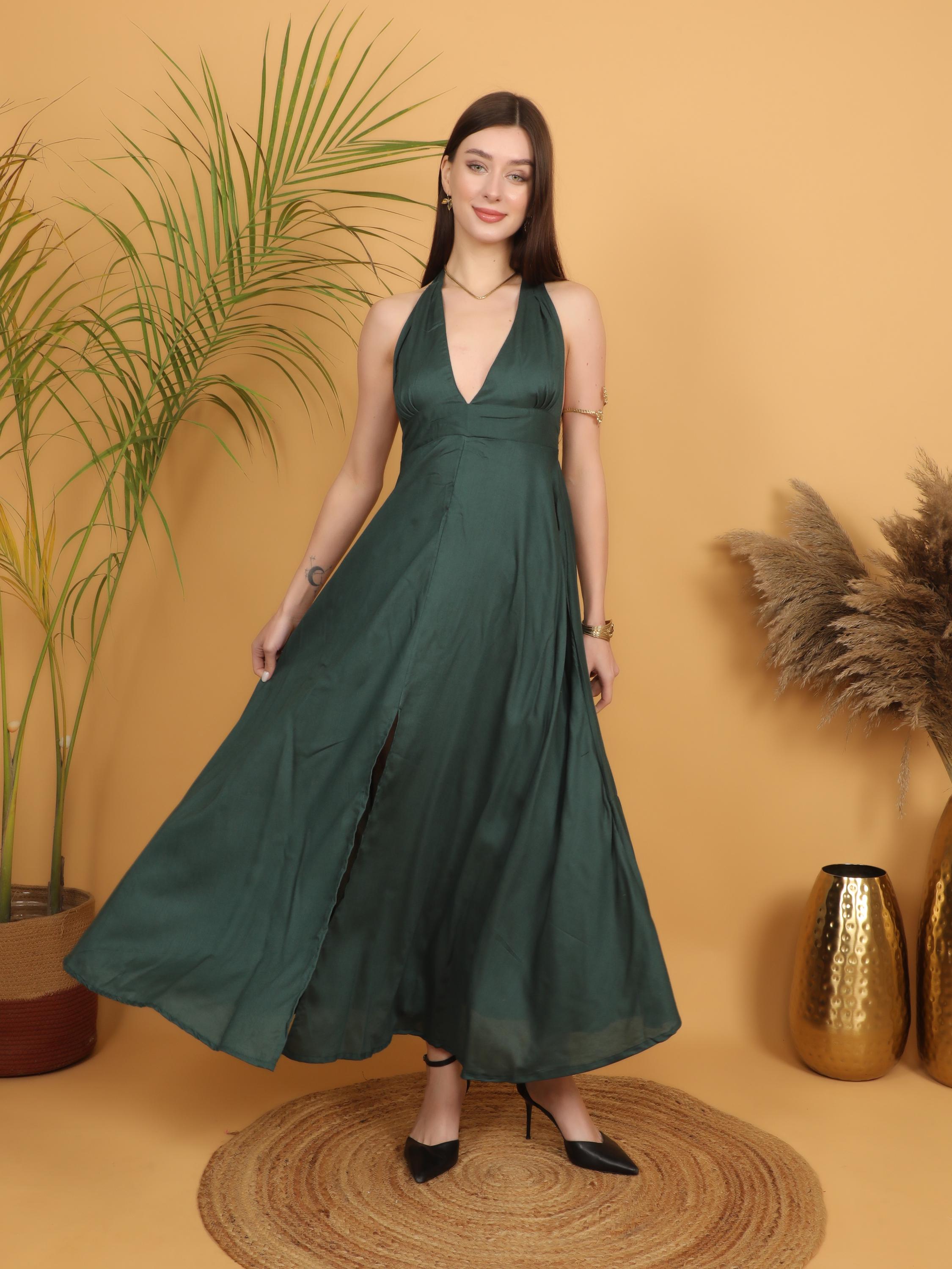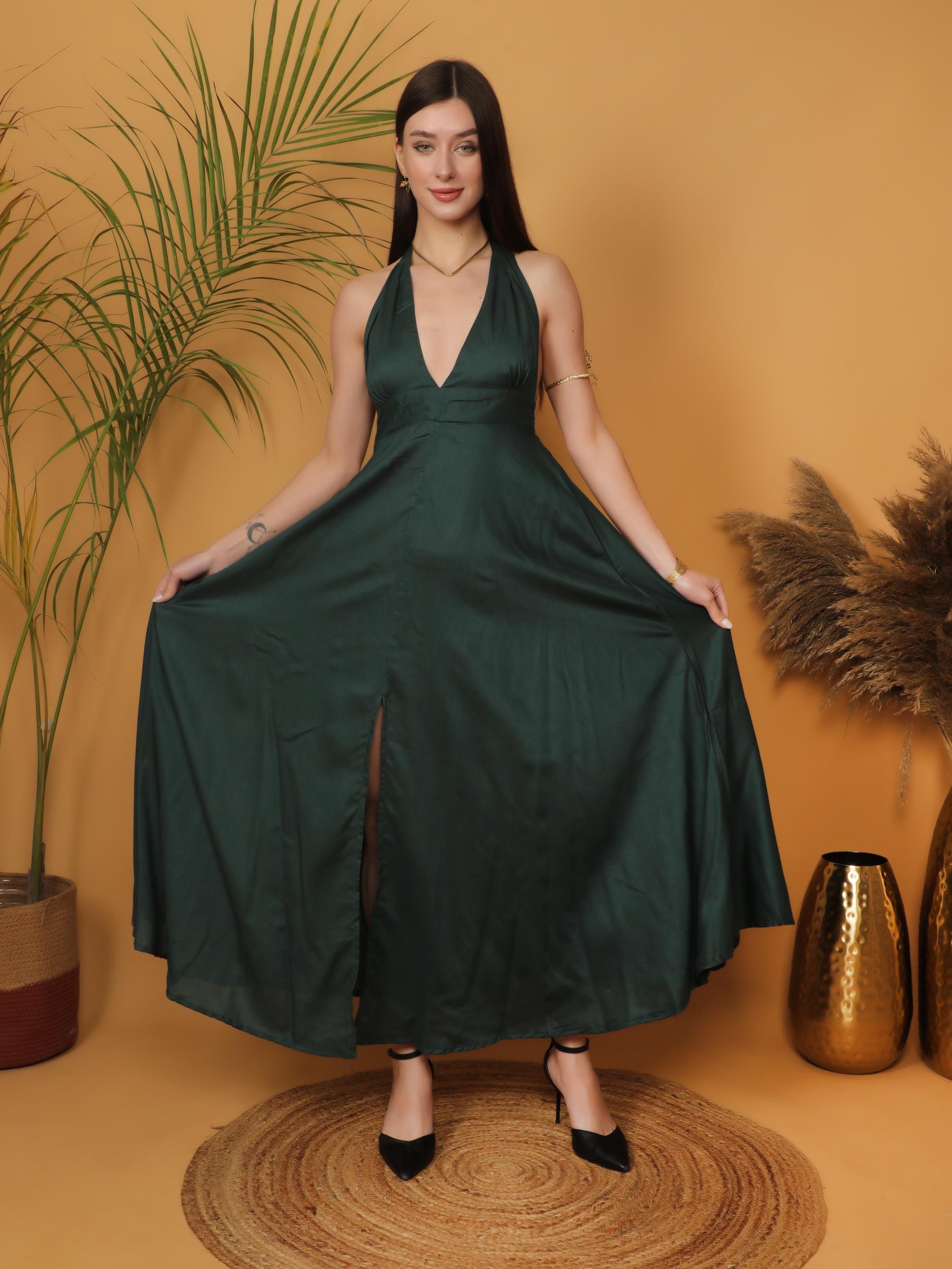 The rich emerald green color enhances its earthy and feminine character, making it a standout piece for summer evenings, festivals, vacations, or special occasions. The flattering neckline and graceful cut combine with a subtle yet striking front slit, adding movement, comfort, and a touch of confident allure.