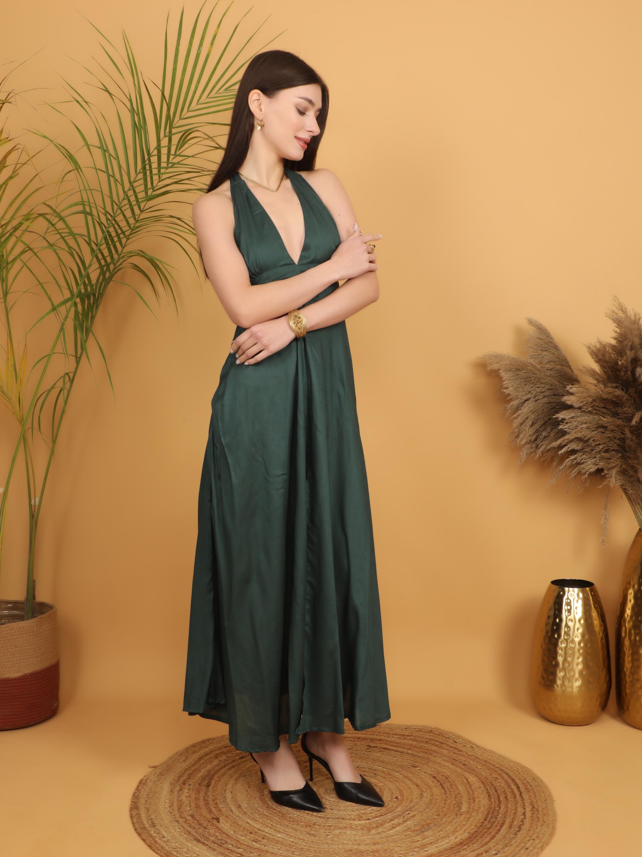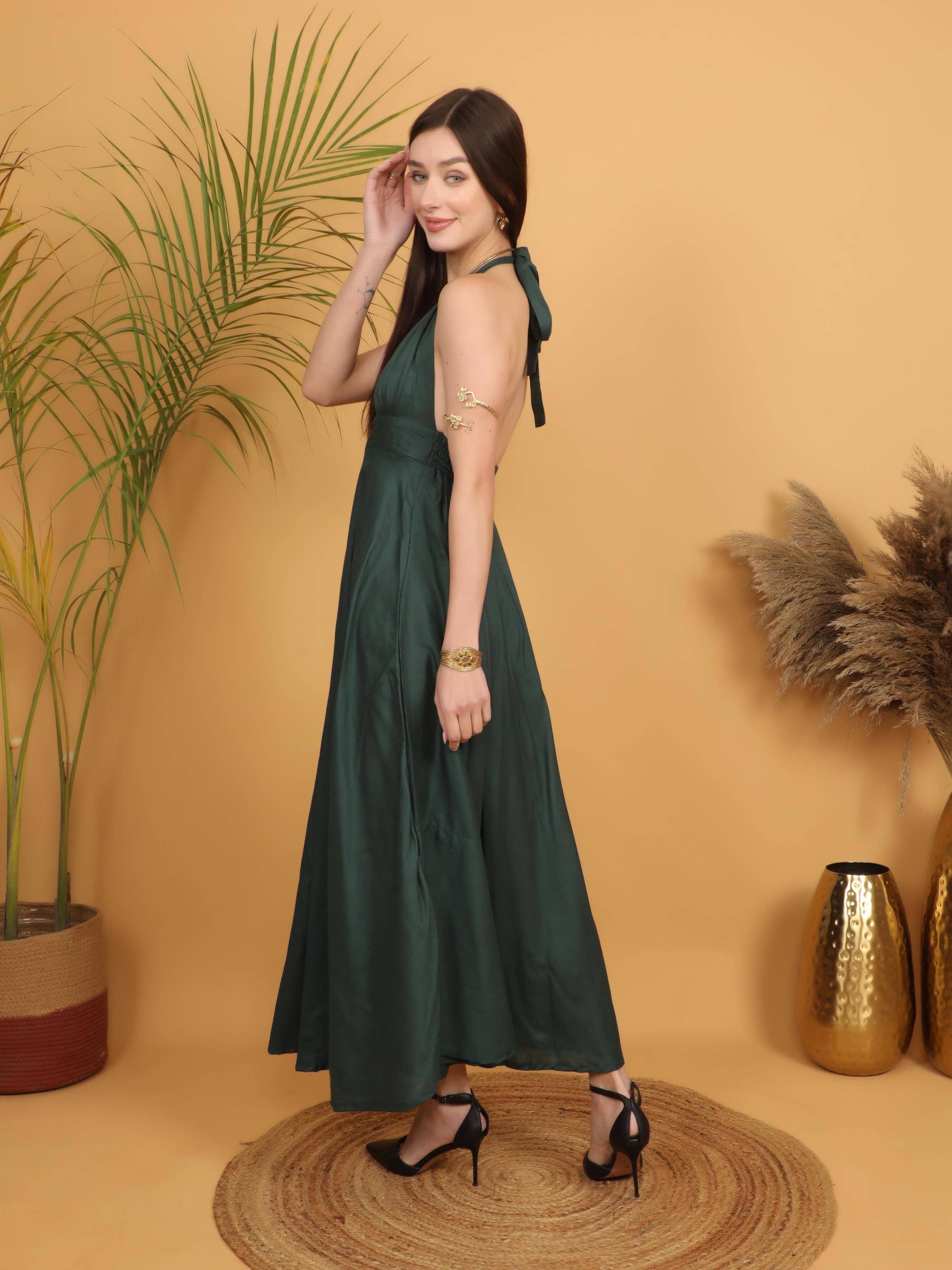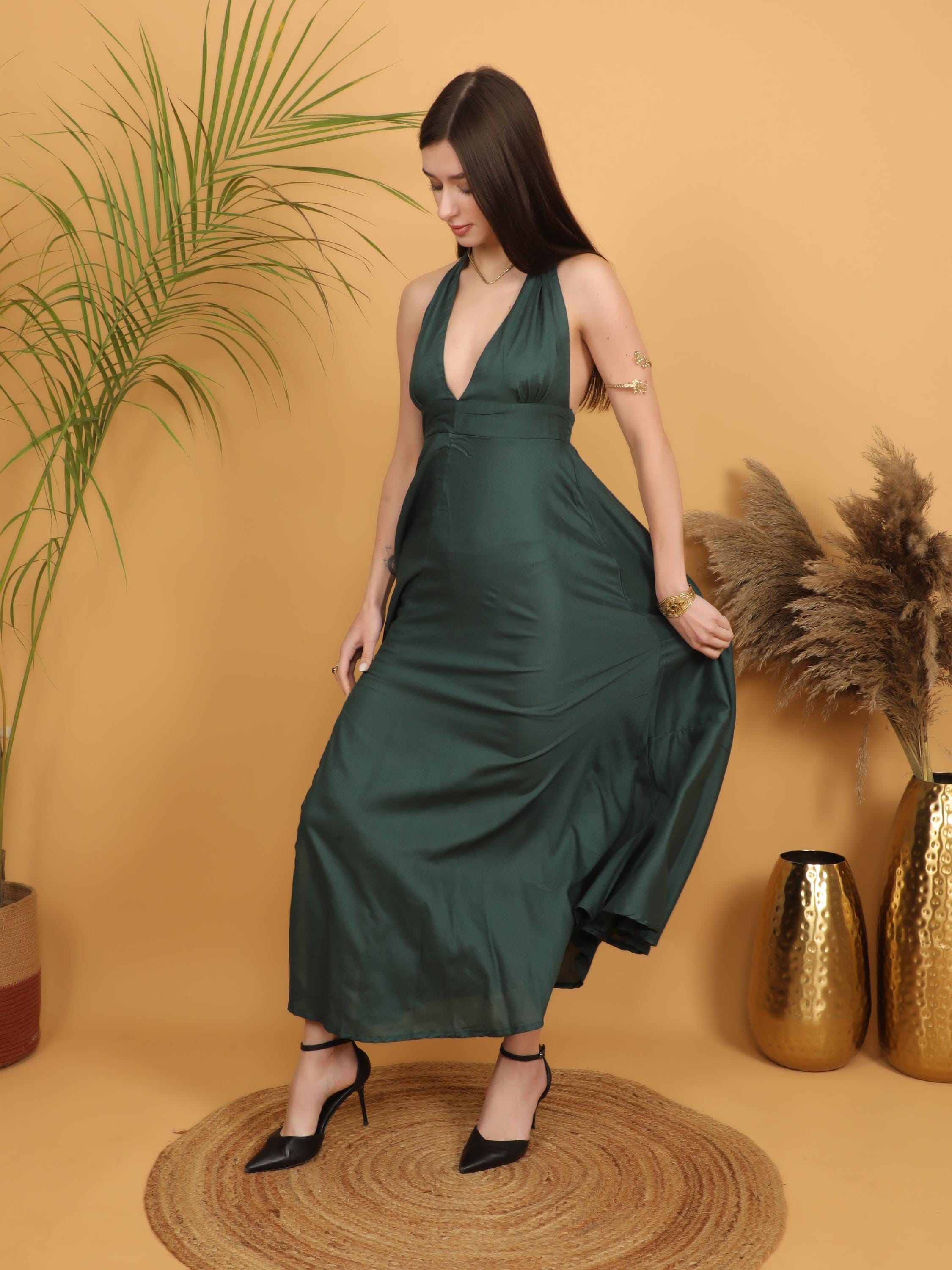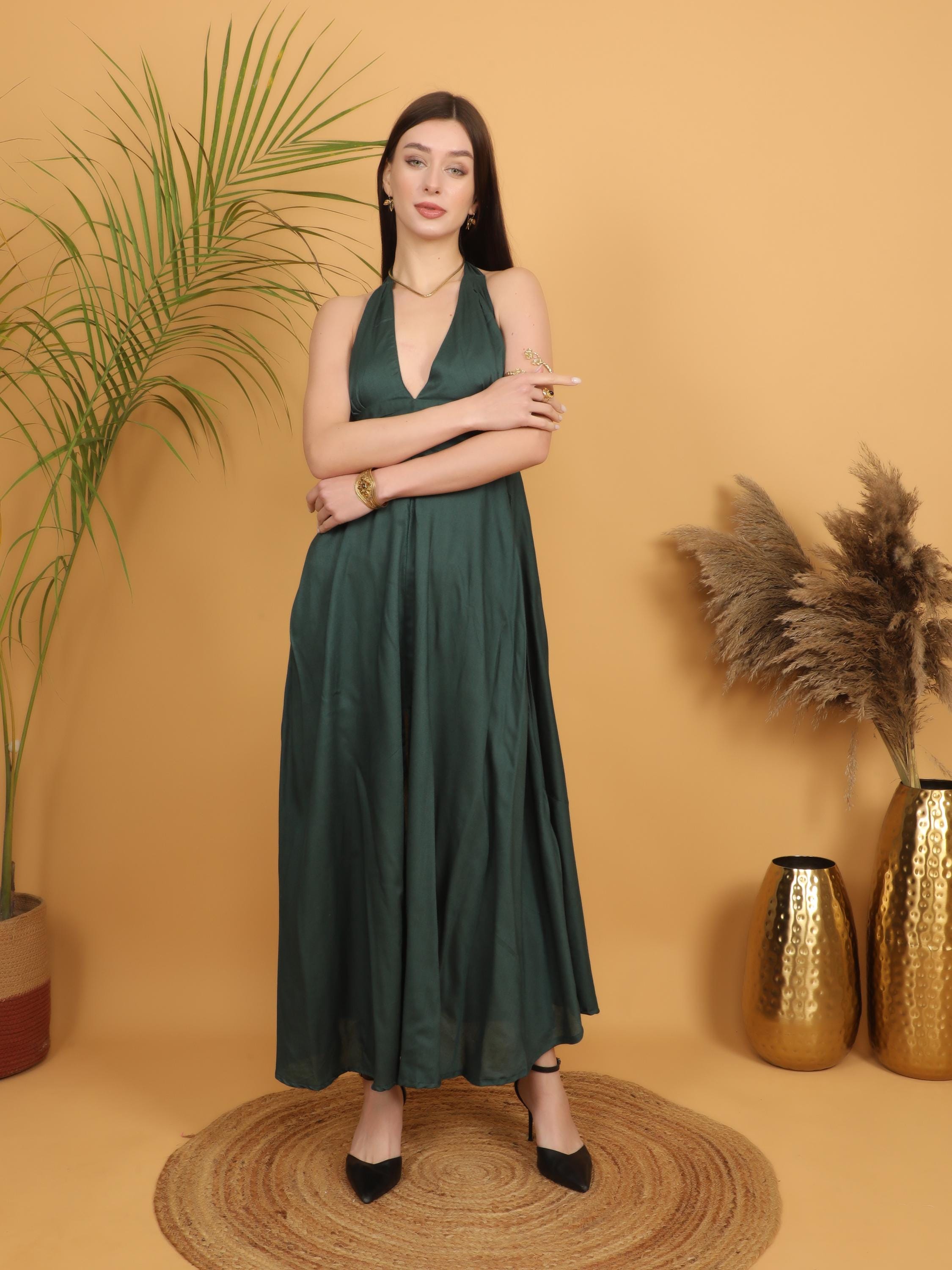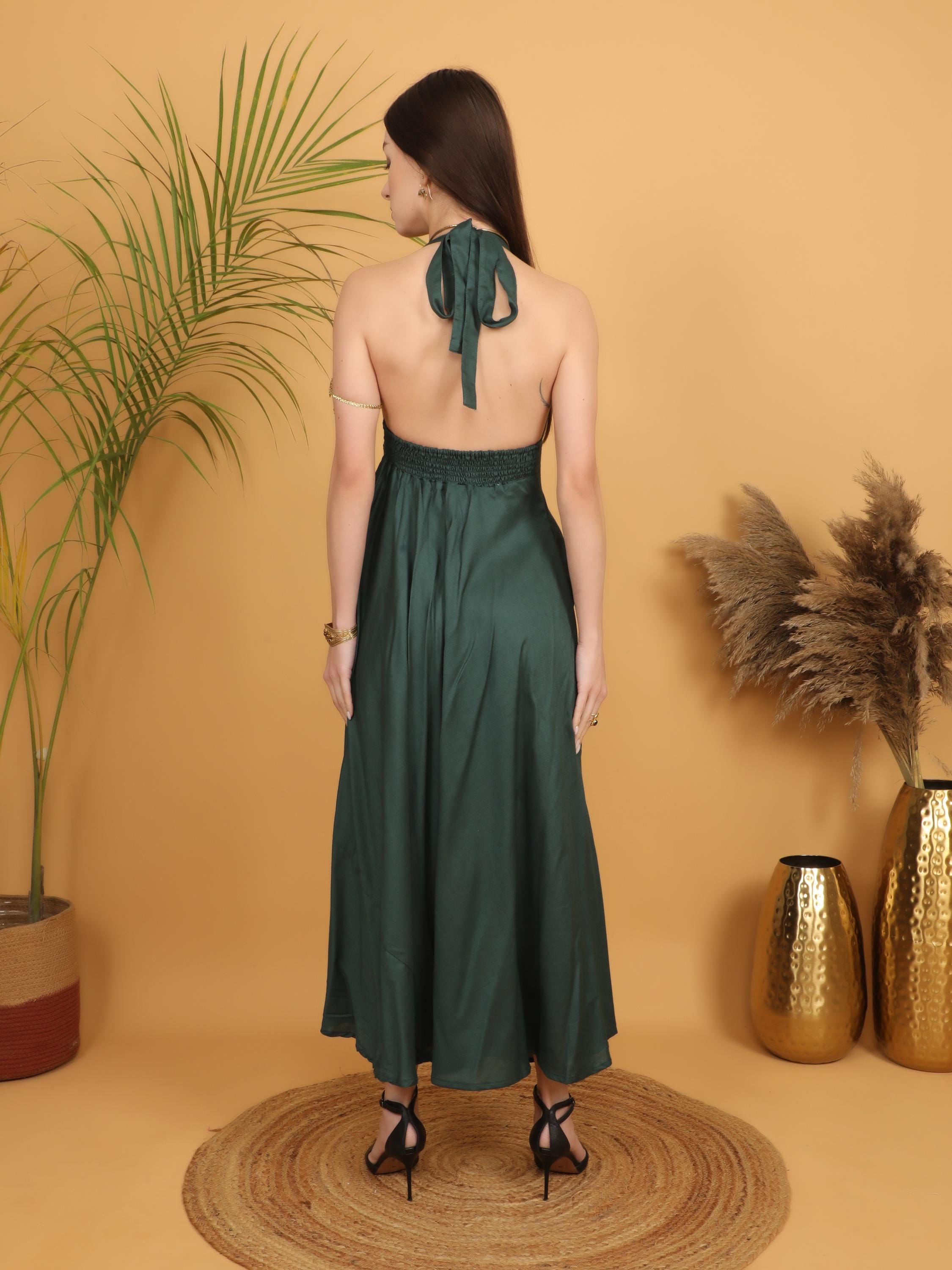 The rich emerald green color enhances its earthy and feminine character, making it a standout piece for summer evenings, festivals, vacations, or special occasions. The flattering neckline and graceful cut combine with a subtle yet striking front slit, adding movement, comfort, and a touch of confident allure.