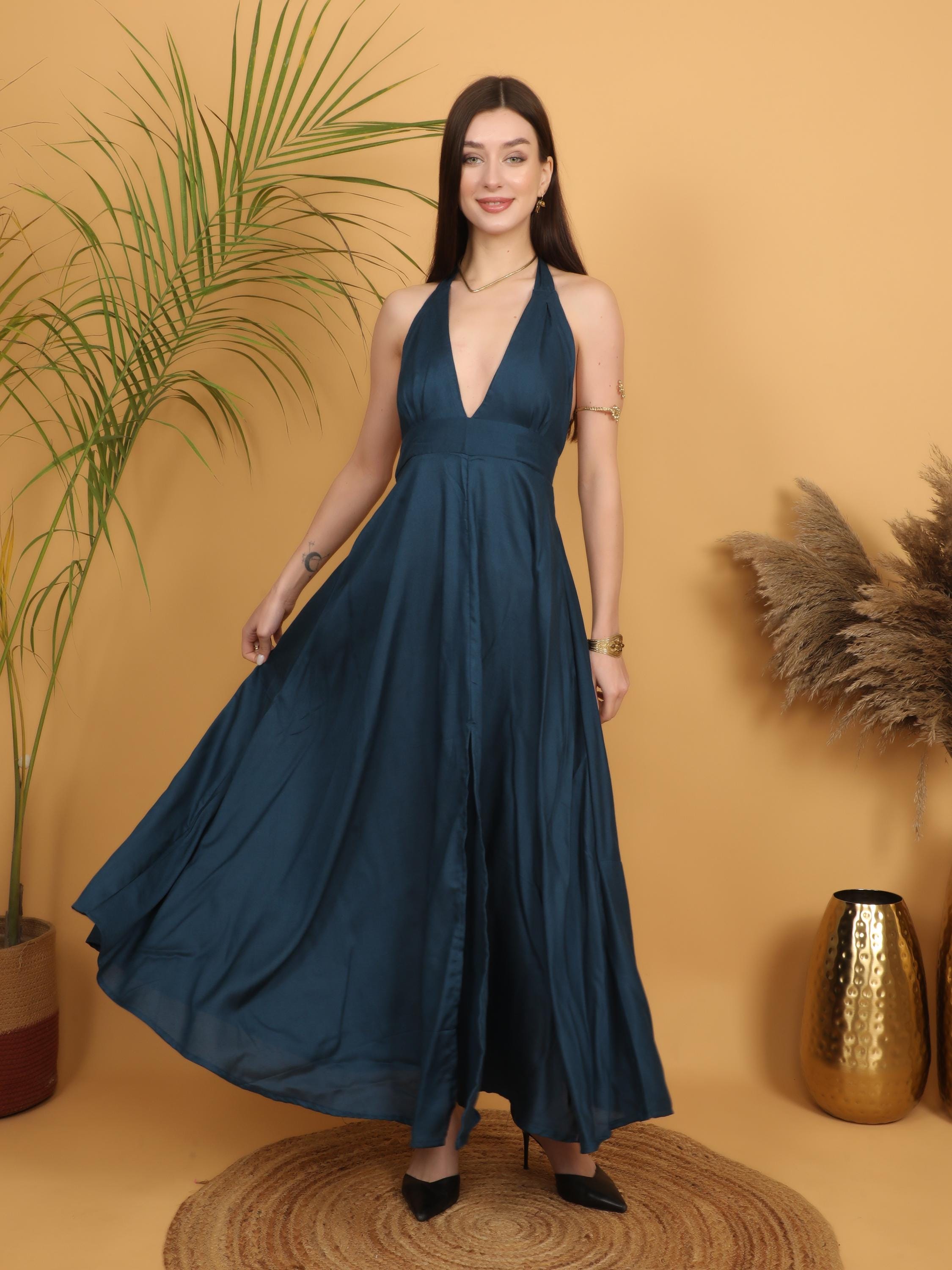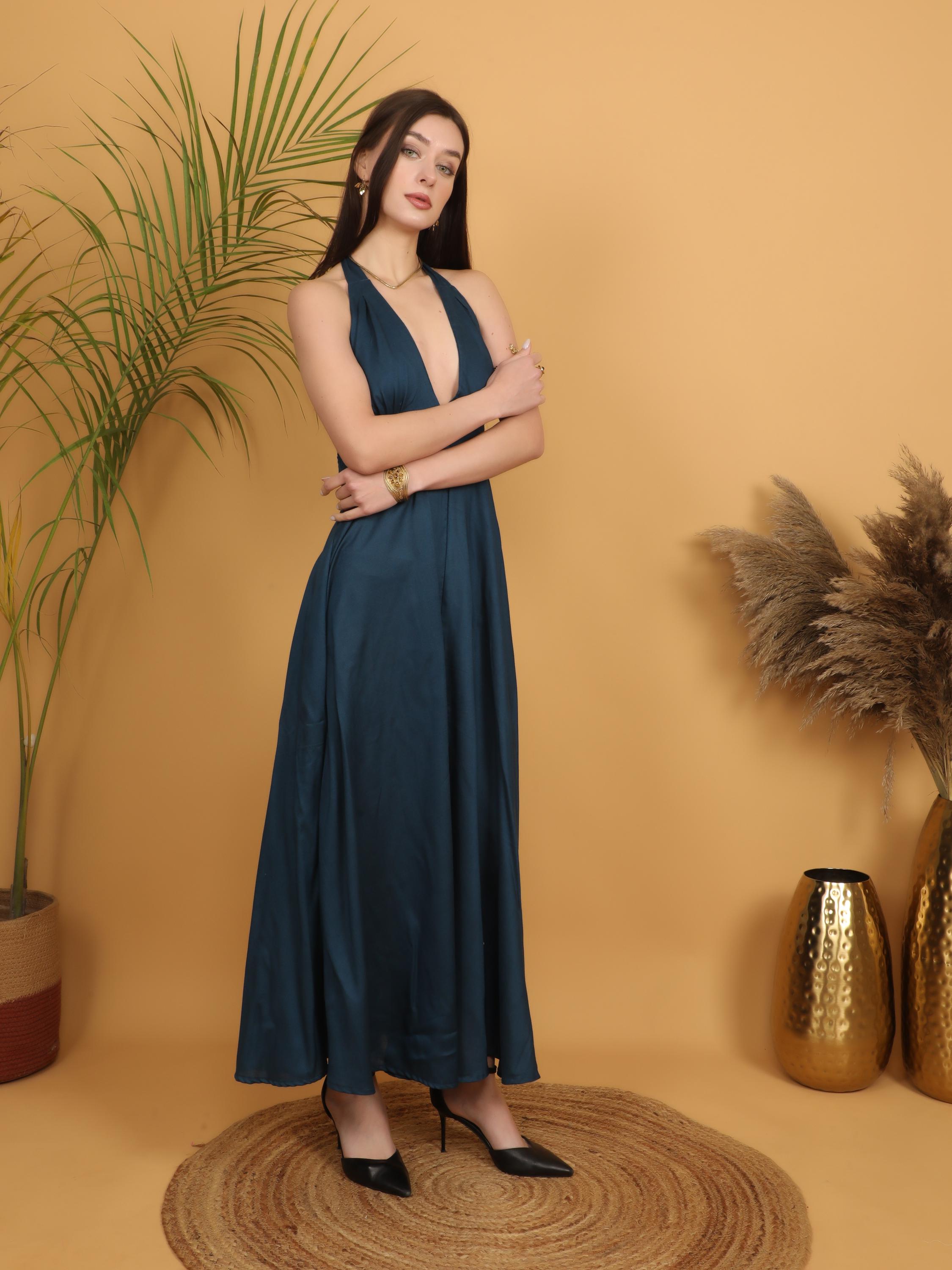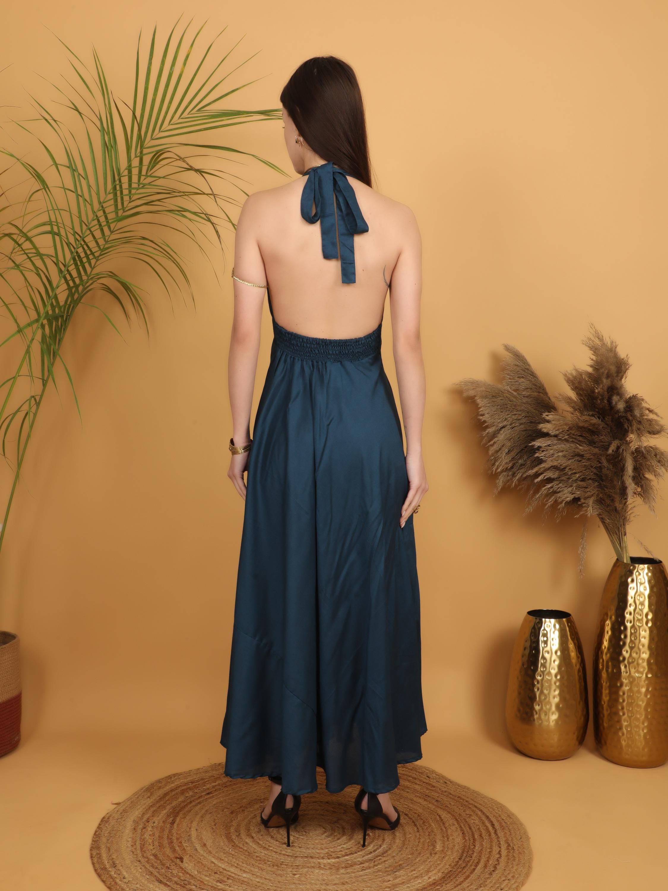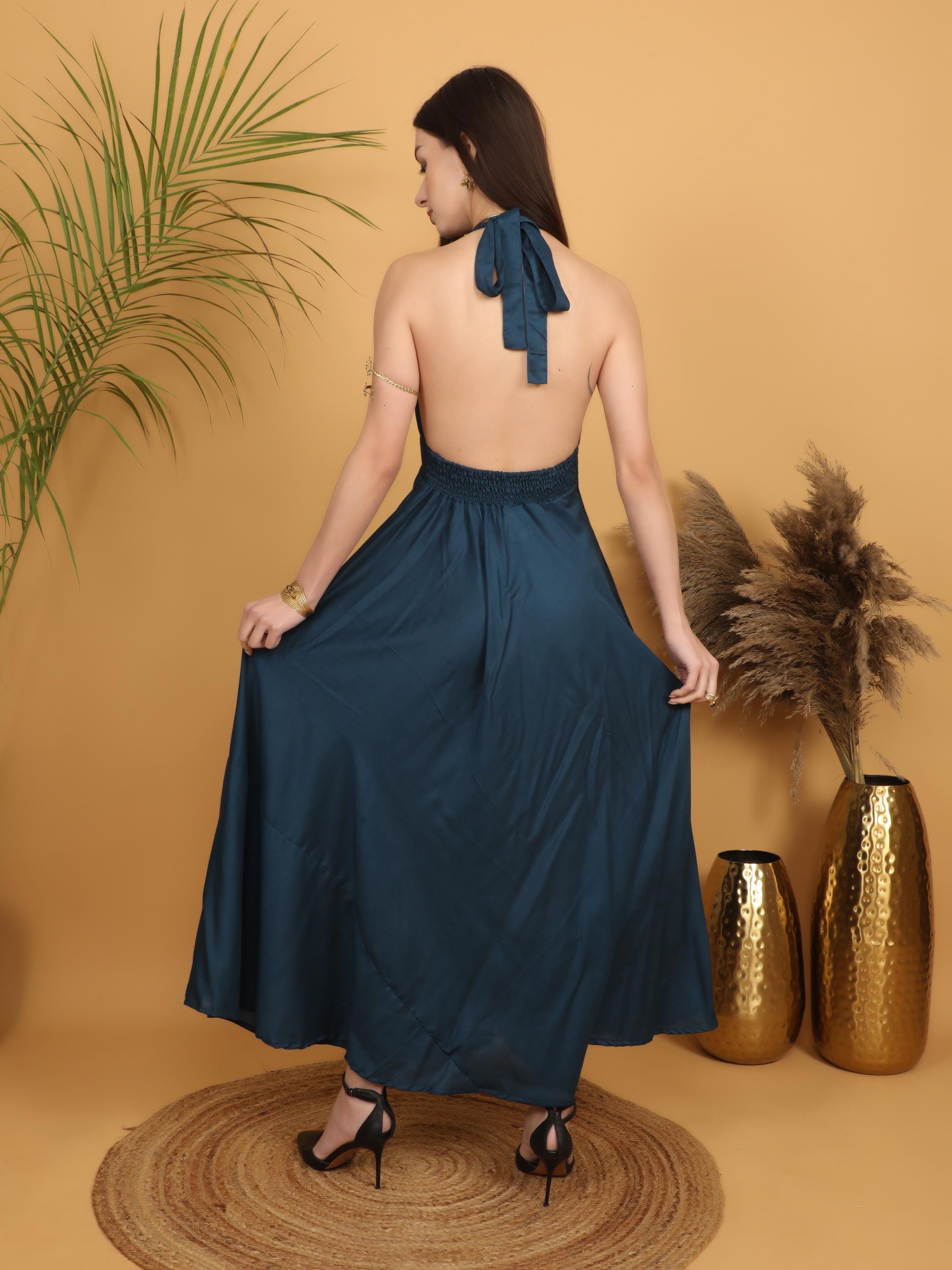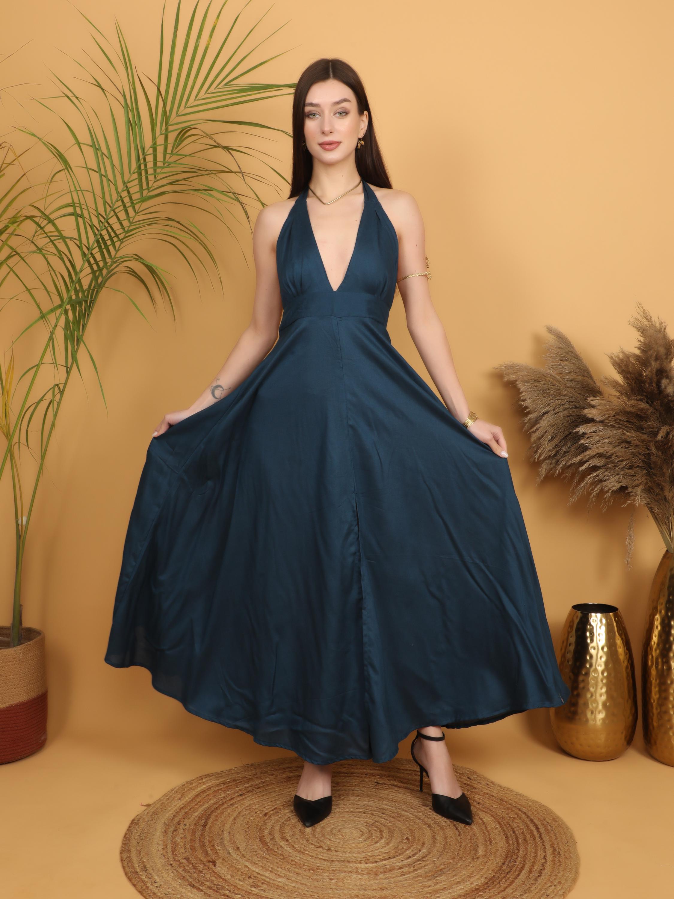 Step into effortless elegance with this breathtaking petrol blue backless maxi dress, designed for the free-spirited modern woman. Made from soft and breathable 100% viscose, this dress flows beautifully with every step, creating a graceful and feminine silhouette.