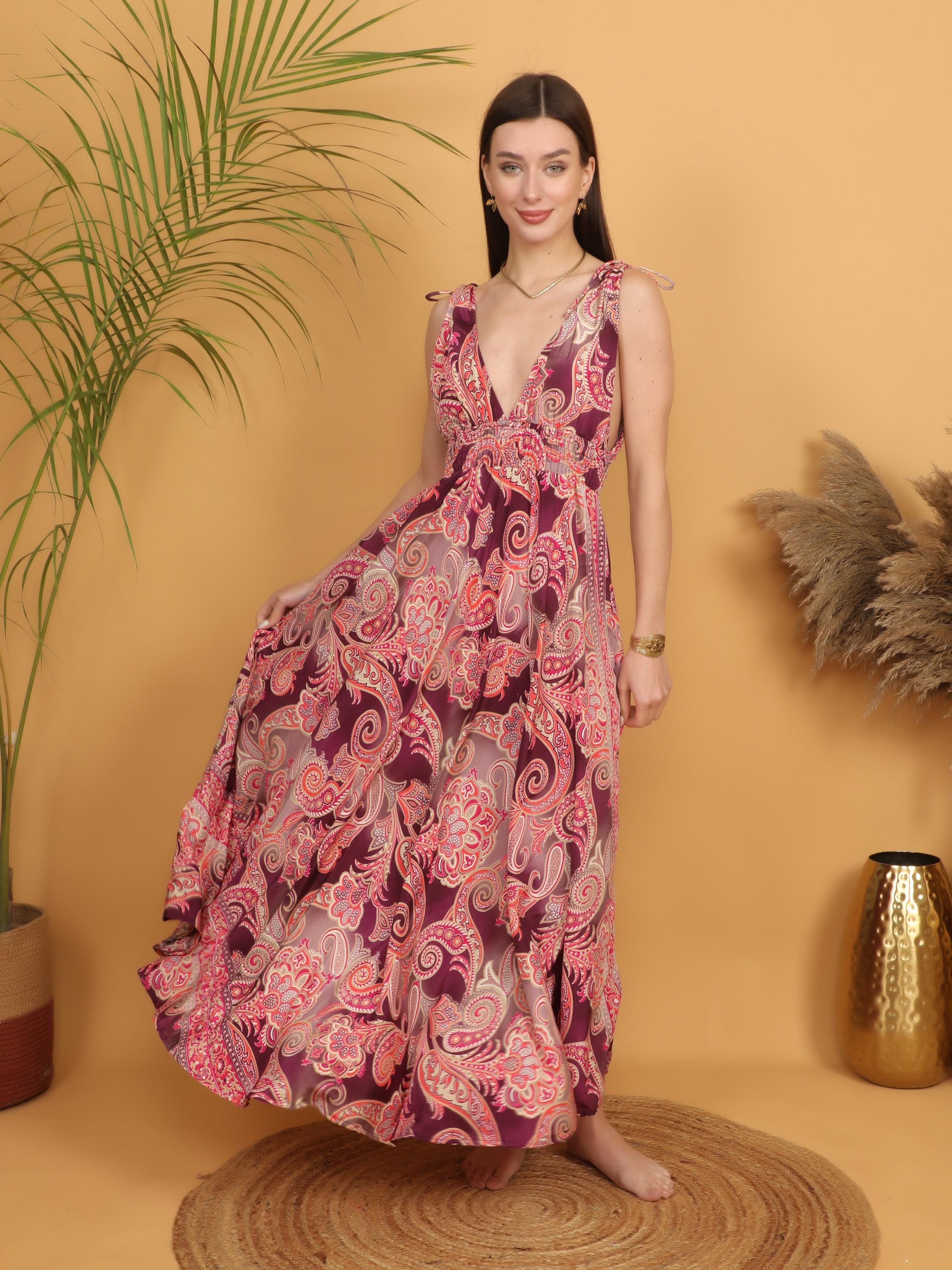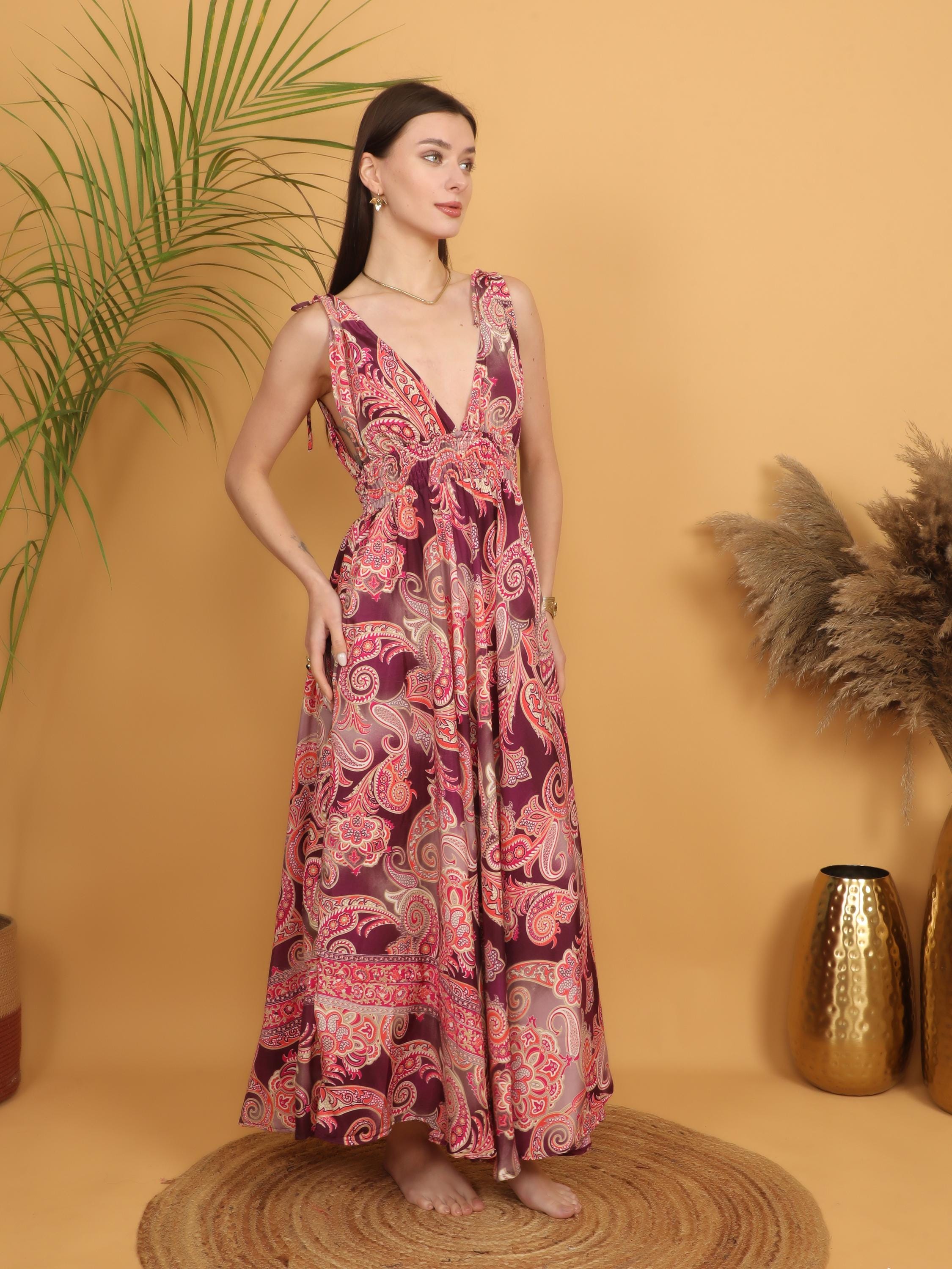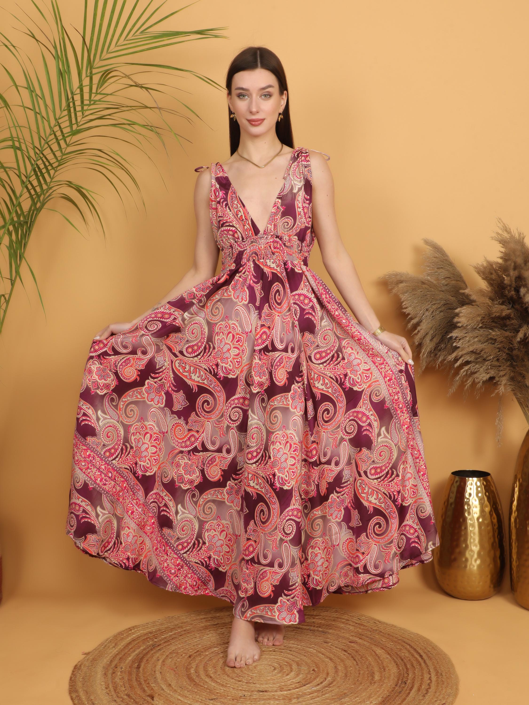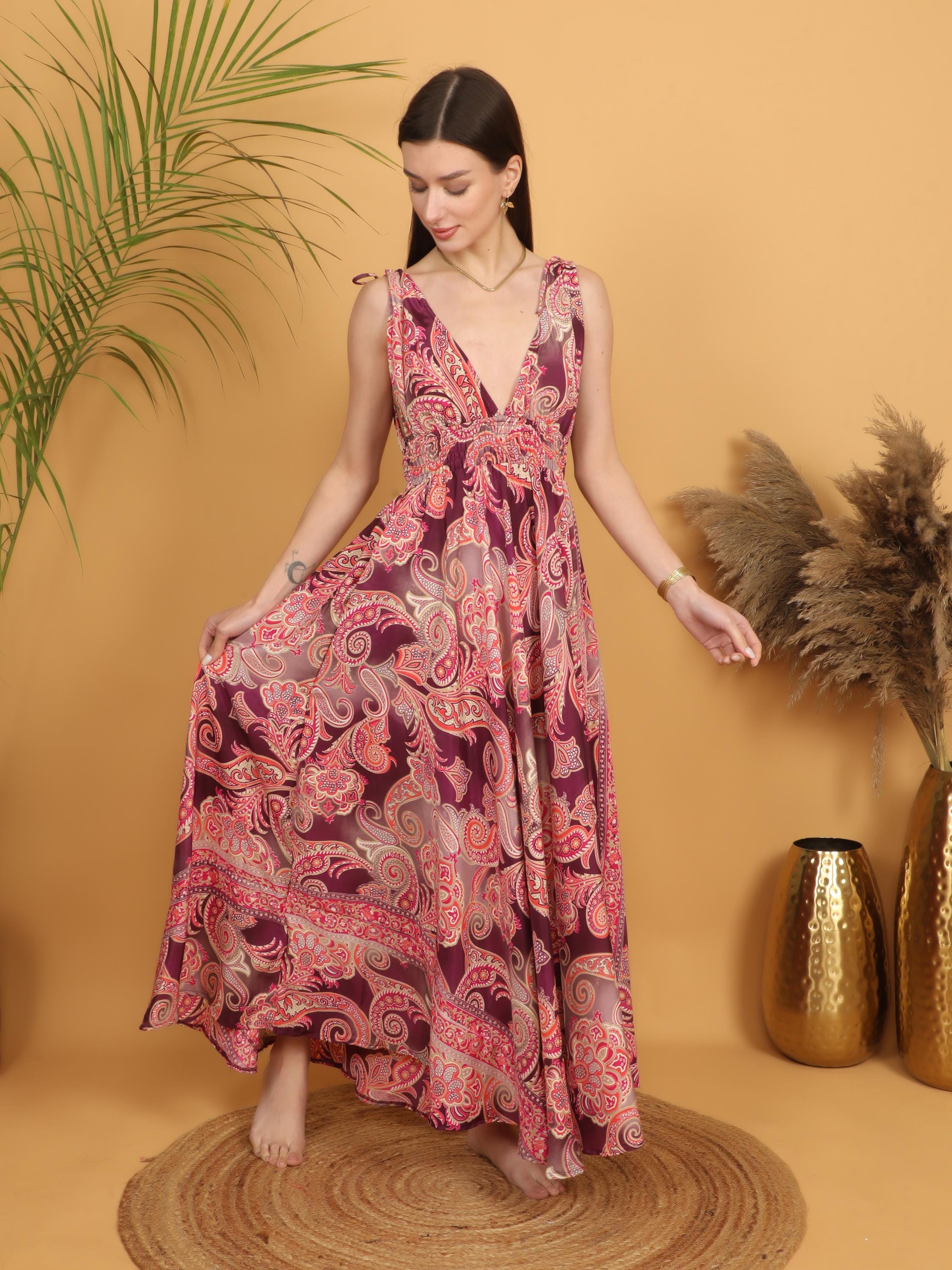 This dress features an intricate paisley pattern inspired by vintage bohemian artistry. The rich burgundy base blends harmoniously with shades of soft pink, coral, and delicate beige tones. The swirling motifs create a mesmerizing visual effect that feels both exotic and timeless.