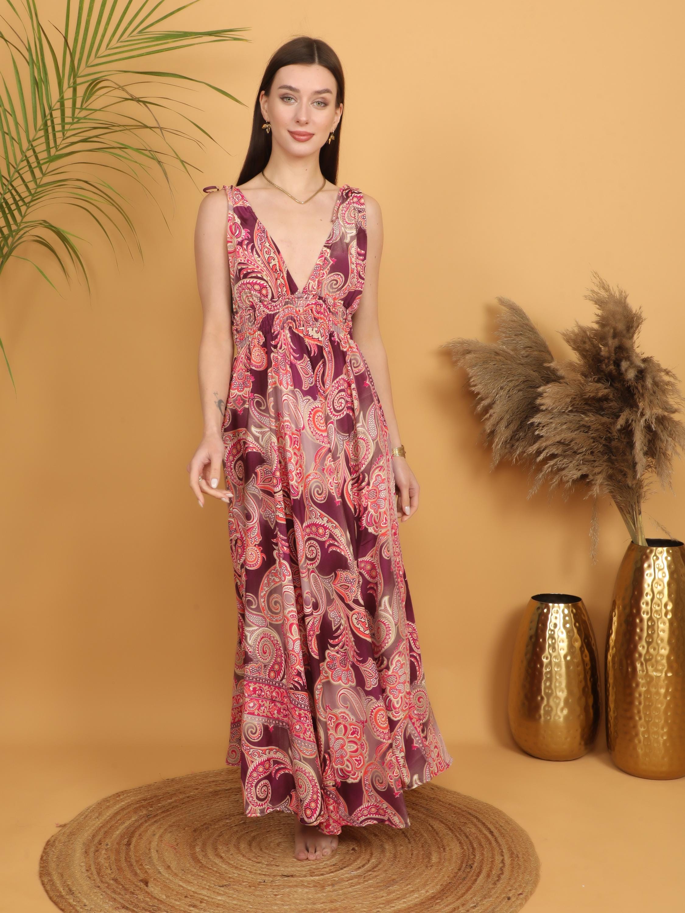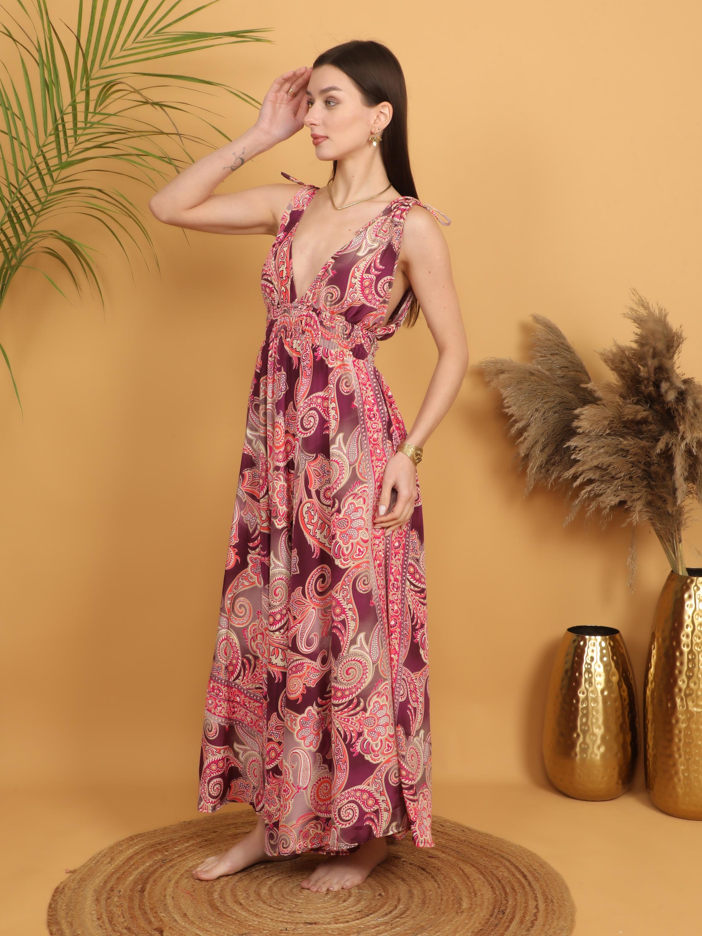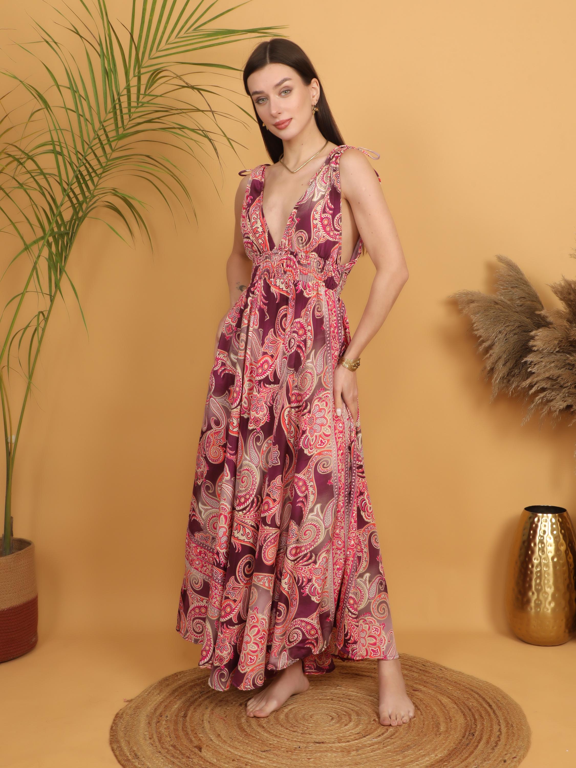 This dress features an intricate paisley pattern inspired by vintage bohemian artistry. The rich burgundy base blends harmoniously with shades of soft pink, coral, and delicate beige tones. The swirling motifs create a mesmerizing visual effect that feels both exotic and timeless.