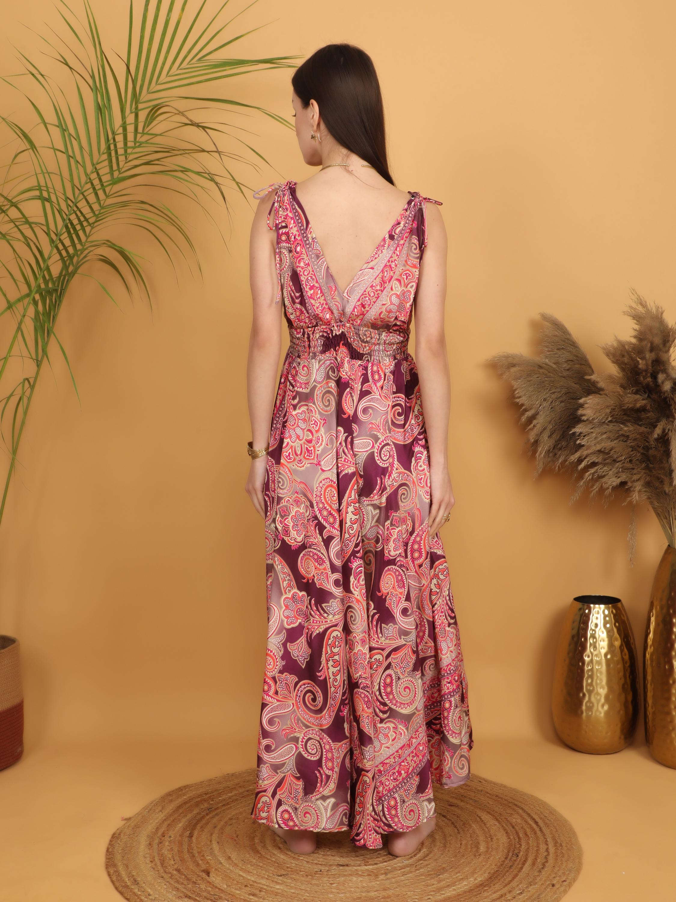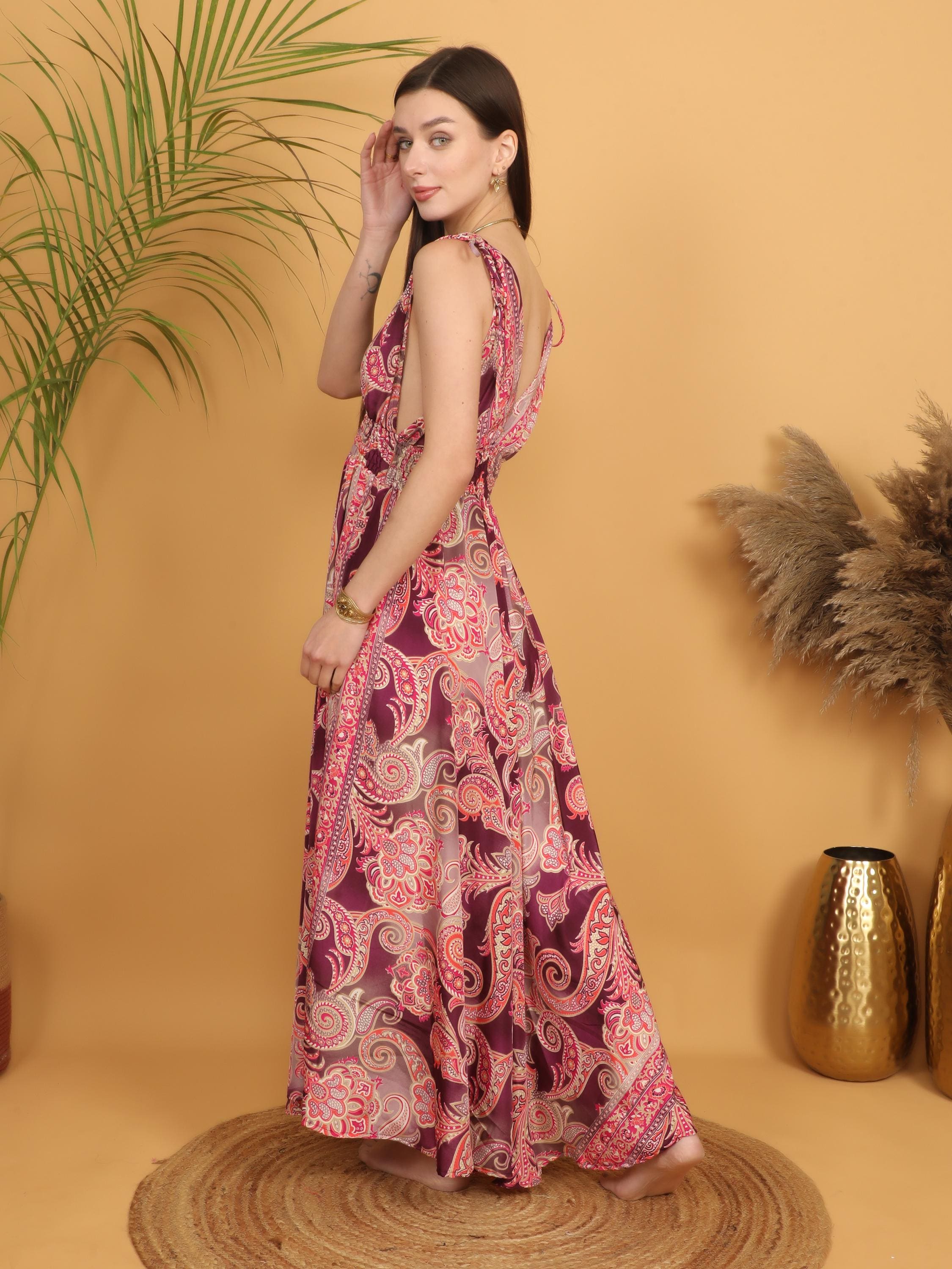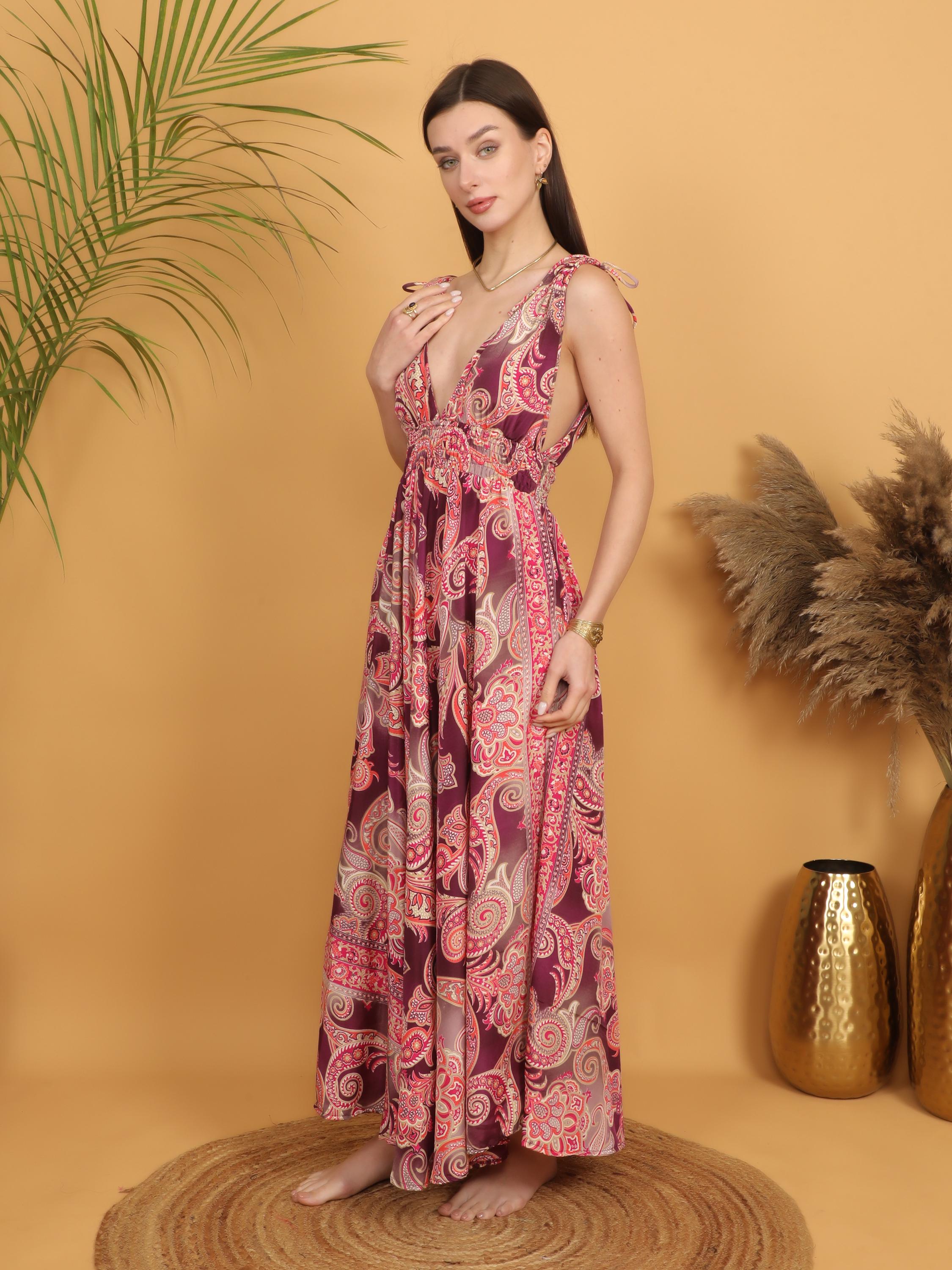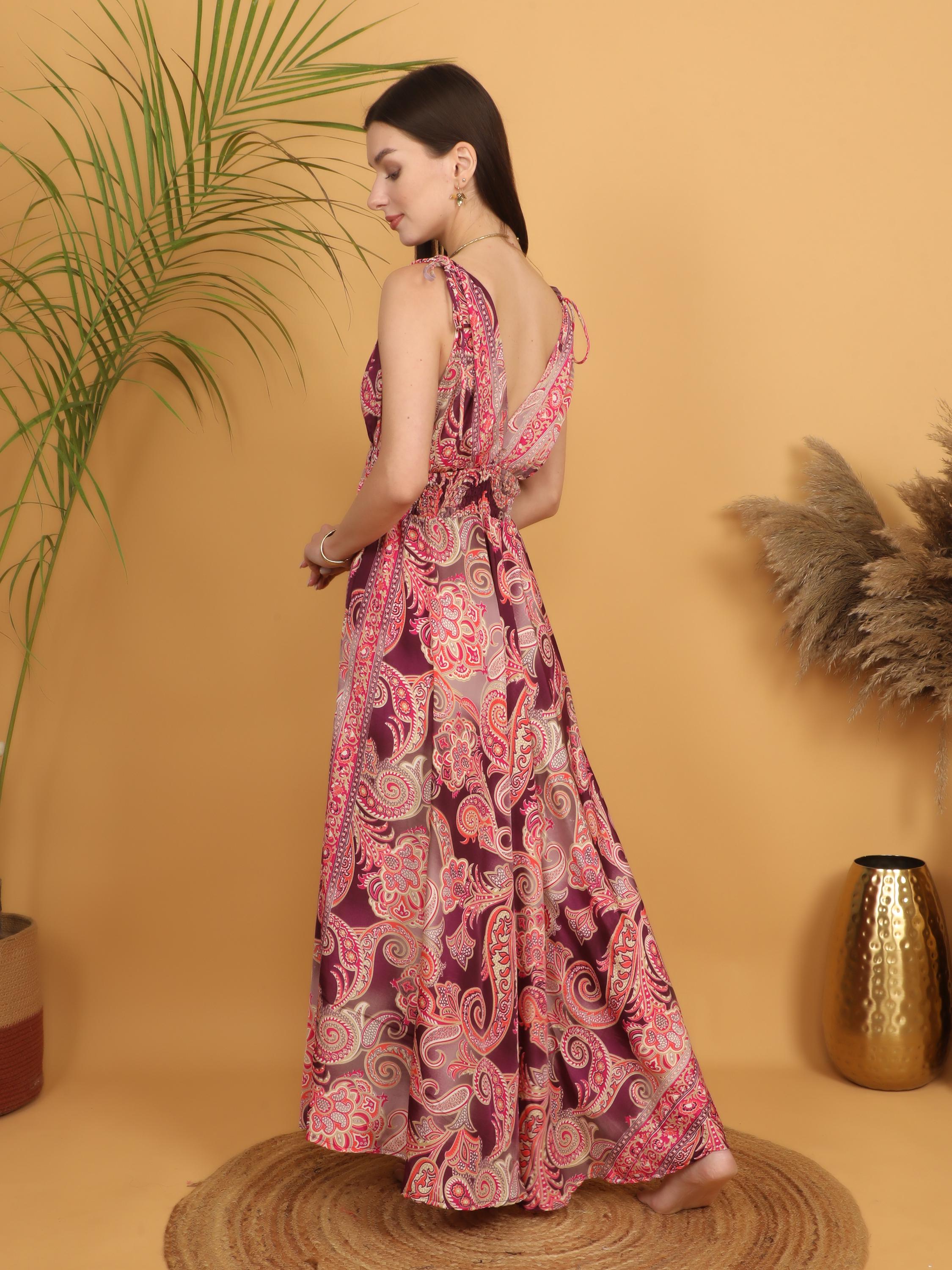 This dress features an intricate paisley pattern inspired by vintage bohemian artistry. The rich burgundy base blends harmoniously with shades of soft pink, coral, and delicate beige tones. The swirling motifs create a mesmerizing visual effect that feels both exotic and timeless.