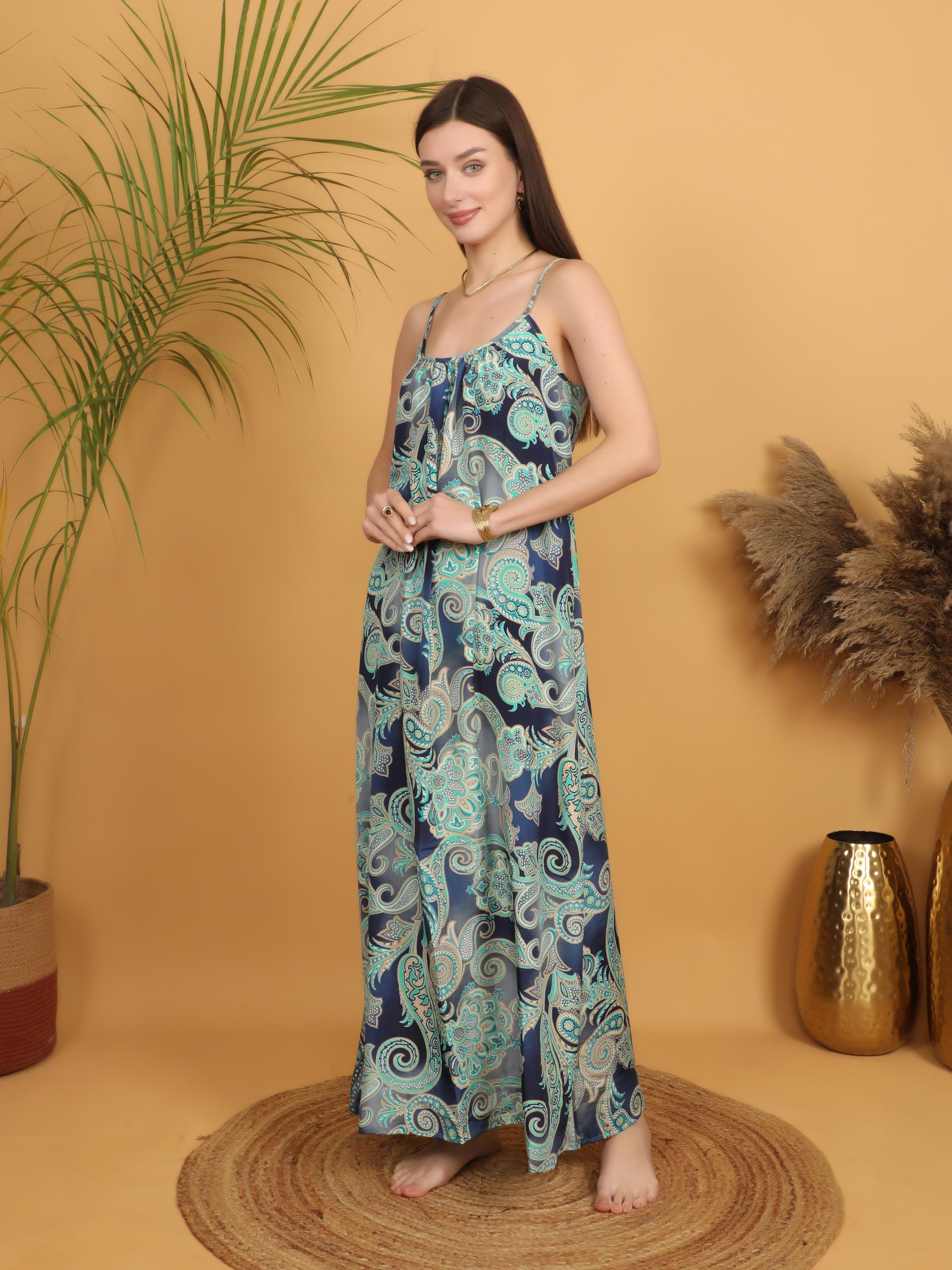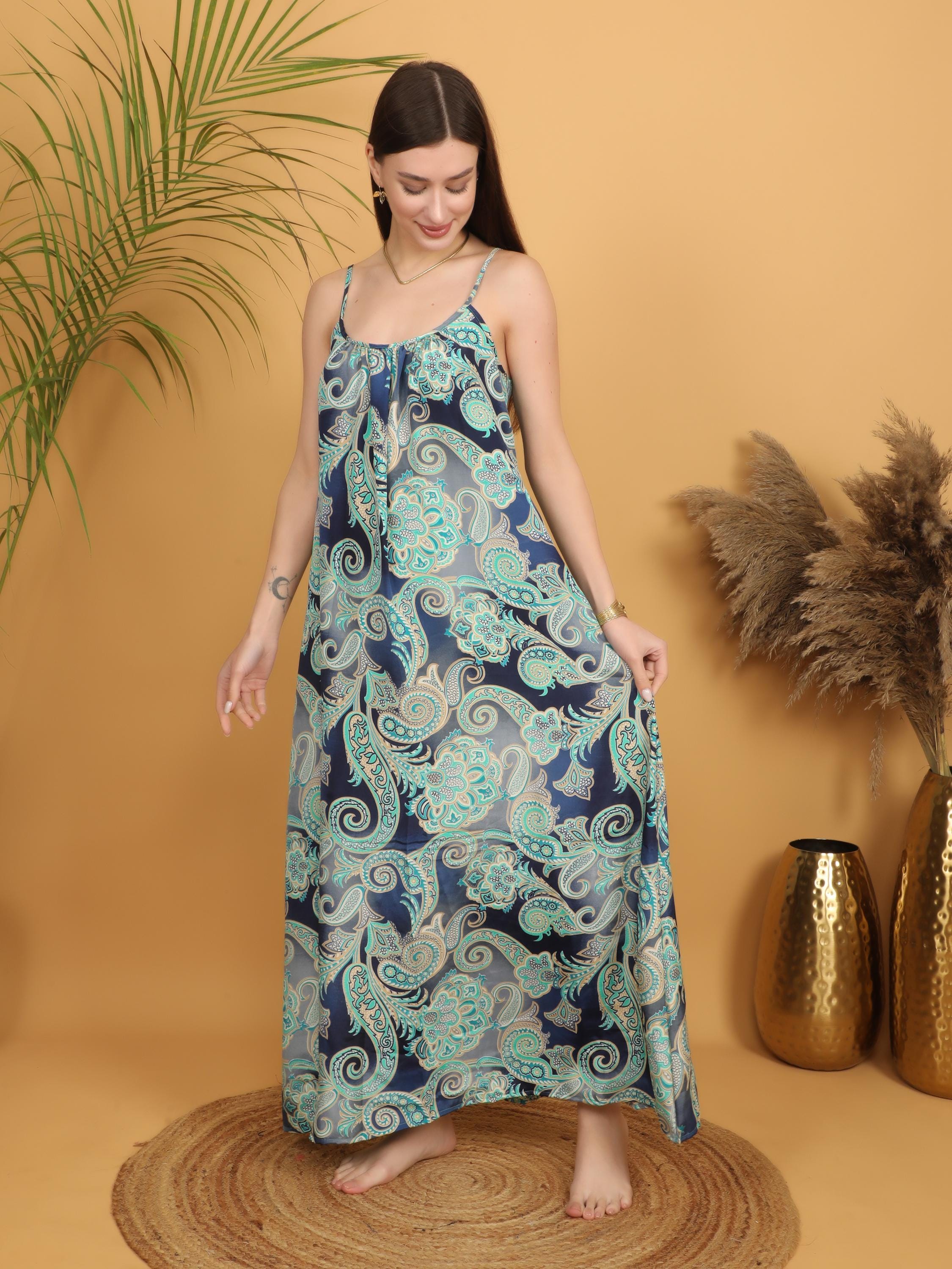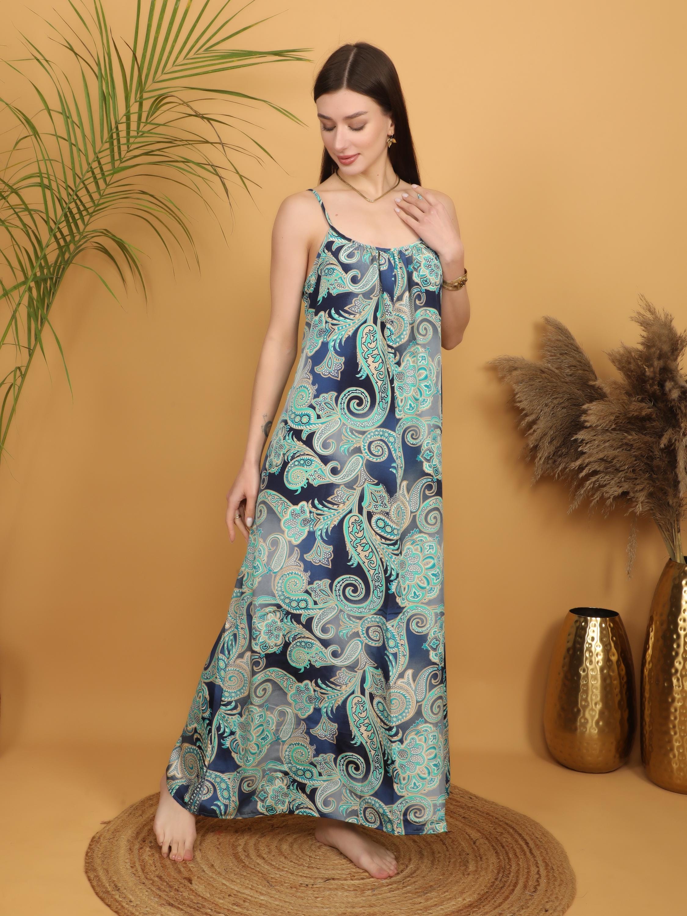 This dress features an intricate paisley print inspired by vintage bohemian patterns. The rich deep green base is enhanced with shades of emerald, turquoise, and soft aqua tones, creating a fresh yet earthy color palette that feels both bold and natural.