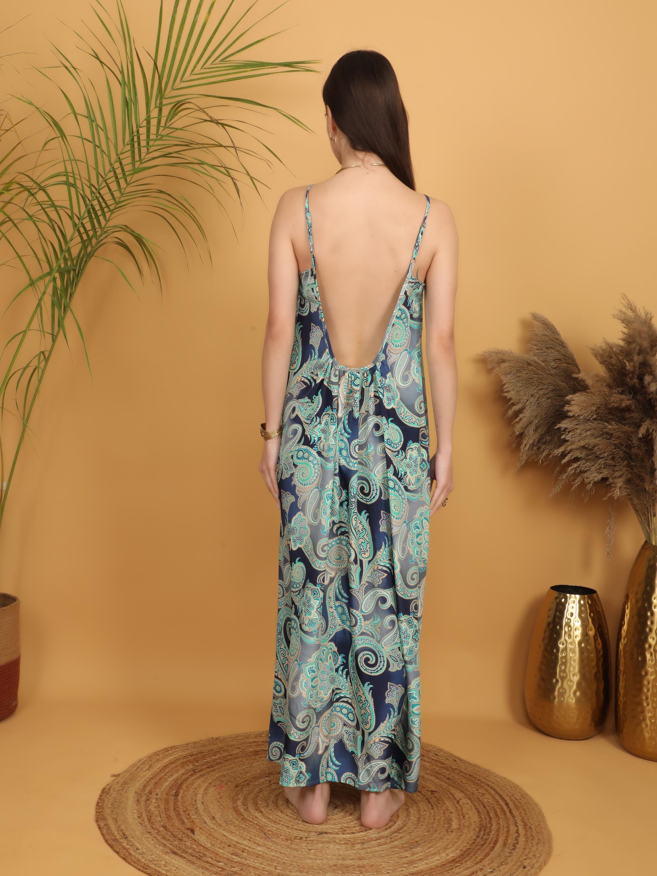 Designed with a relaxed boho silhouette, this maxi dress celebrates freedom, femininity, and effortless style. The delicate thin straps keep the look soft and minimal, while the low back design adds a subtle sensuality and elegance.