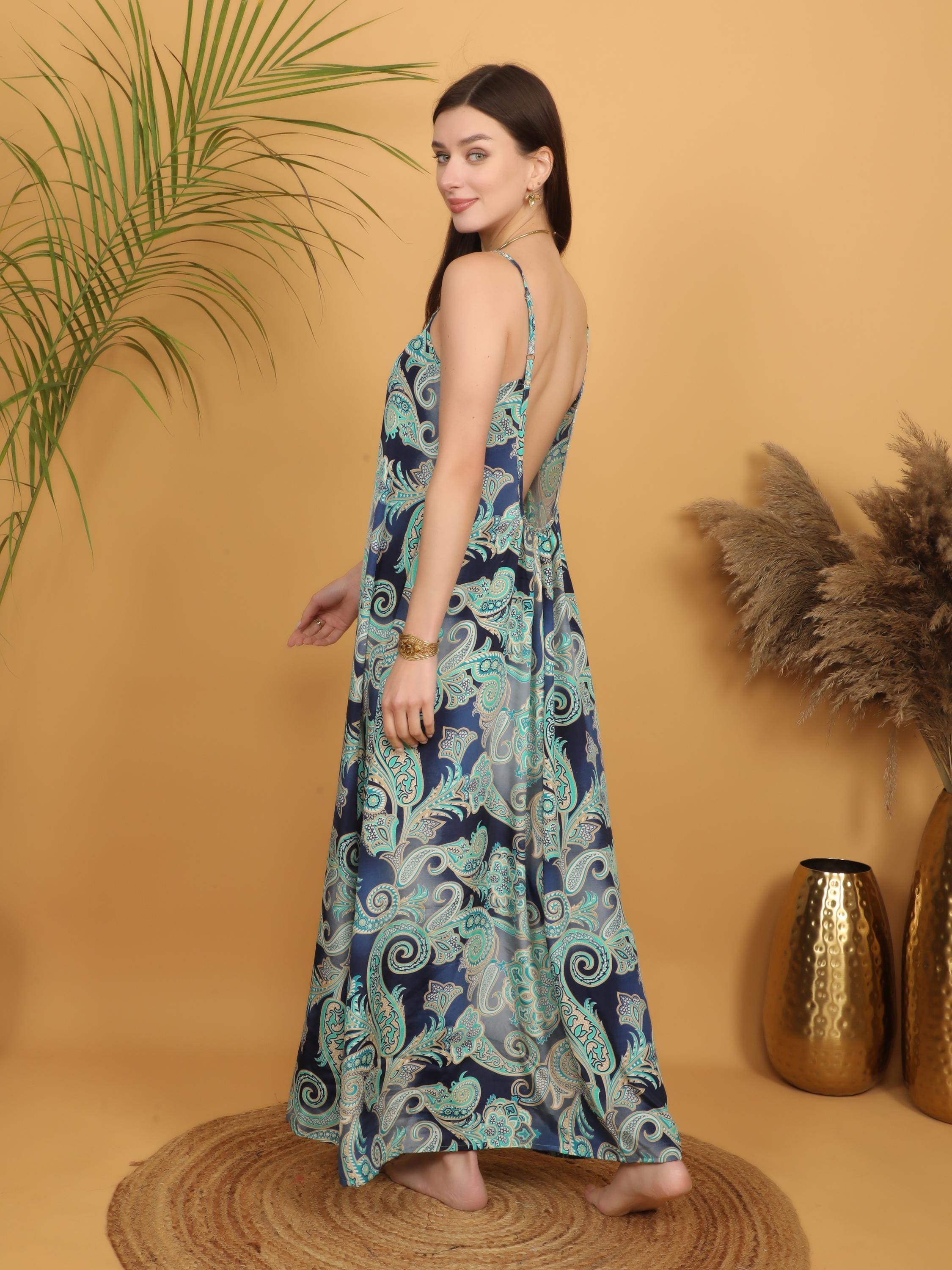 Step into effortless elegance with this stunning boho backless maxi dress, designed for free-spirited souls who love flowing silhouettes and artistic prints. Crafted from soft silk-like polyester, this dress offers the smooth touch and luxurious drape of silk while remaining lightweight, breathable, and easy to care for.