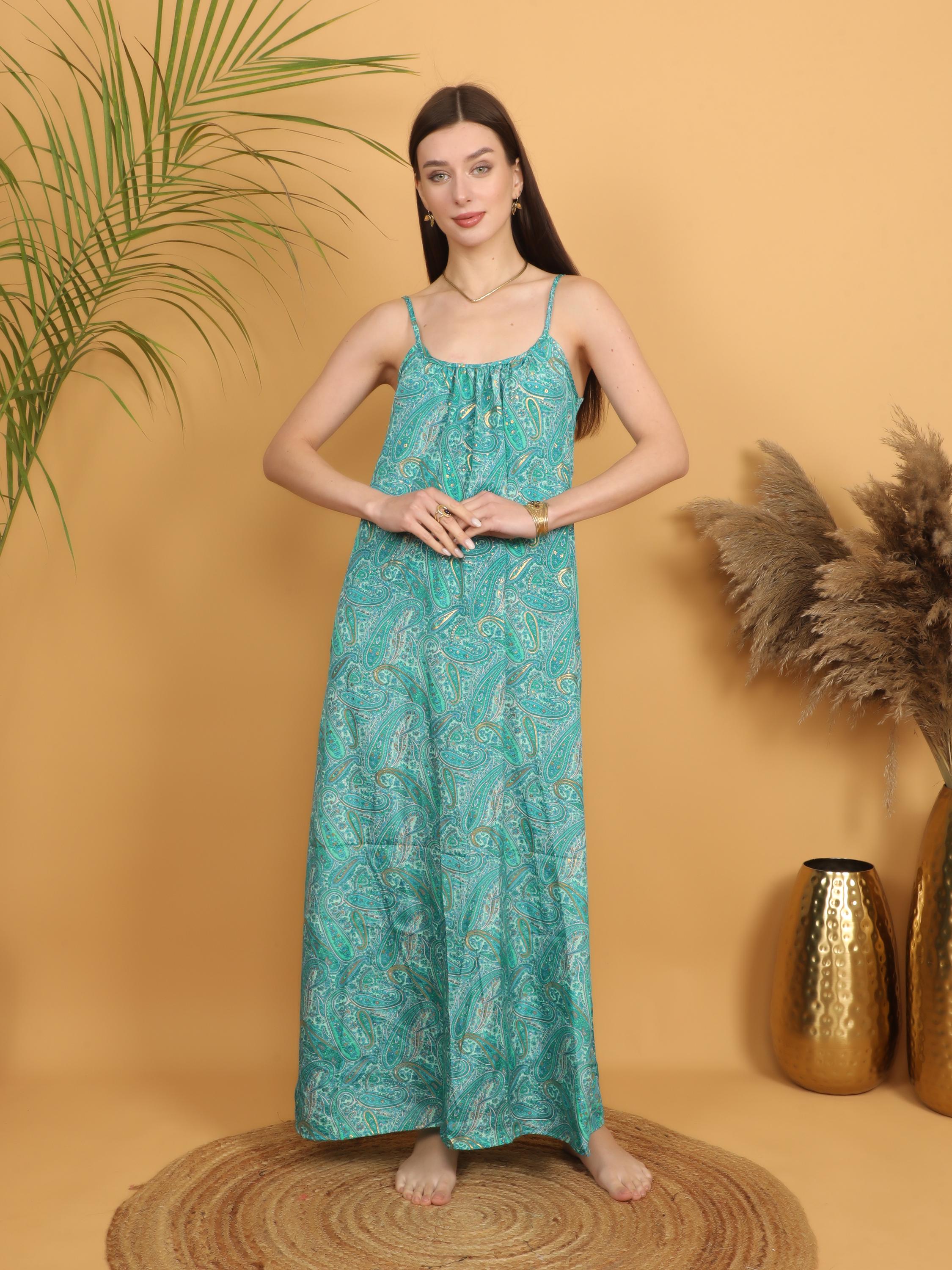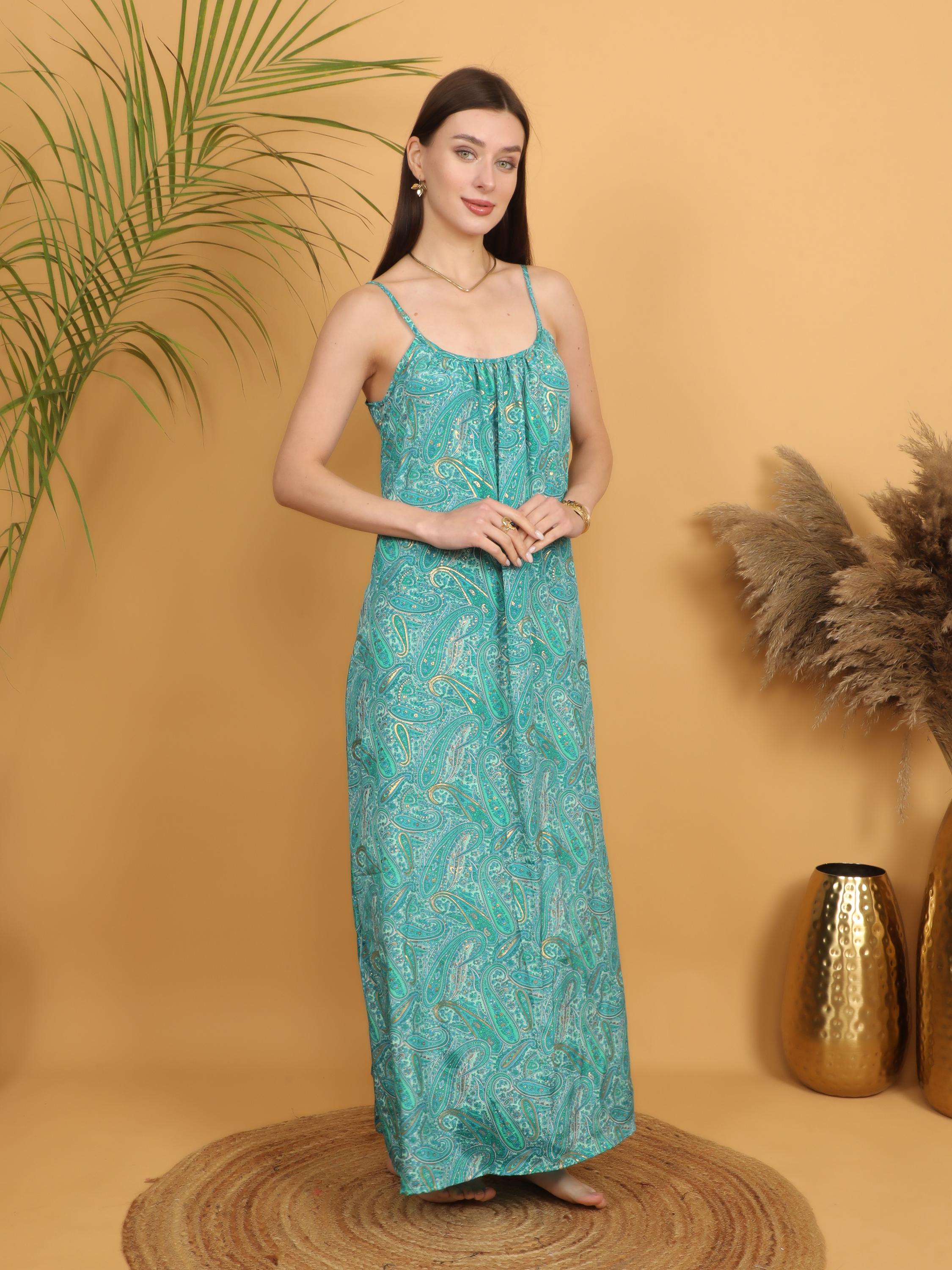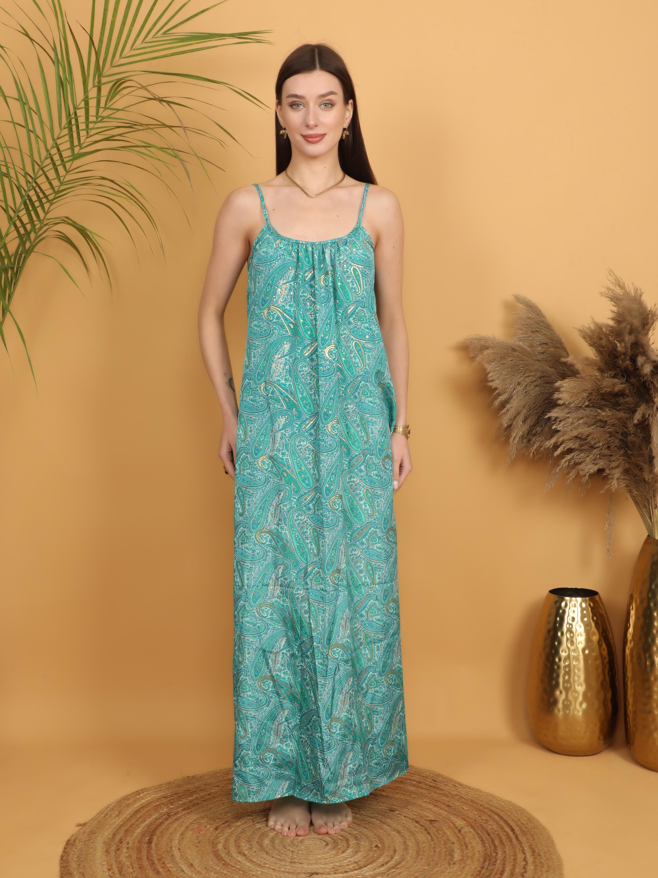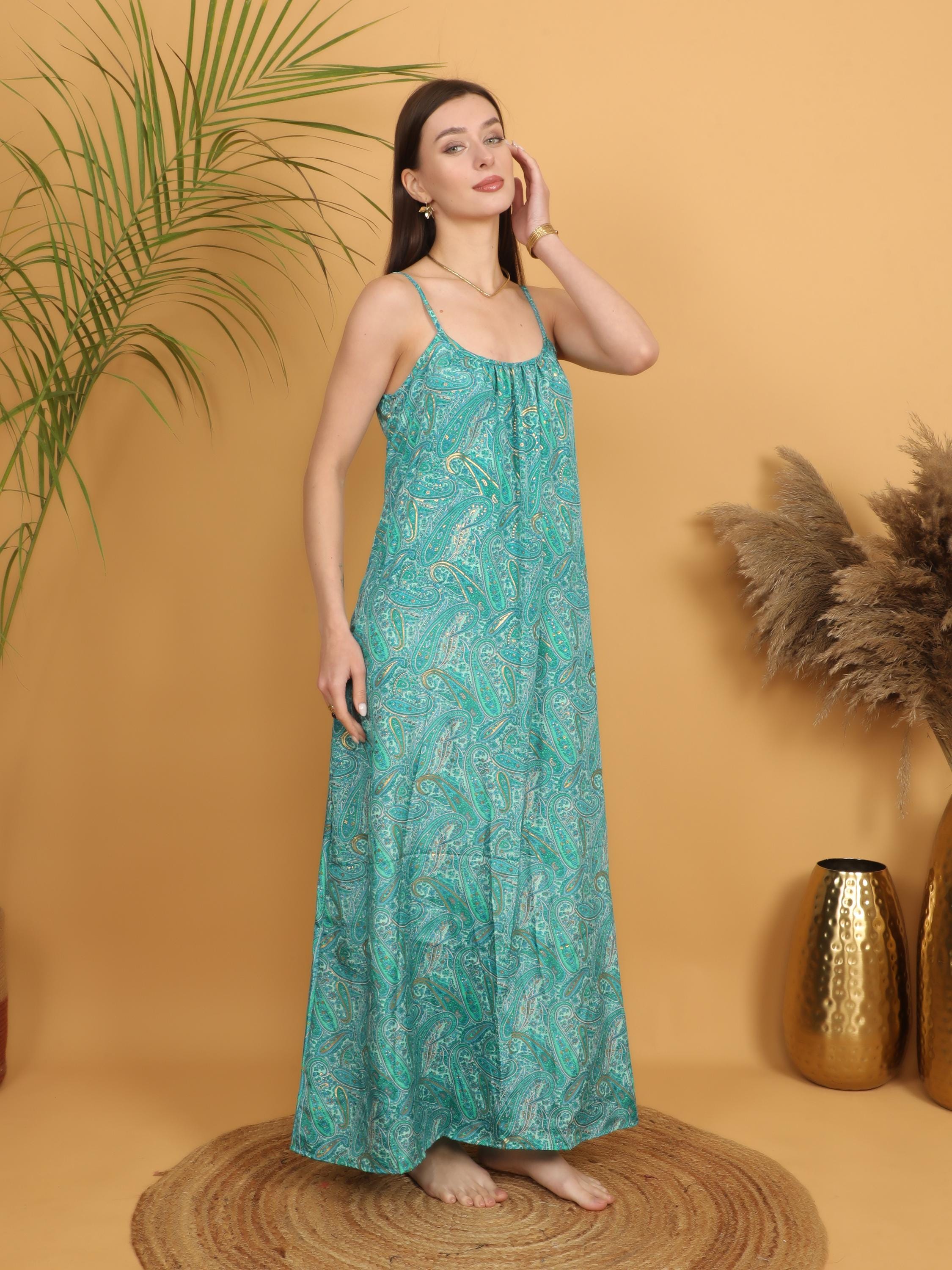 Embrace effortless bohemian elegance with this stunning turquoise paisley maxi dress, designed for free spirits and sun lovers. Featuring a mesmerizing boho-inspired paisley print in vibrant shades of turquoise, soft green, and subtle gold tones, this dress radiates warmth and wanderlust energy.