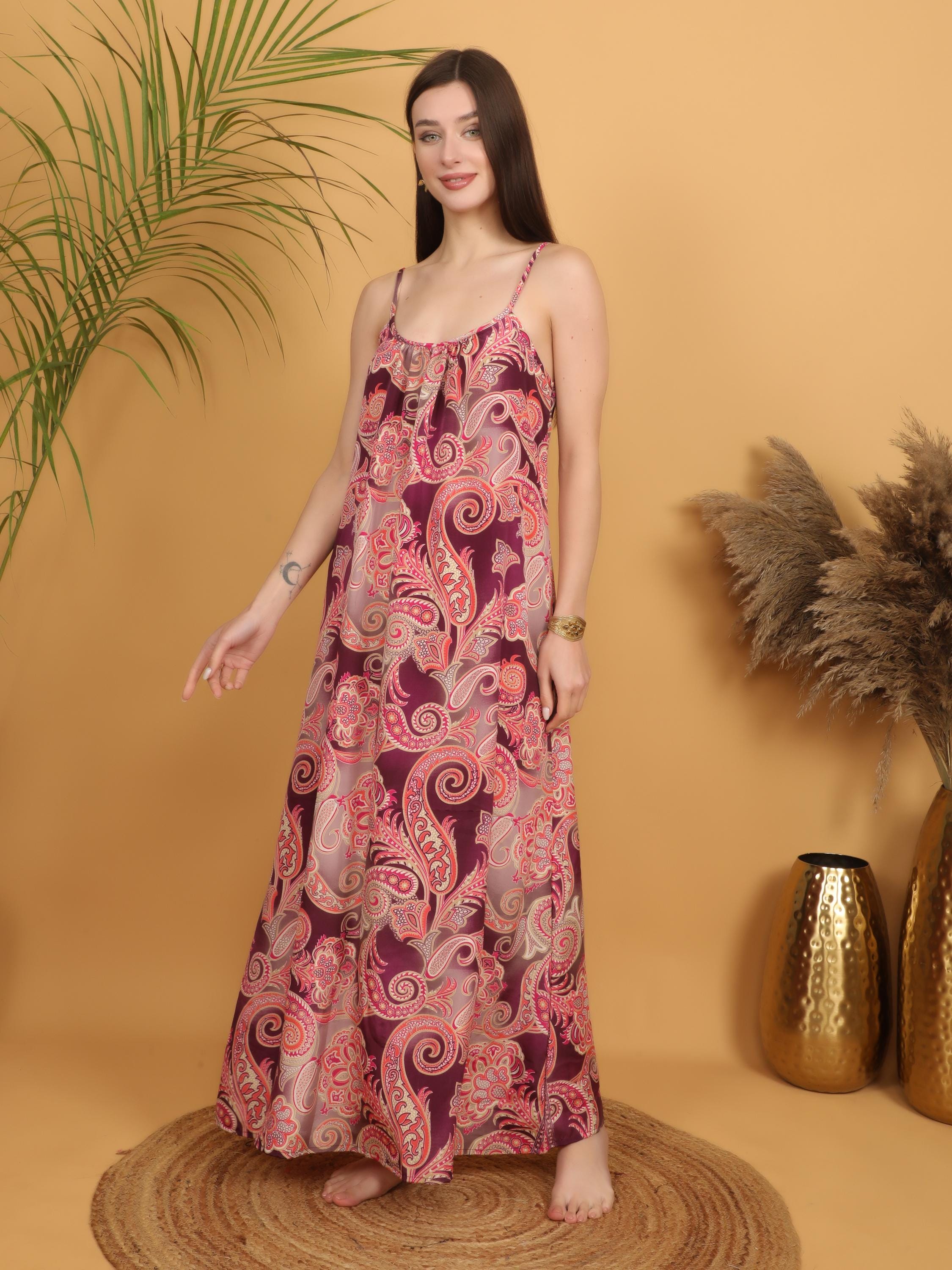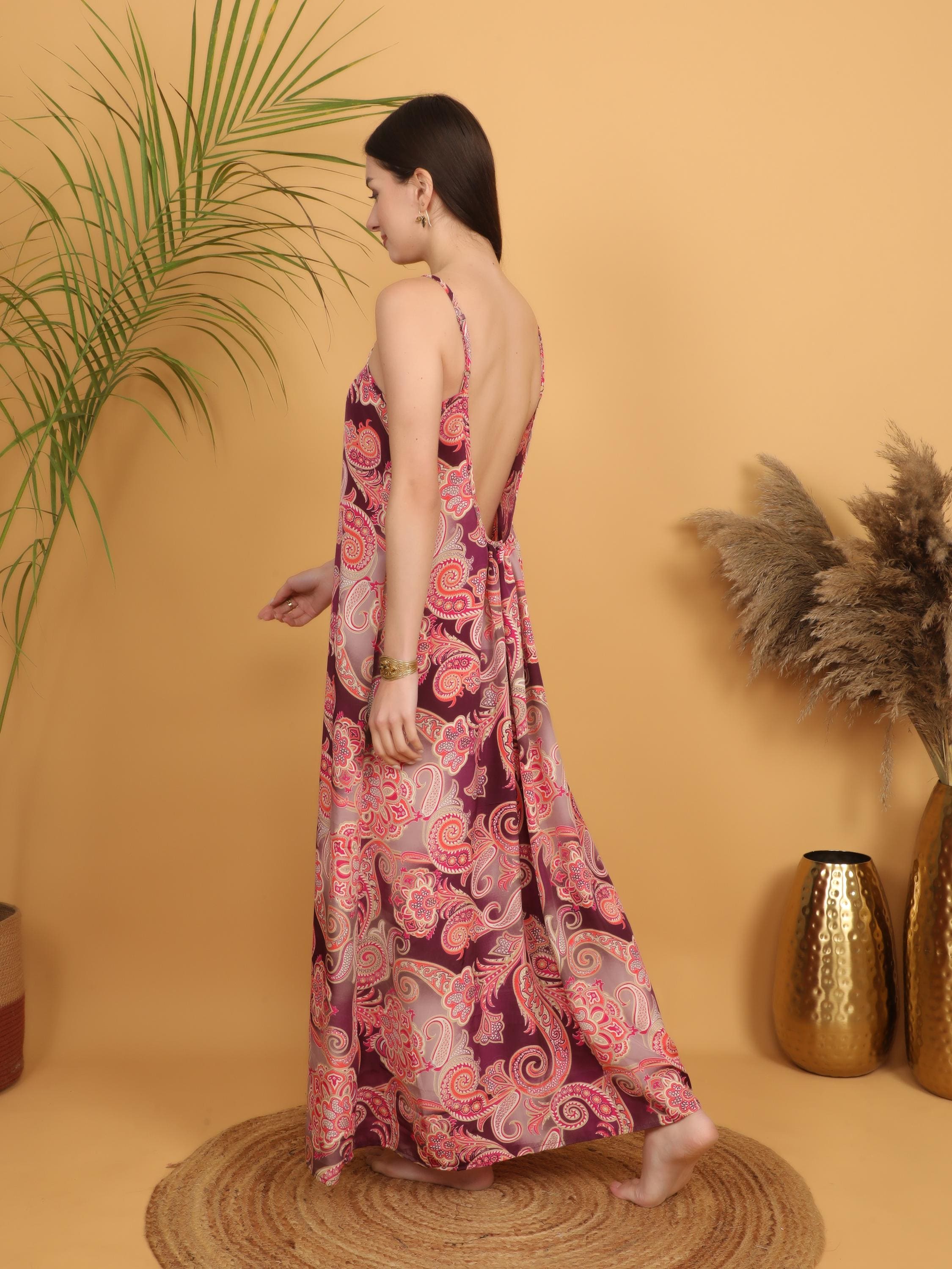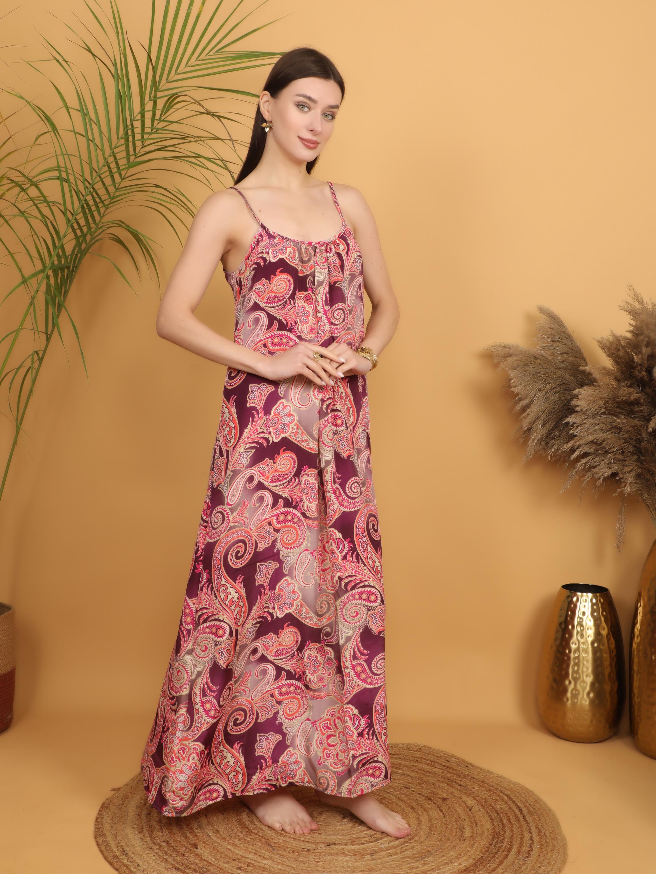 This version of our signature boho silhouette features a rich burgundy base enhanced by intricate pink, coral and soft beige paisley patterns, creating a warm, romantic and vintage-inspired aesthetic. The detailed swirling print gives the dress depth, movement and that unmistakable bohemian charm.