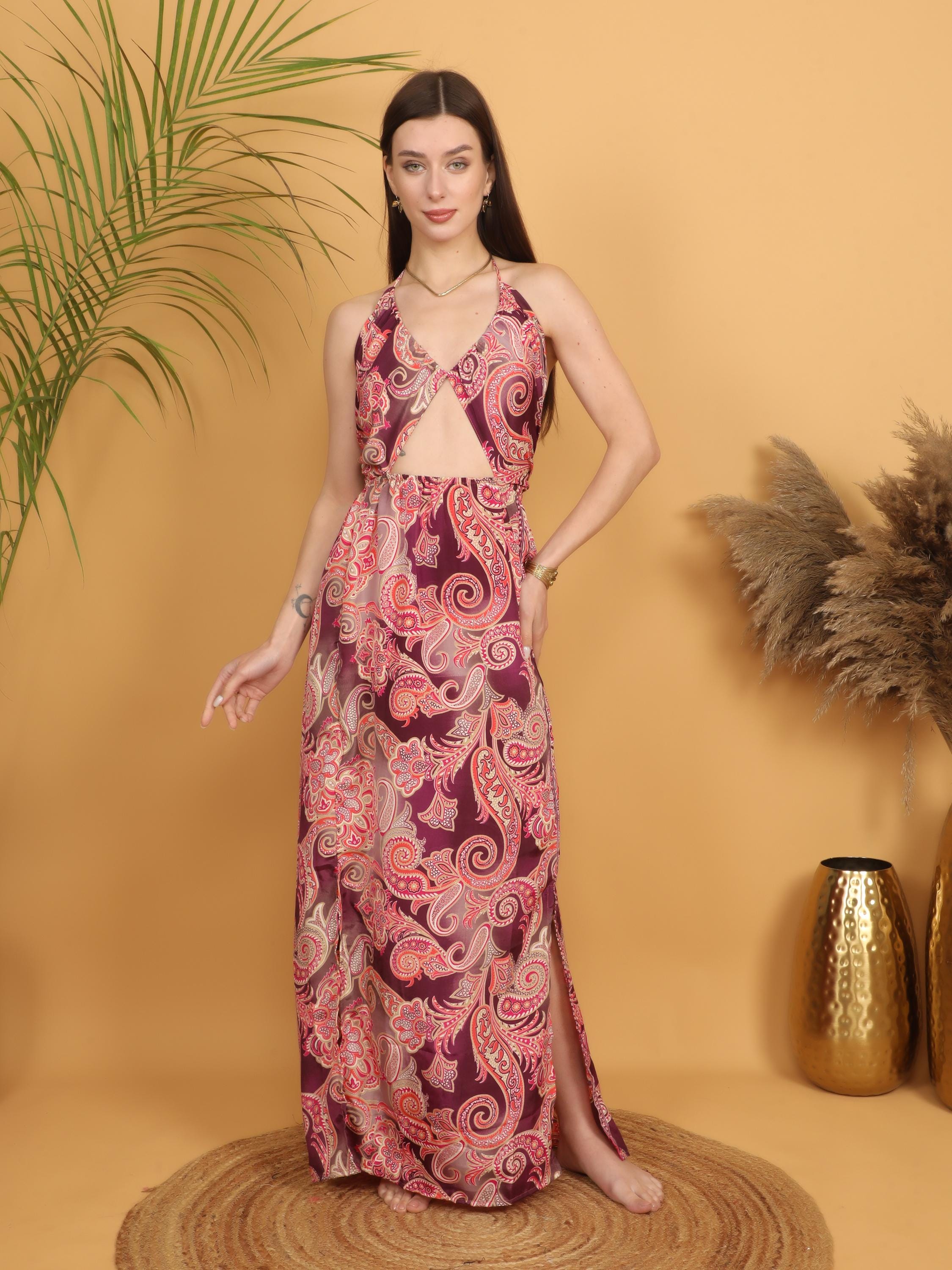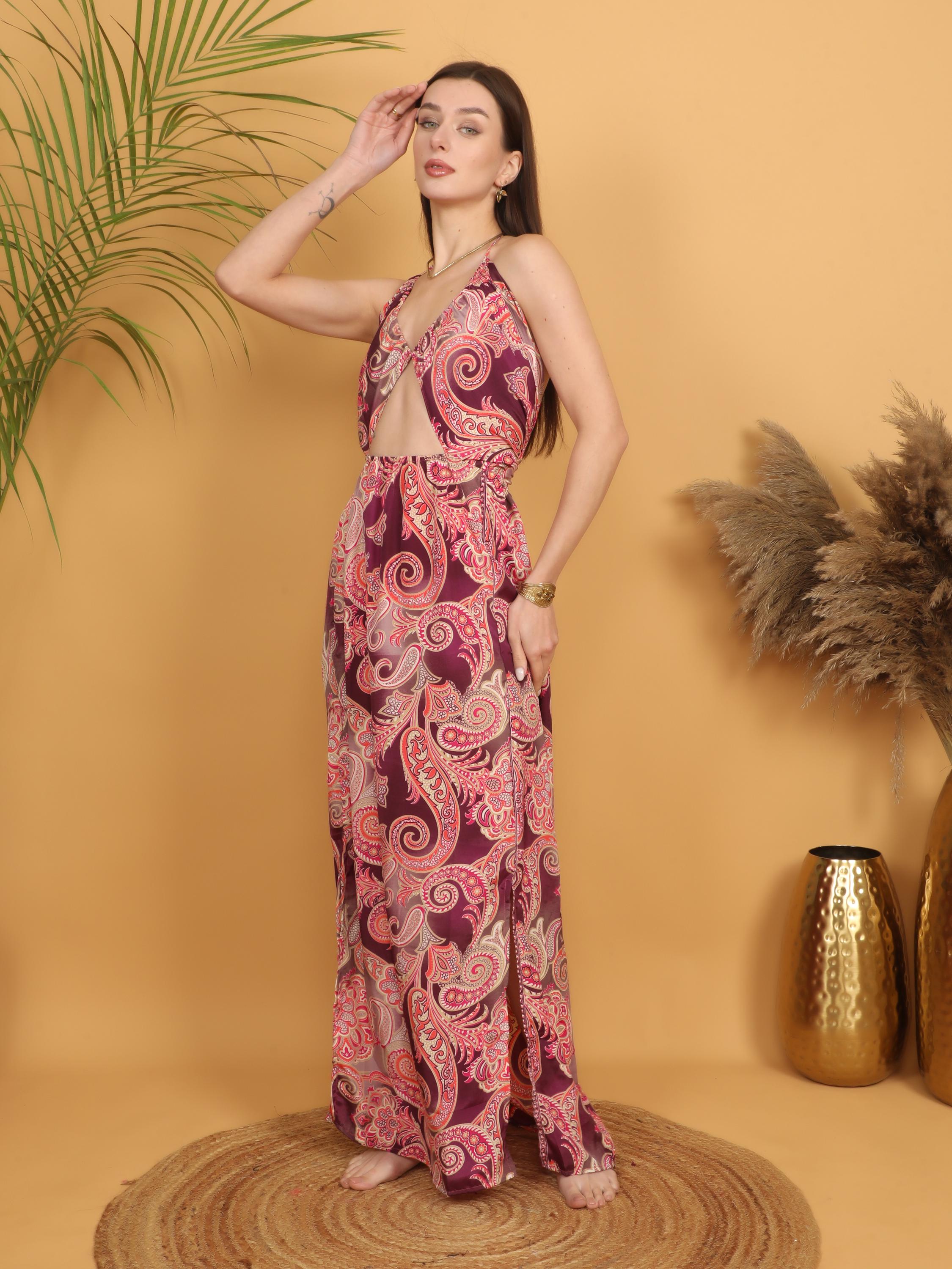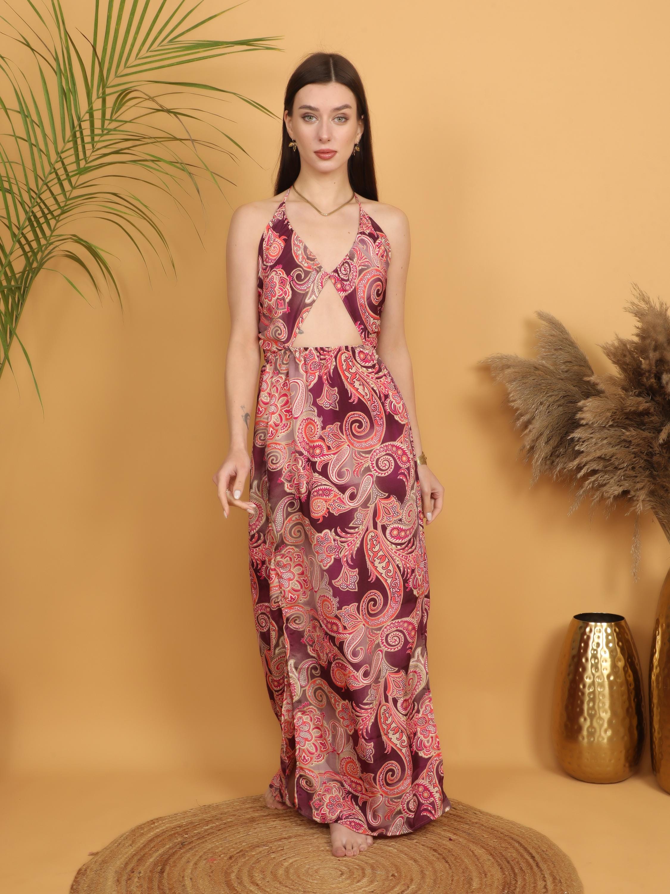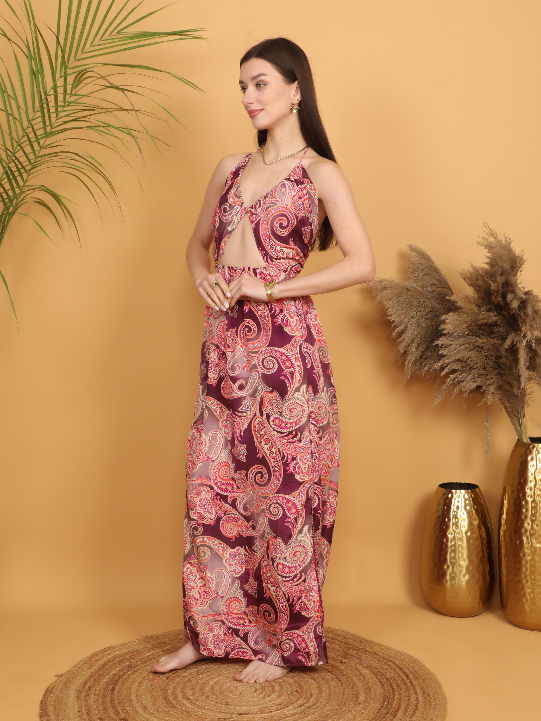 Step into effortless bohemian elegance with this burgundy paisley maxi dress, designed to celebrate feminine curves and free-spirited style.