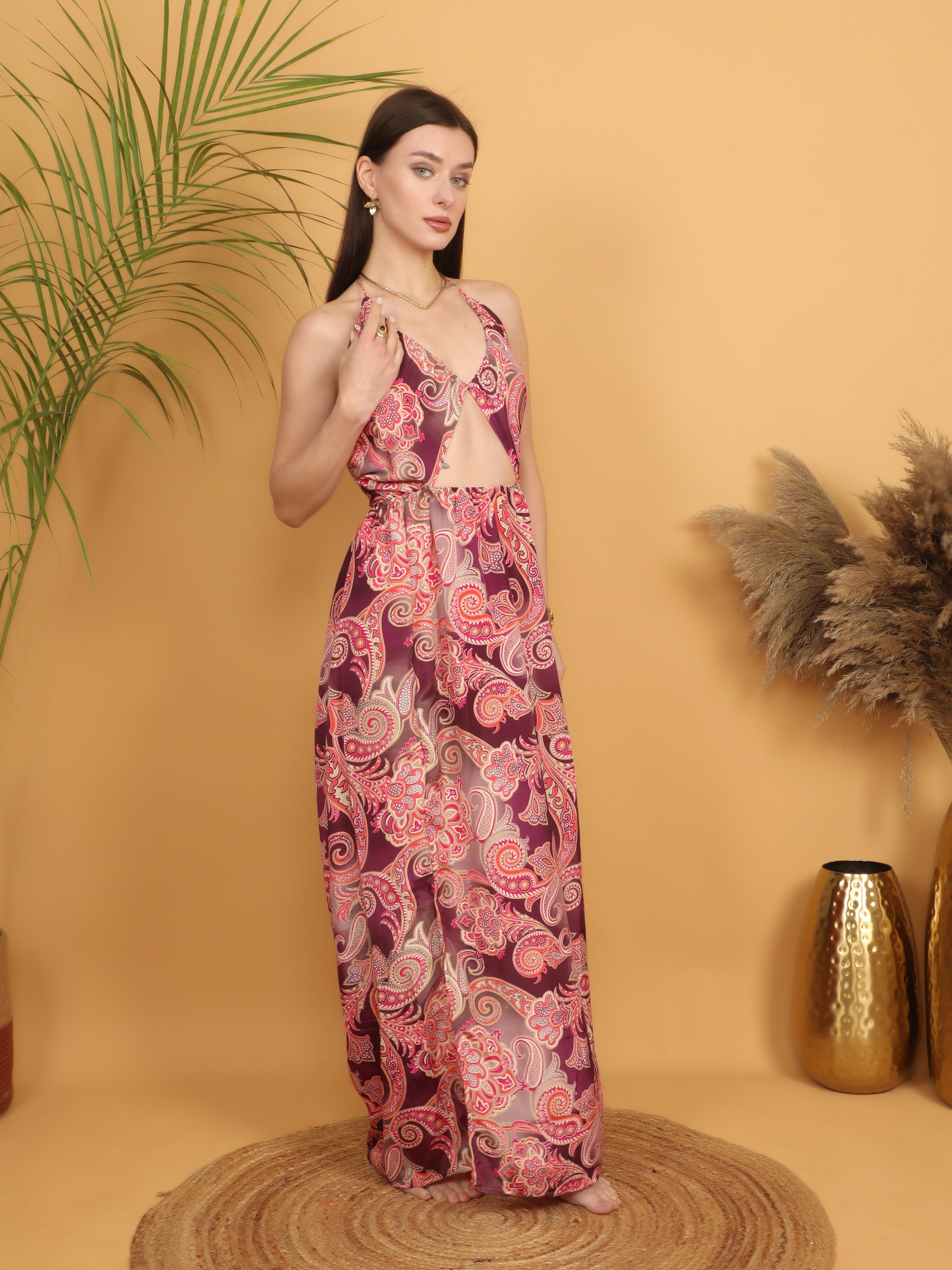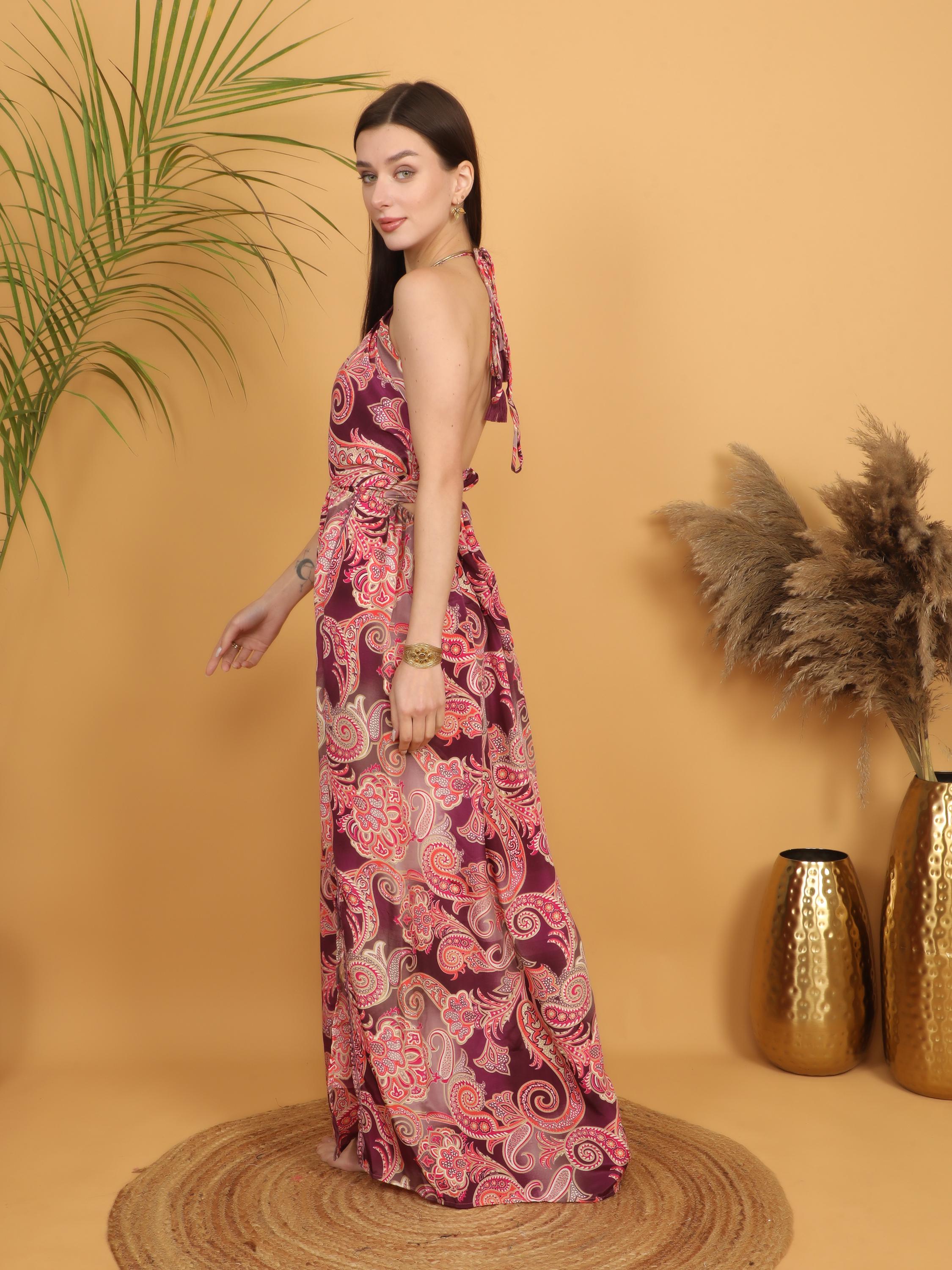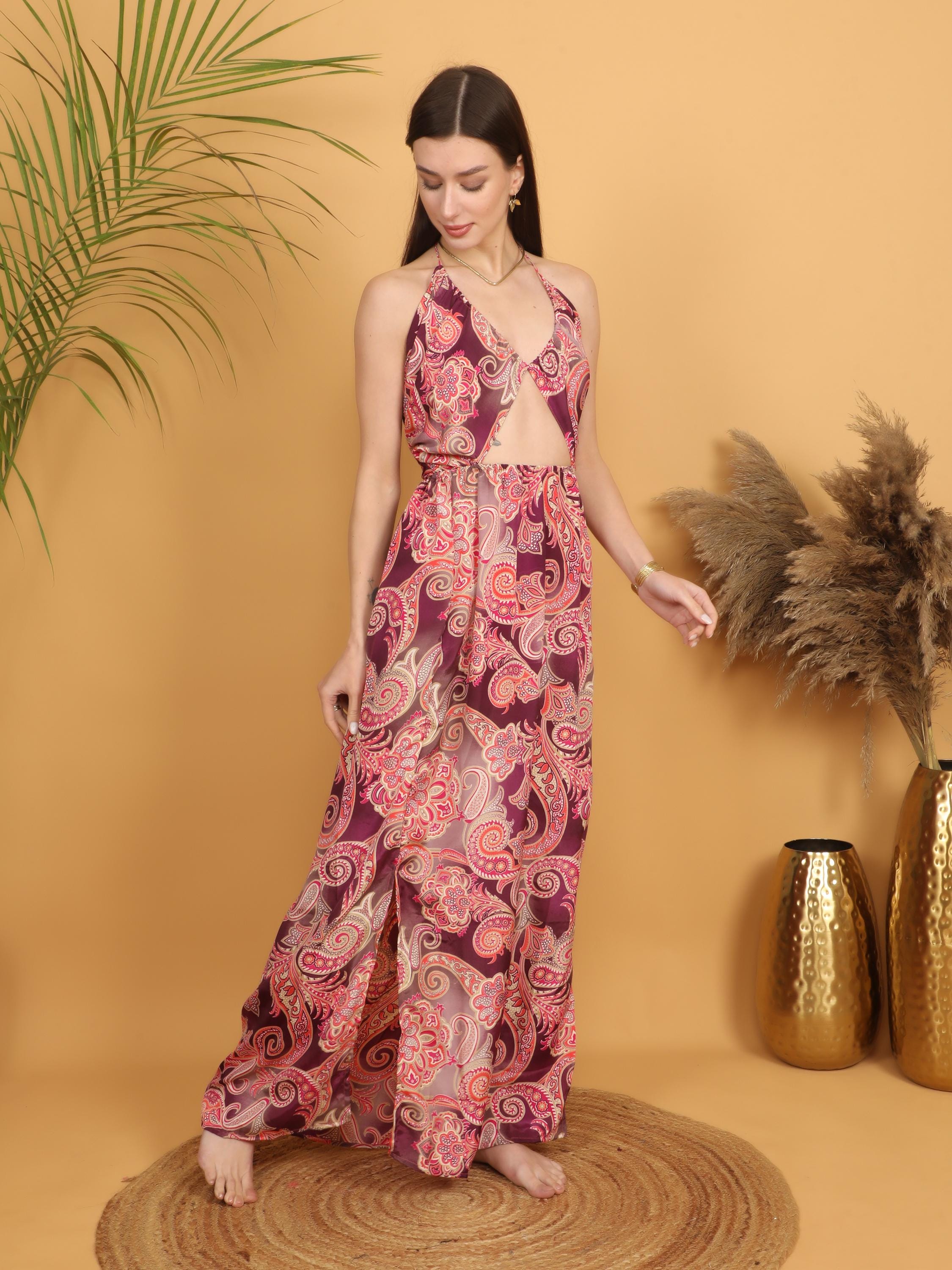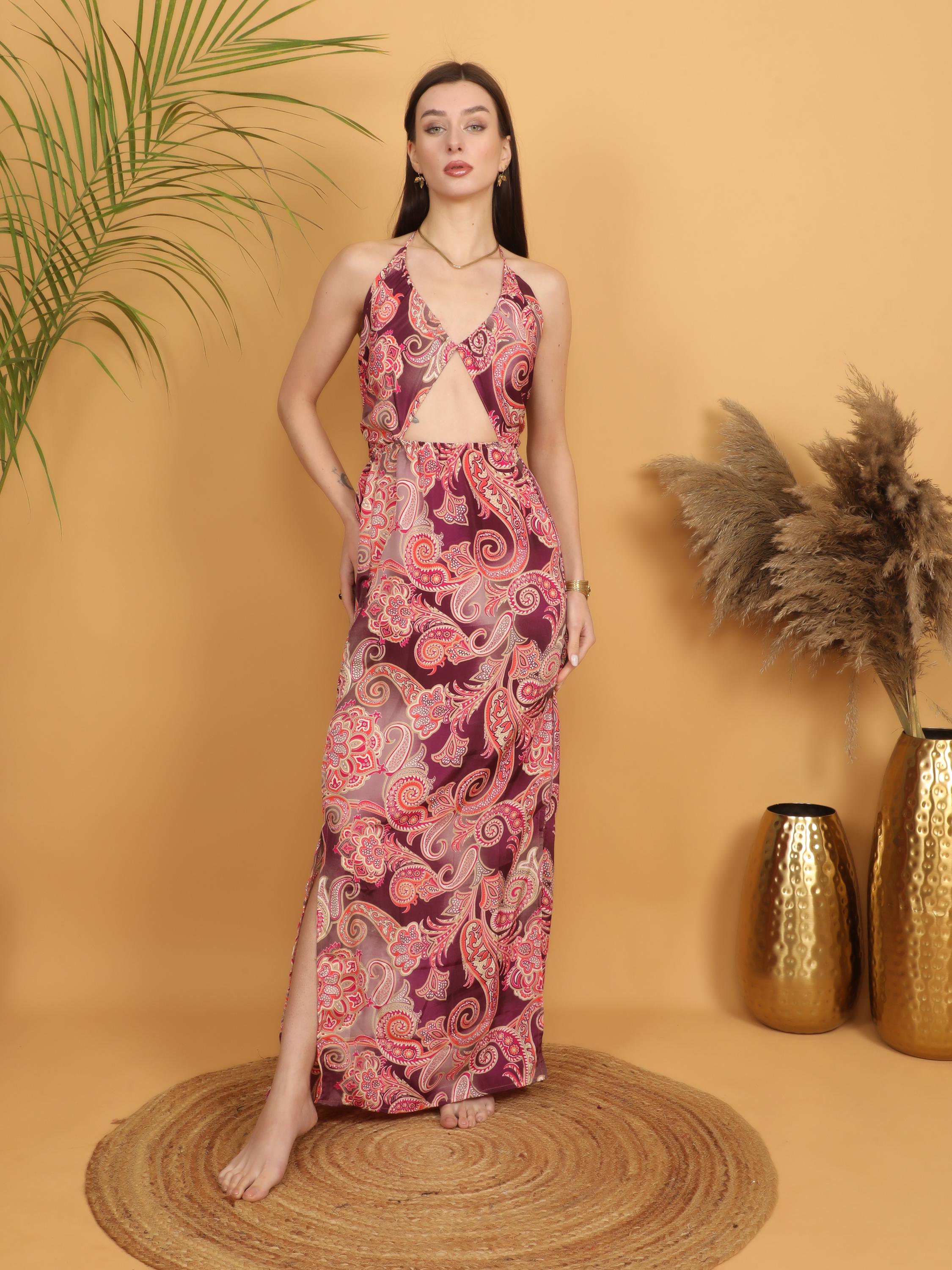Step into effortless bohemian elegance with this burgundy paisley maxi dress, designed to celebrate feminine curves and free-spirited style.
