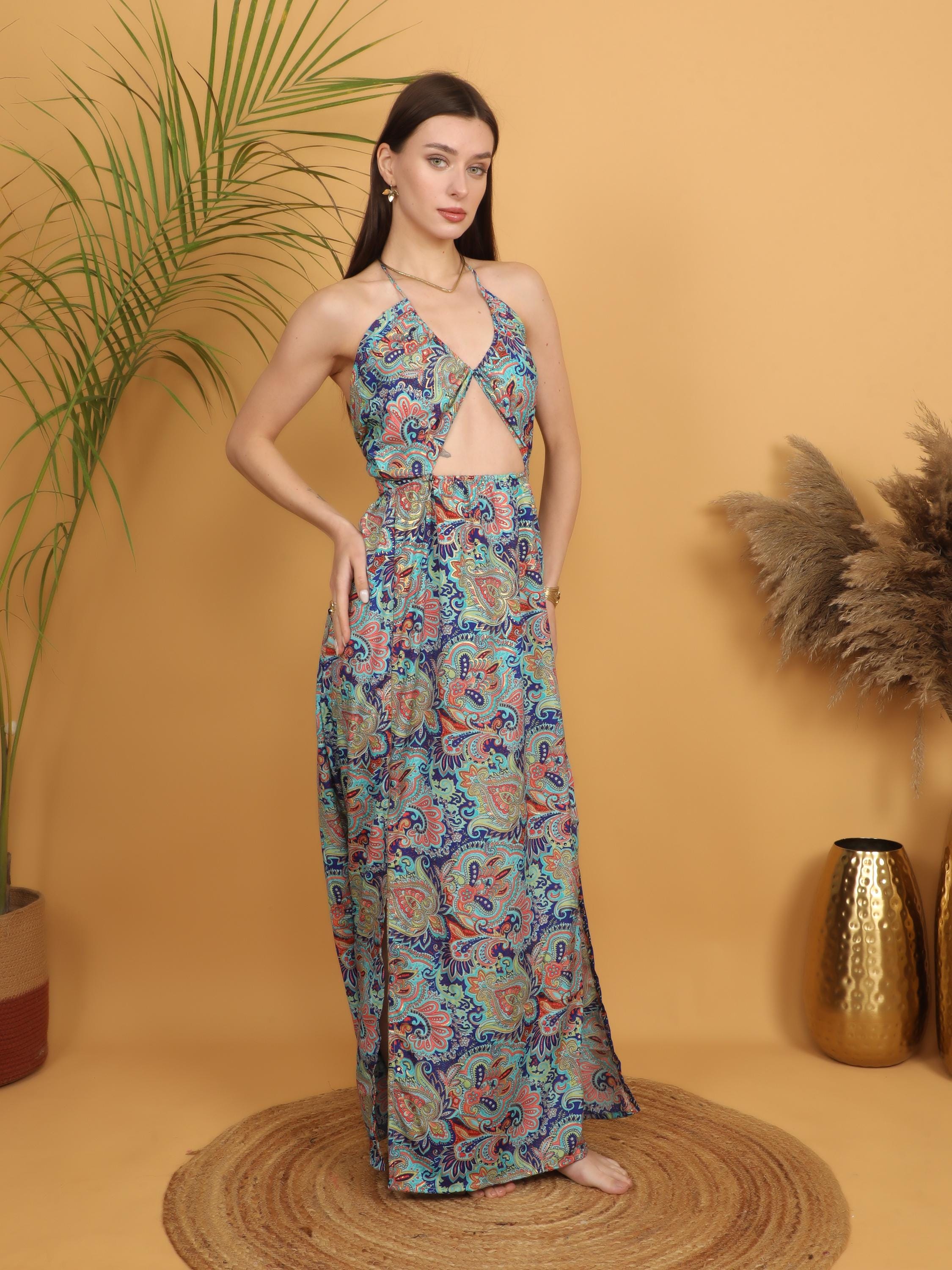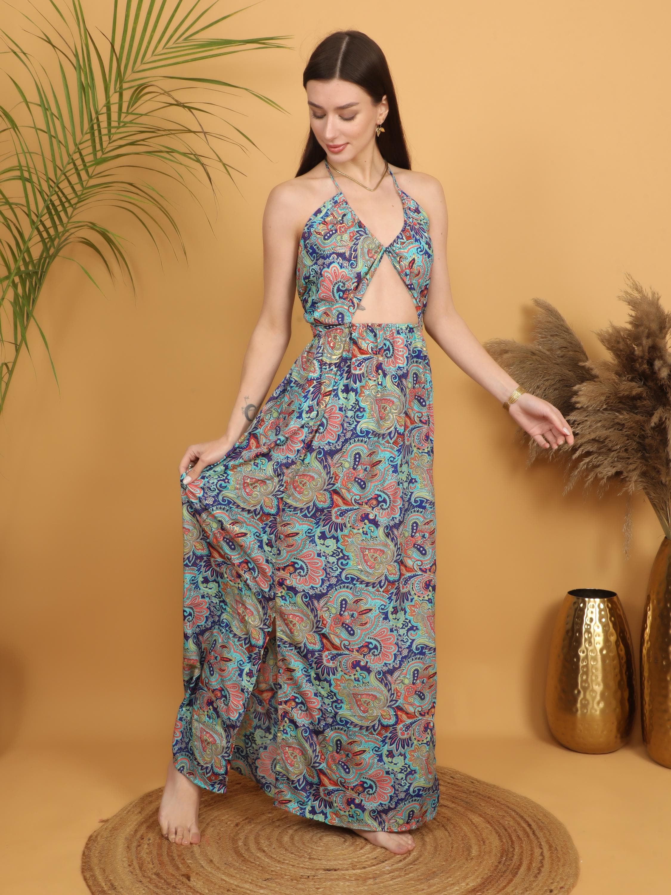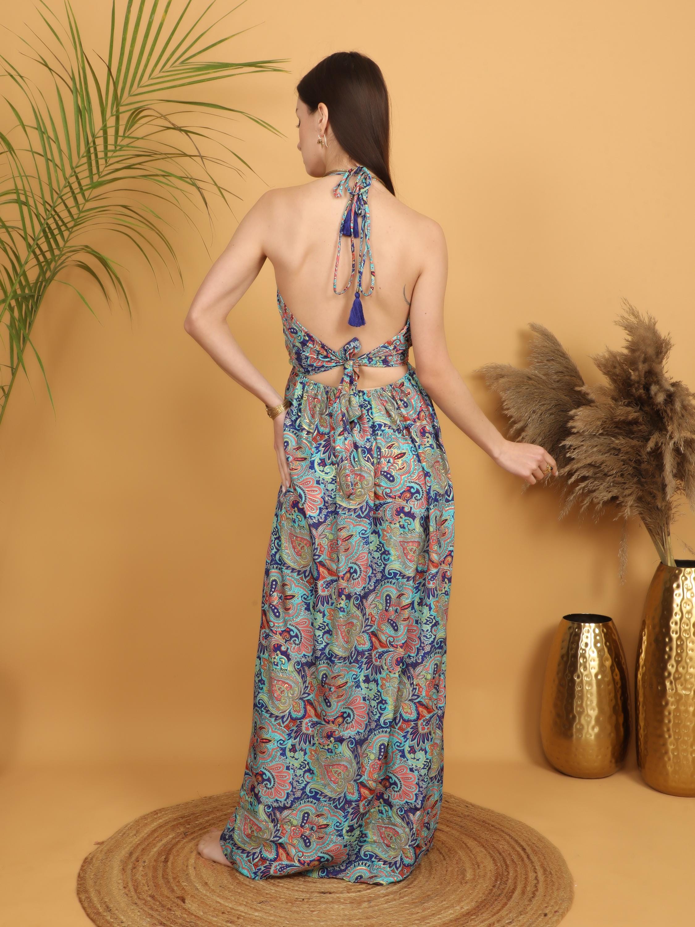 Make a bold bohemian statement with this stunning teal blue paisley maxi dress, designed for women who love vibrant colors and effortless silhouettes.