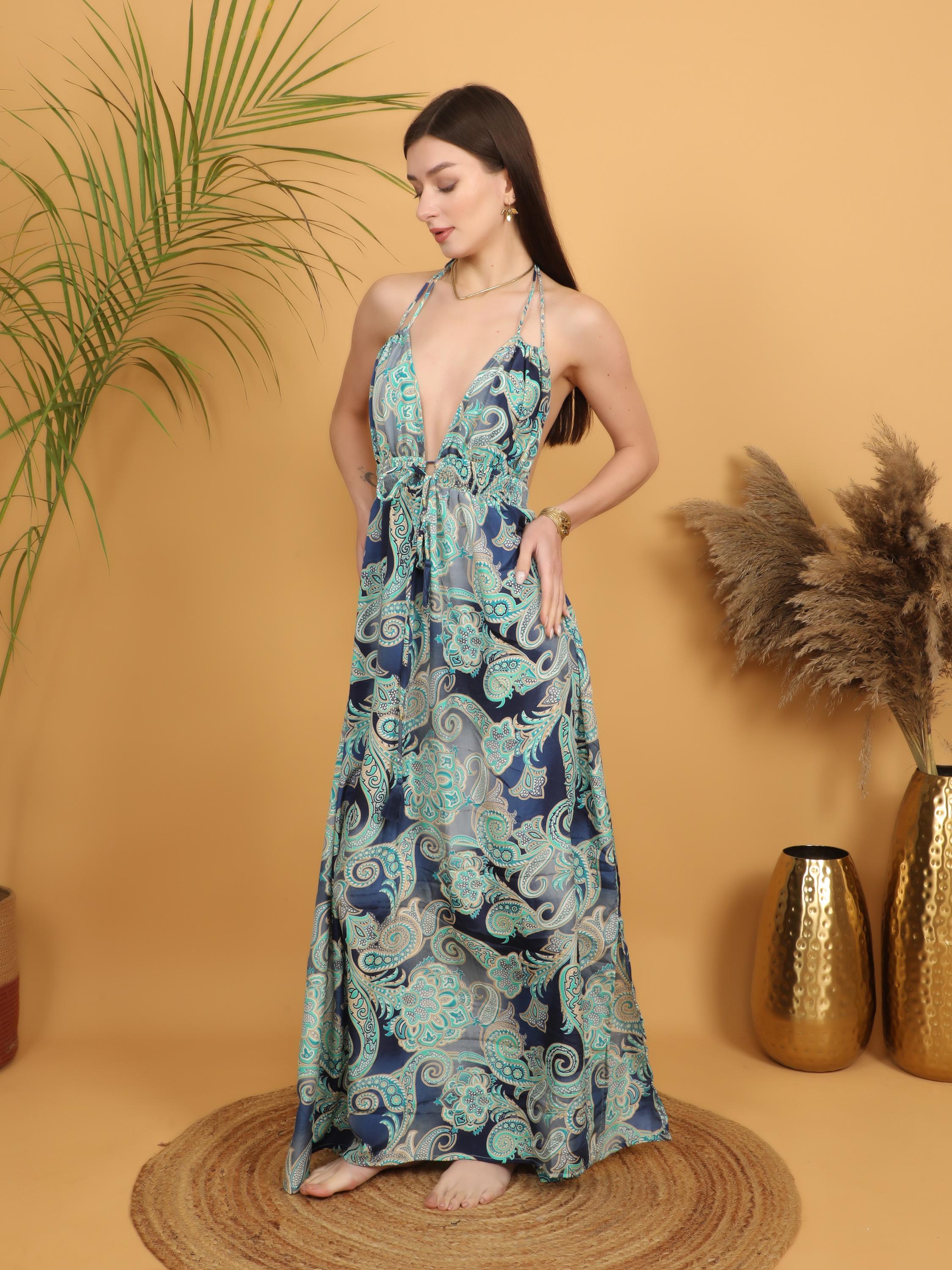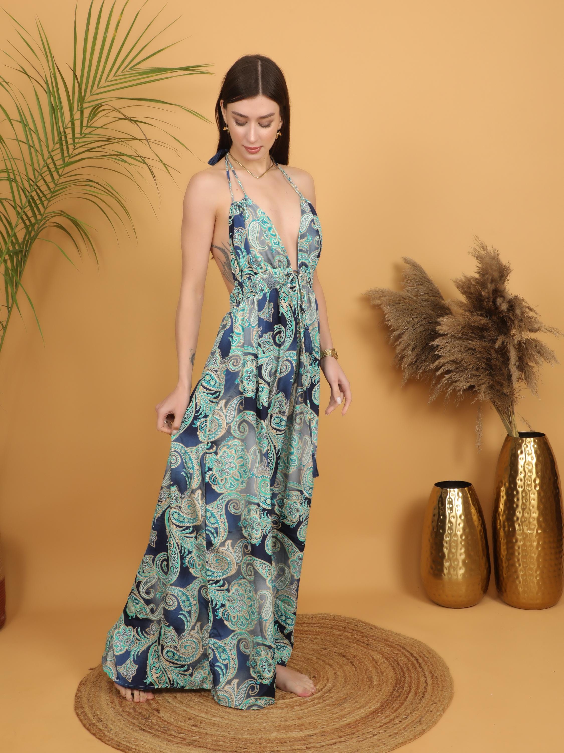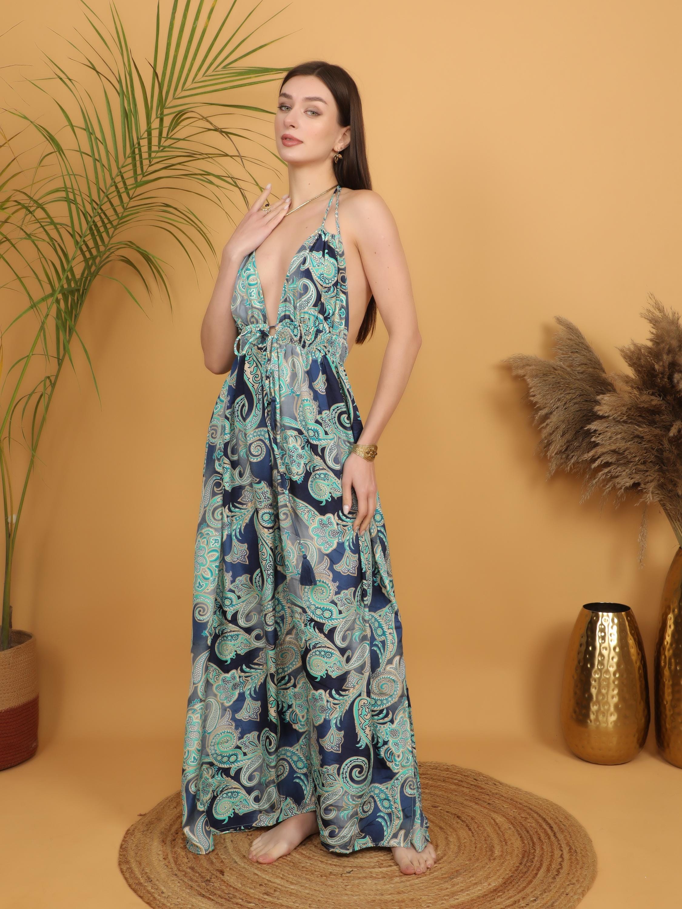 -Dramatic deep V neckline that elongates the silhouette, Striking low open back for a sensual yet effortless boho look.