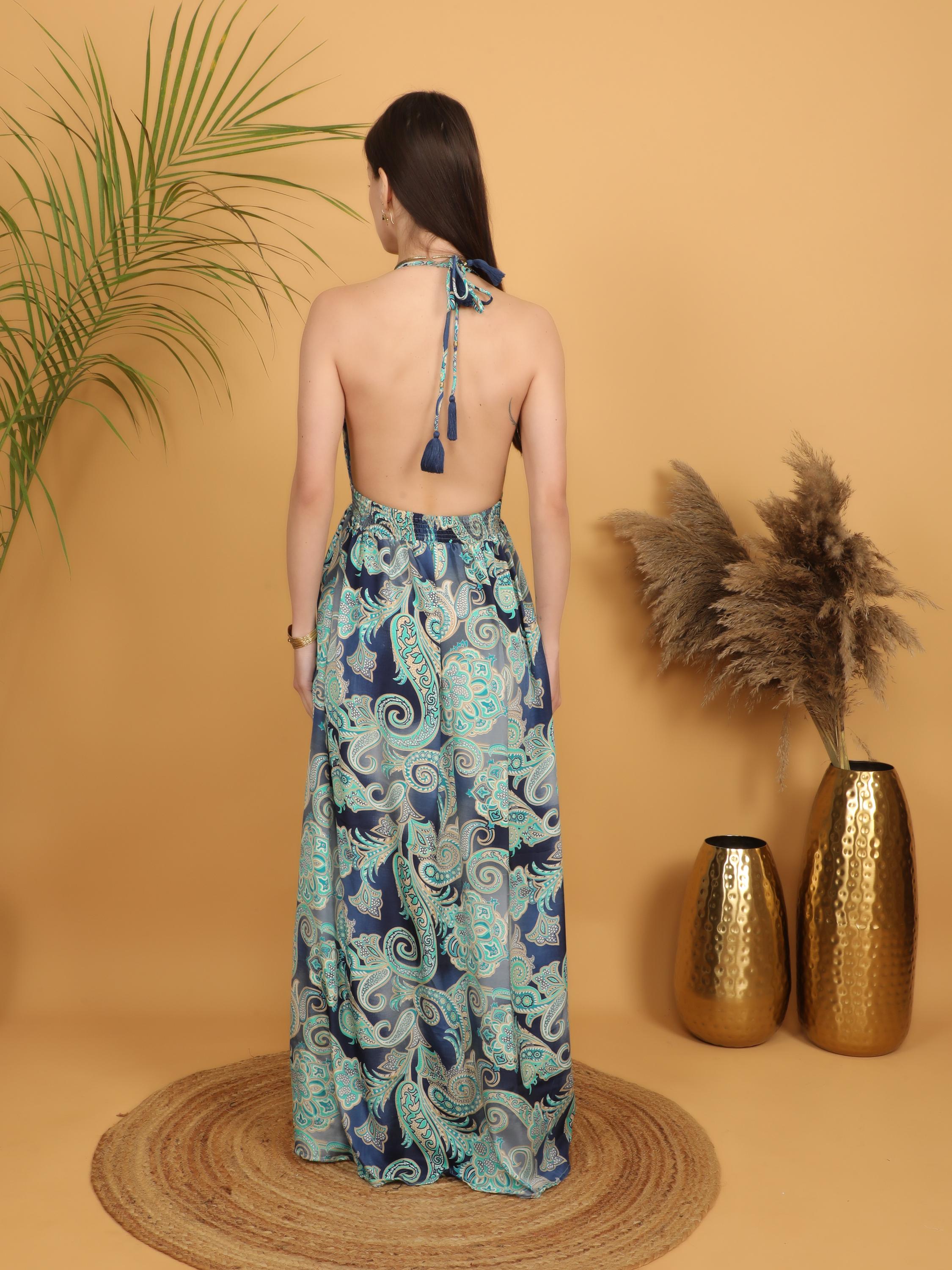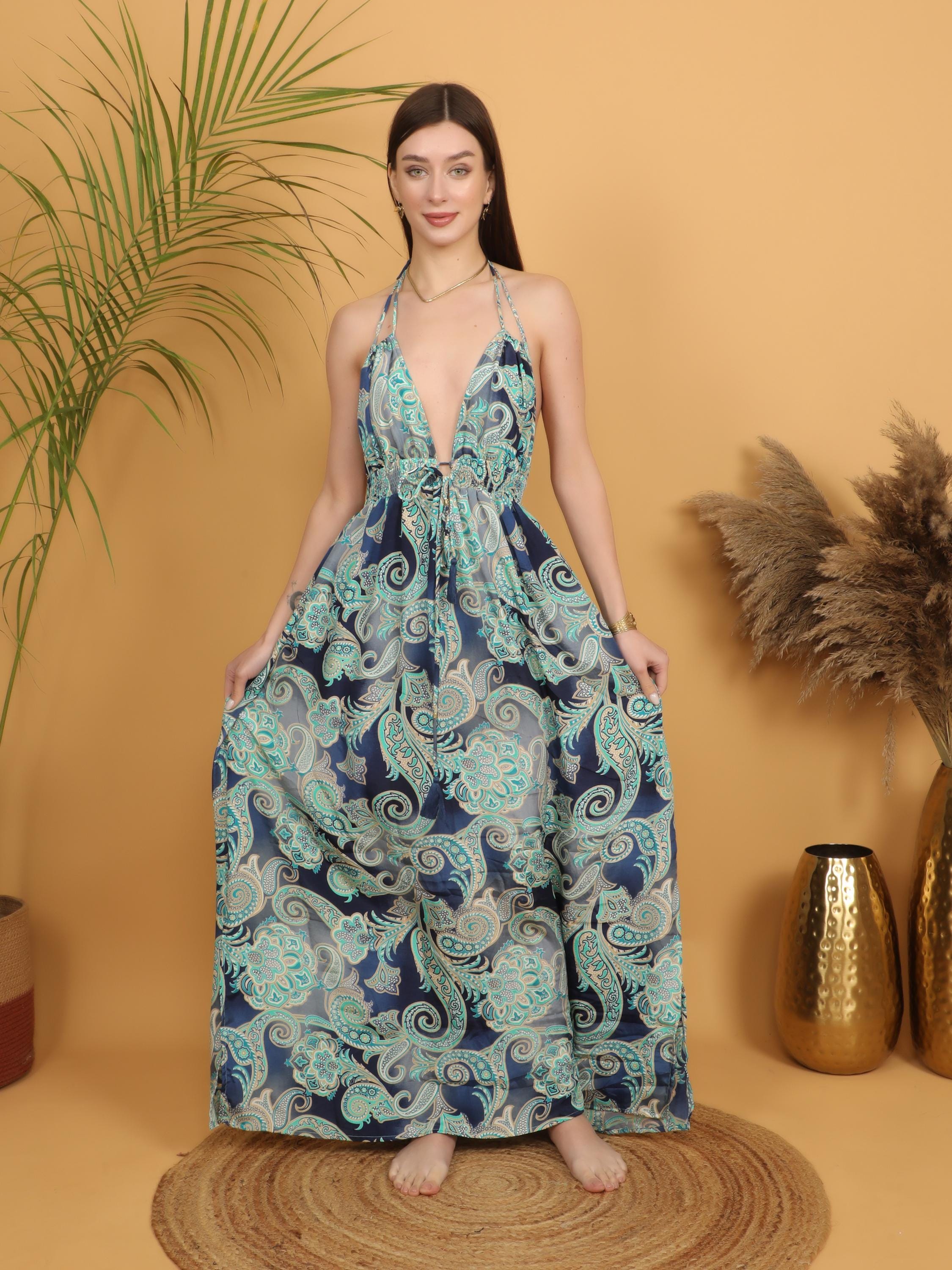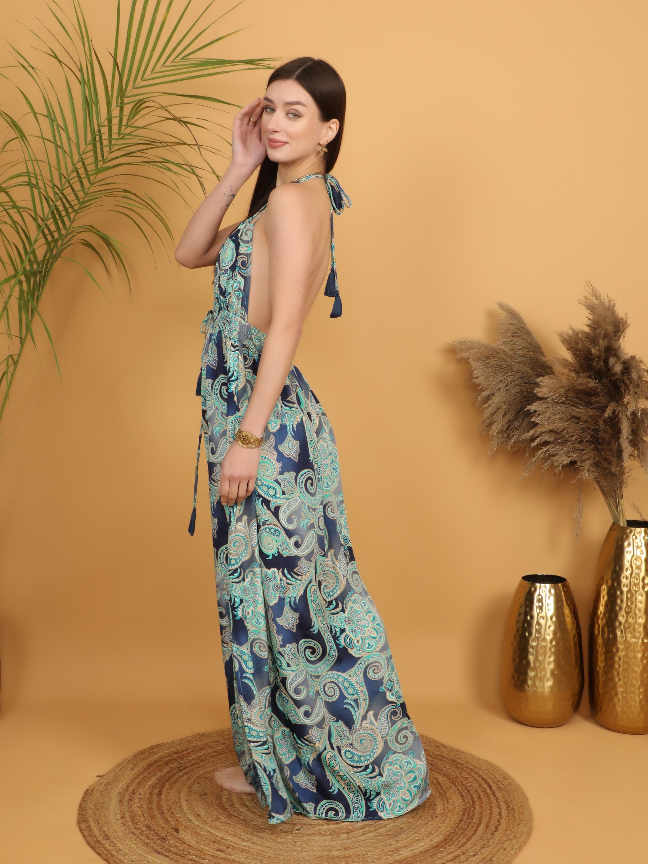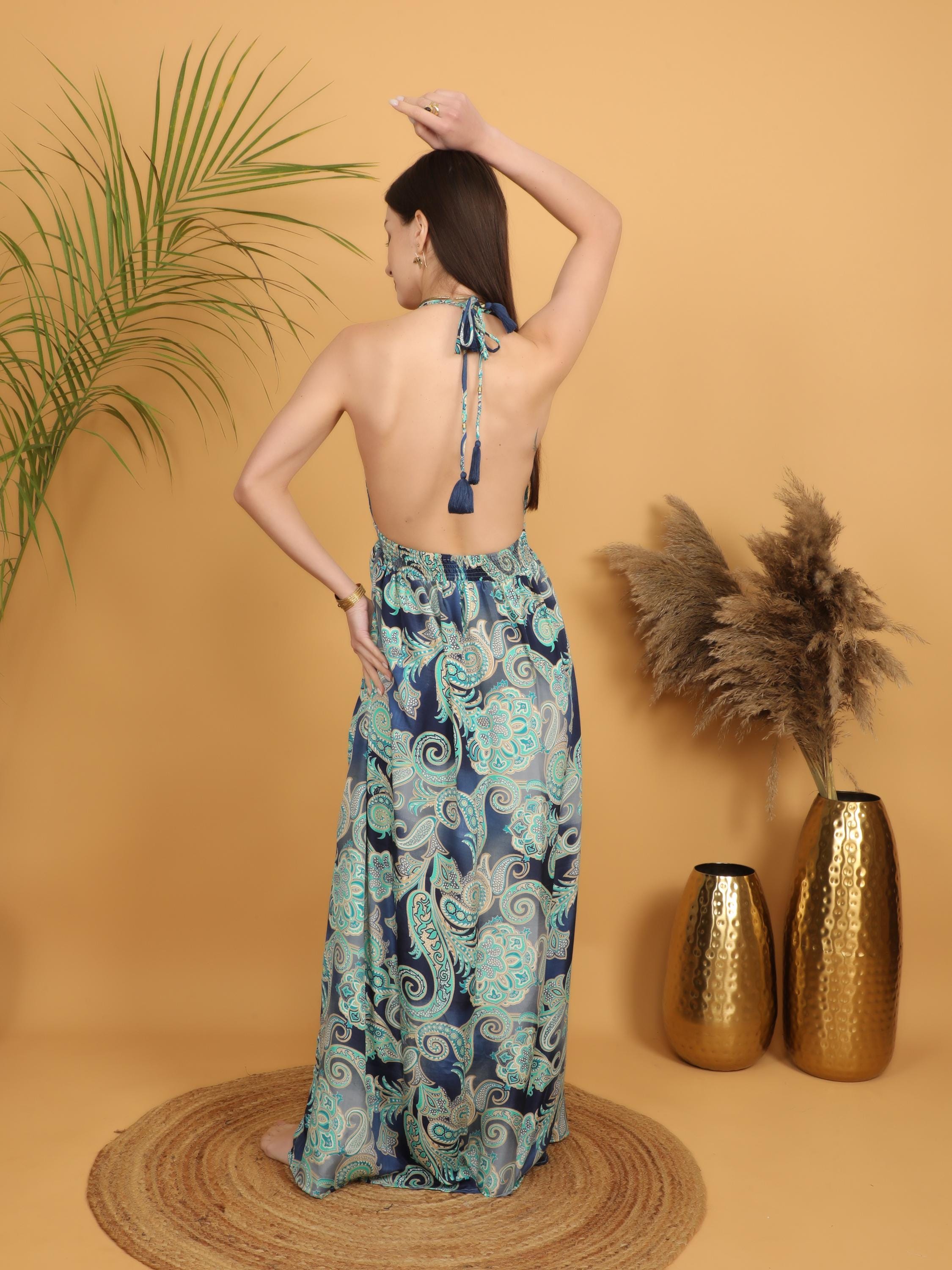 -Dramatic deep V neckline that elongates the silhouette, Striking low open back for a sensual yet effortless boho look.