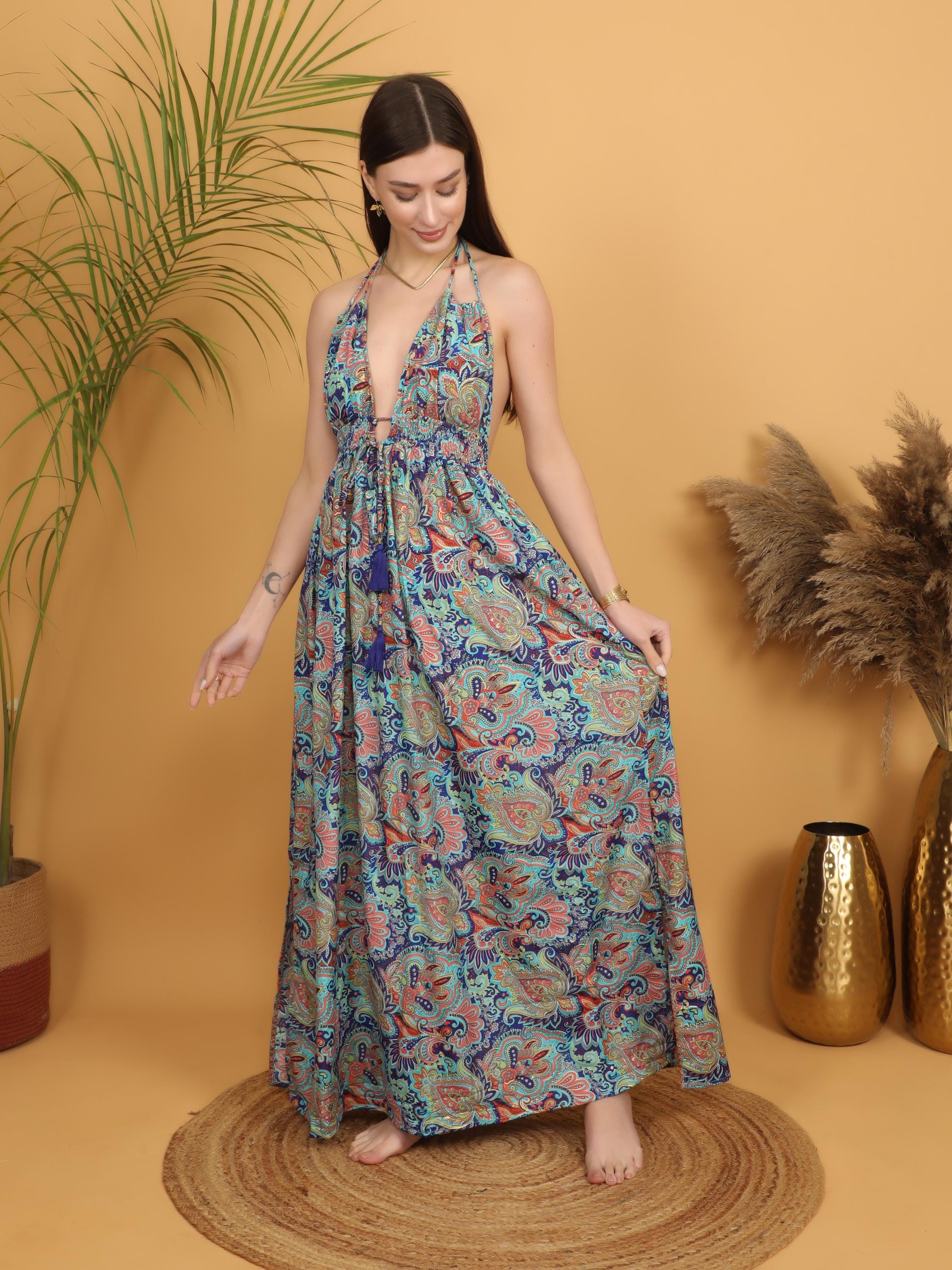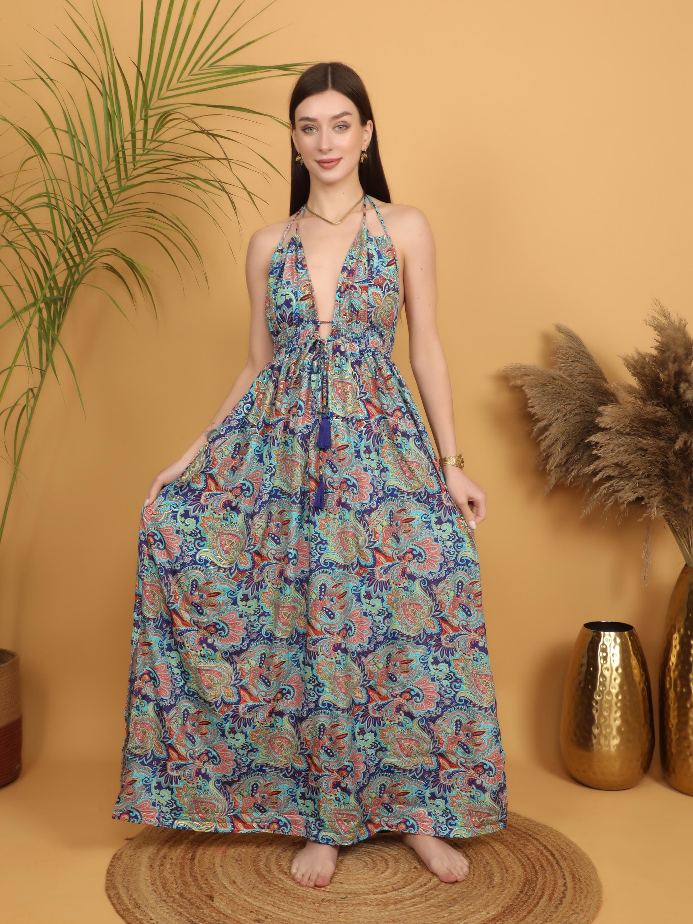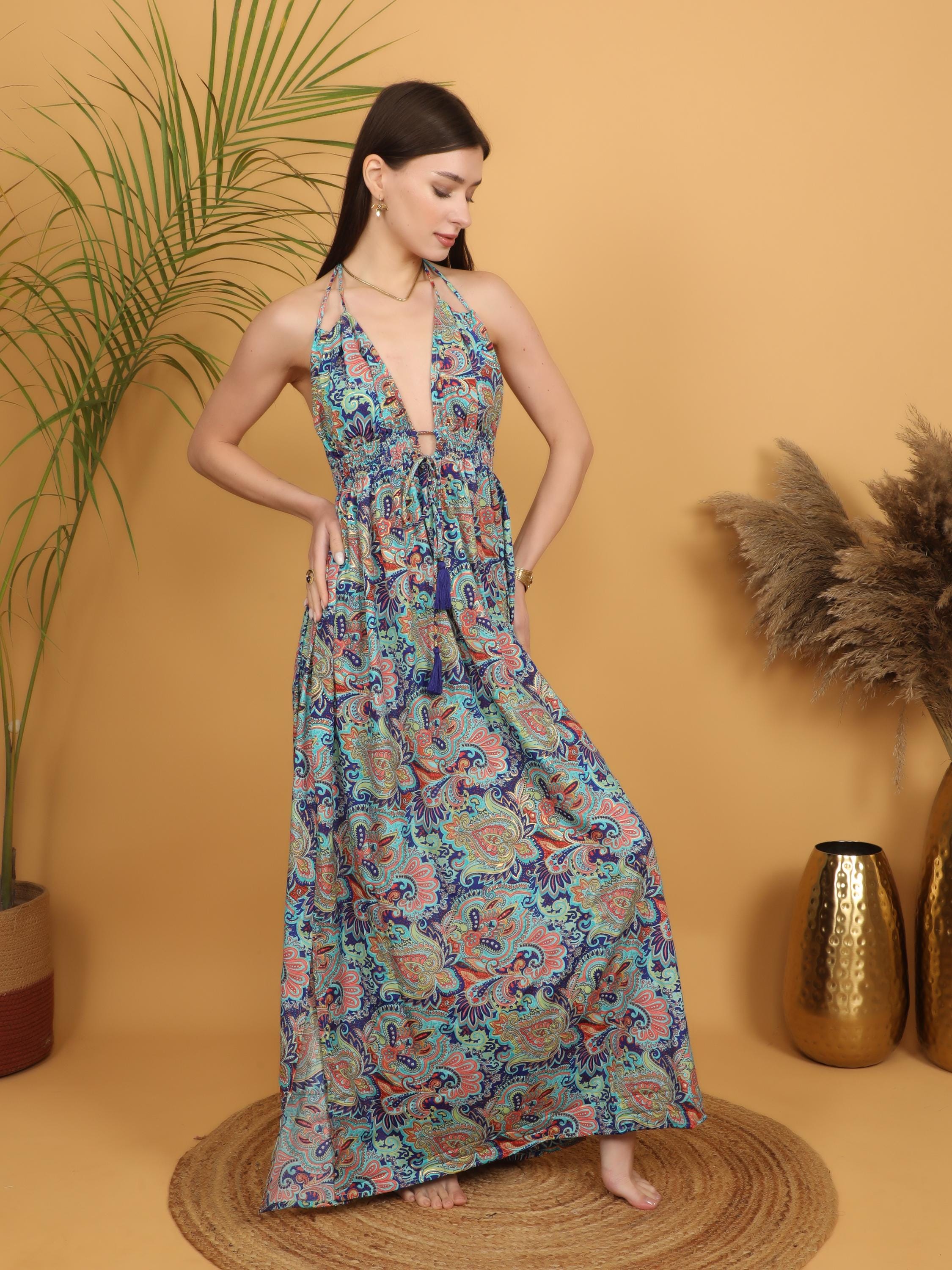 The deep V neckline enhances the silhouette while the open low back adds a light and feminine touch, making it ideal for warm summer days. The adjustable halter tie allows a comfortable fit, the elastic empire waist softly defines the shape without feeling tight, and the delicate tassel detail brings an authentic boho finish. The full-length skirt moves beautifully with every step, creating natural flow whether you are heading to brunch, walking by the beach, exploring markets or enjoying a summer festival.