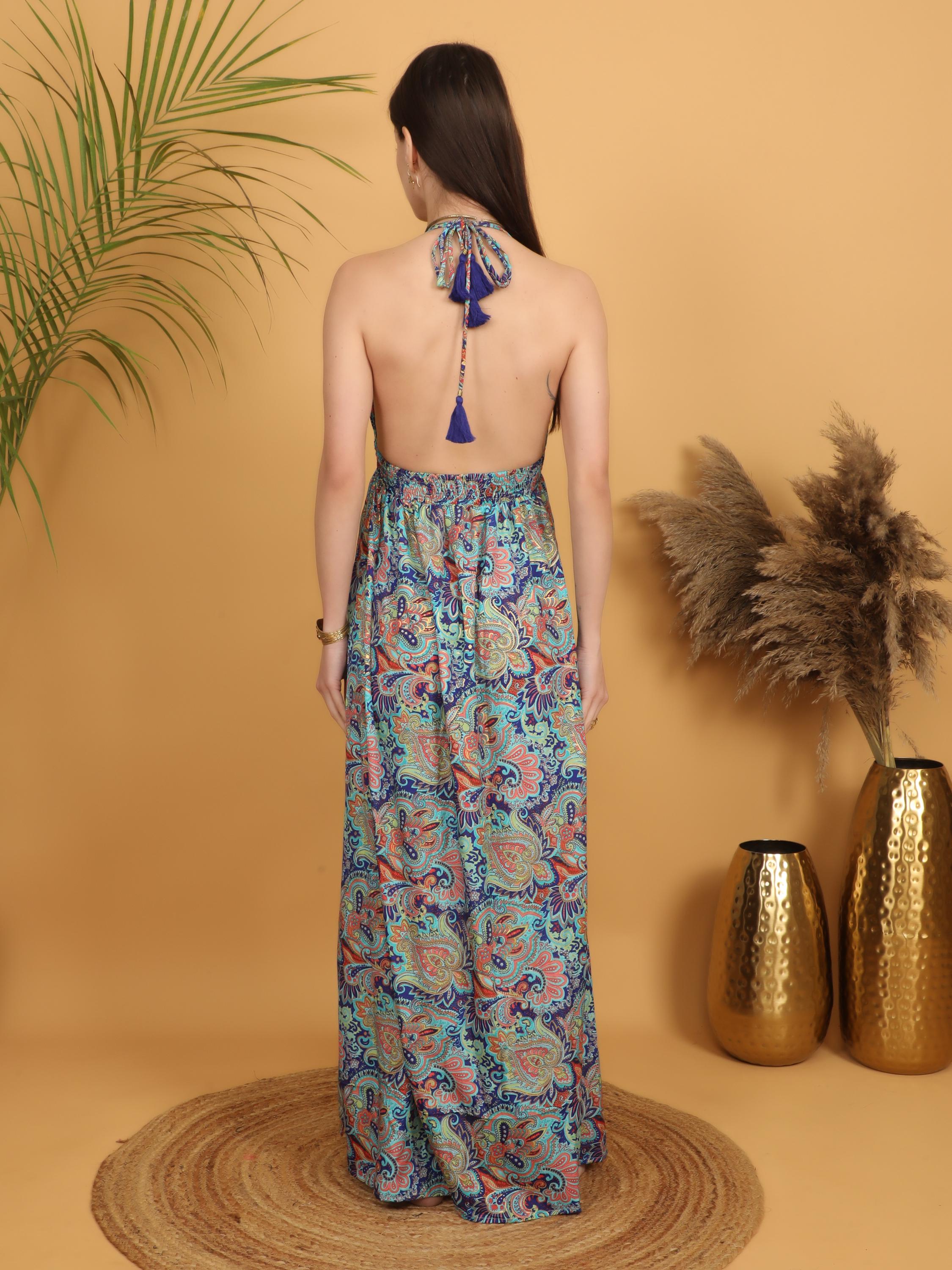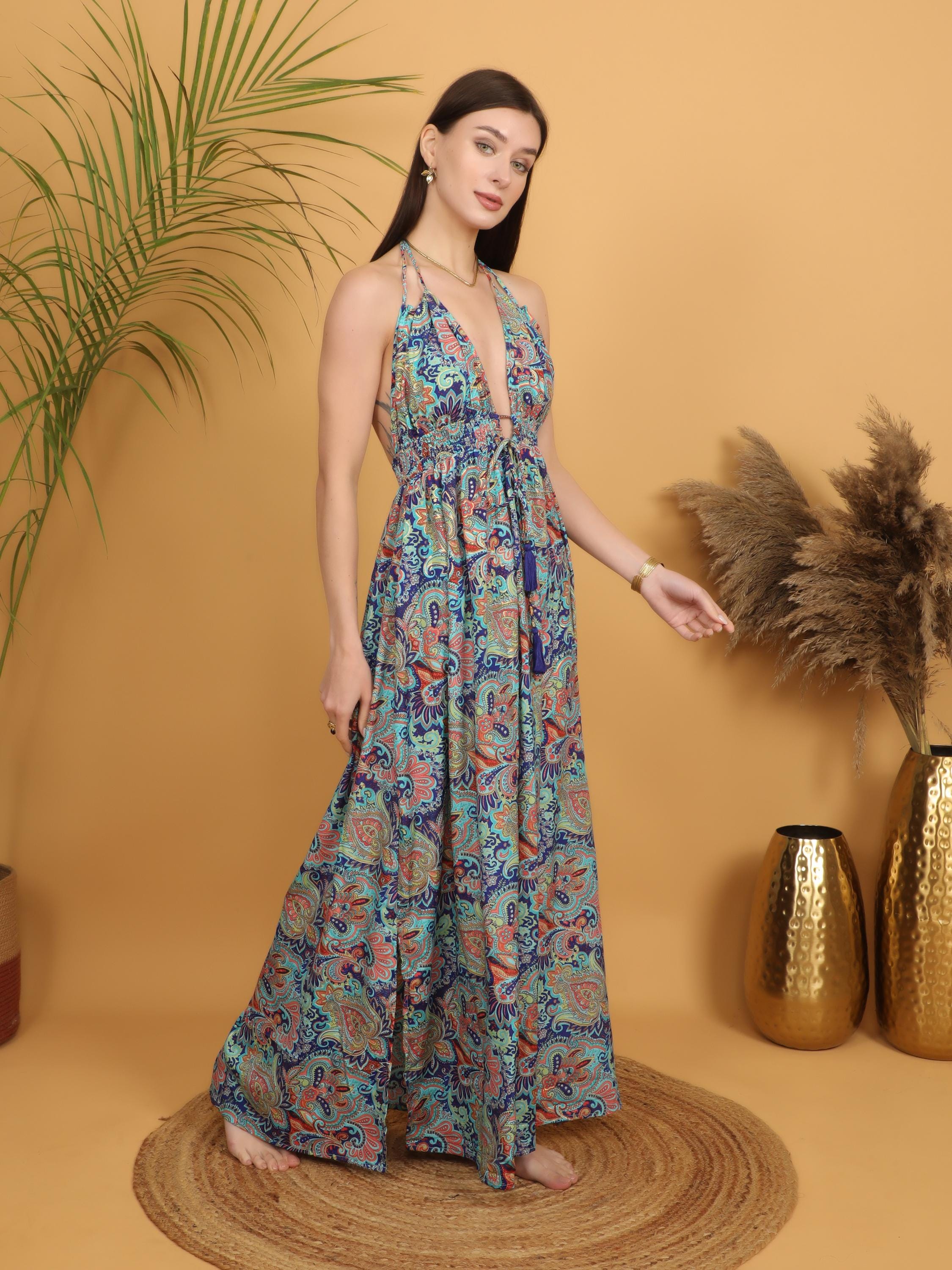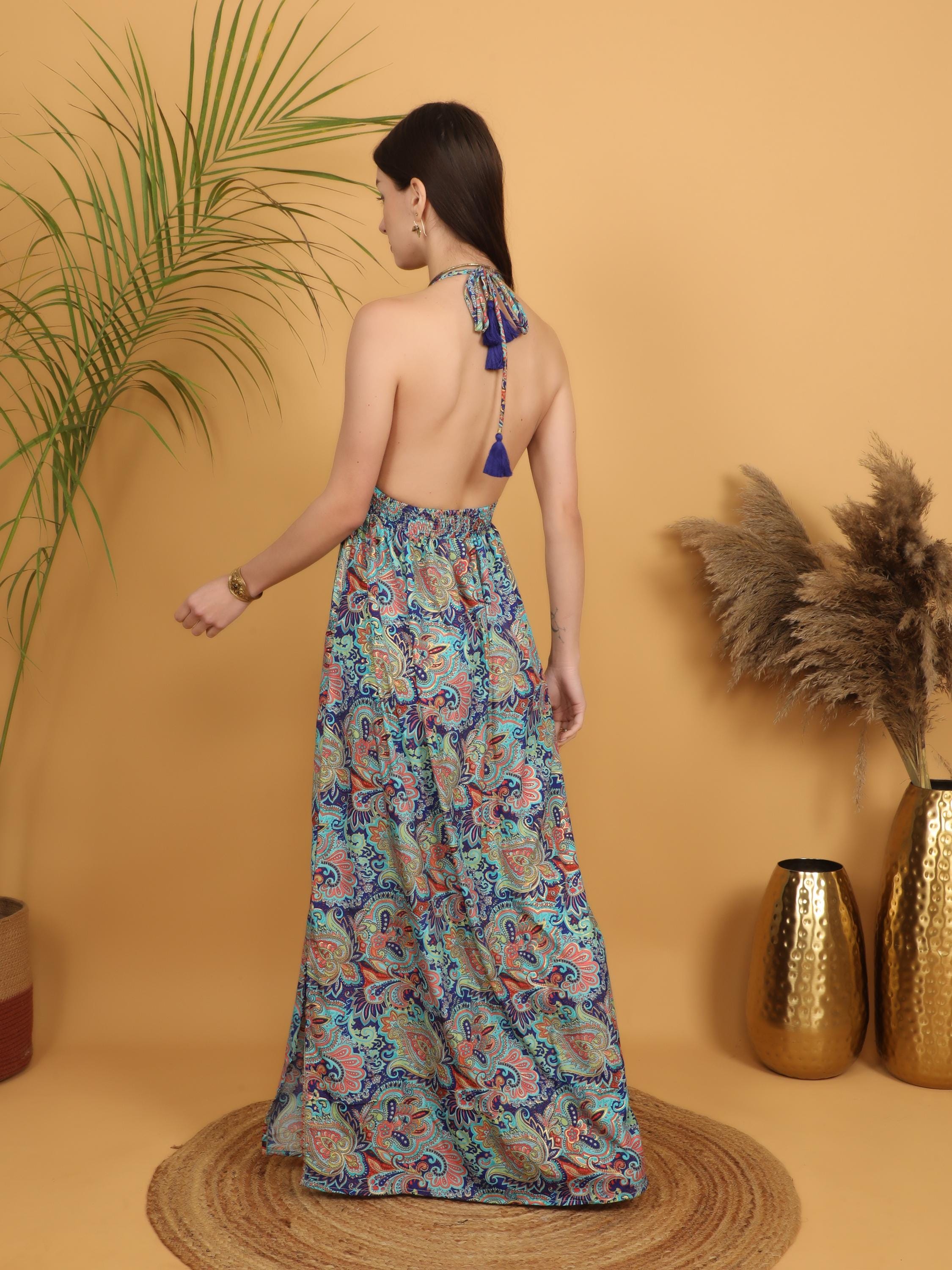 The deep V neckline enhances the silhouette while the open low back adds a light and feminine touch, making it ideal for warm summer days. The adjustable halter tie allows a comfortable fit, the elastic empire waist softly defines the shape without feeling tight, and the delicate tassel detail brings an authentic boho finish. The full-length skirt moves beautifully with every step, creating natural flow whether you are heading to brunch, walking by the beach, exploring markets or enjoying a summer festival.