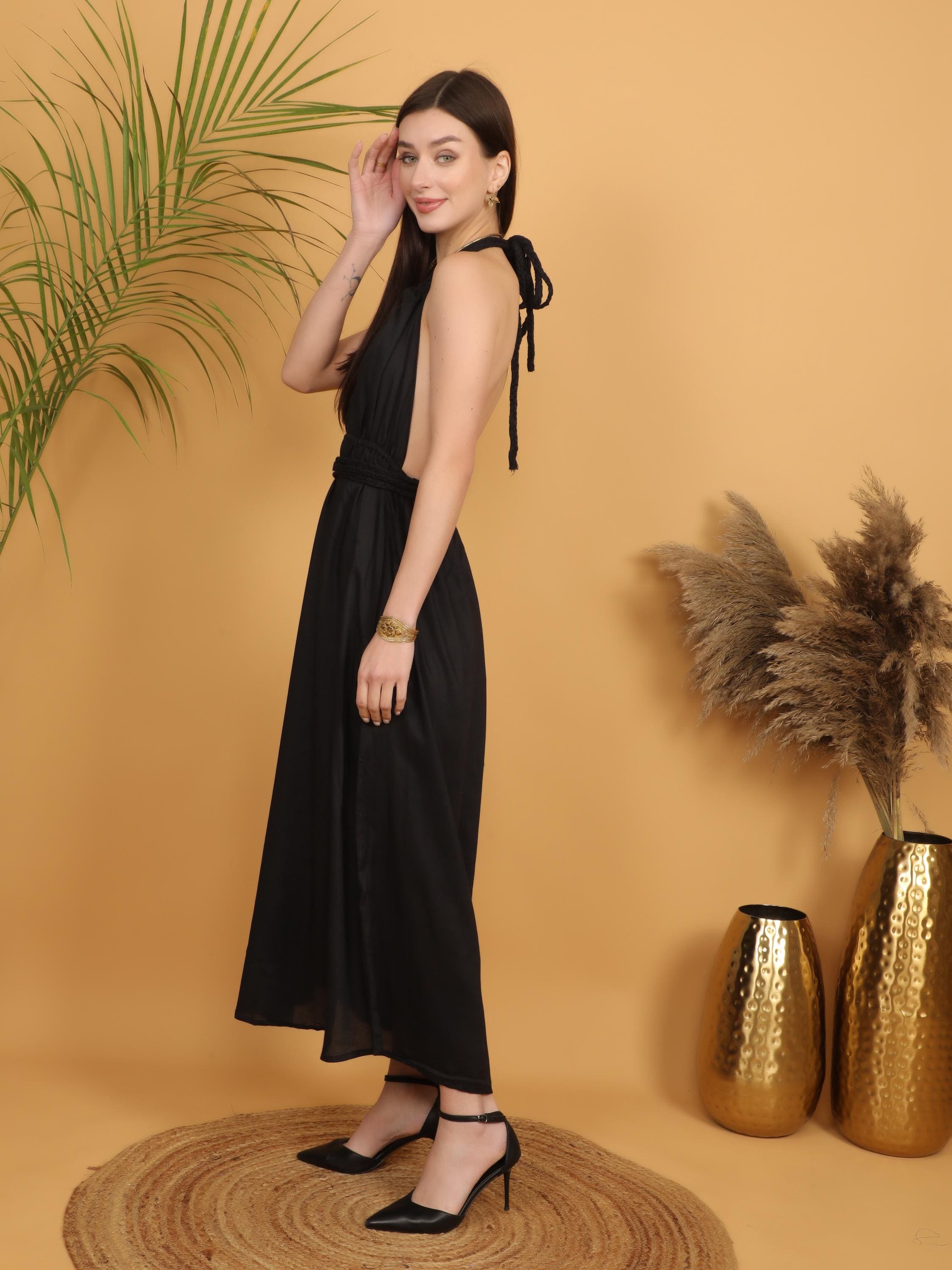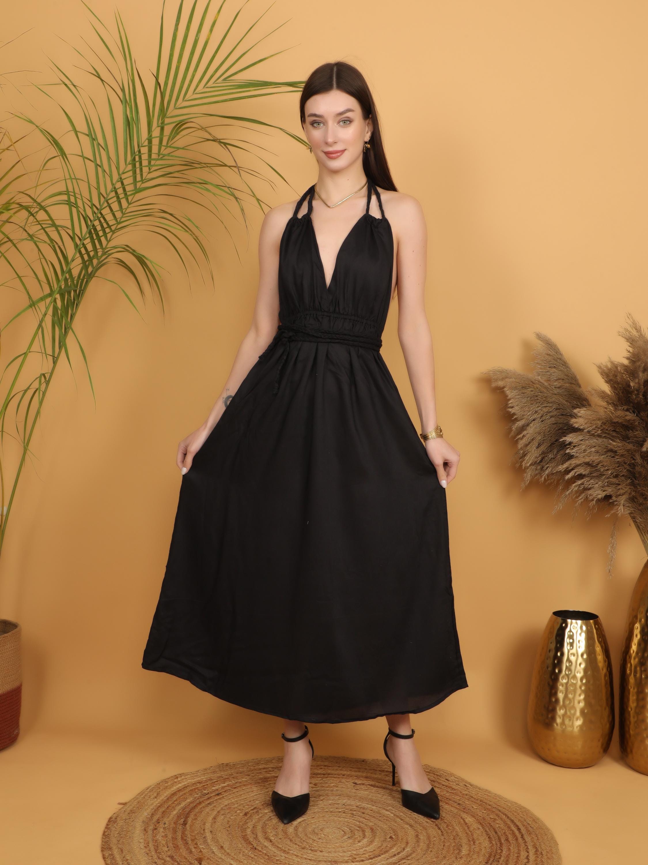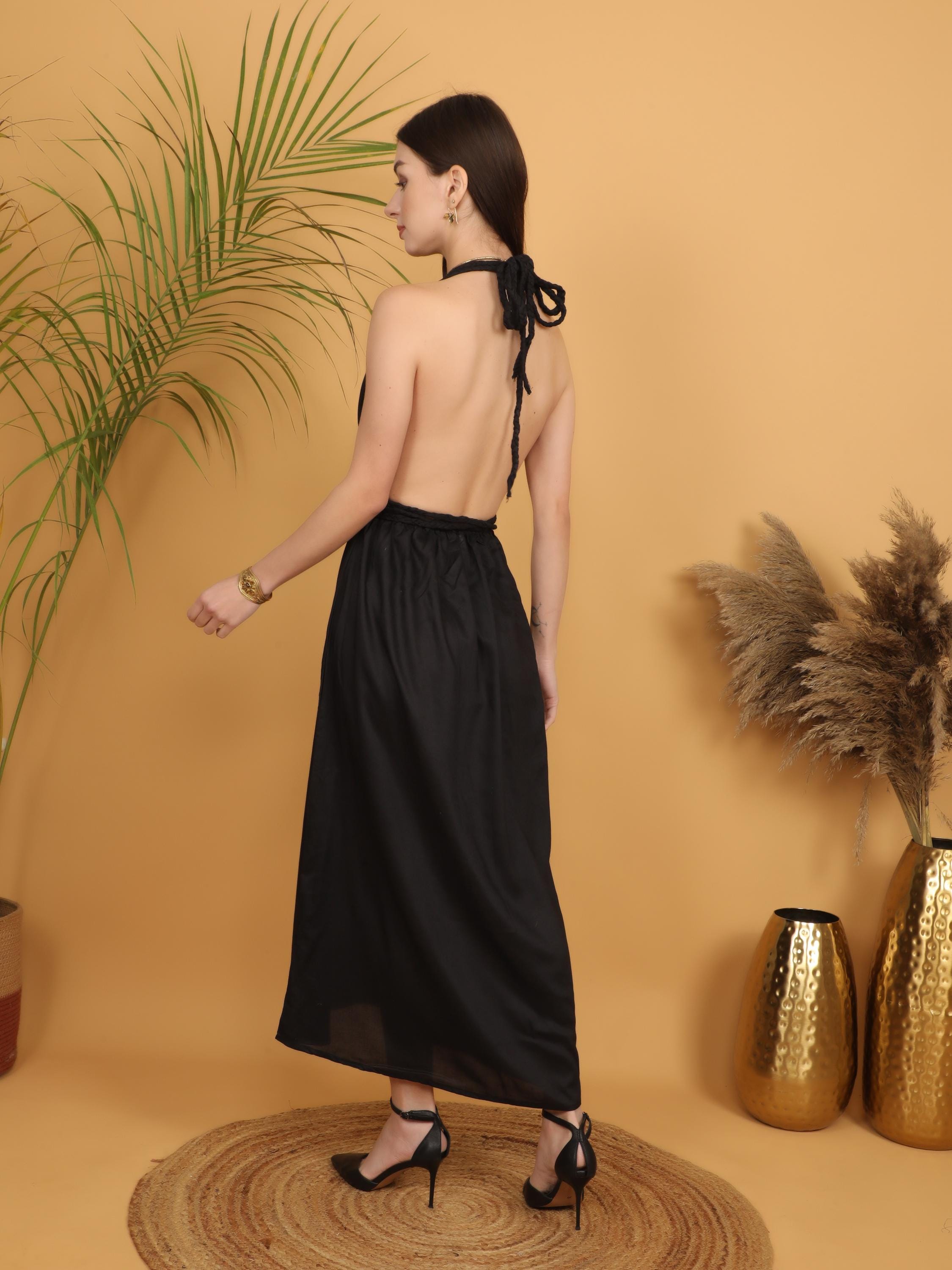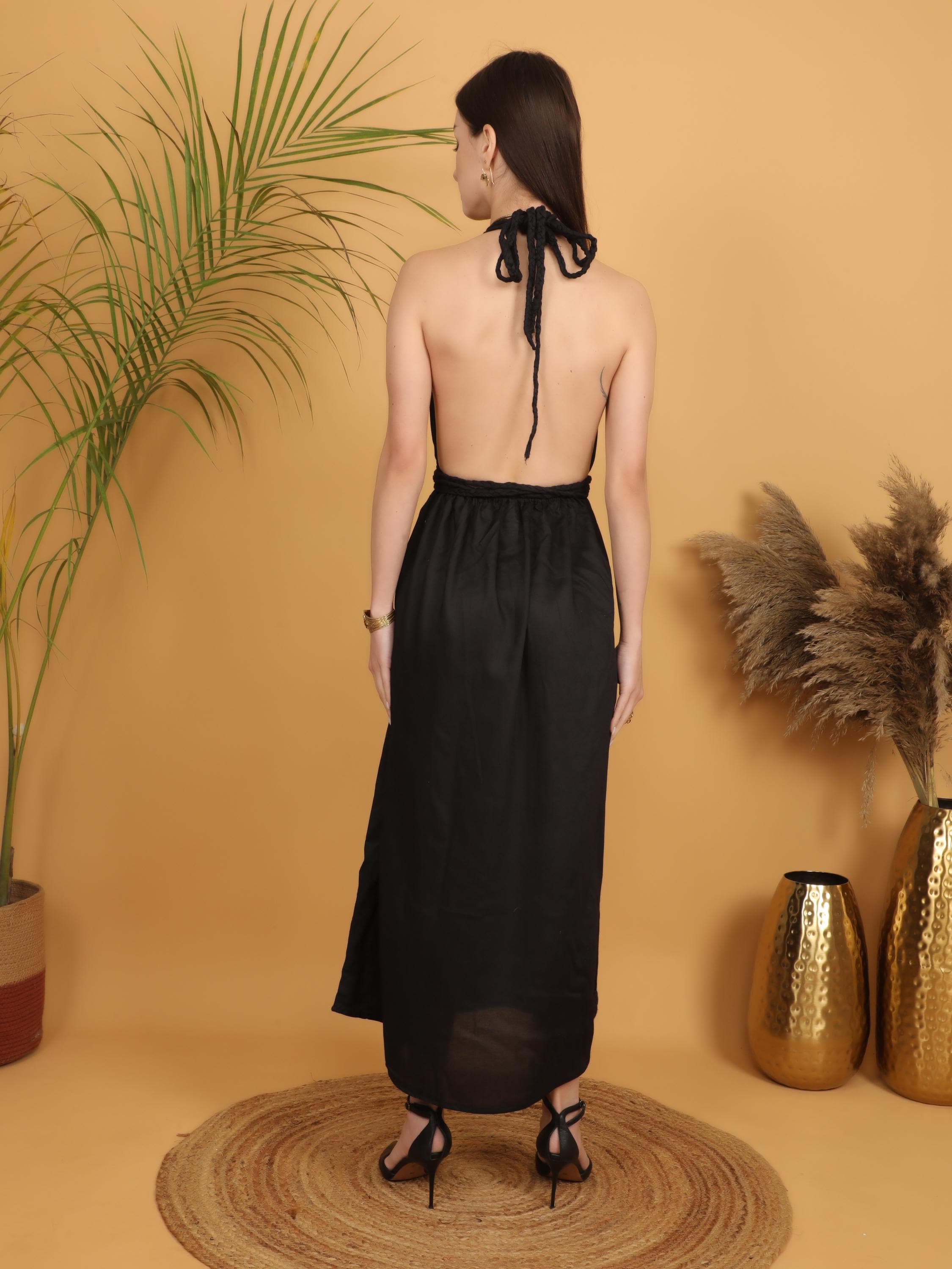 Channel your inner free spirit with this boho black halter maxi dress crafted from soft, breathable viscose. Designed for the modern bohemian woman, this flowing silhouette blends effortless elegance with artisanal detail.