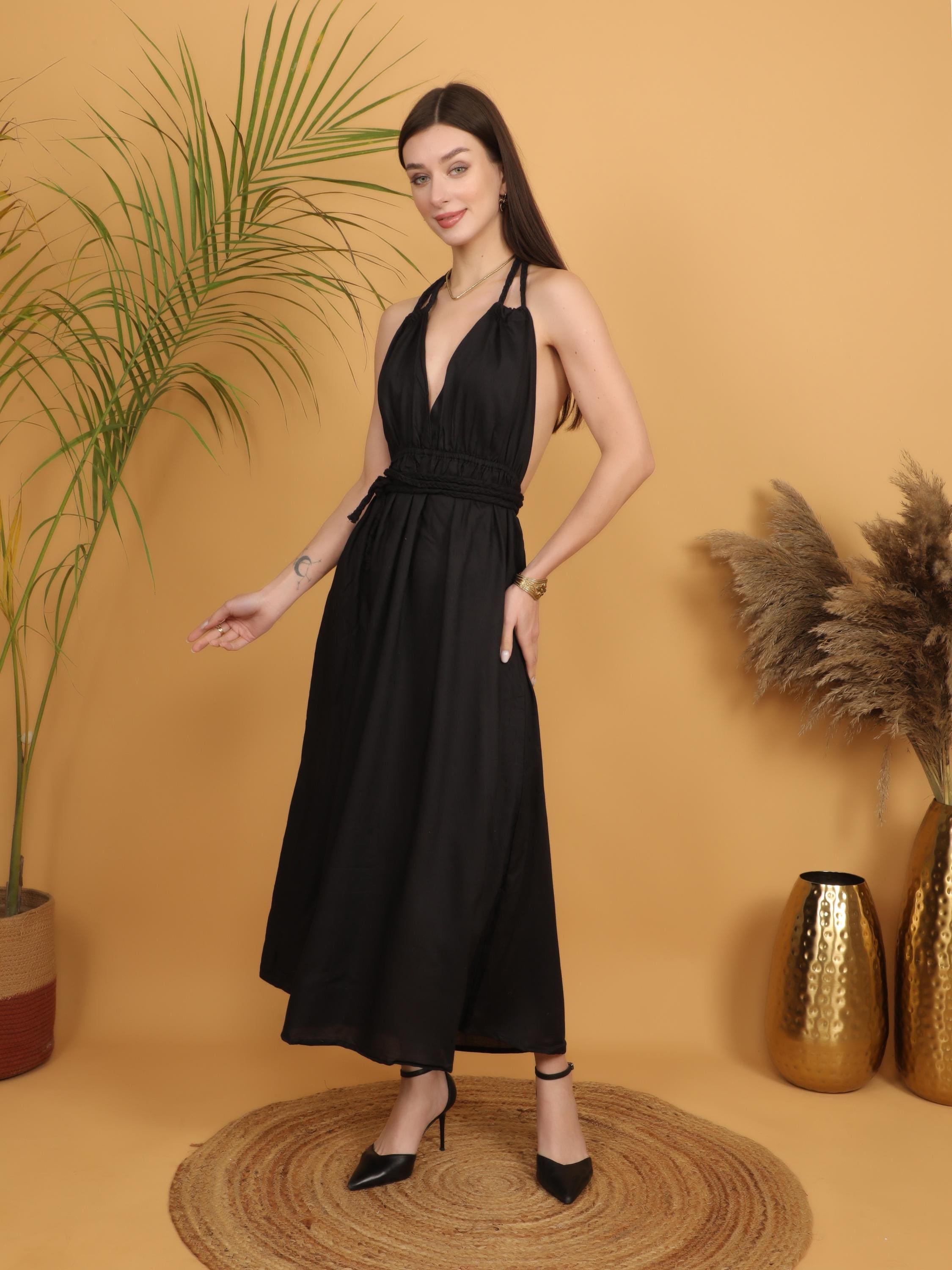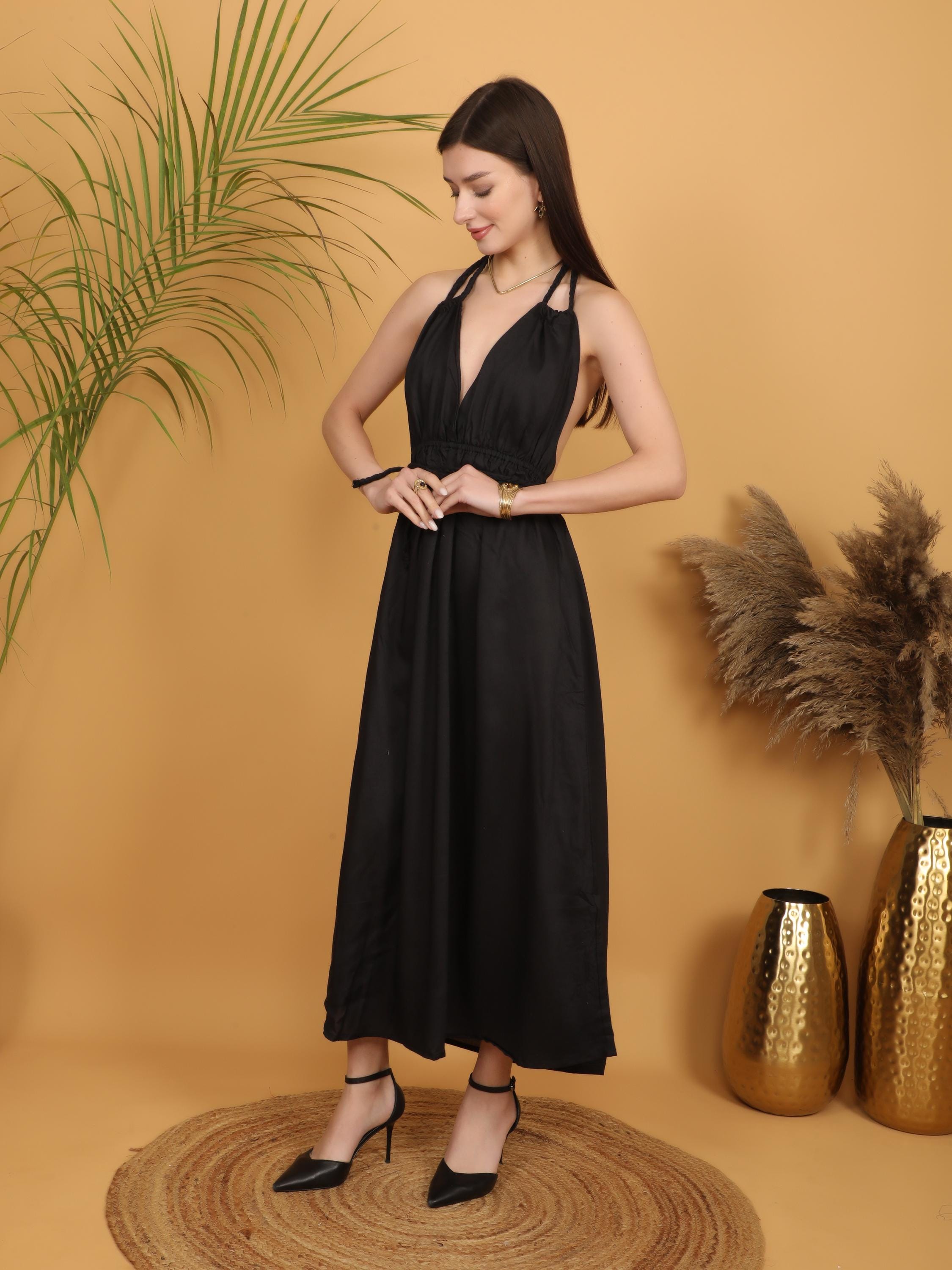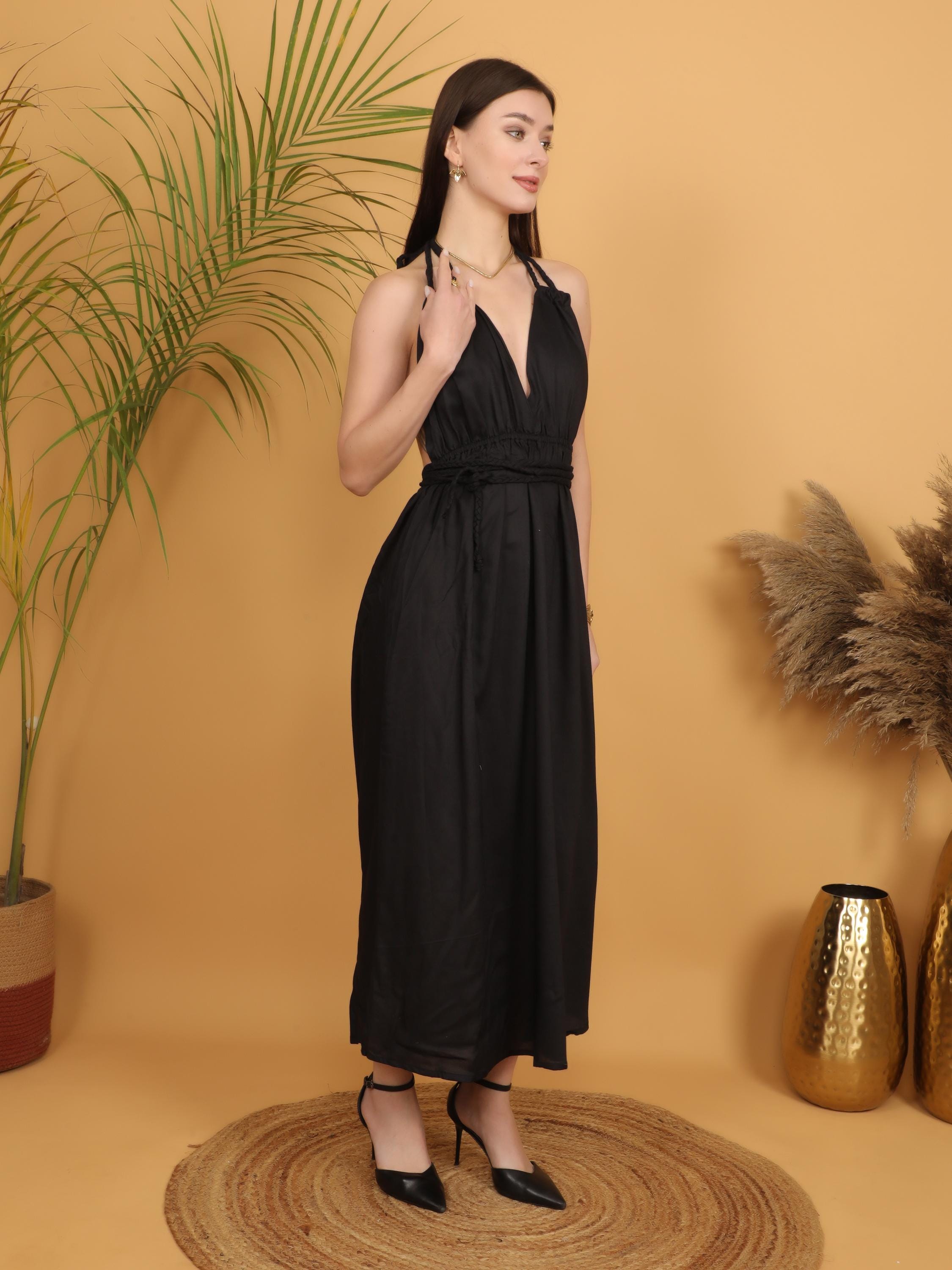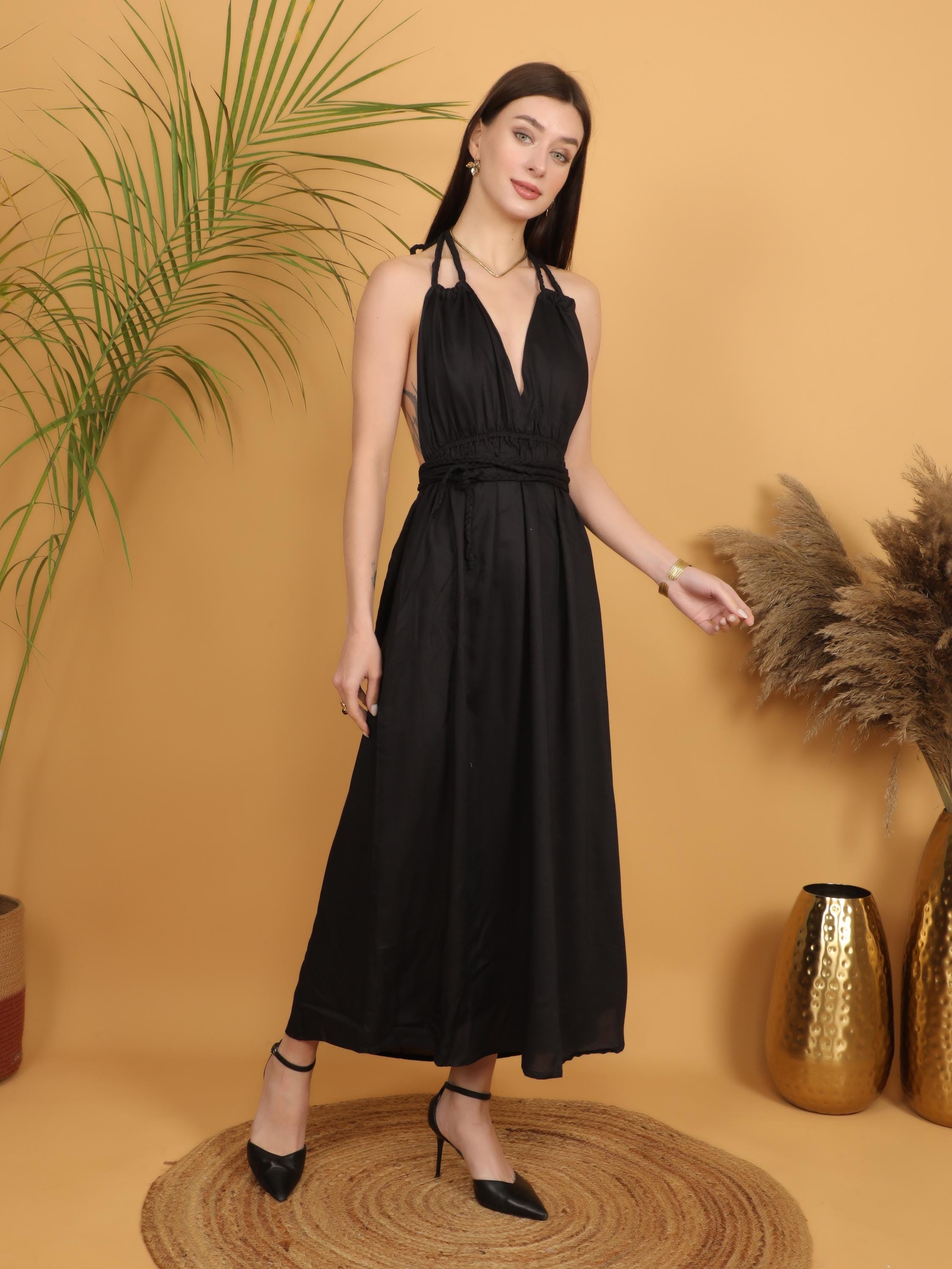Channel your inner free spirit with this boho black halter maxi dress crafted from soft, breathable viscose. Designed for the modern bohemian woman, this flowing silhouette blends effortless elegance with artisanal detail.
