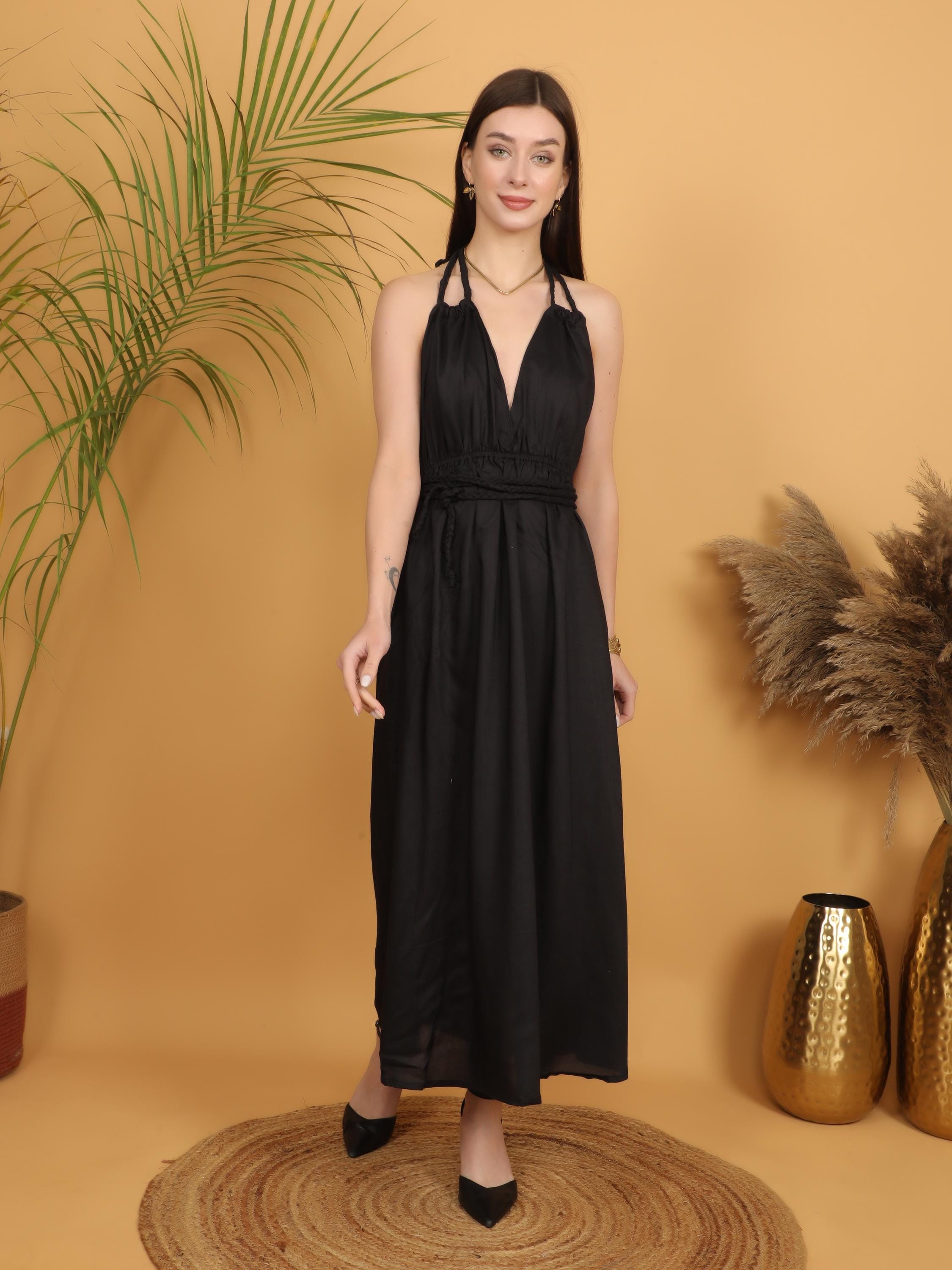 The deep V neckline and open back create a feminine, goddess-inspired shape, while the braided halter cords tie beautifully at the neck for an adjustable fit. A statement braided belt wraps the waist, adding handcrafted texture and enhancing your natural curves.