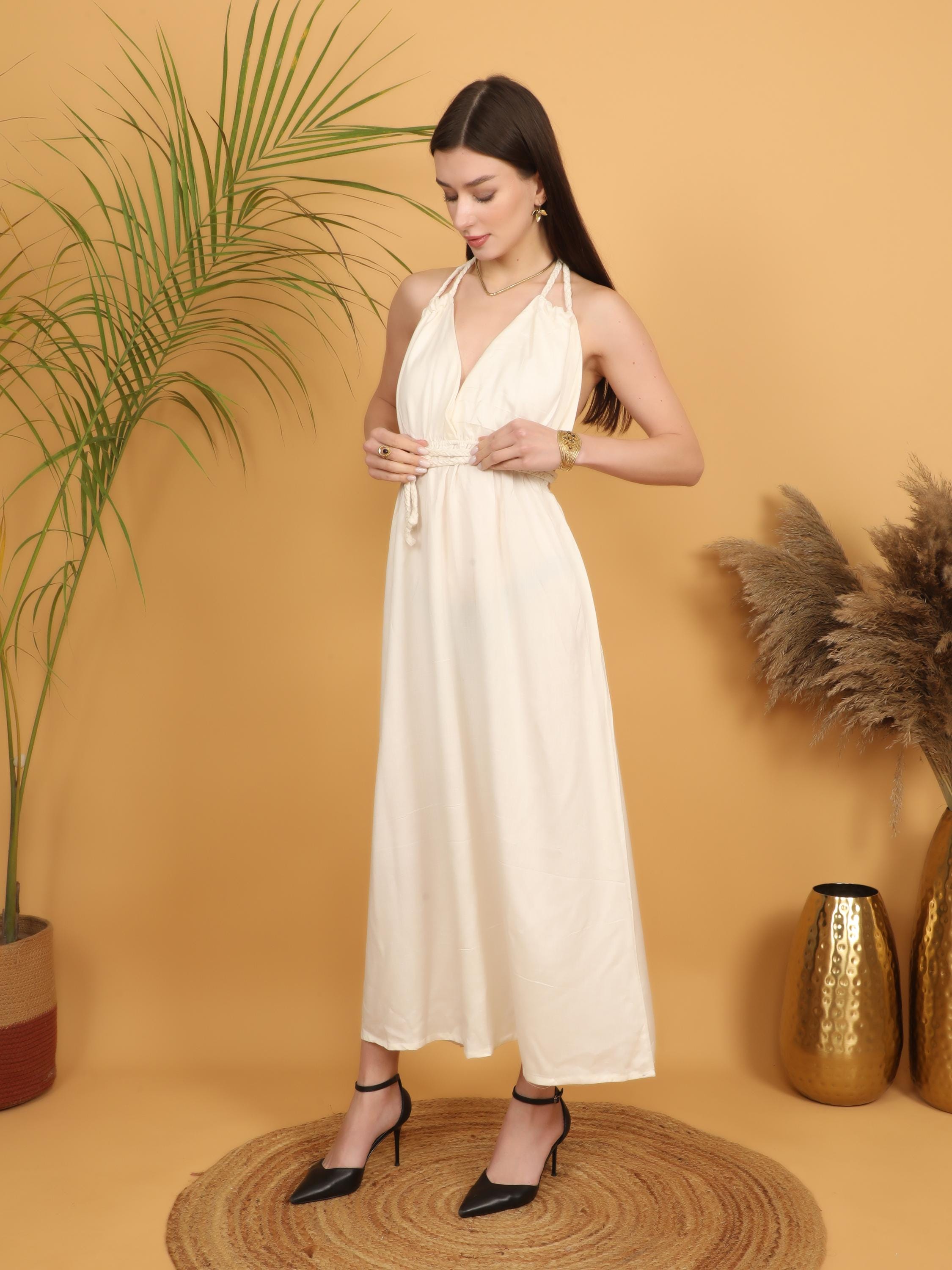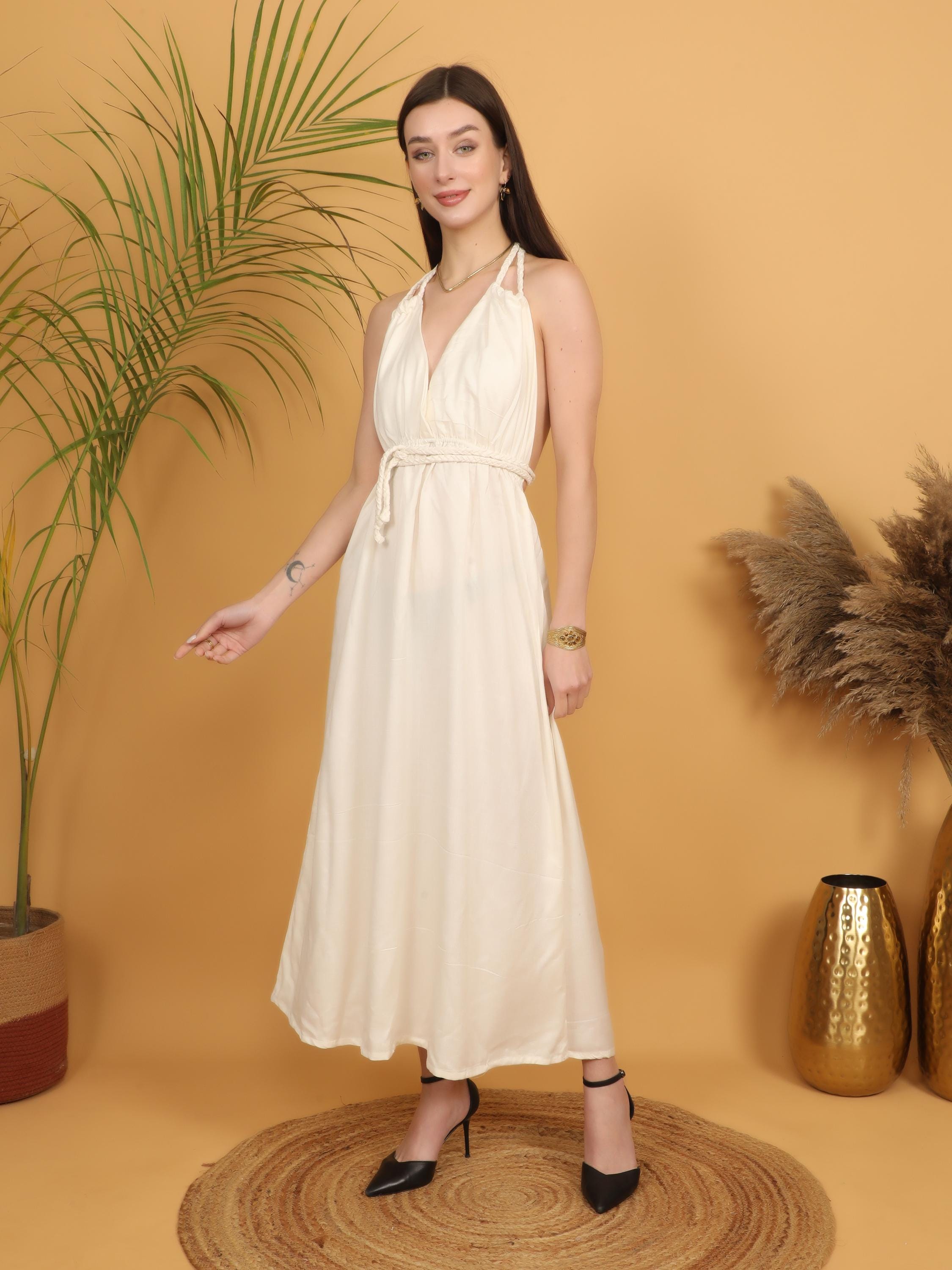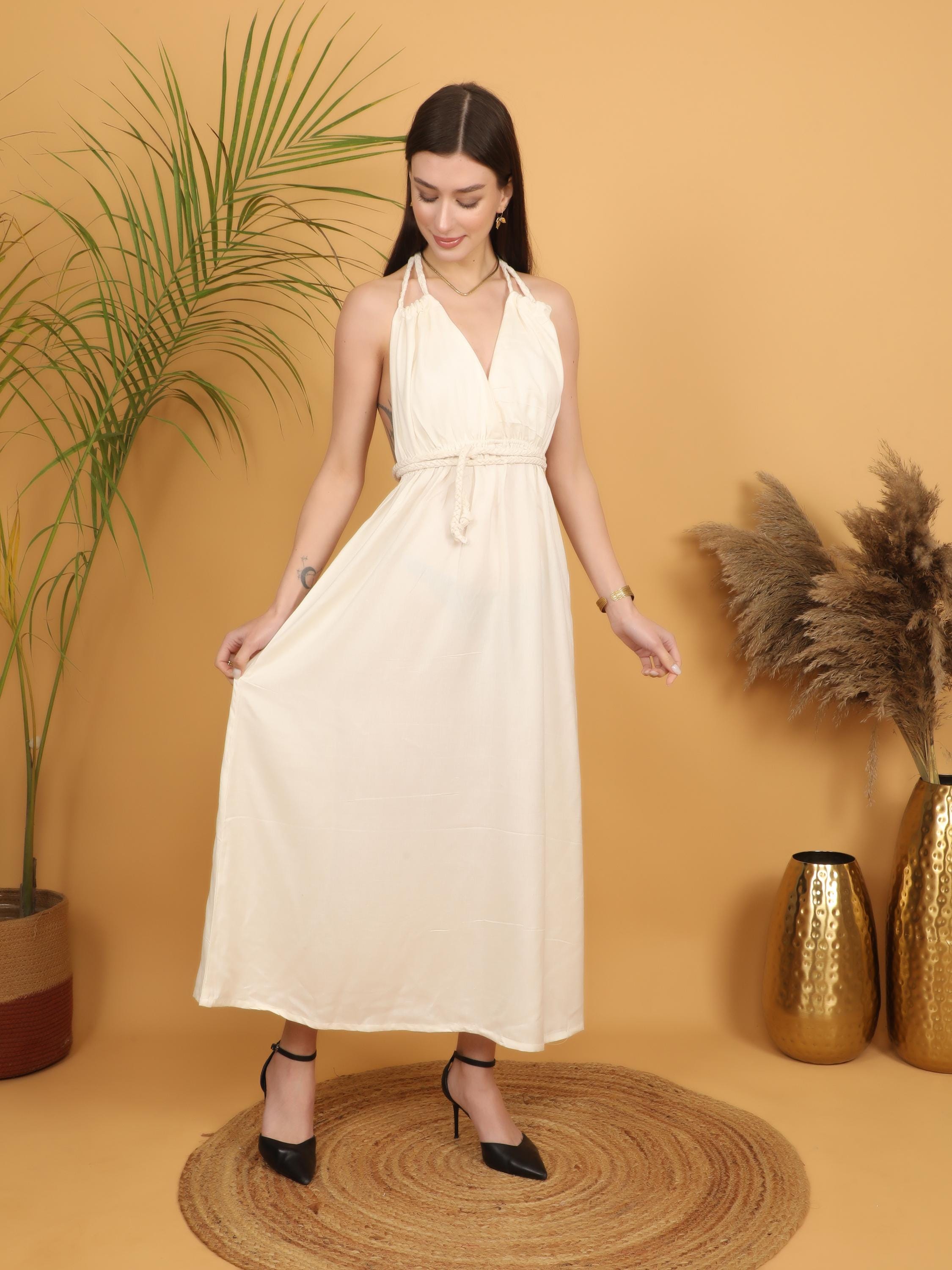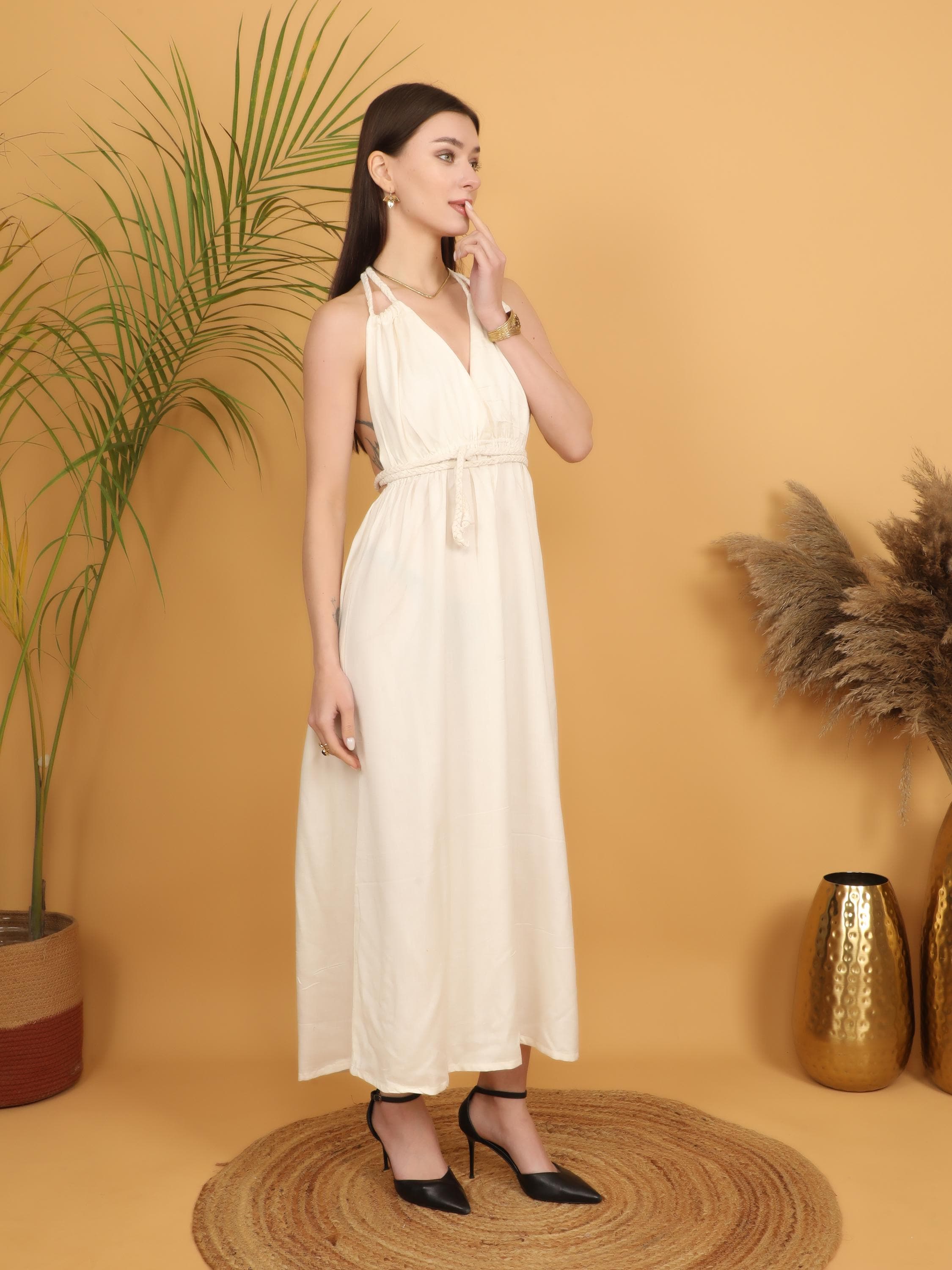 The color is a soft off white — more subtle than bright white — giving the dress a natural, earthy tone that complements bohemian styling perfectly. It feels pure yet warm, making it easy to style with gold accessories, woven textures, or minimalist accents.